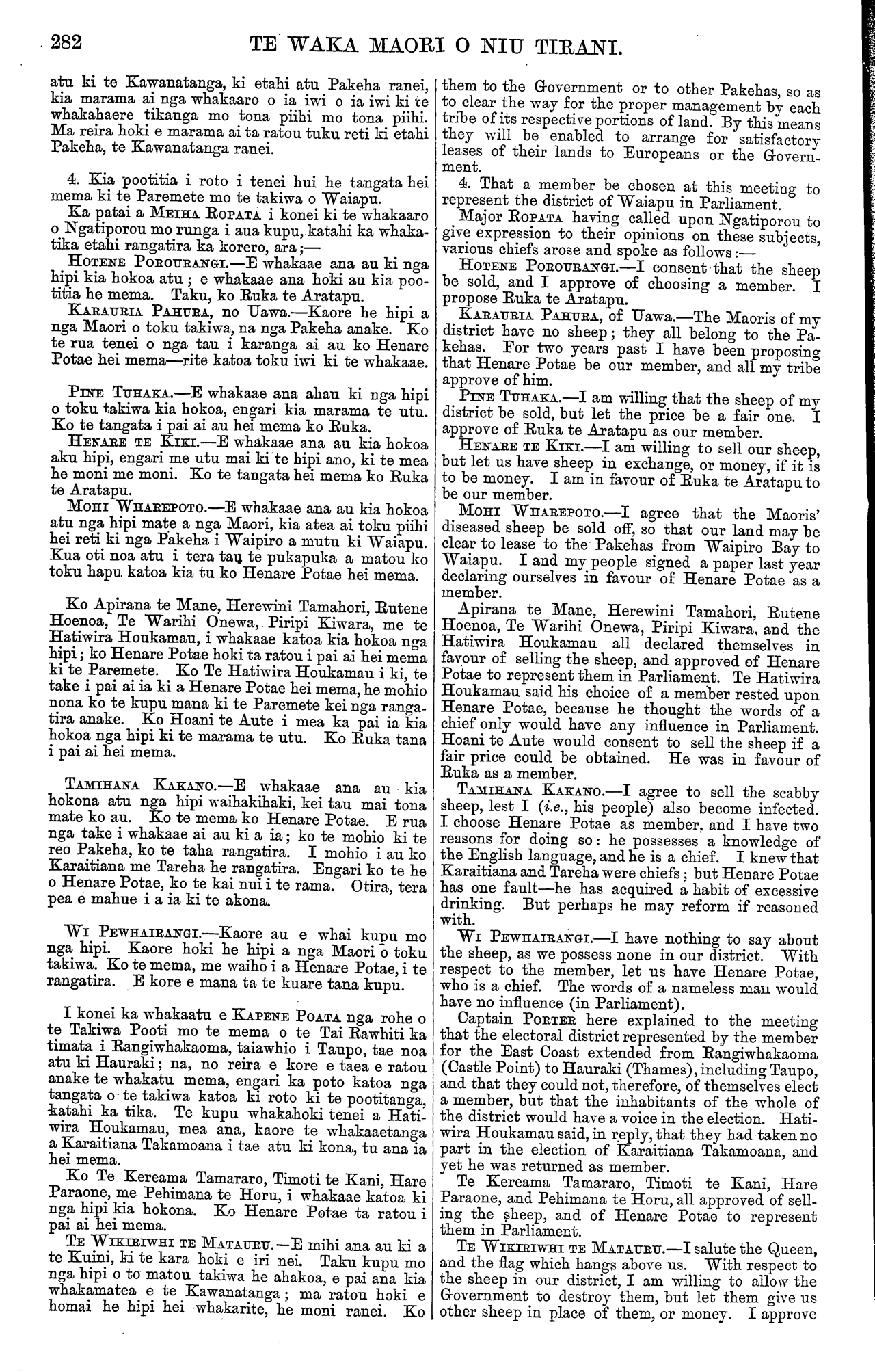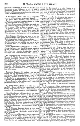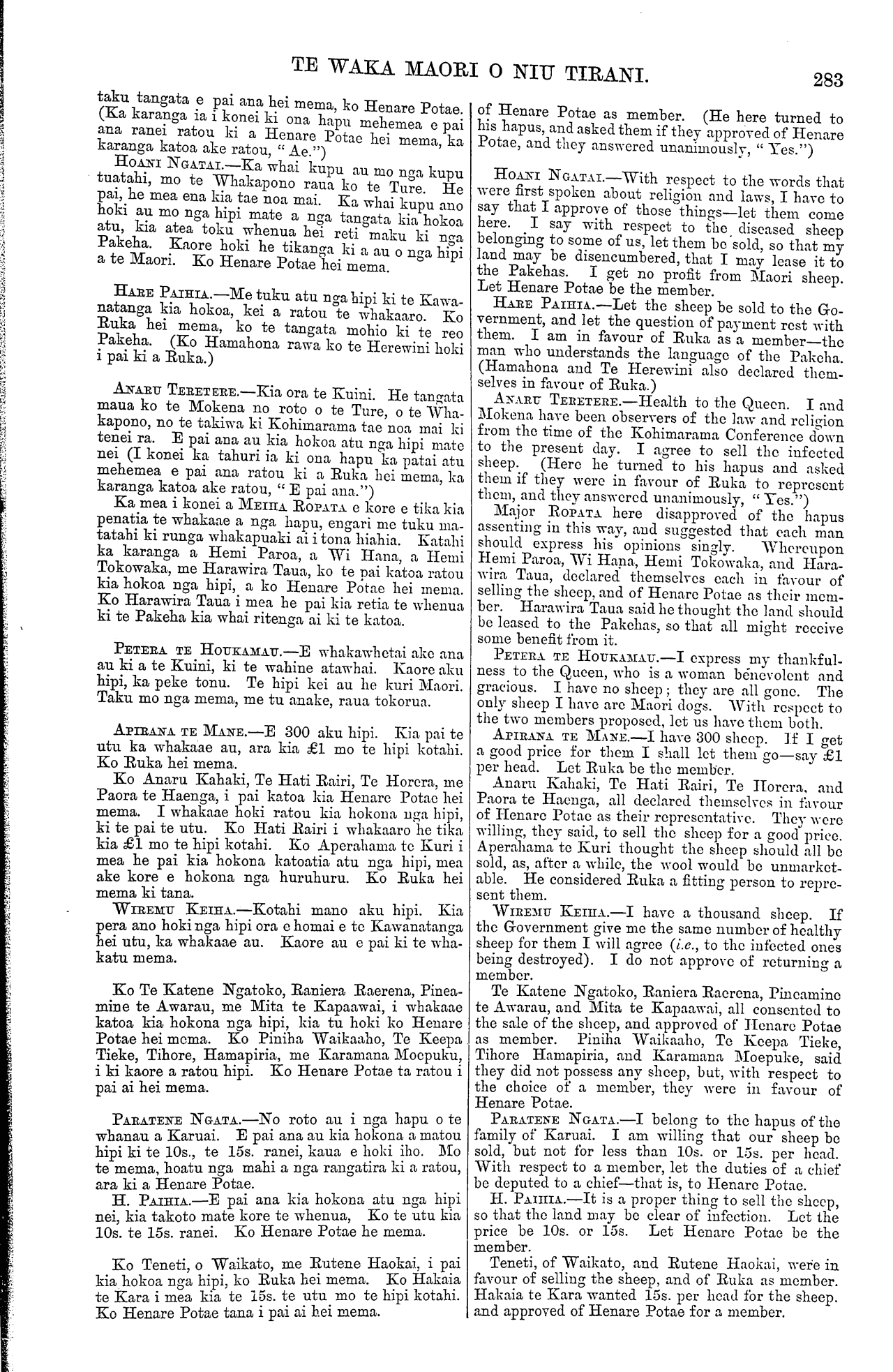 TE WAKA MAORI O NIU TIRANI. 283 taku tangata e pai ana hei mema, ko Henare Potae. | (Ka karanga ia i konei ki ona hapu mehemea e pai I ana ranei ratou ki a Henare Potae hei mema, ka karanga katoa ake ratou, " Ae.") HOANI NGATAI. Ka whai kupu au mo nga kupu tuatahi, mo te Whakapono raua ko te Ture. He pai, he mea ena kia tae noa mai. Ka whai kupu ano hoki au mo nga hipi mate a nga tangata kia hokoa atu, kia atea toku whenua hei reti maku ki nga Pakeha. Kaore hoki he tikanga ki a au o nga him a te Maori. Ko Henare Potae hei mema. HARE PAIHIA. Me tuku atu nga hipi ki te Kawa- natanga kia hokoa, kei a ratou te whakaaro. Ko Euka hei mema, ko te tangata mohio ki te reo Pakeha. (Ko Hamahona rawa ko te Herewini hoki i pai ki a Ruka.) ANARU TERETERE—Kia ora te Kuini. He tangata maua ko te Mokena no roto o te Ture, o to Wha- kapono, no te takiwa ki Kohimarama tae noa mai ki tenei ra. E pai ana au kia hokoa atu nga hipi mato nei (I konei ka tahuri ia ki ona hapu ka patai atu mehemea e pai ana ratou ki a Euka hei mema, ka karanga katoa ake ratou, " E pai ana.") Ka mea i konei a MEIHA. ROPATA e kore e tika kia penatia te whakaae a nga hapu, engari mo tuku ma- tatahi ki runga whakapuaki ai i tona hiahia. Katahi ka karanga a Hemi Paroa, a Wi Hana, a Hemi Tokowaka, me Harawira Taua, ko te pai katoa ratou kia hokoa nga hipi, a ko Henare Potae hei mema. Ko Harawira Taua i mea he pai kia retia te whenua ki te Pakeha kia whai ritenga ai ki te katoa. PETERA. TE HOUKAMAU.—E whakawhetai ake ana au ki a te Kuini, ki te wahine atawhai. Kaore aku hipi, ka peke tonu. Te hipi kei au he kuri Maori. Taku mo nga mema, me tu anake, raua tokorua. APIRANA. TE MANE.—E 300 aku hipi. Kia pai te utu ka whakaae au, ara kia £1 mo te hipi kotahi. Ko Ruka hei mema. Ko Anaru Kahaki, Te Hati Rairi, Te Horera, me Paora te Haenga, i pai katoa kia Henare Potae hei mema. I whakaae hoki ratou kia hokona nga hipi, ki te pai te utu. Ko Hati Eairi i whakaaro he tika kia £1 mo te hipi kotahi. Ko Aperahama te Kuri i mea he pai kia hokona katoatia atu nga hipi, mea ake kore e hokona nga huruhuru. Ko Euka hei mema ki tana. WIREMU KEIHA.—Kotahi mano aku hipi. Kia pera ano hoki nga hipi ora e homai e te Kawanatanga hei utu, ka whakaae au. Kaore au o pai ki te wha- katu mema. Ko Te Katene Ngatoko, Raniera Raerena, Pinea- mine te Awarau, me Mita te Kapaawai, i whakaae katoa kia hokona nga hipi, kia tu hoki ko Henare Potae hei mema. Ko Piniha Waikaaho, Te Keepa Tieke, Tihore, Hamapiria, me Karamana Moepuku, i ki kaore a ratou hipi. Ko Henare Potae ta ratou i pai ai hei mema. PARATENE NGATA.—No roto au i nga hapu o te whanau a Karuai. E pai ana au kia hokona a matou hipi ki te 10s., te 15s. ranei, kaua e hold iho. Mo te mema, hoatu nga mahi a nga rangatira ki a ratou, ara ki a Henare Potae. H. PAIHIA.—E pai ana kia hokona atu nga hipi nei, kia takoto mate kore te whenua, Ko te utu kia 10s. te 15s. ranei. Ko Henare Potae he mema. Ko Teneti, o Waikato, me Eutene Haokai, i pai kia hokoa nga hipi, ko Euka hei mema. Ko Hakaia te Kara i mea kia te 15s. te utu mo te hipi kotahi. Ko Henare Potae tana i pai ai hei mema. of Henare Potae as member. (He here turned to his hapus, and asked them if they approved of Henare Potae, and they answered unanimously, " Yes.") HOANI NGATAI.—With respect to the words that were first spoken about religion and laws, I have to say that. I approve of those things— let them come here. I say with respect to the diseased sheep belonging to some of us, let them be sold, so that my land may be disencumbered, that I may lease it to the Pakehas. I get no profit from Maori sheep. Let Henare Potae be the member. HARE PAIHIA.—Let the sheep be sold to the Go- vernment, and let the question of payment rest with them. I am in favour of Ruka as a member—the man who understands the language of the Pakeha. (Hamahona and Te Herewini also declared them- selves in favour of Ruka.) ANARU TERETERE.—Health to the Queen. I and Mokena have been observers of the law and religion from the time of the Kohimarama Conference down to the present day. I agree to sell the infected sheep. (Here he turned to his hapus and asked them if they wero in favour of Ruka to represent them, and they answered unanimously, " Yes.") Major ROPATA here disapproved of the hapus assenting in this way, and suggested that each man should express his opinions singly. Whereupon Hemi Paroa, Wi Hana, Hemi Tokowaka, and Hara- wira Taua, declared themselves each in favour of selling the sheep, and of Henare Potae as their mem- ber. Harawira Taua said he thought the land should bo leased to the Pakehas, so that all might receive some benefit from it. PETERA TE HOUKAMAU.—I express my thankful- ness to the Queen, who is a woman benevolent and gracious. I have no sheep ; they are all gone. The only sheep I have arc Maori dogs. With respect to the two members proposed, let us have them both. APIRANA TE MANE.—I have 300 sheep. If I get a good price for them I shall let them go—say £1 per head. Let Ruka be the member. Anaru Kahaki, Te Hati Eairi, Te Horera, and Paora te Haenga, all declared themselves in favour of Henare Potae as their representative. They were willing, they said, to sell the sheep for a good price. Aperahama to Kuri thought the sheep should all be sold, as, after a while, the wool would bo unmarket- able. He considered Ruka a fitting person to repre- sent them. WIREMU KEIHA.—I have a thousand sheep. If the Government give me the same number of healthy sheep for them I will agree (i.e., to the infected ones being destroyed). I do not approve of returning a member. Te Katene Ngatoko, Eaniera Raerena, Pineamine te Awarau, and Mita te Kapaawai, all consented to the sale of the sheep, and approved of Henare Potae as member. Piniha Waikaaho, Te Keepa Tieke, Tihore Hamapiria, and Karamana Moepuke, said they did not possess any sheep, but, with respect to the choice of a member, they were in favour of Henare Potae. PARATENE NGATA.—I belong to th
