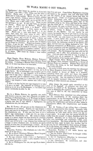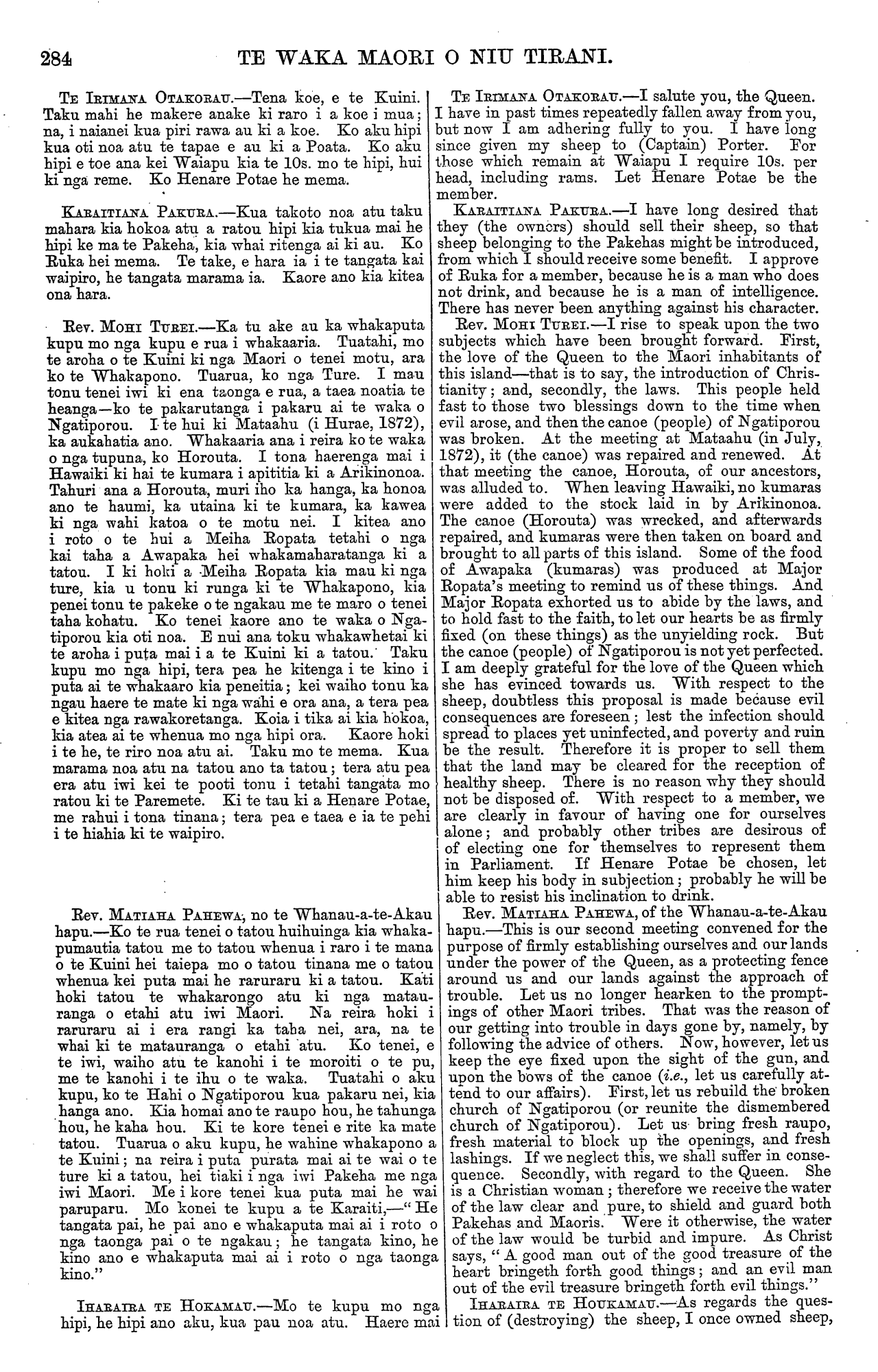284 TE WAKA MAORI O NIU TIRANI. TE IRIMANA OTAKORAU.—Tena koe, e te Kuini. Taku mahi he makere anake ki raro i a koe i mua; na, i naianei kua piri rawa au ki a koe. Ko aku hipi kua oti noa atu te tapae e au ki a Poata. Ko aku hipi e toe ana kei Waiapu kia te 10s. mo te hipi, hui ki nga reme. Ko Henare Potae he mema. KARAITIANA PAKURA.—Kua takoto noa atu taku mahara kia hoko a atu a ratou hipi kia tukua mai he hipi ke ma te Pakeha, kia whai ritenga ai ki au. Ko Ruka hei mema. Te take, e hara ia i te tangata kai waipiro, he tangata marama ia. Kaore ano kia kitea ona hara. Rev. MOHI TUREI.—Ka tu ake au ka whakaputa kupu mo nga kupu e rua i whakaaria. Tuatahi, mo te aroha o te Kuini ki nga Maori o tenei motu, ara ko te Whakapono. Tuarua, ko nga Ture. I mau tonu tenei iwi ki ena taonga e rua, a taea noatia te heanga—ko te pakarutanga i pakaru ai te waka o Ngatiporou. Ite hui ki Mataahu (i Hurae, 1872), ka aukahatia ano. Whakaaria ana i reira ko te waka o nga tupuna, ko Horouta. I tona haerenga mai i Hawaiki ki hai te kumara i apititia ki a Arikinonoa. Tahuri ana a Horouta, muri iho ka hanga, ka honoa ano te haumi, ka utaina ki te kumara, ka kawea ki nga wahi katoa o te motu nei. I kitea ano i roto o te hui a Meiha Ropata tetahi o nga kai taha a Awapaka hei whakamaharatanga ki a tatou. I ki hoki a -Meiha Ropata kia mau ki nga ture, kia u tonu ki runga ki te Whakapono, kia penei tonu te pakeke o te ngakau me te maro o tenei taha kohatu. Ko tenei kaore ano te waka o Nga- tiporou kia oti noa. E nui ana toku whakawhetai ki te aroha i puta mai i a te Kuini ki a tatou. Taku kupu mo nga hipi, tera pea he kitenga i te kino i puta ai te whakaaro kia peneitia; kei waiho tonu ka ngau haere te mate ki nga wahi e ora ana, a tera pea e kitea nga rawakoretanga. Koia i tika ai kia hokoa, kia atea ai te whenua mo nga hipi ora. Kaore hoki i te he, te riro noa atu ai. Taku mo te mema. Kua marama noa atu na tatou ano ta tatou; tera atu pea era atu iwi kei te pooti tonu i tetahi tangata mo ratou ki te Paremete. Ki te tau ki a Henare Potae, me rahui i tona tinana; tera pea e taea e ia te pehi i te hiahia ki te waipiro. Rev. MATIAHA PAHEWA, no te Whanau-a-te-Akau hapu.—Ko te rua tenei o tatou huihuinga kia whaka- pumautia tatou me to tatou whenua i raro i te mana o te Kuini hei taiepa mo o tatou tinana me o tatou whenua kei puta mai he raruraru ki a tatou. Kati hoki tatou te whakarongo atu ki nga matau- ranga o etahi atu iwi Maori. Na reira hoki i raruraru ai i era rangi ka taha nei, ara, na te whai ki te matauranga o etahi atu. Ko tenei, e te iwi, waiho atu te kanohi i te moroiti o te pu, me te kanohi i te ihu o te waka. Tuatahi o aku kupu, ko te Hahi o Ngatiporou kua pakaru nei, kia hanga ano. Kia homai ano te raupo hou, he tahunga hou, he kaha hou. Ki te kore tenei e rite ka mate tatou. Tuarua o aku kupu, he wahine whakapono a te Kuini ; na reira i puta purata mai ai te wai o te ture ki a tatou, hei tiaki i nga iwi Pakeha me nga iwi Maori. Me i kore tenei kua puta mai he wai paruparu. Mo konei te kupu a te Karaiti,—" He tangata pai, he pai ano e whakaputa mai ai i roto o nga taonga pai o te ngakau ; he tangata kino, he kino ano e whakaputa mai ai i roto o nga taonga kino." IHARAIRA TE HOKAMAU.—Mo te kupu mo nga hipi, he hipi ano aku, kua pau noa atu. Haere mai TE IRIMANA OTAKORAU.—I salute you, the Queen. I have in past times repeatedly fallen away from you, but now I am adhering fully to you. I have long since given my sheep to (Captain) Porter. For those which remain at Waiapu I require 10s. per head, including rams. Let Henare Potae be the member. KARAITIANA PAKURA.—I have long desired that they (the owners) should sell their sheep, so that sheep belonging to the Pakehas might be introduced, from which I should receive some benefit. I approve of Ruka for a member, because he is a man who does not drink, and because he is a man of intelligence. There has never been anything against his character. Rev. MOHI TUREI.—I rise to speak upon the two subjects which have been brought forward. First, the love of the Queen to the Maori inhabitants of this island—that is to say, the introduction of Chris- tianity and, secondly, the laws. This people held fast to those two blessings down to the time when evil arose, and then the canoe (people) of Ngatiporou was broken. At the meeting at Mataahu (in July, 1872), it (the canoe) was repaired and renewed. At that meeting the canoe, Horouta, of our ancestors, was alluded to. When leaving Hawaiki, no kumaras were added to the stock laid in by Arikinonoa. The canoe (Horouta) was wrecked, and afterwards repaired, and kumaras were then taken on board and brought to all parts of this island. Some of the food of Awapaka (kumaras) was produced at Major Ropata's meeting to remind us of these things. And Major Ropata exhorted us to abide by the laws, and to hold fast to the faith, to let our hearts be as firmly fixed (on these things) as the unyielding rock. But the canoe (people) of Ngatiporou is not yet perfected. I am deeply grateful for the love of the Queen which she has evinced towards us. With respect to the sheep, doubtless this proposal is made because evil consequences are foreseen ; lest the infection should spread to places yet uninfected, and poverty and ruin be the result. Therefore it is proper to sell them that the land may be cleared for the reception of healthy sheep. There is no reason why they should not be disposed of. With respect to a member, we are clearly in favour of having one for ourselves alone; and probably other tribes are desirous of of electing one for themselves to represent them in Parliament. If Henare Potae be chosen, let him keep his body in subjection; probably he will be able to resist his inclination to drink. Rev. MATIAHA. PAHEWA, of the Whanau-a-te-Akau hapu.—This is our second meeting convened for the purpose of firmly establishing ourselves and our lands under the power of the Queen, as a protecting fence around us and o