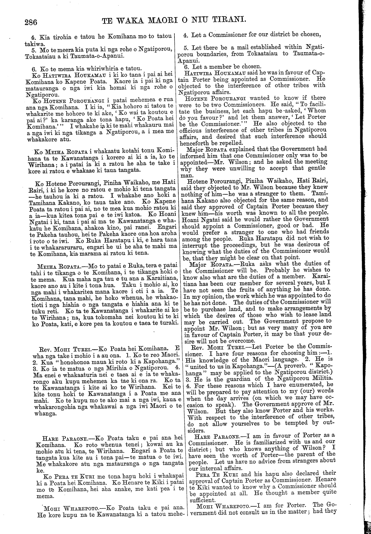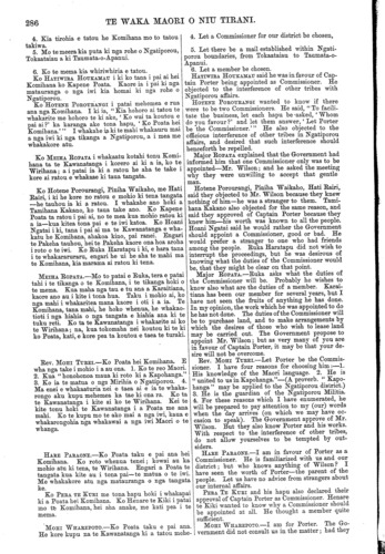 286 TE WAKA MAORI O NIU TIRANI. 4. Kia tirohia e tatou he Komihana mo to tatou takiwa. 5. Mo te meera kia puta ki nga rohe o Ngatiporou, Tokaataiau a ki Taumata-o-Apanui. 6. Ko te mema kia whiriwhiria e tatou. Ko HATIWIRA. HOUKAMAU i ki ko tana i pai ai hei Komihana ko Kapene Poata. Kaore ia i pai ki nga matauranga o nga iwi kia homai ki nga rohe o Ngatiporou. Ko HOTENE POROURANGI i patai mehemea e rua ana nga Komihana. I ki ia, " Kia hohoro ai tatou te whakarite me hohoro te ki ake, ' Ko wai ta koutou e pai ai ?' ka karanga ake tona hapu, ' Ko Poata hei Komihana.''' I whakahe ia ki te mahi whakauru mai a nga iwi ki nga tikanga a Ngatiporou, a i mea me whakakore atu. Ko MEIHA ROPATA, i whakaatu kotahi tonu Komi- hana ta te Kawanatanga i korero ai ki a ia, ko te Wirihana; a i patai ia ki a ratou he aha te take i kore ai ratou e whakaae ki taua tangata. Ko Hotene Porourangi, Piniha Waikaho, me Hati Rairi, i ki he kore no ratou e mohio ki tena tangata —he tauhou ia ki a ratou. I whakahe ano hoki a Tamihana Kakano, ko taua take ano. Ko Kapene Poata ta ratou i pai ai, no te mea kua mohio ratou ki a ia—kua kitea tona pai e te iwi katoa. Ko Hoani Ngatai i ki, tana i pai ai ma te Kawanatanga e wha- katu he Komihana, ahakoa kino, pai ranei. Engari te Pakeha tauhou, hei te Pakeha kaore ona hoa aroha i roto o te iwi. Ko Ruka Haratapu i ki, e hara tana i te whakararuraru, engari he ui he aha te mahi ma te Komihana, kia marama ai ratou ki tena. MEIHA ROPATA.—Mo to patai e Ruka, tera e patai tahi i te tikanga o te Komihana, i te tikanga hoki o te mema. Kua maha nga tau e tu ana a Karaitiana, kaore ano au i kite i tona hua. Taku i mohio ai, ko nga mahi i whakaritea mana kaore i oti i a ia. Te Komihana, tana mahi, he hoko whenua, he whakao- tioti i nga hiahia o nga tangata e hiahia ana ki te tuku reti. Ko ta te Kawanatanga i whakarite ai ko te Wirihana; na, kua tokomaha nei koutou ki te ki ko Poata, kati, e kore pea ta koutou e taea te turaki. Rev. MOHI TUREI—Ko Poata hei Komihana. E wha nga take i mohio i a au ona. 1. Ko te reo Maori. 2. Kua " honohonoa maua ki roto ki a Kapohanga." 3. Ko ia te matua o nga Mirihia o Ngatiporou. 4. Ma enei e whakaaturia nei e taea ai e ia te whaka- rongo aku kupu mehemea ka tae ki ona ra. Ko ta te Kawanatanga i kite ai ko te Wirihana. Kei te kite tonu hoki te Kawanatanga i a Poata me ana mahi. Ko te kupu mo te ako mai a nga iwi, kaua e whakarongohia nga whakawai a nga iwi Maori o te whanga. HARE PARAONE.—Ko Poata taku e pai ana hei Komihana. Ko roto whenua tenei; kowai au ka mohio atu ki tena, te Wirihana. Engari a Poata te tangata kua kite au i tona pai—te matua o te iwi. Me whakakore atu nga matauranga o nga tangata ke. Ko PERA. TE KURI me tona hapu hoki i whakapai ki a Poata hei Komihana. Ko Henare te Kiki i patai mo te Komihana, hei aha anake, me kati pea i te mema. MOHI WHAREPOTO.—Ko Poata taku e pai ana. He kore kupu na te Kawanatanga ki a tatou mehe- 4. Let a Commissioner for our district be chosen, Let there be a mail established within Ngati- porou boundaries, from Tokaataiau to Taumata-o- Apanui. 6. Let a member be chosen. HATIWIRA HOUKAMAU said he was in favour of Cap- tain Porter being appointed as Commissioner. He objected to the interference of other tribes with Ngatiporou affairs. HOTENE POROURANGI wanted to know if there were to be two Commissioners. He said, " To facili- tate the business, let each hapu be -asked, ' Whom do you favour?' and let them answer,' Let Porter be the Commissioner.'" He also objected to the officious interference of other tribes in Ngatiporou affairs, and desired that such interference should henceforth be repelled. Major ROPATA explained that the Government had informed him that one Commissioner only was to be appointed—Mr. Wilson; and he asked the meeting why they were unwilling to accept that gentle man. Hotene Porourangi, Piniha Waikaho, Hati Rairi, said they objected to Mr. Wilson because they knew nothing of him—he was a stranger to them. Tami- hana Kakano also objected for the same reason, and said they approved of Captain Porter because they knew him—his worth was known to all the people. Hoani Ngatai said he would rather the Government should appoint a Commissioner, good or bad. He would prefer a stranger to one who had friends among the people. Ruka Haratapu did not wish to interrupt the proceedings, but he was desirous of knowing what the duties of the Commissioner would be, that they might be clear on that point. Major ROPATA—Ruka asks what the duties of the Commissioner will be. Probably he wishes to know also what are the duties of a member. Karai- tiana has been our member for several years, but I have not seen the fruits of anything he has done. In my opinion, the work which he was appointed to do he has not done. The duties of the Commissioner will be to purchase land, and to make arrangements by which the desires of those who wish to lease land may be carried out. The Government propose to appoint Mr. Wilson; but as very many of you are in favour of Captain Porter, it may be that your de- sire will not be overcome. Rev. MOHI TUREI.—Let Porter be the Commis- sioner. I have four reasons for choosing him;—1. His knowledge of the Maori language. 2. He is " united to us in Kapohanga."—(A proverb. " Kapo- hanga" maybe applied to the Ngatiporou district.) 3. He is the guardian of the Ngatiporou Militia. 4. For these reasons which I have enumerated, he will be prepared to pay attention to my (our) words when the day arrives (on which we may have oc- casion to speak). The Government approve of Mr. Wilson. But they also know Porter and his works. With respect to the interference of other tribes, do not allow yourselves to be tempted by out- siders. HARE PARAONE.—I am in favour of Porter as a Commissioner. He is familiarized with us and our district; but who knows anything of Wilson ? I have seen the worth of Porter—the parent of the people. Let us have no advice from strangers about our in