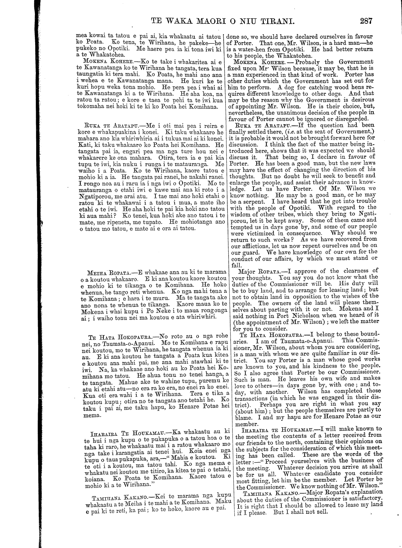 TE WAKA MAORI O NIU TIRANI. 287 mea kowai ta tatou e pai ai, kia whakaatu ai tatou ko Poata. Ko tena, te Wirihana, he pakeke—he pukeko no Opotiki. Me haere pea ia ki tona iwi ki a te Whakatohea. MOKENA KOHERE. te take i whakaritea ai e te Kawanatanga ko te Wirihana he tangata, tera kua taungatia ki tera mahi. Ko Poata, he mahi ano ana i wehea e te Kawanatanga mana. He kuri ke te kuri hopu weka tona mohio. He pera pea i whai ai te Kawanatanga ki a te Wirihana. He aha koa, na ratou ta ratou; e kore e taea te pehi ta te iwi kua tokomaha nei hoki ki te ki ko Poata hei Komihana. RUKA TE ARATAPU—Me i oti mai pea i reira e kore e whakapuakina i konei. Ki taku whakaaro he mahara ano kia whiriwhiria ai i tukua mai ai ki konei. Kati, ki taku whakaaro ko Poata hei Komihana. He tangata pai ia, engari pea ma nga ture hou nei e whakarere ke ona mahara. Otira, tera ia e pai kia tupu te iwi, kia nuku i runga i te matauranga. Me waiho i a Poata. Ko te Wirihana, kaore tatou e mohio ki a ia. He tangata pai ranei, he nakahi ranei. I rongo noa au i raru ia i nga iwi o Opotiki. Mo te matauranga o etahi iwi e kawe mai ana ki roto i a Ngatiporou, me arai atu. I tae mai ano hoki etahi o ratou ki te whakawai i a tatou i mua, a mate iho etahi o te iwi. He aha hoki te pai kia hoki ano tatou ki aua mahi ? Ko tenei, kua hoki ake ano tatou i te mate, me ripeneta, me tupato. He mohiotanga ano o tatou mo tatou, e mate ai e ora ai tatou. MEIHA ROPATA.—E whakaae ana au ki te marama o a koutou whakaaro. E ki ana koutou kaore koutou e mohio ki te tikanga o te Komihana. He hoko whenua, he tango reti whenua. Ko nga mahi tena a te Komihana ; e hara i te muru. Ma te tangata ake ano nona te whenua te tikanga. Kaore maua ko te Mokena i whai kupu i Po Neke i to maua rongonga ai : i waiho tonu nei ma koutou e ata whiriwhiri. TE HATA HOKOPAURA.—No roto au o nga rohe nei, no Taumata-o-Apanui. Mo te Komihana e rapu nei koutou, mo te Wirihana, he tangata whenua ia ki au. E ki ana koutou he tangata a Poata kua kitea e koutou ana mahi pai, me ana mahi atawhai ki te iwi. Na, ka whakaae ano hoki au ko Poata hei Ko- mihana mo tatou. He ahua tonu no tenei hanga, a te tangata. Mahue ake te wahine tupu, puremu ke atu ki etahi atu—no era ra ko era, no enei ra ko enei. Kua oti era wahi i a te Wirihana. Tera e tika a koutou kupu; otira no te tangata ano tetahi he. Ko taku i pai ai, me taku hapu, ko Henare Potae hei mema. IHARAIRA TE HOUKAMAU—Ka whakaatu au ki te hui i nga kupu o te pukapuka o a tatou hoa o te taha ki raro, he whakaatu mai i a ratou whakaaro mo nga take i karangatia ai tenei hui. Koia enei nga kupu o taua pukapuka, ara,—" Mahia e koutou. Ki te oti i a koutou, ma tatou tahi. Ko nga mema e whakatu nei koutou me titiro, ka kitea te pai o tetahi, koiana. Ko Poata te Komihana. Kaore tatou e mohio ki a te Wirihana." TAMIHANA. KAKANO.—Kei te marama nga kupu whakaatu a te Meiha i te mahi a te Komihana. Maku e pai ki te reti, ka pai; ko te hoko, kaore au e pai. done so, we should have declared ourselves in favour of Porter. That one, Mr. Wilson, is a hard man—he is a water-hen from Opotiki. He had better return to his people, the Whakatohea. MOKENA KOHEKE.—Probably the Government fixed upon Mr Wilson because, it may be, that he is a man experienced in that kind of work. Porter has other duties which the Government has set out for him to perform. A dog for catching wood hens re- quires different knowledge to other dogs. And that may be the reason why the Government is desirous of appointing Mr. Wilson. He is their choice, but nevertheless, the unanimous decision of the people in favour of Porter cannot be ignored or disregarded. RUKA. TE ARATAPU.—If the question had been finally settled there, (i.e. at the seat of Government,) it is probable it would not be brought forward here for discussion. I think the fact of the matter being in- troduced here, shows that it was expected we should discuss it. That being so, I declare in favour of Porter. He has been a good man, but the new laws may have the effect of changing the direction of his thoughts. But no doubt he will seek to benefit and enlarge the people, and assist their advance in know- ledge. Let us have Porter. Of Mr- Wilson we know nothing. He may be a good man, or ho may be a serpent. I have heard that he got into trouble with the people of Opotiki. With regard to the wisdom of other tribes, which they bring to Ngati- porou, let it be kept away. Some of them came and tempted us in days gone by, and some of our people were victimized in consequence. Why should we return to such works ? As we have recovered from our afflictions, let us now repent ourselves and be on our guard. We have knowledge of our own for the conduct of our affairs, by which we must stand or fall. Major ROPATA.—I approve of the clearness of your thoughts. You say you do not know what the duties of the Commissioner will be. His duty will be to buy land, and to arrange for leasing land ; but not to obtain land in opposition to the wishes of the people. The owners of the land will please them- selves about parting with it or not. Mokena and I said nothing in Port Nicholson when we heard of it (the appointment of Mr. Wilson) ; we left the matter for you to consider. TE HATA. HOKOPAURA.—I belong to these bound- aries. I am of Taumata-o-Apanui. This Commis- sioner, Mr. Wilson, about whom you are considering, is a man with whom we are quite familiar in our dis- trict. You say Porter is a man whose good works are known to you, and his kindness to the people. So I also agree that Porter be our Commissioner. Such is man. He leaves his own wife and makes love to others—in days gone by, with ono ; and to- day, with another. Wilson has completed those transactions (in which he was engaged in their dis- trict). Perhaps you are right in what you say (about him) ; but the people themselves are partly to blame. I and my hapu are for Henare Potae as our member. IHARAIRA TE HOUKAMAU.—I will make known to th