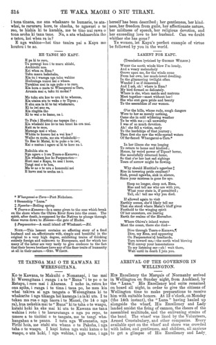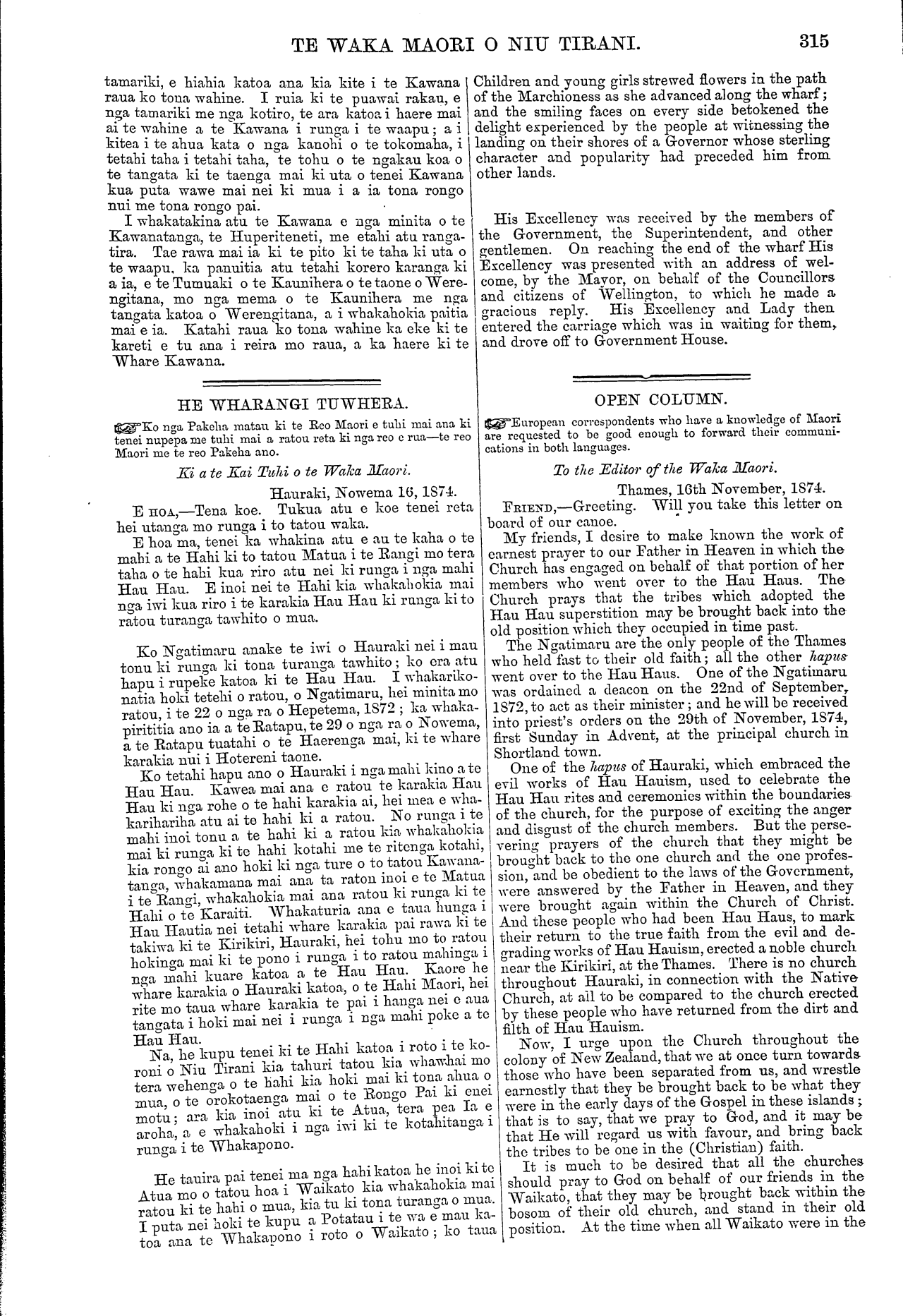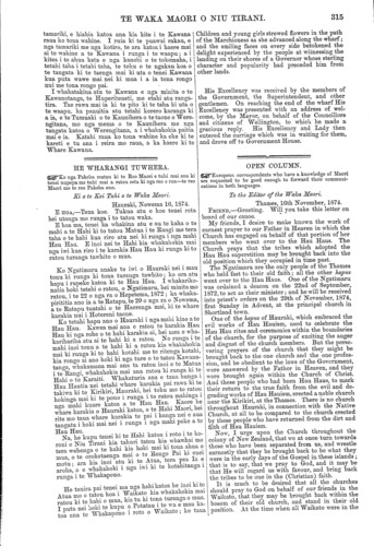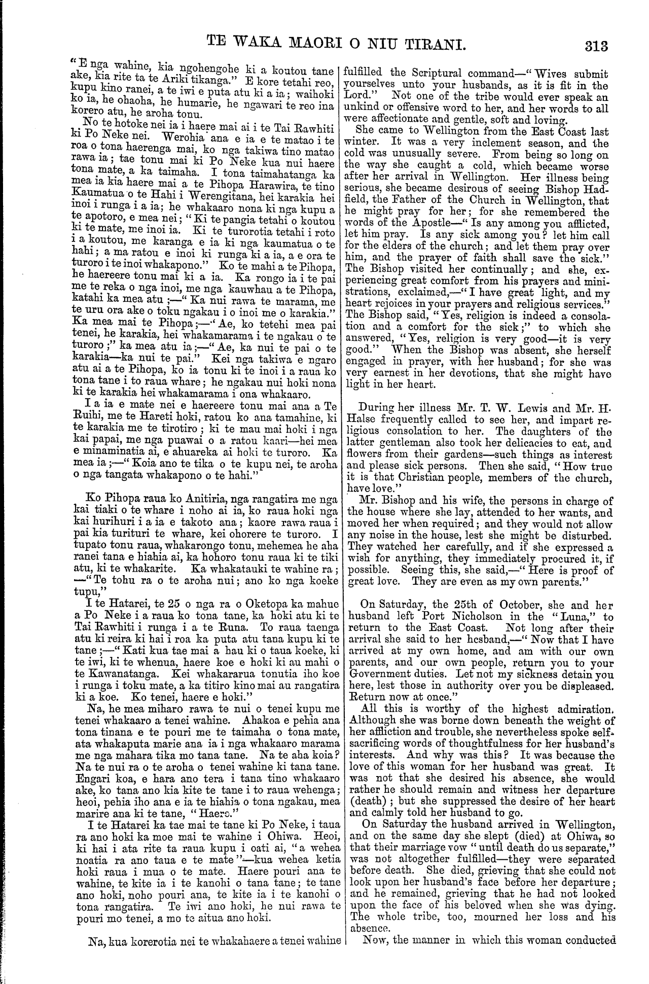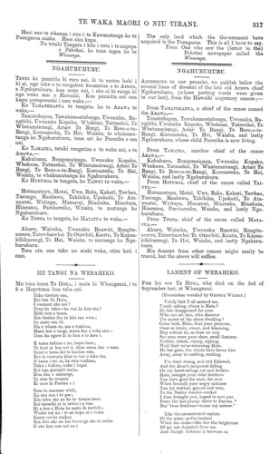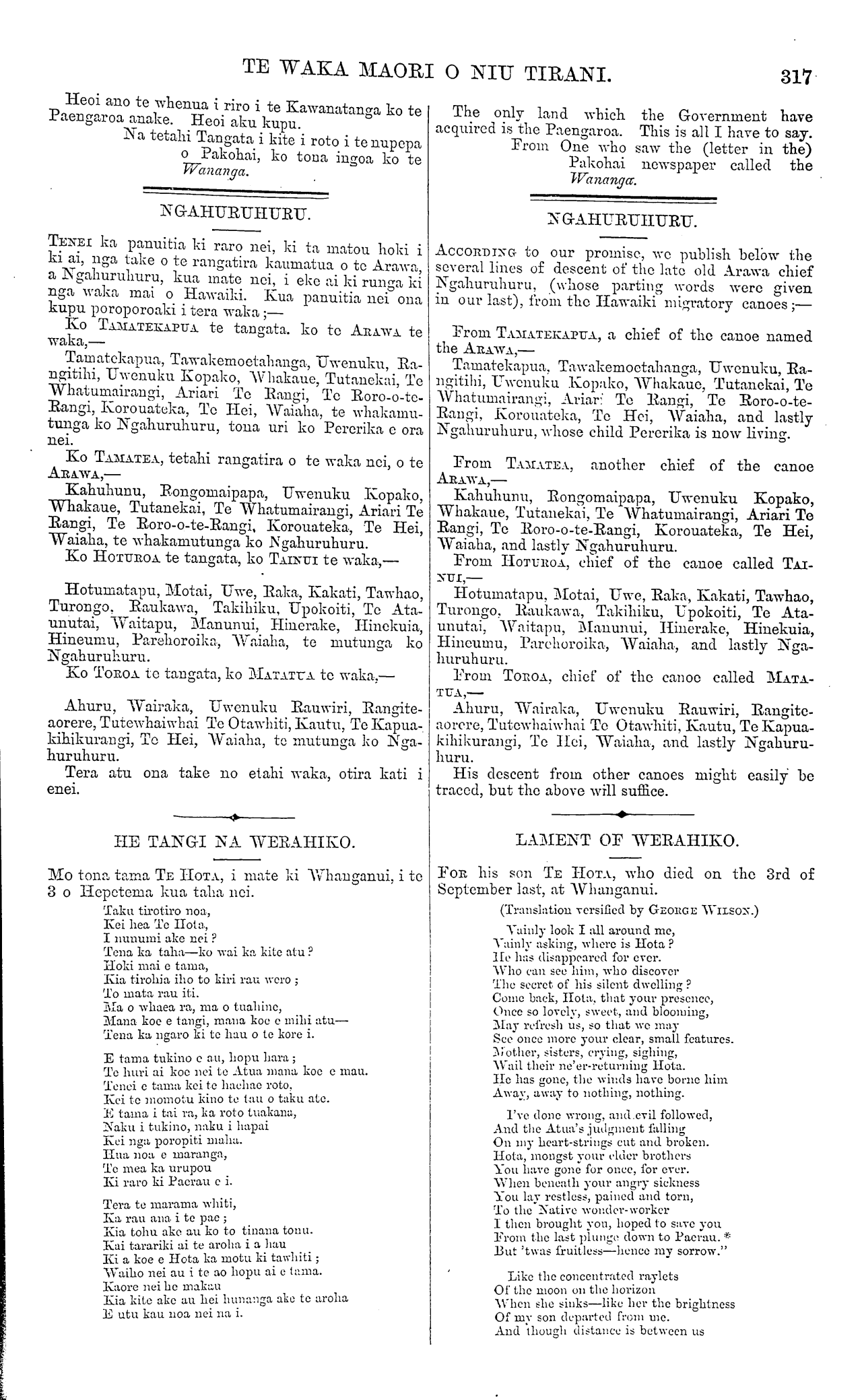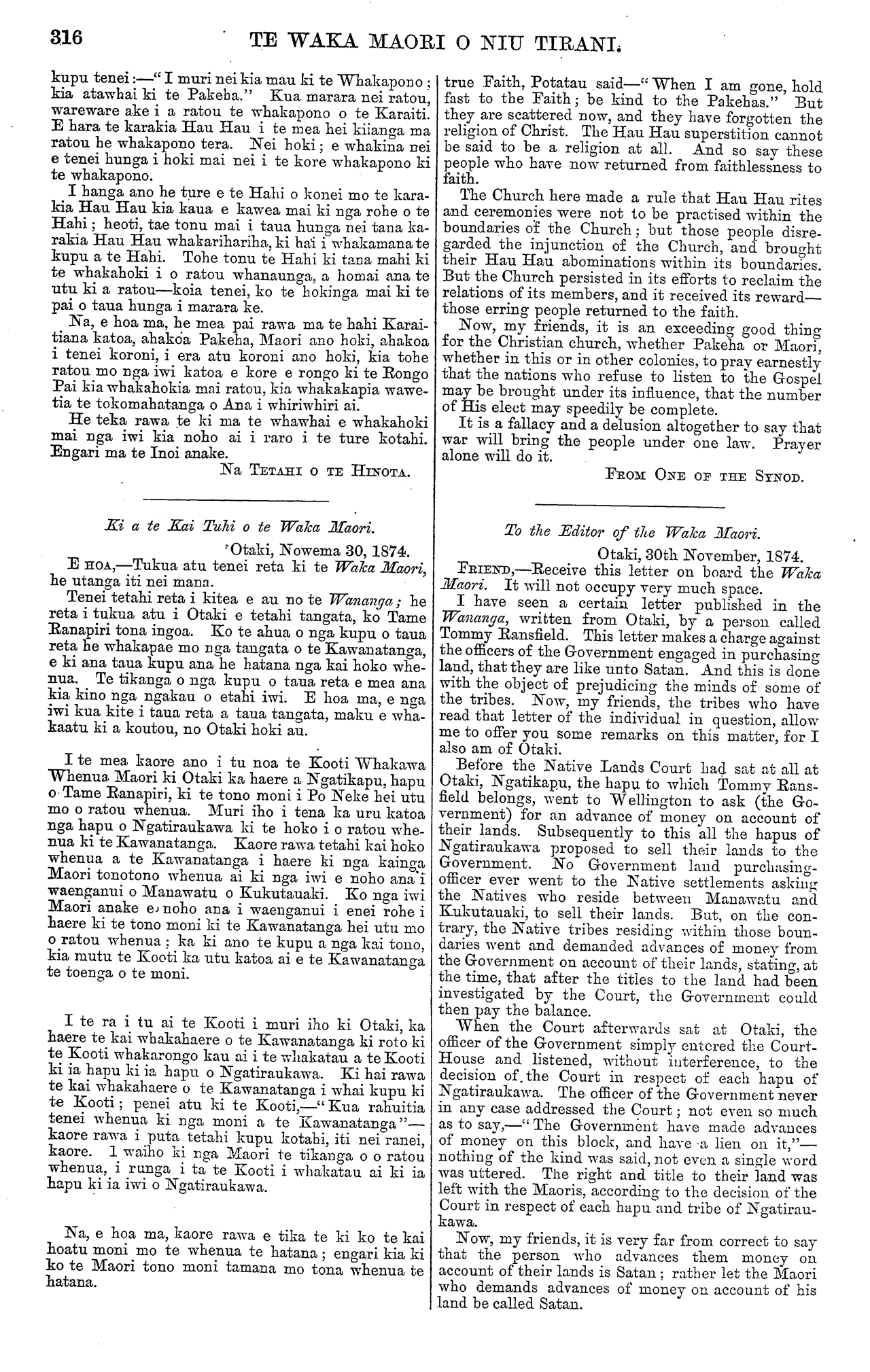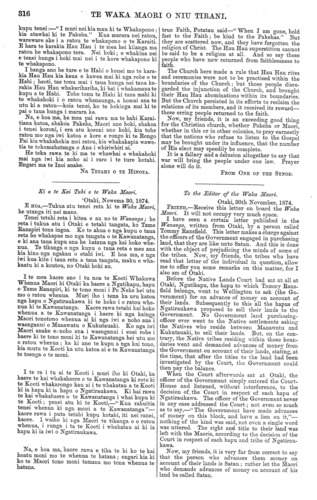 TE WAKA MAORI O NIU TIRANI. ———————————————————— "KO TE TIKA, KO TE PONO, KO TE AROHA." VOL. 10.] PO NEKE, TUREI, TIHEMA 15, 1874. [No. 25. HE KUPU WHAKAATU KI NGA HOA TUHI MAI He moni kua tae mai:— £ s. d. 1875.—Matiu Kapene, o Waikouaiti Otakou ... 1 O O 1875. Tamati Tautuhi, o Waipiro, Tai Rawhiti O 10 O 1873. Tamati Tautuhi, o Waipiro, Tai Rawhiti O 10 O 1875.—Hoparu, o Waikouaiti, Otakou ... ... 010 O £2 10 O E whakawhetai atu ana matou ki te atawhai o tera tangata, o Matiu Kapene, o Waikouaiti, e tuku tonu mai nei ia te pauna tinana, £1, ia tau ia tau, mo te Waka ki a ia. He pai kia whai etahi o o matou hoa taka-roa ki te tauira kua takoto i a ia. He tangata hou a Hoparu, o Waikouaiti, ki te tango i te nu- pepa nei; a kua tupato rawa ia ki te ki mai kia pai atu he ko- rero mo te nupepa ki a ia i a etahi atu. Kua tukua mai e te Rev. O: P. Mutu, o Kaiapoi, he panui mo te matenga o Etera te Muru, " he rangatira kaumatua rawa atu, he mea pani tonu tona tinana me ona kakahu ki te kokowai"— [ he ritenga ia no mua na nga kaumatua tohunga i te wa o te ma- kutu. I mua ai he tohunga karakia Maori ia, he tangata rahi, he tangata mana. He tapu tona tinana, e kore e tata te kai ki ona nohoanga, ki ona takotoranga. Ka rua nga tau o tona urunga ki te Hahi; i iriiria e te Pihopa o Karaitiati. I muri nei wareware tonu ake ia ki nga mea katoa i muri kau ; engari i totoro tonu atu ki nga mea me nga mahi o mua, o tona tama- rikitanga. Tokowha tonu ona whanau e ora nei, he kaumatua anake. Ko te Uki tana tamaiti kaumatua, ko ona tau e rite ana ki te 76 ; ae whakaatu mai ana te Rev. G. P. Mutu, e ki ana, i runga i te ata rapu a nga Maori me nga Pakeha ki nga tau a taua koroheke, kitea ana kaore i hoki iho i te 150 tau! Tena kua tukuna atu ki a Tamati Tautuhi nga nupepa o te tau 1873 ki runga ki tana tono. Kaore he tikanga o te reta a H. Hapai. Kua panuitia katoatia e matou nga korero o te hui ki Wharekahika, a kaore he tikanga e hoki ai ano ki aua korero. . . Me tuku mai e Paora Paniiraira, o Kawatiri, kia te 10s. Me kawe e ia aua moni ki te Potapeta, ka tono ai ki reira kia homai he pukapuka hei tukunga mai mana ki te Kai Tuhi o te Me homai e Aperahama Mira, o Wainui, kia te 10s. ki a te Kai Tuhi, ka tuku atu ai he nupepa ki a ia. Kaore e pai nga korero o te reta a Hutana Taru kia panuitia. Mo nga tangata e ki nei ia, ki te mea ka takaro ratou, ka raweke ki te ahi, kaua ratou e oho mehemea ka wera ratou—na ratou ano hoki. . E ki mai ana Te Kiwi, o Harataunga,, Tai Rawhiti, i kite ratou nga Maori i t.etahi tohu i te rangi .i te 9 o nga haora o te po o te 25 o nga ra o Nowema. Tana whakaatu mai i te ahua o taua mea i te tikanga iho i te rangi i penei me te rere wai NOTICES AND ANSWERS TO CORRESPONDENTS. Subscriptions received :— £ s. d. 1875.—Matthew Kapene, of Waikouaiti, Otago 100 „ Tamati Tautuhi, of Waipiro, East Coast O IO O 1873.—Ditto ... ... ... ... ... O 10 O 1875.—Hoparu, of Waikouaiti, Otago ... ... 010 O £2 10 0 We beg to express our appreciation of the liberality of Matthew Kapene, of Waikouaiti, who regularly remits to us, each year, the sum of £1 as his subscription for the Waka. We wish some of our long-winded friends would follow his example. Hoparu, of Waikouaiti, is a new subscriber, and ho is careful to stipulate that the "korero," in his particular paper, must bo more than usually interesting. The Rev. G. F. Mutu, of Kaiapoi, sends a notice of the death of Etera te Muru, " a very ancient chief, whose body and clothes were always daubed over with red ochre "—a common practice among the old seers in the days of witchcraft and necromancy. In olden times he was a magician possessing great power and influence. His body was sacred, and no food was ever suffered to be brought in contact with any place where he sat or reclined. About two years ago he was baptized by the Bishop of Christchurch, and became a member of the Church. Of late his mind became oblivious of things passing around him, although he seemed to retain a pretty clear recol- lection of the events and scenes of his early life. He has four children living, all old men. His eldest son, Te Uki, is said to be 76 years of age ; and our correspondent informs us that, according to the calculations of both Maoris and Pakehas, he himself could not have been less than 150 years old! The papers for 1873 are sent to Tamati Tautuhi as requested. Letter of H. Hapai of no consequence. We have already given a full report of the meeting at Wharekahika, and it is unnecessary to refer to it again. Paora Paniiraira, of Westport, can forward his subscription, which is 10s., by Post-office order, payable to the Editor. Aperahama Mira, of Wainui, should remit 10s. to the Editor, and the paper will be sent to him. The subject of Hutana Taru's letter is unfit for publication. If the parties referred to will play with fire, they must not be . surprised if they get burned. Te Kiwi, of Kennedy's Bay, East Coast:., states that-., at; nine o'clock on the night of the 25th of November last, the Natives , observed a meteor in the heavens. Ue describes its appearance . I as that of a " waterfall descending from the heavens, broad at