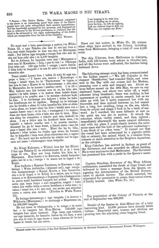 808 TE WAKA MAORI O NIU TIRANI. nei, i nui a raro i iti a runga, ma tonu me te huka papa." I te wa tonu i puta taua tohu e whakahemohemo ana ta ratou tamaiti, a Makoare Tuatai; a e ahua whakaaro ana ratou he tohu mate mo taua tamaiti i puta ai taua mea kanapu i te rangi. Tenei kua kite matou ko te nuinga atu o nga korero i roto i te Wananga o muri nei (te 24 o Nowema) he mea tango atu i roto i te Waka Maori—te taha Pakeha me te taha Maori—a kaore hoki i whakaaturia i roto i taua nupepa he mea pera aua korero. Te tikanga o nga nupepa Pakeha, ka tangohia he korero no tetahi nupepa ka panuitia i tetahi nupepa, ka whakaatu i te ingoa o te nupepa i tangohia ai. Kua kite matou i nga kupu a te tangata o Rotorua, kai tuku korero ki te Pei o Pereneti Taima, nupepa Pakeha nei kei Tauranga, i tuhia e ia i te 14 o nga ra o Nowema mo te matenga o te rangatira o te Arawa, a Ngahuruhuru, i mate i te 28 o nga ra o Oketopa, i tino rite pu aua kupu ki nga kupu o ta matou korero i tuhia e matou i te 20 o nga ra o Oketopa mo te matenga o Haora Tipa, rangatira o Ngatipaoa, i Hauraki. Katahi marire nga korero i ata tupono rawa ai te rite o nga kupu! HE TANGATA MATE. EMA KUPU TE TIPITIPI, ki Ohiwa, Tai Rawhiti, i te 28 o Nowema, 1874. RAWHIRA TIMO, i mate i te Wairoa, Haaki Pei, i te 22 o nga ra o Nowema, 1874. Ona tau 17. ETERA TE MURU, he rangatira tino kaumatua rawa no Ngaitahu, i mate ki Kaiapoi, i te 25 o Nowema, 1874. MAKOARE TUATAI, i mate ki Harataunga, Tai Rawhiti, i te 5 o Tihema, 1874. Ko TE ROPIHA. MOTUROA, he tino kaumatua rawa no te Mate- hou hapu o Ngatiawa. I mate ki Pipitea, Werengitana, i te Paraire, te 11 o Tihema, 1874. TE UTU MO TE WAKA. Ko te utu mu te Waka Maori i te tau ka te 10s; he mea utu ki mua. Ka tukuna atu i te meera ki te tangata e hiahia ana me ka tukua mai e ia aua moni ki te Kai Tuhi ki Po Neke nei. PO NEKE, TUREI, TIHEMA 15, 1874. TE TUKUNGA O WHIITII. KUA mohio o matou hoa Maori ki nga motu o Whiitii kua tukua rawatia ki a te Kuini. He whakawhaiti- tanga tenei i raro nei o nga korero o taua mahi i panuitia i roto i te Whiitii Aakahi, nupepa o reira, ara:— I tuhituhia ki te pukapuka tukunga, i Nahowa, i te 10 o nga ra o Oketopa kua taha nei, nga ingoa o Kingi Kakopau me nga tino rangatira o te iwi. Tukuna mariretia ana e nga tangata nona te take tuturu o te whenua, no o ratou tupuna tuku iho ki a ratou, te tino rangatiratanga me te mana ki runga ki aua motu me nga tangata hoki ki a Ta Hakiurihi Hori Ropata Ropitini, te tino Komihana o te Kuini i whakaritea mo taua mahi (ko te Kawana hoki ia o Hirmi), a whakaaetia ana e ia, mo te taha ki a te Kuini, kia riro i a ia (i a te Kuini) te rangatiratanga me te mana o aua motu. He mea tuku na taua iwi i runga i to ratou whakaaro ake ano, e hara i te mea i tonoa kia peratia. Ko te haki o Whiitii i tukua ki raro ki te whenua, a i whakakorea rawatia te mana o taua haki kia kore, ake tonu atu; ko te tino Haki o Ingarani i hutia ake ki runga ki te iringa o taua haki. Ko nga kaipuke manawaa o te Kuini (ara, he kaipuke whawhai), a te Peara raua ko te Taito, i tetahi wahi tata rawa ki te Whare Kawanatanga e tau ana. He tini nga heramana me nga hoia o aua kaipuke, mau pu rawa, me nga apiha i o ratou kakahu whakapaipai rawa, i tukua ki uta hei hunga whakahonore i taua mahi. Ko tetahi whana o nga heramana me nga hoia i whakaturia ki te taha ki te tonga o te marae i te roro o te whare. Ko tetahi whana o.nga hoia Maori o Whiitii i tu hangai ki a ratou i tetahi taha o te marae, i te taha tuaraki—ko the base and small at the top, white as frost." Just at the time of its appearance their child, Makoare Tuatai, was lying at the point of death; and they seem to think that this strange luminary in the heavens was ominous of the death of the child. We perceive that the contents of the last issue of the Warna- nga (November 24) have been taken almost entirely from the Waka Maori—both the English and Maori versions—without acknowledgment. When an article is copied in a Pakeha news- paper from another paper, it is customary to name the paper from which it is taken. We notice that the Rotorua correspondent of the Bay of Plenty Times, writing, on the 14th of November, about the death of the Arawa chief Ngahuruhuru, of Rotorua, on the 28th of October, employs the exact words used by us on the 20th of October, in our obituary notice of Haora Tipa, a Ngatipaoa chief of Hauraki (Thames). A most extraordinary coincidence truly! DEATHS. EMA KArU TE TIPITIPI, at Ohiwa, East Coast, on the 28th of November, 1874. RAWHIRA TIMO, at Wairoa, Hawke's Bay, on the 22nd No- vember, 1874, aged 17 years. ETERA TE MUKU, a very aged chief of Ngaitahu, at Kaiapoi, on the 25th of November, 1874. MAKOARE TUATAI, at Harataunga, East Coast, on the 5th of December, 1874. TE ROPIHA MOTUROA, a very aged chief of the Matehou hapu of Ngatiwa, at Pipitea, Wellington, on Friday, 11th December, 1874. TERMS OF SUBSCRIPTION. The Subscription to the Waka Maori is 10s., pay able in advance, per year. Persons desirous of becoming subscribers can have the paper posted to their address by forwarding that amount to the Editor in Wellington. WELLINGTON, TUESDAY, DECEMBER 15, 1874. ANNEXATION OF FIJI. OUE Maori readers are aware that the islands of Fiji have been ceded to Her Majesty the Queen. The following is a condensed account of the proceed- ings as reported in the Fiji Argus :— The instrument of cession was signed at Nasova, on Saturday, the 10th of October last, by King Cakobau and the high chiefs of the nation. The hereditary owners and occupiers of the soil voluntarily and un- conditionally ceded and signed away full sovereignty and dominion over the islands, and the inhabitants thereof, to Sir Hercules George Robert Robinson, the Queen's Special Commissioner, who accepted the same on behalf of Her Majesty. The Fijian banner was" lowered to the ground and extinguished for ever, and the Royal Standard of England was hoisted in its place. The British war ships " Pearl" and " Dido 
