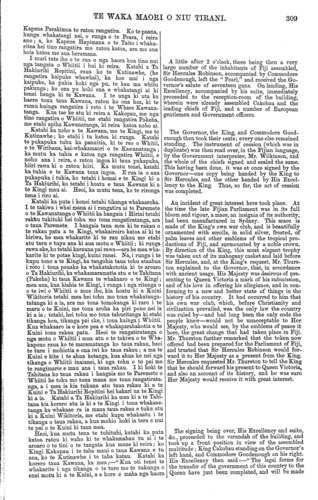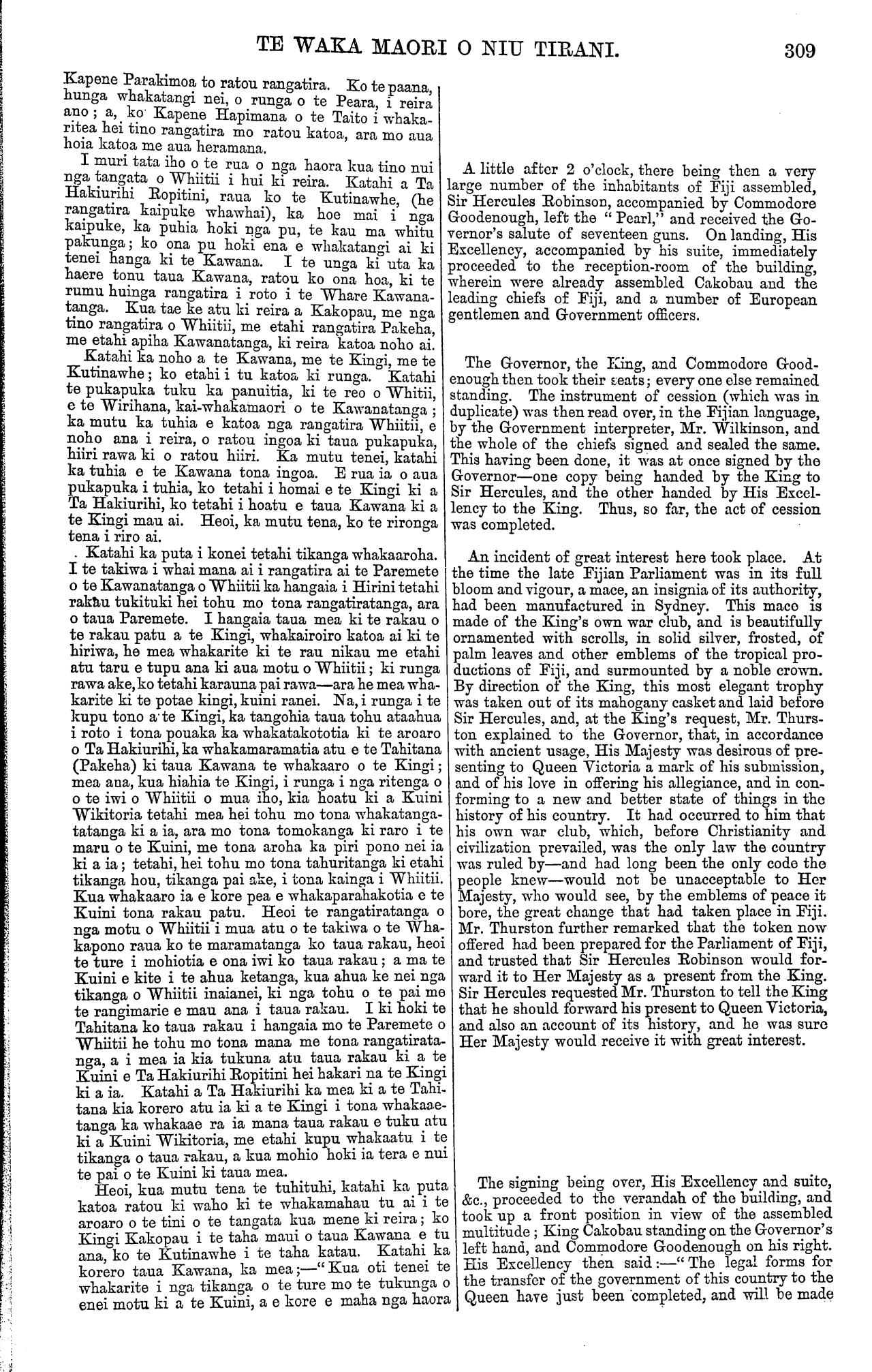 TE WAKA MAORI O NIU TIRANI. 309 Kapene Parakimoa to ratou rangatira. Ko te paana, hunga whakatangi nei, o runga o te Peara, i reira ano ; a, ko Kapene Hapimana o te Taito i whaka- ritea hei tino rangatira mo ratou katoa, ara mo aua hoia katoa me aua heramana. I muri tata iho o te rua o nga haora kua tino nui nga tangata o Whiitii i hui ki reira. Katahi a Ta Hakiurihi Ropitini, raua ko te Kutinawhe, (he rangatira kaipuke whawhai), ka hoe mai i nga kaipuke, ka puhia hoki nga pu, te kau ma whitu pakunga; ko ona pu hoki ena e whakatangi ai ki tenei hanga ki te Kawana. I te unga ki uta ka haere tonu taua Kawana, ratou ko ona hoa, ki te rumu huinga rangatira i roto i te Whare Kawana- tanga. Kua tae ke atu ki reira a Kakopau, me nga tino rangatira o Whiitii, me etahi rangatira Pakeha, me etahi apiha Kawanatanga, ki reira katoa noho ai. Katahi ka noho a te Kawana, me te Kingi, me te Kutinawhe; ko etahi i tu katoa ki runga. Katahi te pukapuka tuku ka panuitia, ki te reo o Whitii, e te Wirihana, kai-whakamaori o te Kawanatanga ; ka mutu ka tuhia e katoa nga rangatira Whiitii, e noho ana i reira, o ratou ingoa ki taua pukapuka, huri rawa ki o ratou huri. Ka mutu tenei, katahi ka tuhia e te Kawana tona ingoa. E rua ia o aua pukapuka i tuhia, ko tetahi i homai e te Kingi ki a Ta Hakiurihi, ko tetahi i hoatu e taua Kawana ki a te Kingi mau ai. Heoi, ka mutu tena, ko te rironga tena i riro ai. . Katahi ka puta i konei tetahi tikanga whakaaroha. I te takiwa i whai mana ai i rangatira ai te Paremete o te Kawanatanga o Whiitii ka hangaia i Hirini tetahi rakau tukituki hei tohu mo tona rangatiratanga, ara o taua Paremete. I hangaia taua mea ki te rakau o te rakau patu a te Kingi, whakairoiro katoa ai ki te hiriwa, he mea whakarite ki te rau nikau me etahi atu taru e tupu ana ki aua motu o Whiitii; ki runga rawa ake, ko tetahi karauna pai rawa—ara he mea wha- karite ki te potae kingi, kuini ranei. Na, i runga i te kupu tono a te Kingi, ka tangohia taua tohu ataahua i roto i tona pouaka ka whakatakotoria ki te aroaro o Ta Hakiurihi, ka whakamaramatia atu e te Tahitana (Pakeha) ki taua Kawana te whakaaro o te Kingi; mea ana, kua hiahia te Kingi, i runga i nga ritenga o o te iwi o Whiitii o mua iho, kia hoatu ki a Kuini Wikitoria tetahi mea hei tohu mo tona whakatanga- tatanga ki a ia, ara mo tona tomokanga ki raro i te maru o te Kuini, me tona aroha ka piri pono nei ia ki a ia; tetahi, hei tohu mo tona tahuritanga ki etahi tikanga hou, tikanga pai ake, i tona kainga i Whiitii. Kua whakaaro ia e kore pea e whakaparahakotia e te Kuini tona rakau patu. Heoi te rangatiratanga o nga motu o Whiitii i mua atu o te takiwa o te Wha- kapono raua ko te maramatanga ko taua rakau, heoi te ture i mohiotia e ona iwi ko taua rakau; a ma te Kuini e kite i te ahua ketanga, kua ahua ke nei nga tikanga o Whiitii inaianei, ki nga tohu o te pai me te rangimarie e mau ana i taua rakau. I ki hoki te Tahitana ko taua rakau i hangaia mo te Paremete o Whiitii he tohu mo tona mana me tona rangatirata- nga, a i mea ia kia tukuna atu taua rakau ki a te Kuini e Ta Hakiurihi Ropitini hei hakari na te Kingi ki a ia. Katahi a Ta Hakiurihi ka mea ki a te Tahi- tana kia korero atu ia ki a te Kingi i tona whakaae- tanga ka whakaae ra ia mana taua rakau e tuku atu ki a Kuini Wikitoria, me etahi kupu whakaatu i te tikanga o taua rakau, a kua mohio hoki ia tera e nui te pai o te Kuini ki taua mea. Heoi, kua mutu tena te tuhituhi, katahi ka puta katoa ratou ki waho ki te whakamahau tu ai i te aroaro o te tini o te tangata kua mene ki reira; ko Kingi Kakopau i te taha maui o taua Kawana e tu ana, ko te Kutinawhe i te taha katau. Katahi ka korero taua Kawana, ka mea;—"Kua oti tenei te whakarite i nga tikanga o te ture mo te tukunga o enei motu ki a te Kuini, a e kore e maha nga haora A little after 2 o'clock, there being then a very large number of the inhabitants of Fiji assembled, Sir Hercules Robinson, accompanied by Commodore Goodenough, left the " Pearl," and received the Go- vernor's salute of seventeen guns. On landing, His Excellency, accompanied by his suite, immediately proceeded to the reception-room of the building, wherein were already assembled Cakobau and the leading chiefs of Fiji, and a number of European gentlemen and Government officers. The Governor, the King, and Commodore Good- enough then took their seats; every one else remained standing. The instrument of cession (which was in duplicate) was then read over, in the Fijian language, by the Government interpreter, Mr. Wilkinson, and the whole of the chiefs signed and sealed the same. This having been done, it was at once signed by the Governor—one copy being handed by the King to Sir Hercules, and the other handed by His Excel- lency to the King. Thus, so far, the act of cession was completed. An incident of great interest here took place. At the time the late Fijian Parliament was in its full bloom and vigour, a mace, an insignia of its authority, had been manufactured in Sydney. This mace ia made of the King's own war club, and is beautifully ornamented with scrolls, in solid silver, frosted, of palm leaves and other emblems of the tropical pro- ductions of Fiji, and surmounted by a noble crown. By direction of the King, this most elegant trophy was taken out of its mahogany casket and laid before Sir Hercules, and, at the King's request, Mr. Thurs- ton explained to the Governor, that, in accordance with ancient usage, His Majesty was desirous of pre- senting to Queen Victoria a mark of his submission, and of his love in offering his allegiance, and in con- forming to a new and better state of things in the history of his country. It had occurred to him that his own war club, which, before Christianity and civilization prevailed, was the only law the country was ruled by—and had long been the only code the people knew—would not be unacceptable to Her Majesty, who would see, by the emblems of peace it bore, the great change that had taken place in Fiji. Mr. Thurston fu