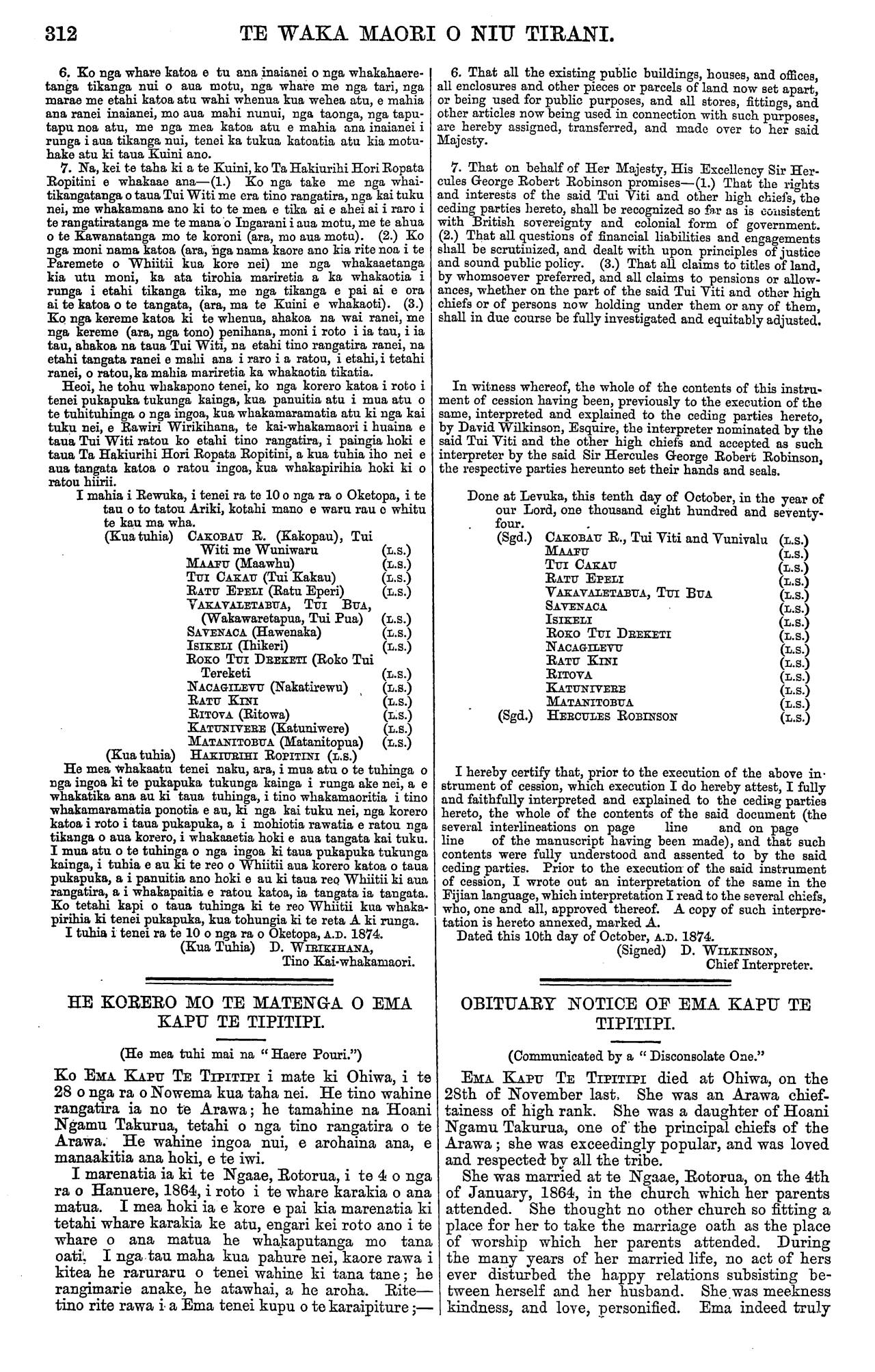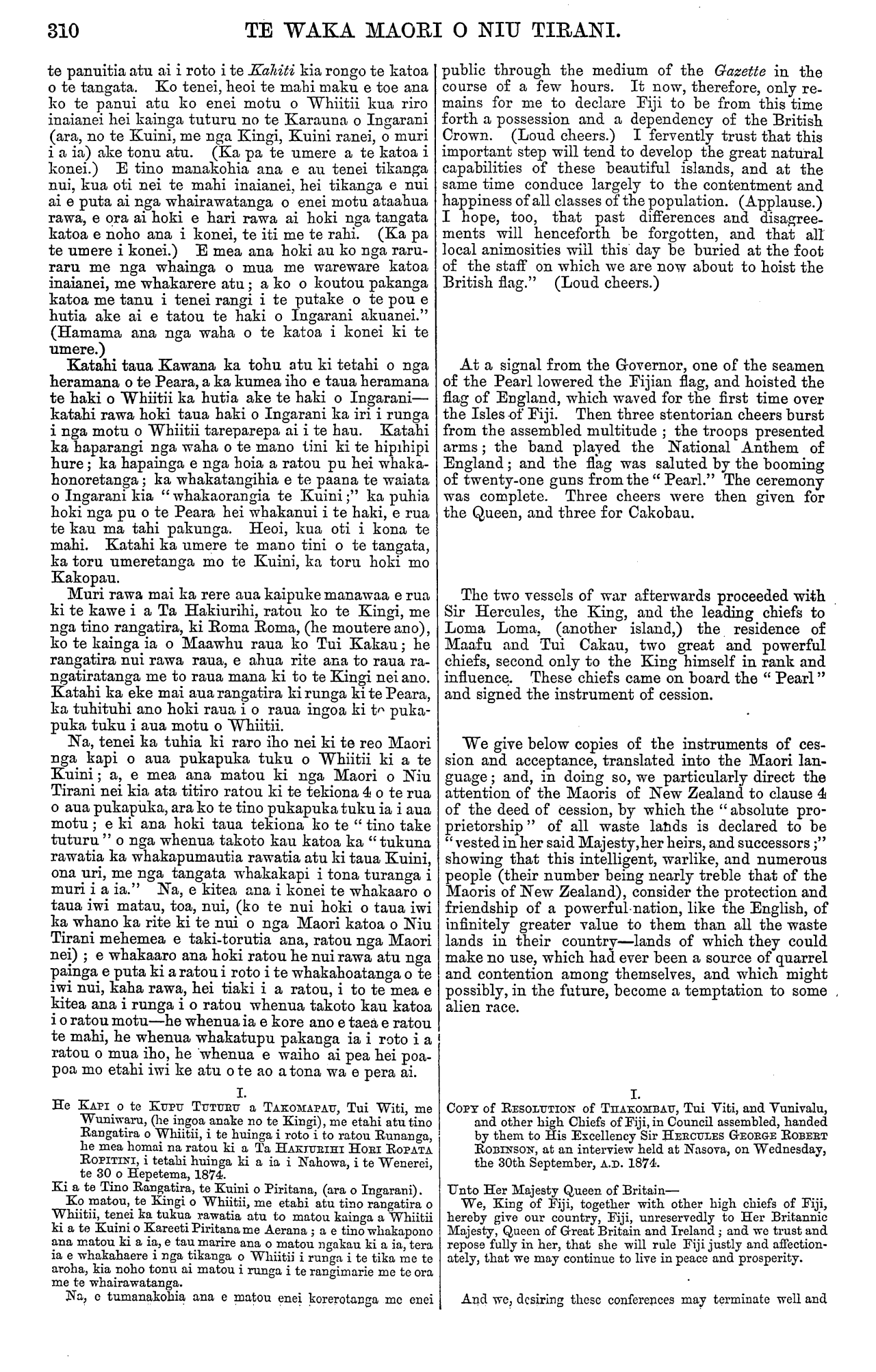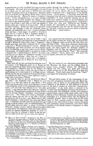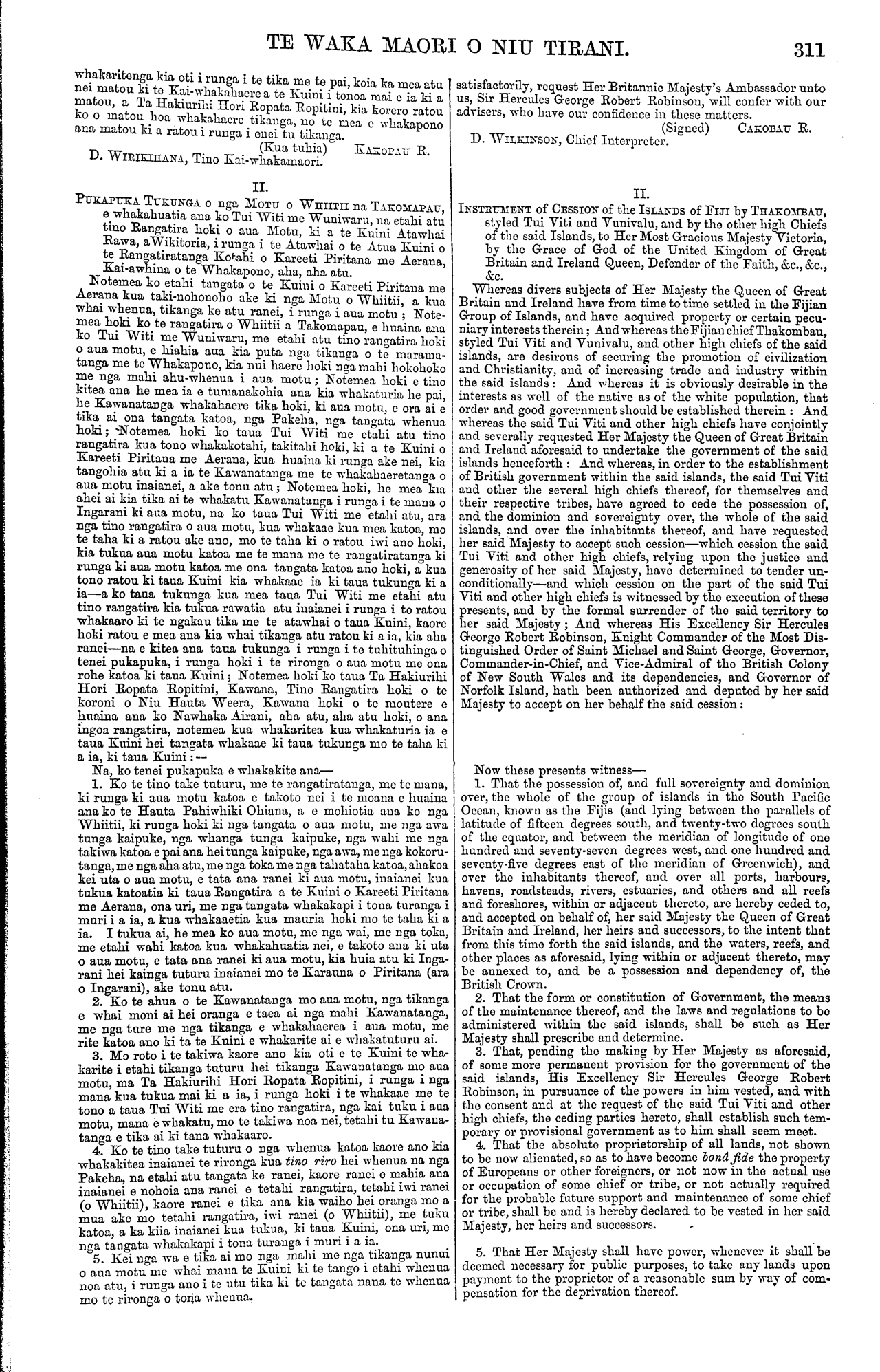 310 TE WAKA MAORI O NIU TIRANI. te panuitia atu ai i roto i te Kahiti kia rongo te katoa o te tangata. Ko tenei, heoi te mahi maku e toe ana ko te panui atu ko enei motu o Whiitii kua riro inaianei hei kainga tuturu no te Karauna o Ingarani (ara, no te Kuini, me nga Kingi, Kuini ranei, o muri i a ia) ake tonu atu. (Ka pa te umere a te katoa i konei.) E tino manakohia ana e au tenei tikanga nui, kua oti nei te mahi inaianei, hei tikanga e nui ai e puta ai nga whairawatanga o enei motu ataahua rawa, e ora ai hoki e hari rawa ai hoki nga tangata katoa e noho ana i konei, te iti me te rahi. (Ka pa te umere i konei.) E mea ana hoki au ko nga raru- raru me nga whainga o mua me wareware katoa inaianei, me whakarere atu; a ko o koutou pakanga katoa me tanu i tenei rangi i te putake o te pou e hutia ake ai e tatou te haki o Ingarani akuanei." (Hamama ana nga waha o te katoa i konei ki te umere.) Katahi taua Kawana ka tohu atu ki tetahi o nga heramana o te Peara, a ka kumea iho e taua heramana te haki o Whiitii ka hutia ake te haki o Ingarani— katahi rawa hoki taua haki o Ingarani ka iri i runga i nga motu o Whiitii tareparepa ai i te hau. Katahi ka haparangi nga waha o te mano tini ki te hipihipi hure; ka hapainga e nga hoia a ratou pu hei whaka- honoretanga; ka whakatangihia e te paana te waiata o Ingarani kia "whakaorangia te Kuini;" ka puhia hoki nga pu o te Peara hei whakanui i te haki, e rua te kau ma tahi pakunga. Heoi, kua oti i kona te mahi. Katahi ka umere te mano tini o te tangata, ka toru umeretanga mo te Kuini, ka toru hoki mo Kakopau. Muri rawa mai ka rere aua kaipuke manawaa e rua ki te kawe i a Ta Hakiurihi, ratou ko te Kingi, me nga tino rangatira, ki Roma Roma, (he moutere ano), ko te kainga ia o Maawhu raua ko Tui Kakau; he rangatira nui rawa raua, e ahua rite ana to raua ra- ngatiratanga me to raua mana ki to te Kingi nei ano. Katahi ka eke mai aua rangatira ki runga ki te Peara, ka tuhituhi ano hoki raua i o raua ingoa ki te puka- puka tuku i aua motu o Whiitii. Na, tenei ka tuhia ki raro iho nei ki te reo Maori nga kapi o aua pukapuka tuku o Whiiti! ki a te Kuini; a, e mea ana matou ki nga Maori o Niu Tirani nei kia ata titiro ratou ki te tekiona 4 o te rua o aua pukapuka, ara ko te tino pukapuka tuku ia i aua motu; e ki ana hoki taua tekiona ko te " tino take tuturu " o nga whenua takoto kau katoa ka "tukuna rawatia ka whakapumautia rawatia atu ki taua Kuini, ona uri, me nga tangata whakakapi i tona turanga i muri i a ia." Na, e kitea ana i konei te whakaaro o taua iwi matau, toa, nui, (ko te nui hoki o taua iwi ka whano ka rite ki te nui o nga Maori katoa o Niu Tirani mehemea e taki-torutia ana, ratou nga Maori nei) ; e whakaaro ana hoki ratou he nui rawa atu nga painga e puta ki a ratou i roto i te whakahoatanga o te iwi nui, kaha rawa, hei tiaki i a ratou, i to te mea e kitea ana i runga i o ratou whenua takoto kau katoa i o ratou motu—he whenua ia e kore ano e taea e ratou te mahi, he whenua whakatupu pakanga ia i roto i a ratou o mua iho, he whenua e waiho ai pea hei poa- poa mo etahi iwi ke atu o te ao a tona wa e pera ai. I. He KAPI o te KUPU TUTURU a TAKOMAPAU, Tui Witi, me Wuniwaru, (he ingoa anake no te Kingi), me etahi atu tino Rangatira o Whiitii, i te huinga i roto i t.o ratou Runanga, he mea homai na ratou ki a Ta HAKIURIHI HOEI ROPATA ROPITINI, i tetahi huinga ki a ia i Nahowa, i te Wenerei, te 30 o Hepetema, 1874. Ki a te Tino Rangatira, te Kuini o Piritana, (ara o Ingarani). Ko matou, te Kingi o Whiitii, me etahi atu tino rangatira o Whiitii, tenei ka tukua rawatia atu to matou kainga a Whiiti! ki a te Kuini o Kareeti Piritana me Aerana ; a e tino whakapono ana matou ki a ia, e tau marire ana o matou ngakau ki a ia, tera ia e whakahaere i nga tikanga o Whiitii i runga i te tika me te aroha, kia noho tonu ai matou i runga i te rangimarie me te ora me te whairawatanga. Na, e tumanakohia ana e matou enei korerotanga me enei public through the medium of the Gazette in the course of a few hours. It now, therefore, only re- mains for me to declare Fiji to be from this time forth a possession and a dependency of the British Crown. (Loud cheers.) I fervently trust that this important step will tend to develop the great natural capabilities of these beautiful islands, and at the same time conduce largely to the contentment and happiness of all classes of the population. (Applause.) I hope, too, that past differences and disagree- ments will henceforth be forgotten, and that all local animosities will this day be buried at the foot of the staff on which we are now about to hoist the British flag." (Loud cheers.) At a signal from the Governor, one of the seamen of the Pearl lowered the Fijian flag, and hoisted the flag of England, which waved for the first time over the Isles of Fiji. Then three stentorian cheers burst from the assembled multitude ; the troops presented arms; the band played the National Anthem of England; and the flag was saluted by the booming of twenty-one guns from the " Pearl." The ceremony was complete. Three cheers were then given for the Queen, and three for Cakobau. The two vessels of war afterwards proceeded with Sir Hercules, the King, and the leading chiefs to Loma Loma, (another island,) the residence of Maafu and Tui Cakau, two great and powerful chiefs, second only to the King himself in rank and influence. These chiefs came on board the " Pearl" and signed the instrument of cession. We give below copies of the instruments of ces- sion and acceptance, translated into the Maori lan- guage ; and, in doing so, we particularly direct the attention of the Maoris of New Zealand to clause 4 of the deed of cession, by which the " absolute pro- prietorship" of all waste lands is declared to be " vested in her said Majesty, her heirs, and successors;" showing that this intelligent, warlike, and numerous people (their number being nearly treble that of the Maoris of New Zealand), consider the protection and friendship of a powerful-nation, like