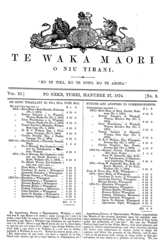 Te Waka Maori o Niu Tirani 1871-1877: Volume 10, Number 2. 13 January 1874 |