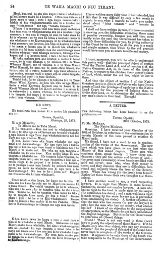 24 TE WAKA MAORI O NIU TIRANI. Heoi, kua nui ke atu aku kupu i taku i whakaaro ai hei korero maku ki a koutou. Otira kua kite au e kore rawa e taea i roto i nga kupu ruarua taku i hiahia ai kia whakamaramatia atu ki a koutou mo nga " tiota tenata " me nga "tenata kamana." E hara i te maumau tuhi noa taku mahi mehemea kua taea e au te whakamarama atu ki a koutou i nga raruraru e tau ana ki runga ki enei tu take ahua ke ki te whenua; no te mea ka kitea e koutou i kona te ata whakaaro o te Kawanatanga ki te whakamarama i aua raruraru mo koutou, kia tika ai koutou i runga i te mana e hoatu ana ki te Kooti kia whakaotia noatia atu ki tana tuhituhi noa iho enei tikanga mo o koutou whenua—enei tikanga raruraru, tikanga wha- kapau nui i a koutou moni i raro i te ture tawhito. Ki taku mahara tera ano koutou e mohio ki tenei —ara, ko te tino tikanga o te tekiona 79 o te Ture Whenua Maori, me te tekiona 4 o te Ture Maori Whai Karaati, he mea, mo te mate etahi Maori, kia tuturu atu ki o ratou tamariki nga wahi whenua a nga matua, ara nga wahi e ngaro atu ki etahi tangata mehemea kei raro i te ture tawhito. Tetahi hoki, ko te tikanga o te tekiona 5 o te Ture Maori Whai Karaati, he mea kia tika ai nga Maori katoa, e whai Karauna Karaati ana te haere ki te Kooti Whenua Maori hei Kooti awhina i a ratou ki te wehewehe i a ratou whenua, ki te whakatuturu i te tangata hei tango i te wahi o te tangata mate i roto i taua whenua. Heoi. HE RETA. Ko tenei reta kua homai ki a matou kia panuitia atu:— Torere, Opotiki, Oketopa, 29, 1873. Ki a te Makarini, Te Minita mo te Taha Maori. E PA TENAKOE. —Kua tae mai to whakaaturanga ki au o te 10 o nga ra o Oketopa mo te mahi whakahe a nga Maori ki nga Ture kua whakatakotoria nei hei Ture mo nga whenua Maori. E hoa, kaore rawa aku kupu whakahe mo nga mahi a te Kawanatanga. Ko nga ture hou i tukua mai nei e koe ko nga ture tenei e hiahiatia nei e te Maori o te motu nei. He teka na nga tangata e whakahe ua ki aua ture. Kua mohio ahau ki aua tangata e whakahe na. He tangata hoko whenua, he tangata tuku reti; ara ko nga rangatira e kiki nei o ratou ringa ki te pupuri i te koura i te hiriwa; no te paunga o aua mea katahi ka mahara kua raru ratou, na reira ka whakahe noa ki nga ture a te Kawanatanga! No hea te he i kitea ai? Engari me whakahe atu ki tona whakaaro. Tenei tetahi o aku kupu, he kupu mo te roia. E tika ana kia kaua he roia mo te Maori ina korero ki a raua Maori. Ko tetahi tangata he ki te whenua, tika ake i te roia; ko te tangata tika, he iho i taua roia. Tetahi he, kei te tangata whai moni ka tika; ko te tangata kore moni, no hea e tika? Kaore ahau i kite i te he o te Kai-whakamaori. Kaore hoki te Maori e tino mohio ki te reo Pakeha. Otira kei te Kawanatanga te tikanga mo nga mea katoa. E hoa kaore rawa he kupu o roto o enei ture e tika ai te whakahe a enei Maori. Mehemea na nga Maori anake taua whakahe, hei aha i whakarangona atu ai—inahoki ko nga tangata o tenei taha o te motu nei kaore ano i tae noa atu ki te whakahe i nga mahi a te Kawanatanga. Ko tena taha anake pea ki runga na e kawe tikanga atu na ki te Runanga o te Kawanatanga. I have written more fully than I had intended, but I felt that it was difficult by only a few words to explain to you what I wanted to make you under- stand about "joint tenants" and "tenants in common." I shall not have written in vain, if I have succeeded in showing you the difficulties attending these cases of peculiar ownership, because you will then more readily value the care the Government has taken to simplify these difficulties for you, by giving authority to the Court by its writing to do for you in a ready and simple manner, that which by the old practice would have cost you so much trouble and money. I trust, moreover, you will be able to understand this pretty well—that the principal object of section 79 of the Native Land Act, and of section 4 of the Native Grantees Act, is, in cases of the death of Natives, to secure to the children their parent's share of land, which, under the old law, might be lost to them. And that the object of section 5 of the Native Grantees Act is to give to all Natives who have Crown grants of land the privilege of applying to the Native Land Court for the purpose of helping them to divide their land, or to determine the succession to any man's share in that land. Enough! A LETTER. THE following letter has been handed to us for publication:— Torere, Opotiki, 29th October, 1873. To Mr. MCLEAN, The Native Minister. Greeting. I have received your Circular of the 10th of October, in reference to the condemnation by certain Maoris of the laws passed in relation to Maori lands. My friend, I have not a word to say in condem- nation of the works of the Government. The new laws which you have given us are just what the Maoris of this island require. Those men who condemn them, speak falsely. 1 know these con- demners; they are the sellers and lessors of land the great men (ironically) whose hands are filled with gold and silver; men who, when their money is spent, and they discover they are in difficulties, turn round and unjustly blame the laws of the Govern- ment. When has wrong (in the laws) been found? Rather let them blame their own thoughts (i.e. them- selves). • I have another word to say, a word respecting lawyers. It is right that Maoris, in cases between themselves, should not employ lawyers. A man who has no right to the land is made right by his lawyer (i.e. establishes his claim); and a man who has a right is made wrong by the same lawyer (i.e. is prevented from establishing bis claim). A further objection is, that the man who has money (to pay the lawyer) is safe; but the man who has no money, what chance has he? I know of no objection to the employment of interpreters, as the Maoris do not fully understand. the English language. But it is for the Government to determine all (these) things. Friend! There is not one word in these (new) laws to justify the objections of th