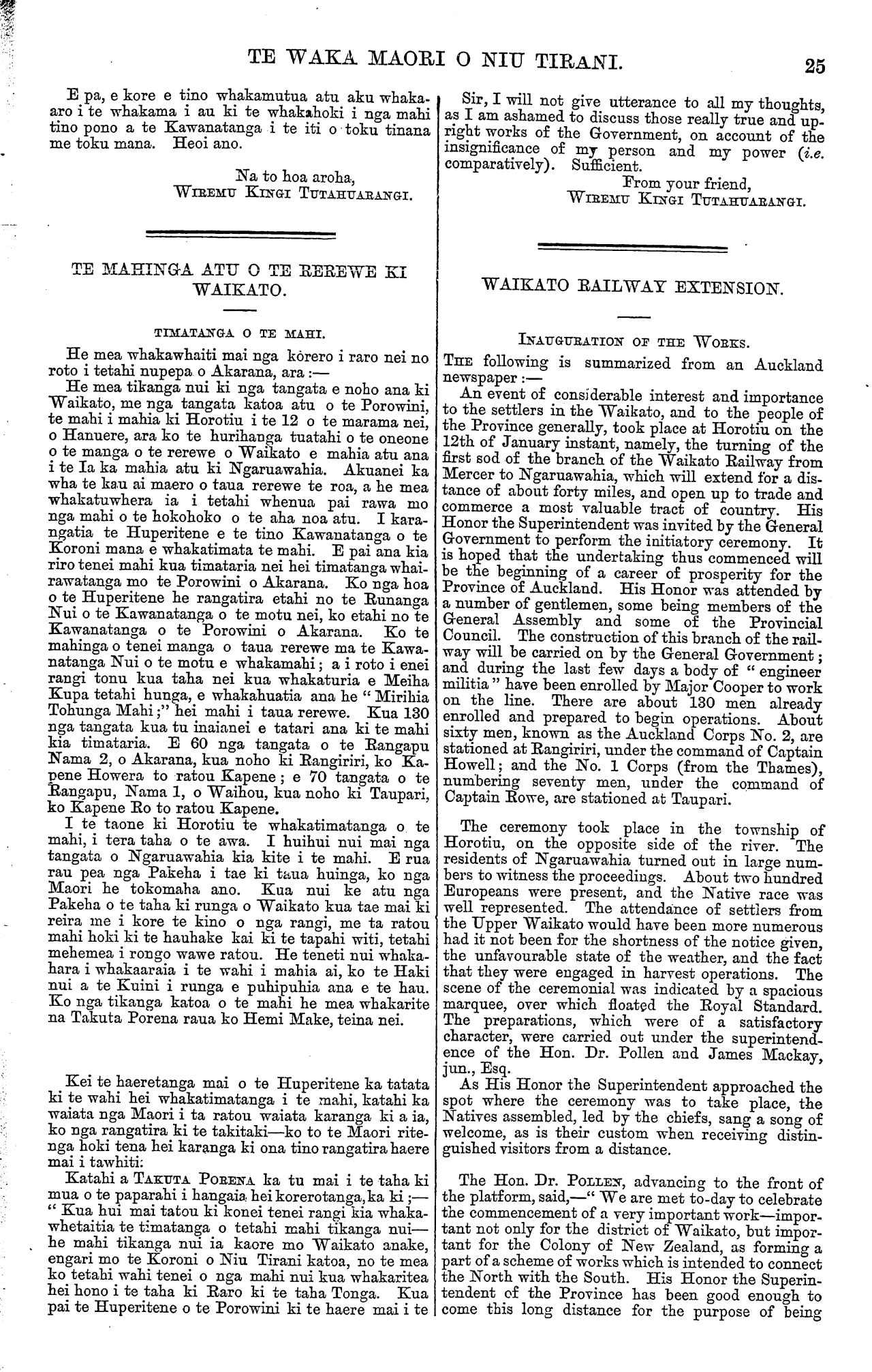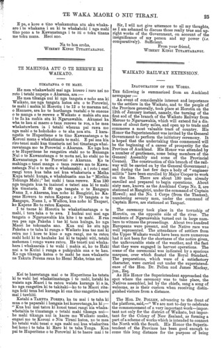 TE WAKA MAORI O NIU TIRANI. 25 E pa, e kore e tino whakamutua atu aku whaka- aro i te whakama i au ki te whakahoki i nga mahi tino pono a te Kawanatanga i te iti o toku tinana me toku mana. Heoi ano. Na to hoa aroha, WIREMU KINGI TUTAHUARANGI. TE MAHINGA ATU O TE REREWE KI WAIKATO. TIMATANGA O TE MAHI. He mea whakawhaiti mai nga korero i raro nei no roto i tetahi nupepa o Akarana, ara:— He mea tikanga nui ki nga tangata e noho ana ki Waikato, me nga tangata katoa atu o te Porowini, te mahi i mahia ki Horotiu i te 12 o te marama nei, o Hanuere, ara ko te hurihanga tuatahi o te oneone o te manga o te rerewe o Waikato e mahia atu ana i te Ia ka mahia atu ki Ngaruawahia. Akuanei ka wha te kau ai maero o taua rerewe te roa, a he mea whakatuwhera ia i tetahi whenua pai rawa mo nga mahi o te hokohoko o te aha noa atu. I kara- ngatia te Huperitene e te tino Kawanatanga o te Koroni mana e whakatimata te mahi. E pai ana kia riro tenei mahi kua timataria nei hei timatanga whak- rawatanga mo te Porowini o Akarana. Ko nga hoa o te Huperitene he rangatira etahi no te Runanga Nui o te Kawanatanga o te motu nei, ko etahi no te Kawanatanga o te Porowini o Akarana. Ko te mahinga o tenei manga o taua rerewe ma te Kawa- natanga Nui o te motu e whakamahi; a i roto i enei rangi tonu kua taha nei kua whakaturia e Meiha Kupa tetahi hunga, e whakahuatia ana he " Mirihia Tohunga Mahi;" hei mahi i taua rerewe. Kua 130 nga tangata kua tu inaianei e tatari ana ki te mahi kia timataria. E 60 nga tangata o te Rangapu Nama 3, o Akarana, kua noho ki Rangiriri, ko Ka- pene Howera to ratou Kapene; e 70 tangata o te Rangapu, Nama 1, o Waihou, kua noho ki Taupari, ko Kapene Ro to ratou Kapene. I te taone ki Horotiu te whakatimatanga o te mahi, i tera taha o te awa. I huihui nui mai nga tangata o Ngaruawahia kia kite i te mahi. E rua rau pea nga Pakeha i tae ki taua huinga, ko nga Maori he tokomaha ano. Kua nui ke atu nga Pakeha o te taha ki runga o Waikato kua tae mai ki reira me i kore te kino o nga rangi, me ta ratou mahi hoki ki te hauhake kai ki te tapahi witi, tetahi mehemea i rongo wawe ratou. He teneti nui whaka- hara i whakaaraia i te wahi i mahia ai, ko te Haki nui a te Kuini i runga e puhipuhia ana e te hau. Ko nga tikanga katoa o te mahi he mea whakarite na Takuta Porena raua ko Hemi Make, teina nei. Kei te haeretanga mai o te Huperitene ka tatata ki te wahi hei whakatimatanga i te mahi, katahi ka waiata nga Maori i ta ratou waiata karanga ki a ia, ko nga rangatira ki te takitaki—ko to te Maori rite- nga hoki tena hei karanga ki ona tino rangatira haere mai i tawhiti; Katahi a TAKUTA PORENA ka tu mai i te taha ki mua o te paparahi i hangaia hei korerotanga, ka ki;— " Kua hui mai tatou ki konei tenei rangi kia whaka- whetaitia te timatanga o tetahi mahi tikanga nui— he mahi tikanga nui ia kaore mo Waikato anake, engari mo te Koroni o Niu Tirani katoa, no te mea ko tetahi wahi tenei o nga mahi nui kua whakaritea hei hono i te taha ki Raro ki te taha Tonga. Kua pai te Huperitene o te Porowini ki te haere mai i te Sir, I will not give utterance to all my thoughts, as I am ashamed to discuss those really true and up- right works of the Government, on account of the insignificance of my person and my power (i.e. comparatively). Sufficient. From your friend, WIREMU KINGI TUTAHUARANGI. WAIKATO RAILWAY EXTENSION. INAUGURATION OF THE WORKS. THE following is summarized from an Auckland newspaper:— An event of considerable interest and importance to the settlers in the Waikato, and to the people of the Province generally, took place at Horotiu on the 12th of January instant, namely, the turning of the first sod of the branch of the Waikato Railway from Mercer to Ngaruawahia, which will extend tor a dis- tance of about forty miles, and open up to trade and commerce a most valuable tract of country. His Honor the Superintendent was invited by the General Government to perform the initiatory ceremony. It is hoped that the undertaking thus commenced will be the beginning of a career of prosperity for the Province of Auckland. His Honor was attended by a number of gentlemen, some being members of the General Assembly and some of the Provincial Council. The construction of this branch of the rail- way will be carried on by the General Government; and during the last few days a body of " engineer militia " have been enrolled by Major Cooper to work on the line. There are about 130 men already enrolled and prepared to begin operations. About sixty men, known as the Auckland Corps No. 2, are stationed at Rangiriri, under the command of Captain Howell; and the No. 1 Corps (from the Thames), numbering seventy men, under the command of Captain Rowe, are stationed at Taupari. The ceremony took place in the township of Horotiu, on the opposite side of the river. The residents of Ngaruawahia turned out in Iarge num- bers to witness the proceedings. About two hundred Europeans were present, and the Native race was well represented. The attendance of settlers from the Upper Waikato would have been more numerous had it not been for the shortness of the notice given, the unfavourable state of the weather, and the fact that they were engaged in harvest operations. The scene of the ceremonial was indicated by a spacious marquee, over which floated the Royal Standard. The preparations, which were of a satisfactory character, were carried out under the superintend- ence of the Hon. Dr. Pollen and James Mackay, jun., Esq. As His Honor the Superintendent approached the spot where the ceremony was to take place, the Natives assembled, led by the chiefs, sang a song of welcome, as is their custom when receiving distin- guished visitors from a distance. The Hon. Dr. POLLEN, advancing to the front of the platform, said,—" We are met to-day to celebrate the commencement of a very important work—impor- tant not only for the district of Waikato, but impor- tant for the Colony of New Zealand, as forming a part of a scheme of works which is int