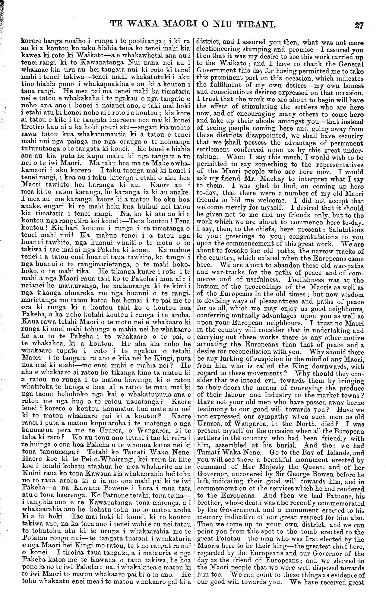 TE WAKA MAORI O NIU TIRANI 27 korero hanga noaiho i runga i te pootitanga; i ki ra au ki a koutou ko taku hiahia tena ko tenei mahi kia kawea ki roto ki Waikato—a e whakawhetai ana au i tenei rangi ki te Kawanatanga Nui nana nei au i whakaae kia uru au hei tangata nui ki roto ki tenei mahi i tenei takiwa—tenei mahi whakatutuki i aku tino hiahia pono i whakapuakina e au ki a koutou i taua rangi. He mea pai ma tenei mahi ka timataria nei e tatou e whakakaha i te ngakau o nga tangata e noho ana ano i konei i naianei ano, e taki mai hoki i etahi atu ki konei noho ai i roto i a koutou; kia kore ai tatou e kite i te tangata haereere noa mai ki konei tirotiro kau ai a ka hoki pouri atu—engari kia mohio rawa tatou kua whakatumautia ki a tatou e tenei mahi nui nga painga me nga oranga o te nohoanga tuturutanga o te tangata ki konei. Ko tenei e hiahia ana au kia puta he kupu maku ki nga tangata e tu nei o te iwi Maori. Ma taku hoa ma te Make e wha- kamaori i aku korero. I taku taenga mai ki konei i tenei rangi, i koa au i taku kitenga i etahi o aku hoa Maori tawhito hei karanga ki au. Kaore au i mea ki to ratou karanga, he karanga ia ki au anake. I mea au me karanga kaore ki a matou ko oku hoa anake, engari ki te mahi hoki kua huihui nei tatou kia timataria i tenei rangi. Na, ka ki atu au ki a koutou nga rangatira kei konei:—Tena koutou! Tena koutou! Kia hari koutou i runga i te timatanga o tenei mahi nui! Ka mahue tenei i a tatou nga huanui tawhito, nga huanui whaiti o te motu o te takiwa i tae mai ai nga Pakeha ki konei. Ka mahue tenei i a tatou enei huanui taua tawhito, ka tango i nga huanui o te rangimarietanga, o te mahi hoko- hoko, o te mahi tika. He tikanga kuare i roto i te mahi a nga Maori raua tahi ko te Pakeha i mua ai; i naianei he matauranga, he matauranga ki te kimi i nga tikanga ahuareka me nga huanui o te rangi- marietanga mo tatou katoa hei homai i te pai me te ora ki runga ki a koutou tahi ko o koutou hoa Pakeha, a ka noho kotahi koutou i runga i te aroha. Kaua rawa tetahi Maori o te motu nei e whakaaro ki runga ki enei mahi tohunga e mahia nei he whakaaro ke atu to te Pakeha i te whakaaro o te pai, o te whakahoa, ki a koutou. He aha kia noho he whakaaro tupato i roto i te ngakau o tetahi Maori—i te tangata ra ano e kiia nei he Kingi, puta noa mai ki etahi—mo enei mahi e mahia nei? He aha e whakaaro ai ratou he tikanga kino ta matou ki a ratou no runga i to matou kawenga ki o ratou whatitoka te hanga e taea ai e ratou te mau mai ki nga taone hokohoko nga kai e whakatupuria ana e ratou me nga hua o to ratou uauatanga? Kaore ienei i korero o koutou kaumatua kua mate atu nei ki to matou whakaaro pai ki a koutou? Kaore ranei i puta a matou kupu aroha i te matenga o nga kaumatua pera me te Ururoa, o Wangaroa, ki te taha ki raro? Ko au tonu ano tetahi i tae ki reira i te huinga o ona hoa Pakeha o te whenua katoa nei ki tona tanumanga? Tetahi ko Tamati Waka Nene. Haere koe ki te Pei-o-Whairangi, kei reira ka kite koe i tetahi kohatu ataahua he mea whakarite na te Kuini raua ko tona Kawana kia whakaarahia hei tohu no to raua aroha ki a ia mo ona mahi pai ki te iwi Pakeha—a na Kawana Powene i hura i mua tata atu o tona haerenga. Ko Patuone tetahi, tena teina— i tangihia ano e. te Kawanatanga tona marenga, a i whakaarahia ano he kohatu tohu no to matou aroha ki a ia hoki. Tae mai hoki ki konei, ki to koutou takiwa ano, na ka taea ano i tenei wahi e tu nei tatou te tohutohu atu ki te urupa i whakaarahia mo te Potatau rongo nui—te tangata tuatahi i whakaturia enga Maori hei Kingi mo ratou, te tino rangatira nui o konei. I tirohia taua tangata, a i matau ria e nga Pakeha katoa me te Kawana o taua takiwa, he hoa pono ia no te iwi Pakeha; na, i whakakitea e matou ki te iwi Maori to matou whakaaro pai ki a ia ano. He tohu whakaatu enei mea i to matou whakaaro pai ki a district, and I assured you then, what was not mere electioneering stumping and promise—I assured you then that it was my desire to see this work carried up to the Waikato; and I have to thank the General Government this day for having permitted me to take this prominent part on this occasion, which indicates the fulfilment of my own desires—my own honest and conscientious desires expressed on that occasion. I trust that the work we are about to begin will have the effect of stimulating the settlers who are here now, and of encouraging many others to come here and take up their abode amongst you—that instead of seeing people coming here and going away from these districts disappointed, we shall i have security that we shall possess the advantage of permanent settlement conferred upon us by this great under- taking. When I say this much, I would wish to be permitted to say something to the representatives of the Maori people who are here now. I would ask my friend Mr. Mackay to interpret what I say to them. I was glad to find, on coming up here to-day, that there were a number of my old Maori friends to bid me welcome. I did not accept that welcome merely for myself. I desired that it should be given not to me and my friends only, but to the work which we are about to commence here to-day. I say, then, to the chiefs, here present: Salutations to you; greetings to you; congratulations to you upon the commencement of this great work. We are about to forsake the old paths, the narrow tracks of the country, which existed when the Europeans came here. We are about to abandon these old war-paths and war-tracks for the paths of peace and of com- merce and of usefulness. Foolishness was at the bottom of the proceedings of the Maoris as well as of the Europeans in the old times; but now wisdom is devising ways of pleasantness and paths of peace for us all, which we may enjoy as good neighbours, conferring mutually advantages upon you as well as upon your European neighbours. I trust no Maori in the country will consider that in undertaking and carrying out these works there is any other motive actuating the Europeans 