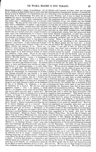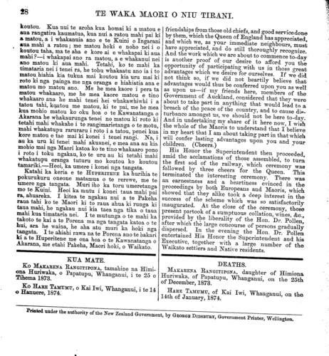 TE WAKA MAORI O NIU TIRANI. koutou. Kua nui te aroha kua homai ki a matou e aua rangatira kaumatua, kua nui a ratou mahi pai ki a matou, a i whakanuia ano e te Kuini o Ingarani aua mahi a ratou; me matou hoki e noho nei i o koutou taha, ma te aha e kore ai e whakapai ki aua mahi?—i whakapai ano ra matou, a e whakanui nei ano matou ki aua mahi. Tetahi, ko te mahi ka timataria nei i tenei ra, he tohu whakaatu ano ia i to matou hiahia kia tukua mai koutou kia uru mai ki roto ki nga painga me nga oranga e hiahiatia ana e matou mo matou ano. Me he mea kaore i pera ta matou whakaaro, me he mea kaore matou e tino whakaaro ana- he mahi tenei hei whakawhiwhi i a tatou tahi, koutou me matou, ki te pai, me he mea kua mohio matou ko oku hoa o te Kawanatanga o Akarana he whakaurunga tenei no matou ki roto ki tetahi mahi whakahe i te rangimarietanga o te motu, mahi whakatupu raruraru i roto i a tatou, penei kua kore matou e tae mai ki konei i tenei rangi. Na, i au ka uru ki tenei mahi akuanei, e mea ana au kia mohio mai nga Maori katoa ko te tino whakaaro pono i roto i toku ngakau, ko te uru au ki tetahi mahi whakatupu oranga tuturu mo koutou ko koutou tamariki.—Heoi, ka umere i konei nga tangata. Katahi ka keria e te HUPERITENE ka hurihia te pokurukuru oneone matamua o te rerewe, me te umere nga tangata. Muri iho ka toru umeretanga mo te Kuini. Heoi ka mutu i konei taua mahi pai ra, ahuareka. I kitea te ngakau nui a te Pakeha raua tahi ko te Maori ki to raua ahua ki runga ki taua mahi, he ngakau nui kia taea nga tika o taua mahi kua timataria nei. I te mutunga o te mahi ka takoto te kai a te Porena ma nga tangata katoa o te hui, ara he waina, he aha atu muri ka hoki nga tangata. I te ahiahi rawa na te Porena ano te hakari ki a te Huperitene me ona hoa o te Kawanatanga o Akarana, me etahi Pakeha, Maori hoki, o Waikato. KUA MATE. Ko MAKARENA RANGITIPONA, tamahine na Himi- ona Huriwaka, o Papatupu, Whanganui, i te 25 o Tihema 1873. Ko HARE TAMUMU, o Kai Iwi, Whanganui, i te 14 o Hanuere, 1874. friendships from those old chiefs, and good service done by them, which the Queen of England has appreciated, and which we, as your immediate neighbours, must have appreciated, and do still thoroughly recognize. And the work which we are about to commence to-day is another proof of our desire to afford you the opportunity of participating with us in those great advantages which we desire for ourselves. If we did not think so, if we did not heartily believe that advantages would thus be conferred upon you as well as upon us—if my friends here, members of the Government of Auckland, considered that they were about to take part in anything that would lead to a breach of the peace of the country, and to cause dis- turbance amongst us, we should not be here to-day. And in undertaking my share of it here now, I wish the whole of the Maoris to understand that I believe in my heart that I am about taking part in that which will confer lasting advantages upon you and your children. (Cheers.) His Honor the Superintendent then proceeded, amid the acclamations of those assembled, to turn the first sod of the railway, which ceremony was followed by three cheers for the Queen. This terminated the interesting ceremony. There was an earnestness and a heartiness evinced in the proceedings by both Europeans and Maoris, which. showed that they alike took a deep interest in the success of the scheme which was so satisfactorily inaugurated. At the close of the ceremony, those present partook of a sumptuous collation, wines, &c., provided by the liberality of the Hon. Dr. Pollen, after which the Iarge concourse of persons gradually dispersed. In the evening the Hon. Dr. Pollen entertained His Honor the Superintendent and his Executive, together with a Iarge number of the Waikato settlers and Native residents. DEATHS. MAKARENA RANGITIPONA, daughter of Himiona Huriwaka, of Papatupu, Whanganui, on the 25th of December, 1873. HARE TAMUMU, of Kai Iwi, Whanganui, on the 14th of January, 1874. Printed under the authority of the New Zealand Government, by GEORGE DIDSBURY, Government Printer, Wellington.