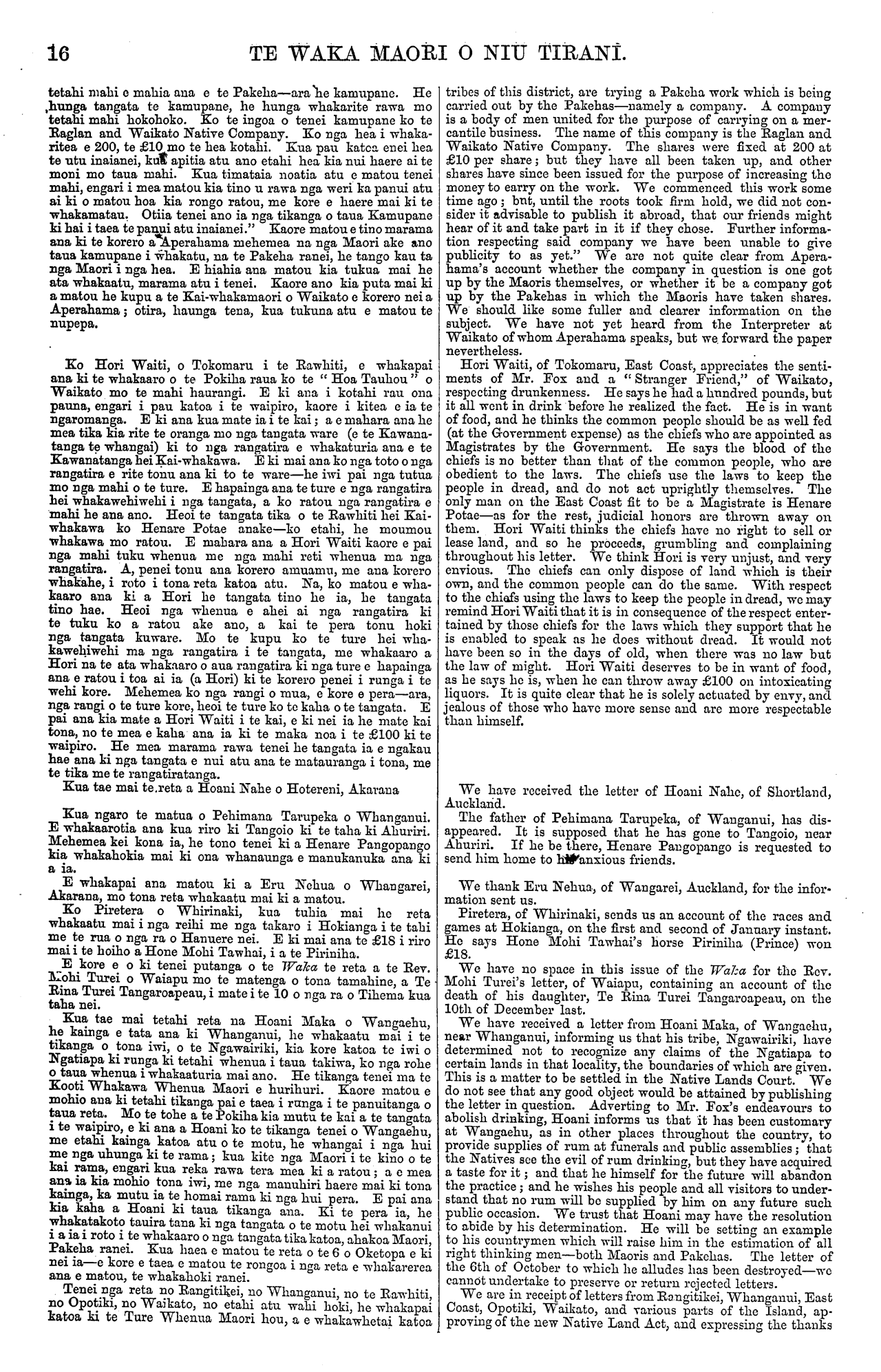 16 TE WAKA MAORI O NIU TIRANI. tetahi mahi o mahia ana e te Pakeha—ara he kamupane. He hunga tangata te kamupane, he hunga whakarite rawa mo tetahi mahi hokohoko. Ko te ingoa o tenei kamupane ko te Raglan and Waikato Native Company. Ko nga hea i whaka- ritea e 200, te £10 mo te hea kotahi. Kua pau katoa, enei hea te utu inaianei, kua apitia atu ano etahi hea kia nui haere ai te moni mo taua mahi. Kua timataia noatia atu e matou tenei mahi, engari i mea matou kia tino u rawa nga weri ka panui atu ai ki o matou hoa kia rongo ratou, me kore e haere mai ki te whakamatau. Otiia tenei ano ia nga tikanga o taua Kamupane ki hai i taea te panui atu inaianei." Kaore matou e tino marama ana ki te korero a Aperahama mehemea na nga Maori ake ano taua kamupane i whakatu, na te Pakeha ranei, he tango kau ta nga Maori i nga hea. E hiahia ana matou kia tukua mai he ata whakaatu, marama atu i tenei. Kaore ano kia puta mai ki a matou he kupu a te Kai-whakamaori o Waikato e korero nei a Aperahama; otira, haunga tena, kua tukuna atu e matou te nupepa. Ko Hori Waiti, o Tokomaru i te Rawhiti, e whakapai ana ki te whakaaro o te Pokiha raua ko te " Hoa Tauhou " o Waikato mo te mahi haurangi. E ki aua i kotahi rau ona pauna, engari i pau katoa i te waipiro, kaore i kitea e ia te ngaromanga. E ki ana kua mate ia i te kai; a e mahara ana he mea tika kia rite te oranga mo nga tangata ware (e te Kawana- tanga te whangai) ki to nga rangatira e whakaturia ana e te Kawanatanga hei Kai-whakawa. E ki mai ana ko nga toto o nga rangatira e rite tonu ana ki to te ware—he iwi pai nga tutua mo nga mahi o te ture. E hapainga ana te ture e nga rangatira hei whakawehiwehi i nga tangata, a ko ratou nga rangatira e mahi he ana ano. Heoi te tangata tika o te Rawhiti hei Kai- whakawa ko Henare Potae anake—ko etahi, he moumou whakawa mo ratou. E mahara ana a Hori Waiti kaore e pai nga mahi tuku whenua me nga mahi reti whenua ma nga rangatira. A, penei tonu ana korero amuamu, me ana korero whakahe, i roto i tona reta katoa atu. Na, ko matou e wha- kaaro ana ki a Hori he tangata tino he ia, he tangata tino hae. Heoi nga whenua e ahei ai nga rangatira ki te tuku ko a ratou ake ano, a kai te pera tonu hoki nga tangata kuware. Mo te kupu ko te ture hei wha- kawehiwehi ma nga rangatira i te tangata, me whakaaro a Hori na te ata whakaaro o aua rangatira ki nga ture e hapainga ana e ratou i toa ai ia (a Hori) ki te korero penei i runga i te wehi kore. Mehemea ko nga rangi o mua, e kore e pera—ara, nga rangi o te ture kore, heoi te ture ko te kaha o te tangata. E pai ana kia mate a Hori Waiti i te kai, e ki nei ia he mate kai tona, no te mea e kaha ana ia ki te maka noa i te £100 ki te waipiro. He mea marama rawa tenei he tangata ia e ngakau hae ana ki nga tangata e nui atu ana te matauranga i tona, me te tika me te rangatiratanga. Kua tae mai te reta a Hoani Nahe o Hotereni, Akarana Kua ngaro te matua o Pehimana Tarupeka o Whanganui. E whakaarotia ana kua riro ki Tangoio ki te taha ki Ahuriri. Mehemea kei kona ia, he tono tenei ki a Henare Pangopango kia whakahokia mai ki ona whanaunga e manukanuka ana ki a ia. E whakapai ana matou ki a Eru Nehua o Whangarei, Akarana, mo tona reta whakaatu mai ki a matou. Ko Piretera o Whirinaki, kua tuhia mai ho reta whakaatu mai i nga reihi me nga takaro i Hokianga i te tahi me te rua o nga ra o Hanuere nei. E ki mai ana te £18 i riro mai i te hoiho a Hone Mohi Tawhai, i a te Piriniha. E kore e o ki tenei putanga o te Waka te reta a te Rev. Mohi Turei o Waiapu mo te matenga o tona tamahine, a Te Rina Turei Tangaroapeau, i mate i te 10 o nga ra o Tihema kua taha nei. Kua tae mai tetahi reta na Hoani Maka o Wangaehu, he kainga e tata ana ki Whanganui, he whakaatu mai i te tikanga o tona iwi, o te Ngawairiki, kia kore katoa te iwi o Ngatiapa ki runga ki tetahi whenua i taua takiwa, ko nga rohe o taua whenua i whakaaturia mai ano. He tikanga tenei ma te Kooti Whakawa Whenua Maori e hurihuri. Kaore matou e mohio aua ki tetahi tikanga pai e taea i ranga i te panuitanga o taua reto; Mo te tohe a te Pokiha kia mutu te kai a te tangata i te waipiro, e ki ana a Hoani ko te tikanga tenei o Wangaehu, me etahi kainga katoa atu o te motu, he whangai i nga hui me nga uhunga ki te rama; kua kite nga Maori i te kino o te kai rama, engari kua reka rawa tera mea ki a ratou; a e mea ana ia kia mohio tona iwi, me nga manuhiri haere mai ki tona kainga, ka mutu ia te homai rama ki nga hui pera. E pai ana kia kaha a Hoani ki taua tikanga ana. Ki te pera ia, he whakatakoto tauira tana ki nga tangata o te motu hei whakanui i a ia i roto i te whakaaro o nga tangata tika katoa, ahakoa Maori, Pakeha ranei. Kua haea e matou te reta o te 6 o Oketopa e ki nei ia—e kore e taea e matou te rongoa i nga roto e whakarerea ana e matou, te whakahoki ranei. Tenei nga reta no Rangitikei, no Whanganui, no te Rawhiti, no Opotiki, no Waikato, no etahi atu wahi hoki, he whakapai katoa ki te Ture Whenua Maori hou, a e whakawhetai katoa tribes of this district, are trying a Pakeha work which is being carried out by the Pakehas—namely a company. A company is a body of men united for the purpose of carrying on a mer- cantile business. The name of this company is the Raglan and Waikato Native Company. The shares were fixed at 200 at £10 per share; but they have all been taken up, and other shares have since been issued for the purpose of increasing the money to carry on the work. We commenced this work some time ago but, until the roots took firm, hold, we did not con- sider it advisable to publish it abroad, that our friends might hear of it and take part in it if they chose. Further informa- tion respecting said company we have been unable to give publicity to as yet." We are not quite clear from Apera- hama's account whether the company in question is one got up by the Maoris themselves, or whether it be a company got up by the Pakehas in which the Maoris have taken shares. We should like some fuller and clearer information on the subjec