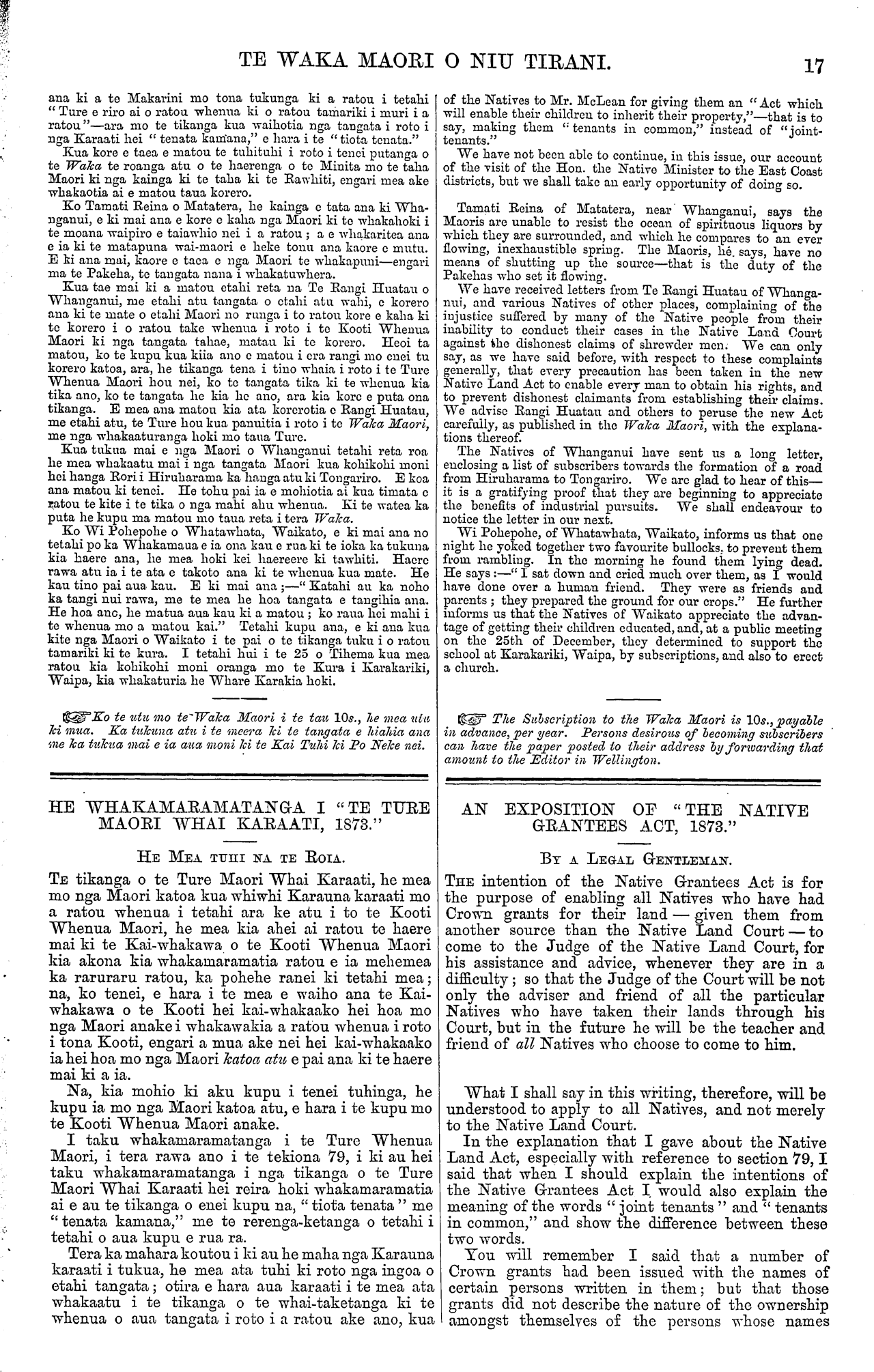 TE WAKA MAORI O NIU TIRANI. "KO TE TIKA, KO TE PONO, KO TE AROHA." VOL. 10.] PO NEKE, TUREI, HANUERE 27, 1874. No. 2. HE KUPU WHAKAATU KI NGA HOA TUHI MAI. He moni kua tae mai:— £ s. d. 1874.—Rewi Hare o Motu Karaka, Hokianga (No, 1, 1874.) ... ... ... O 10 O Rutene Taingaru o to Whakaki, Wairoa, Haake Pei (No. 1, 1874) O 10 O Teira Waiotinirau o te Whakaki, Wairoa, Haake Pei (No. 1, 1874) O 10 O Tamati Tautuhi o Mataahu, Waiapu, East Cape (No. 1, 1874) .... O 10 O H. R. C. Wallace, Esq., o Wha- ngara, Turanga, (No. 1, 1874.) O 10 O Charles Priestly, Esq., o Puatai, Turanga (No. 1, 1874) ... O 10 O 1853-74-.—Manahi Paewai, o Tahoraiti, Tamaki, Nepia ... ... ... ... 1 O O Na te Herangi, Kai-whakawa i tuku mai mo Tuhakaraina o Tama- here, Waikato ... ... ... O 10 O 1874.—Na te Herangi, Kai-whakawa i tuku mai mo Erueti Hororiri o to Kuiti, Waikato (No. 1, 1874) ... O 10 O Na Rihari Wuunu Kai-whakawa i tuku mai enei i raro:— Hone Maka o Whanganui ... ... O 10 O Tamihana Te Aewa, o Whanganui O 10 O Aperaniko Taiawhio, o Whanganui O 10 O Hohepa Parame, o Whanganui ... O 10 O 1373-74.—Menehira, o Whanganui ... ... 010 O Ngawhakatarau, o Whanganui ... O 10 O Kawana Ropiha, o Whanganui ... 010 O Kawana Hunia, o Whanganui ... O 10 O Ihakara Tukumaru, o Manawatu ... O 10 O Toma Taiwhati, o Whanganui ... 010 O Apera Te Keunga, o Whanganui ... 010 O Aperahama Tipae, o Whanganui ... O 10 O £11 O O Ko Aperahama Patene o Ngaruawahia, Waikato, e mihi mai ana ki nga Maori o te motu e noho nei nga iwi i roto i te aroha, i raro hoki i te maru o te " ture kotahi." E ki mai ana kua korerotia e nga Maori o Waikato nga whakaatu me nga korero i roto i te Waka Maori a nga Maori katoa atu mo to ratou kaha, to nga iwi ata o te motu, ki te hapai i nga ritenga Pakeha, ki te whai hoki i nga mahi a te Pakeha—a o nui ana te whaka- moemiti a Waikato ki ana iwi. Katahi ka korero penei, ara:— " Kia kaha tatou ki aua mahi, me kore e tupono ki te tika. Tenei hoki matou, nga iwi o tenei takiwa, te whakamatau nei i NOTICES AND ANSWERS TO CORRESPONDENTS. Subscriptions received:— £ a. d. 1874.—Rewi Hare, of Motu Karaka, Hoki- anga (No. 1, 1874) ... ... 010 0 Rutene Taingaru of Whakaki, Wairoa, Hawke's Bay (No. 1, 1874) ... ... ... ... O 10 O Teira Waiotinirau , of Whakaki, Wairoa, Hawke's Bay (No. 1, 1874) ... ... ... ... O 10 O Tamati Tautuhi of Mataahu, Waiapu, East Cape (No. 1, 1874) ... ... ... ... O 10 O II. R. C. Wallace, Esq., Whangara, Poverty Bay (No. 1, 1874) ... 010 O Charles Priestley, Esq., Puatai, Poverty Bay (No. 1, 1874) ... o 10 O 1873-74.—Manahi Paewai, Tahoraiti, 70 Mile Bush, Napier ... ... 1 O O From W. Searancke, Esq., R.M., for Tuhakaraina, of Tamahere, near Cambridge, Waikato ... O IO O 1874—From W. Searancke, Esq., R.M., for Erueti Hororiri, of Te Kuiti, Waikato (No. 1, 1874) ... O 10 O From. R. Woon, Esq., R.M., Whanganui:— 1874—Hone Maka,, of Whanganui ... 010 O Tamehana Te Aewa, of Whanganui O 10 O Aperaniko Taiawhio, Whanganui ... O 10 O Hohepa Parame, Whanganui ... O 10 O 1873-74.—Menehira, Whanganui ... ... 010 O Ngawakatarau, Whanganui ... O 10 O Kawana Ropiha, Whanganui ... O 10 O Kawana Hunia, Whanganui ... O 10 O Ihakara Tukumaru, Manawatu 0 10 O Toma Taiwhati, Whanganui ... O 10 O Apera Te Keunga, Whanganui O 10 O Aperahama Tipae, Whanganui O 10 O £11 O O Aperahama Patene, of Ngaruawahia, Waikato, congratulates the Maoris of the country generally upon the amicable rela- tions subsisting between the tribes, and the fact of their being under the protection of " one law." He says the Waikato Natives have read in the Waka Maori, with great pleasure and approval, Native communications and other accounts, showing the desire and endeavours of various tribes to adopt the customs and follow the pursuits of the Pakeha; and be says, " Let us all pcrsevere with energy in these works, so that per- adventure we may attain to a position of well-being. We, the