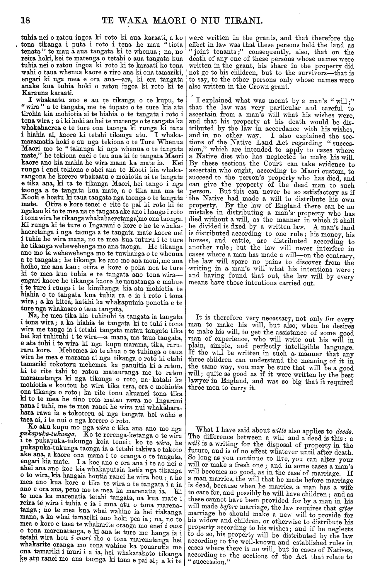 18 TE WAKA MAORI O NIU TIRANI. tuhia nei o ratou ingoa ki roto ki aua karaati, a ko tona tikanga i puta i roto i tena he mau "tiota tenata " te mau a aua tangata ki te whenua; na, no | reira hoki, kei te matenga o tetahi o aua tangata kua tuhia nei o ratou ingoa ki roto ki te karaati ko tona wahi o taua whenua kaore e riro ana ki ona tamariki, engari ki nga mea e ora ana—ara, ki era tangata anake kua tuhia hoki o ratou ingoa ki roto ki te Karauna karaati. I whakaatu ano e au te tikanga o te kupu, te "wira" a te tangata, me te tupato o te ture kia ata tirohia kia mohiotia ai te hiahia o te tangata i roto i tona wira; a i ki hoki au hei te matenga o te tangata ka whakahaerea e te ture ona taonga ki runga ki tana i hiahia ai, kaore ki tetahi tikanga atu. I whaka- maramatia hoki e au nga tekiona o te Ture Whenua Maori mo te "takanga ki nga whenua o te tangata mate," he tekiona enei e tau ana ki te tangata Maori kaore ano kia mahia he wira mana ka mate ia. Kei runga i enei tekiona e ahei ana te Kooti kia whaka- rangona he korero whakaatu e mohiotia ai te tangata e tika ana, ki ta te tikanga Maori, hei tango i nga taonga a te tangata kua mate, a e tika ana ma te Kooti e hoatu ki taua tangata nga taonga o te tangata mate. Otira e kore tenei e rite te pai ki roto ki te ngakau ki to te mea na te tangata ake ano i hanga i roto i tona wira he tikanga whakahaeretanga mo ona taonga. Ki runga ki te ture o Ingarani e kore e he te whaka- haeretanga i nga taonga a te tangata mate kaore nei i tuhia he wira mana, no te mea kua tuturu i te ture he tikanga wehewehenga mo ana taonga. He tikanga ano mo te wehewehenga mo te tuwhanga o te whenua a te tangata; he tikanga ke ano mo ana moni, me ana hoiho, me ana kau; otira e kore e poka noa te ture ki te mea kua tuhia e te tangata ano tona wira— engari kaore he tikanga kaore he uauatanga e mahue i te ture i runga i te kimihanga kia ata mohiotia te hiahia o te tangata kua tuhia ra e ia i roto i tona wira; a ka kitea, katahi ka whakaputaia ponotia e te ture nga whakaaro o taua tangata. Na, he mea tika kia tuhituhi ia tangata ia tangata i tona wira; a ka hiahia te tangata ki te tuhi i tona wira me tango ia i tetahi tangata matau tangata tika hei kai tuhituhi i te wira—a mana, ma taua tangata, e ata tuhi i te wira ki nga kupu marama, tika, raru- raru kore. Mehemea ko te ahua o te tuhinga o taua wira he mea e marama ai nga tikanga o roto ki etahi tamariki tokotoru mehemea ka panuitia ki a ratou, ki te rite tahi to ratou matauranga me to ratou maramatanga ki nga tikanga o roto, na katahi ka mohiotia e koutou he wira tika tera, era e mohiotia ona tikanga o roto; ka rite tonu akuanei tona tika ki to te mea he tino roia matau rawa no Ingarani nana i tuhi, me te mea ranei he wira nui whakahara- hara rawa ia e tokotoru ai nga tangata hei waha e taea ai, i te nui o nga korero o roto. Ko aku kupu mo nga wira e tika ana ano mo nga pukapuka-tukunga. Ko te rerenga-ketanga o te wira i te pukapuka-tukunga koia tenei; ko te wira, he pukapuka-tukunga taonga ia a tetahi takiwa e takoto ake ana, a kaore ona maua i te oranga o te tangata, engari kia mate. I a koe ano e ora ana i te ao nei e ahei ana ano koe kia whakaputaia ketia nga tikanga o to wira, kia hangaia houtia ranei he wira hou; a he mea ano kua kore e tika te wira a te tangata i a ia ano e ora ana, pena me te mea ka marenatia ia. Ki te mea ka marenatia tetahi tangata, na kua mate i reira te wira i tuhia e ia i mua atu o tona marena- tanga; no te mea kua whai wahine ia hei tiakanga mana, a ka whai tamariki ano hoki pea ia; na, no te mea e kore e taea te whakarite oranga mo enei i mua o tona marenatanga, e ki ana te ture me hanga ia i tetahi wira hou i muri iho o tona marenatanga hei whakarite oranga mo tona wahine ka pouarutia me ona tamariki i muri i a ia, hei whakatakoto tikanga ke atu ranei mo ana taonga ki tana e pai ai; a ki te were written in the grants, and that therefore the effect in law was that these persons held the land as " joint tenants;" consequently, also, that on the death of any one of these persons whose names were written in the grant, his share in the property did not go to his children, but to the survivors—that is to say, to the other persons only whose names were also written in the Grown grant. I explained what was meant by a man's " will;" that the law was very particular and careful to ascertain from a man's will what his wishes were, and that his property at his death would be dis- tributed by the law in accordance with his wishes, and in no other way. I also explained the sec- tions of the Native Land Act regarding "succes- sion," which are intended to apply to cases where a Native dies who has neglected to make his will. By these sections the Court can take evidence to ascertain who ought, according to Maori custom, to succeed to the person's property who has died, and can give the property of the dead man to such person. But this can never be so satisfactory as if the Native had made a will to distribute his own property. By the law of England there can be no mistake in distributing a man's property who has died without a will, as the manner in which it shall be divided is fixed by a written law. A man's land is distributed according to one rule; his money, his horses, and cattle, are distributed according to another rule; but the law will never interfere in cases where a man has made a will—on the contrary, the law will spare no pains to discover from the writing in a man's will what his intentions were; and having found that out, the law will by every means have those intentions carried out. It is therefore very necessary, not only for every man to make his will, but also, when he desires to make his will, to get the assistance of some good man of experience, who will write out his will in plain, simple, and perfectly intelligible language. If the will be written in such a- manner that any three children can understand the meaning of it in the same way, you may be sure that will be a