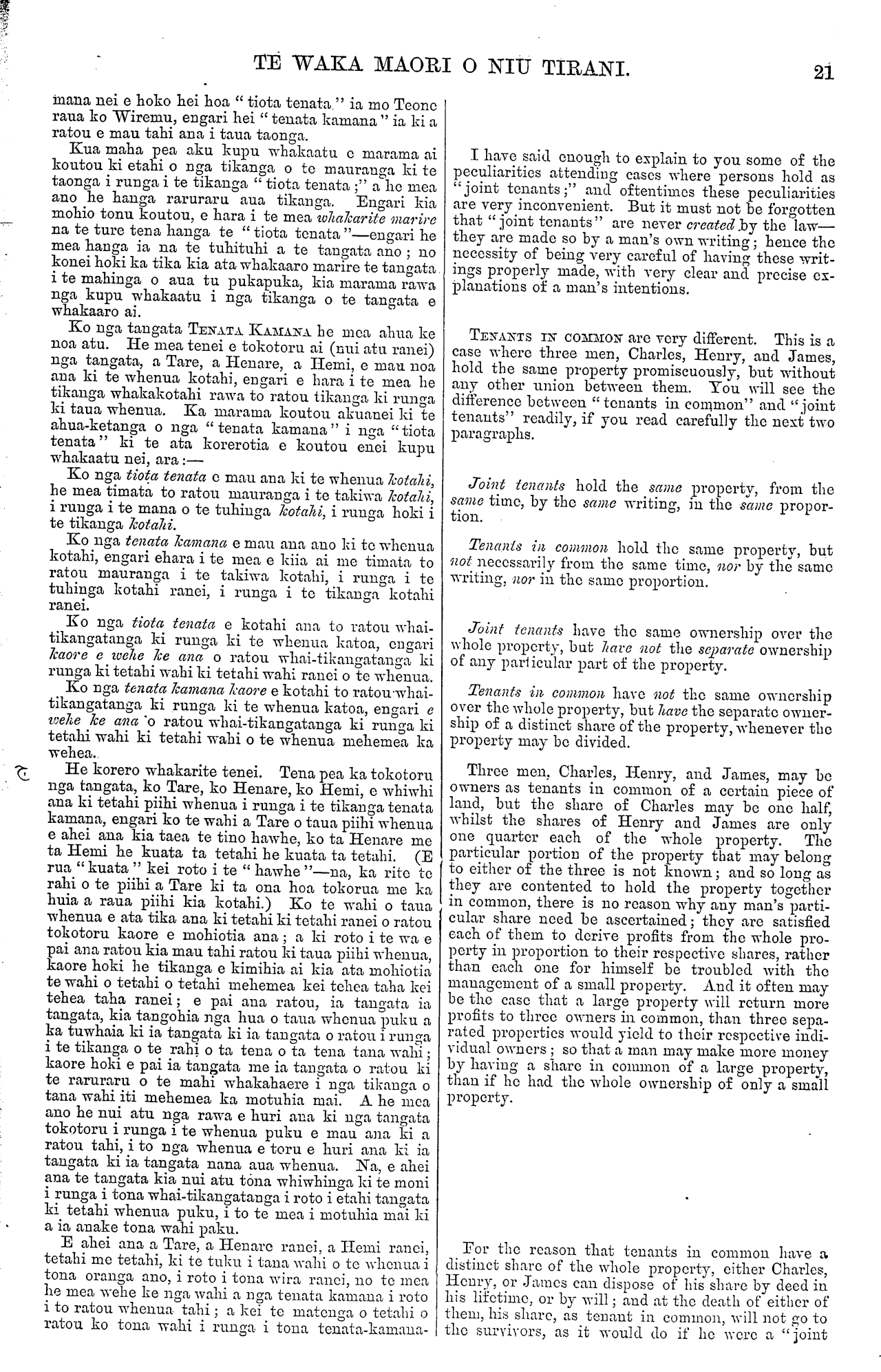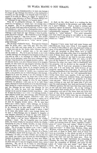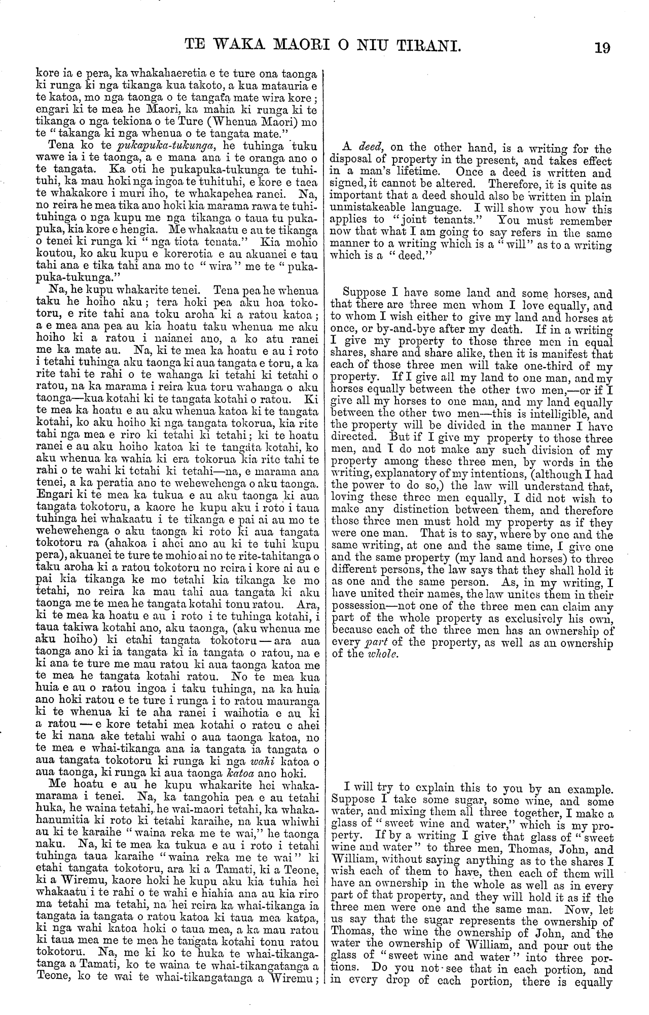 TE WAKA MAORI O NIU TIRANI. 19 kore ia e pera, ka whakahaeretia e te ture ona taonga ki runga ki nga tikanga kua takoto, a kua matauria e te katoa, mo nga taonga o te tangata mate wira kore; engari ki te mea he Maori, ka mahia ki runga ki te tikanga o nga tekiona o te Ture (Whenua Maori) mo te " takanga ki nga whenua o te tangata mate." Tena ko te pupkapuka-tukunga, he tuhinga tuku wawe ia i te taonga, a e mana aua i te oranga ano o te tangata. Ka oti he pukapuka-tukunga te tuhi- tuhi, ka mau hokinga ingoa te tuhituhi, e kore e taea te whakakore i muri iho, te whakapehea ranei. Na, no reira he mea tika ano hoki kia marama rawa te tuhi- tuhinga o nga kupu me nga tikanga o taua tu puka- puka, kia kore e hengia. Me whakaatu e au te tikanga o tenei ki runga ki " nga tiota tenata." Kia mohio koutou, ko aku kupu e korerotia e au akuanei e tau tahi ana e tika tahi ana mo te " wira " me te " puka- puka-tukunga." Na, he kupu whakarite tenei. Tena pea he whenua taku he hoiho aku; tera hoki pea aku hoa toko- toru, e rite tahi ana toku aroha ki a ratou katoa; a e mea ana pea au kia hoatu taku whenua me aku hoiho ki a ratou i naianei ano, a ko atu ranei me ka mate au. Na, ki te mea ka hoatu e au i roto i tetahi tuhinga aku taonga ki aua tangata e toru, a ka rite tahi te rahi o te wahanga ki tetahi ki tetahi o ratou, na ka marama i reira kua toru wahanga o aku taonga—kua kotahi ki te tangata kotahi o ratou. Ki te mea ka hoatu e au aku whenua katoa ki te tangata kotahi, ko aku hoiho ki nga tangata tokorua, kia rite tahi nga mea e riro ki tetahi ki totahi; ki te hoatu ranei e au aku hoiho katoa ki te tangata kotahi, ko aku whenua ka wahia ki era tokorua kia rito tahi te rahi o te wahi ki tetahi ki tetahi—na, e marama ana tenei, a ka peratia ano te wehewehenga o aku taonga. Engari ki te mea ka tukua e au aku taonga ki aua tangata tokotoru, a kaore he kupu aku i roto i taua tuhinga hei whakaatu i te tikanga e pai ai au mo te wehewehenga o aku taonga ki roto ki aua tangata tokotoru ra (ahakoa i ahei ano au ki te tuhi kupu pera), akuanei te ture te mohio ai no te rite-tahitanga o taku aroha ki a ratou tokotoru no reira i kore ai au e pai kia tikanga ke mo tetahi kia tikanga ke mo tetahi, no reira ka mau tahi aua tangata ki aku taonga me te mea he tangata kotahi tonu ratou. Ara, ki te mea ka hoatu e au i roto i te tuhinga kotahi, i taua takiwa kotahi ano, aku taonga, (aku whenua me aku hoiho) ki etahi tangata tokotoru—ara aua taonga ano ki ia tangata ki ia tangata o ratou, na e ki ana te ture me mau ratou ki aua taonga katoa me te mea he tangata kotahi ratou. No te mea kua huia e au o ratou ingoa i taku tuhinga, na ka huia ano hoki ratou e te ture i runga i to ratou maurauga ki te whenua ki te aha ranei i waihotia e au ki a ratou — e kore tetahi mea kotahi o ratou e ahei te ki nana ake tetahi wahi o aua taonga katoa, no te mea e whai-tikanga ana ia tangata ia tangata o aua tangata tokotoru ki runga ki nga wahi katoa o aua taonga, ki runga ki aua taonga katoa ano hoki. Me hoatu e au he kupu whakarite hei whaka- marama i tenei. Na, ka tangohia pea e au tetahi huka, he waina tetahi, he wai-maori tetahi, ka whaka- hanumitia ki roto ki tetahi karaihe, ua kua whiwhi au ki te karaihe " waina reka me te wai," he taonga naku. Na, ki te mea ka tukua e au i roto i tetahi tuhinga taua karaihe "waina reka me te wai" ki etahi tangata tokotoru, ara ki a Tamati, ki a Teone, ki a Wiremu, kaore hold he kupu aku kia tuhia hei whakaatu i te rahi o te wahi e hiahia ana au kia riro ma tetahi ma tetahi, na hei reira ka whai-tikanga ia tangata ia tangata o ratou katoa ki taua mea katoa, ki nga wahi katoa hoki o taua mea, a ka mau ratou ki taua mea me te mea he tangata kotahi tonu ratou tokotoru. Na, me ki ko te huka te whai-tikanga- tanga a Tamati, ko te waina te whai-tikangatanga a Teone, ko te wai te whai-tikangatanga a Wiremu; A deed, on the other hand, is a writing for the disposal of property in the present, and takes effect in a man's lifetime. Once a deed is written and signed, it cannot be altered. Therefore, it is quite as important that a deed should also be written in plain unmistakeable language. I will show you how this applies to "joint tenants." You must remember now that what I am going to say refers in the same manner to a writing which is a " will" as to a writing which is a " deed." Suppose I have some land and some. horses, and that there are three men whom I love equally, and to whom I wish either to give my land and horses at once, or by-and-bye after my death. If in a writing I give my property to those three men in equal shares, share and share alike, then it is manifest that each of those three men will take one-third of my property. If I give ail my land to one man, and my horses equally between the other two men,—or if I give all my horses to one man, and my land equally between the other two men—this is intelligible, and the property will be divided in the manner I have directed. But if I give my property to those three men, and I do not make any such division of my property among these three men, by words in the writing, explanatory of my intentions, (although I had the power to do so,) the law will understand that, loving these three men equally, I did not wish to make any distinction between them, and therefore those three men must hold my property as if they were one man. That is to say, where by one and the same writing, at one and the same time, I give one and the same property (my land and horses) to three different persons, the law says that they shall hold it as one and the same person. As, in my writing, I have united their names, the law unites them in their possession—not one of the three men can claim any part of the whole property as exclusively his own, because each of the three men has an ownership of every part of the property, as well as an ownership of the whole. I will try to explain this to you by an example. Suppose I take some sugar, some wine, and some water, and mix