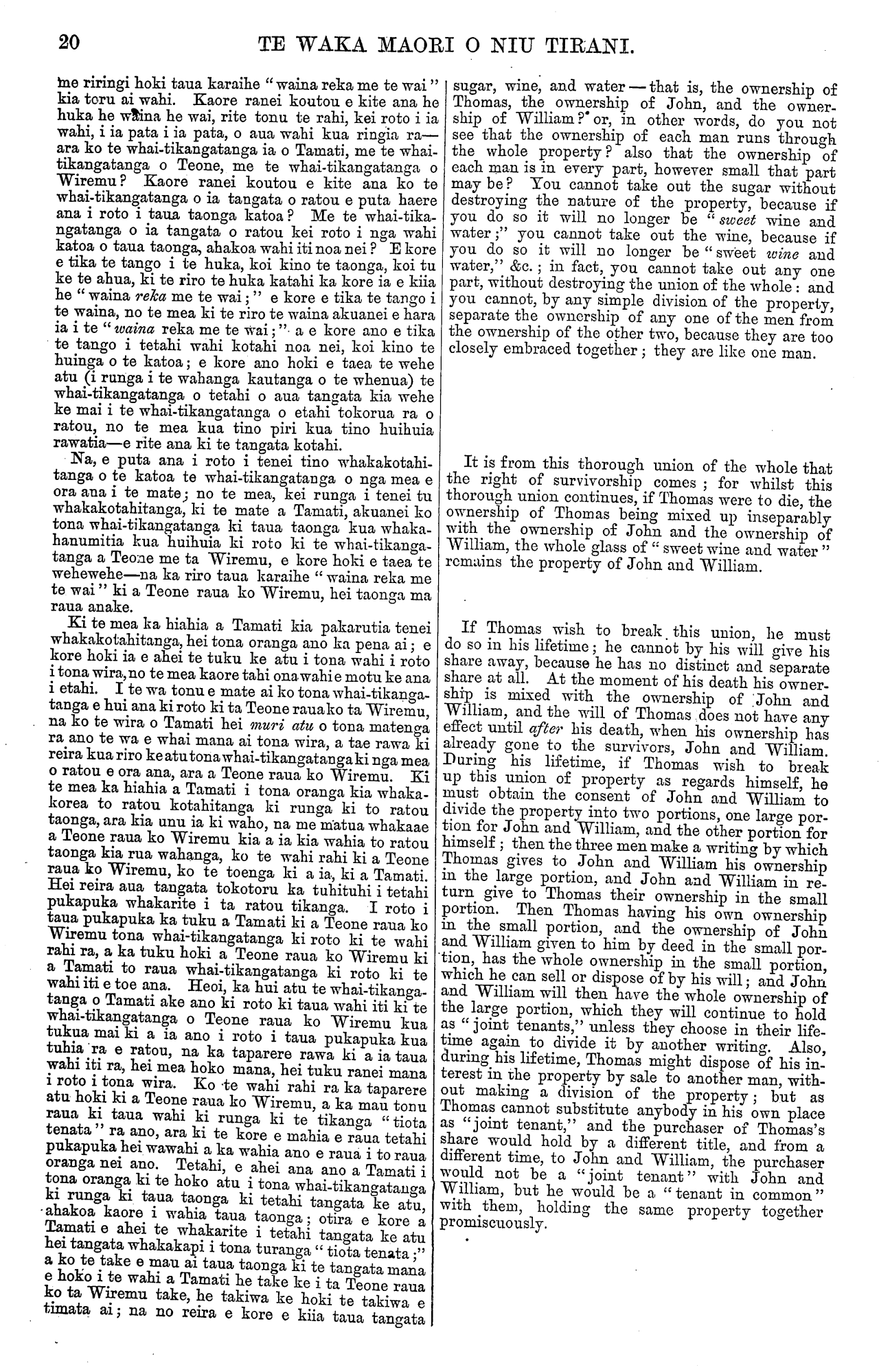 20 TE WAKA MAORI O NIU TIRANI. me riringi hoki taua karaihe " waina reka me te wai kia toru ai wahi. Kaore ranei koutou e kite ana he huka he waina he wai, rite tonu te rahi, kei roto i ia wahi, i ia pata i ia pata, o aua wahi kua ringia ra ara ko te whai-tikangatanga ia o Tamati, me te whai- | tikangatanga o Teone, me te whai-tikangatanga o I Wiremu? Kaore ranei koutou e kite ana ko te whai-tikangatanga o ia tangata o ratou e puta haere ana i roto i taua taonga katoa? Me te whai-tika- ngatanga o ia tangata o ratou kei roto i nga wahi katoa o taua taonga, ahakoa wahi iti noa nei? E kore e tika te tango i te huka, koi kino te taonga, koi tu ke te ahua, ki te riro te huka katahi ka kore ia e kiia he " waina reka me te wai;" e kore e tika te tango i te waina, no te mea ki te riro te waina akuanei e hara ia i te " waina reka me te wai; " a e kore ano e tika te tango i tetahi wahi kotahi noa nei, koi kino te I huinga o te katoa; e kore ano hoki e taea te wehe atu (i runga i te wahanga kautanga o te whenua) te whai-tikangatanga o tetahi o aua tangata kia wehe ke mai i te whai-tikangatanga o etahi tokorua ra o ratou, no te mea kua tino piri kua tino huihuia rawatia e rite ana ki te tangata kotahi. Na, e puta ana i roto i tenei tino whakakotahi- tanga o te katoa te whai-tikangatanga o nga mea e ora ana i te mate; no te mea, kei runga i tenei tu whakakotahitanga, ki te mate a Tamati, akuanei ko tona whai-tikangatanga ki taua taonga kua whaka- hanumitia kua huihuia ki roto ki te whai-tikanga- tanga a Teone me ta Wiremu, e kore hoki e taea te wehewehe—na ka riro taua karaihe " waina reka me te wai" ki a Teone raua ko Wiremu, hei taonga ma raua anake. Ki te mea ka hiahia a Tamati kia pakarutia tenei whakakotahitanga, hei tona oranga ano ka pena ai; e kore hoki ia e ahei te tuku ke atu i tona wahi i roto i tona wira, no te mea kaore tahi ona wahi e motu ke ana i etahi. I te wa tonu e mate ai ko tona whai-tikanga- tanga e hui ana ki roto ki ta Teone raua ko ta Wiremu, na ko te wira o Tamati hei muri atu o tona matenga ra ano te wa e whai mana ai tona wira, a tae rawa ki reira kua riro ke atu tona whai-tikangatanga ki nga mea o ratou e ora ana, ara a Teone raua ko Wiremu. Ki te mea ka hiahia a Tamati i tona oranga kia whaka- korea to ratou kotahitanga ki runga ki to ratou taonga, ara kia unu ia ki waho, na me matua whakaae a Teone raua ko Wiremu kia a ia kia wahia to ratou taonga kia rua wahanga, ko te wahi rahi ki a Teone raua ko Wiremu, ko te toenga ki a ia, ki a Tamati. Hei reira aua tangata tokotoru ka tuhituhi i tetahi pukapuka whakarite i ta ratou tikanga. I roto i taua pukapuka ka tuku a Tamati ki a Teone raua ko Wiremu tona whai-tikangatanga ki roto ki te wahi rahi ra, a ka tuku hoki a Teone raua ko Wiremu ki a Tamati to raua whai-tikangatanga ki roto ki te wahi iti e toe ana. Heoi, ka hui atu te whai-tikanga- tanga o Tamati ake ano ki roto ki taua wahi iti ki te whai-tikangatanga o Teone raua ko Wiremu kua tukua mai ki a ia ano i roto i taua pukapuka kua tuhia ra e ratou, na ka taparere rawa ki a ia taua wahi iti ra, hei mea hoko mana, hei tuku ranei mana i roto i tona wira. Ko te wahi rahi ra ka taparere atu hoki ki a Teone raua ko Wiremu, a ka mau tonu raua ki taua wahi ki runga ki te tikanga "tiota tenata " ra ano, ara ki te kore e mahia e raua tetahi pukapuka hei wawahi a ka wahia ano e raua i to raua oranga nei ano. Tetahi, e ahei ana ano a Tamati i tona oranga ki te hoko atu i tona whai-tikangatanga ki runga ki taua taonga ki tetahi tangata ke atu, ahakoa kaore i wahia taua taonga; otira e kore a Tamati e ahei te whakarite i tetahi tangata ke atu hei tangata whakakapi i tona turanga " tiota tenata;" a ko te take e mau ai taua taonga ki te tangata mana e hoko i te wahi a Tamati he take ke i ta Teone raua ko ta Wiremu take, he takiwa ke hoki te takiwa e timata ai; na no reira e kore e kiia taua tangata sugar, wine, and water—that is, the ownership of Thomas, the ownership of John, and the owner- ship of William? or, in other words, do you not see that the ownership of each man runs through the whole property? also that the ownership of each man is in every part, however small that part may be? You cannot take out the sugar without destroying the nature of the property, because if you do so it will no longer be " sweet wine and water;" you cannot take out the wine, because if you do so it will no Ionger be " sweet wine and water," &c.; in fact, you cannot take out any one part, without destroying the union of the whole: and you cannot, by any simple division of the property, separate the ownership of any one of the men from the ownership of the other two, because they are too closely embraced together; they are like one man. It is from this thorough union of the whole that the right of survivorship comes; for whilst this thorough union continues, if Thomas were to die, the ownership of Thomas being mixed up inseparably with the ownership of John and the ownership of William, the whole glass of " sweet wine and water " remains the property of John and William. If Thomas wish to break this union, he must do so in his lifetime; he cannot by his will give his share away, because he has no distinct and separate share at all. At the moment of his death his owner- ship is mixed with the ownership of John and William, and the will of Thomas does not have any effect until after his death, when his ownership has already gone to the survivors, John and William. During his lifetime, if Thomas wish to break up this union of property as regards himself, he must obtain the consent of John and William to divide the property into two portions, one Iarge por- tion for John and William, and the other portion for himself; then the three men make a writing by which Thomas gives to John and William his ownership in the Iarge portion, and John and William in re- turn give to Thomas their ownership in the small portion. Then Thomas having his own ownership in the small portion, and the ownership of John and Wi