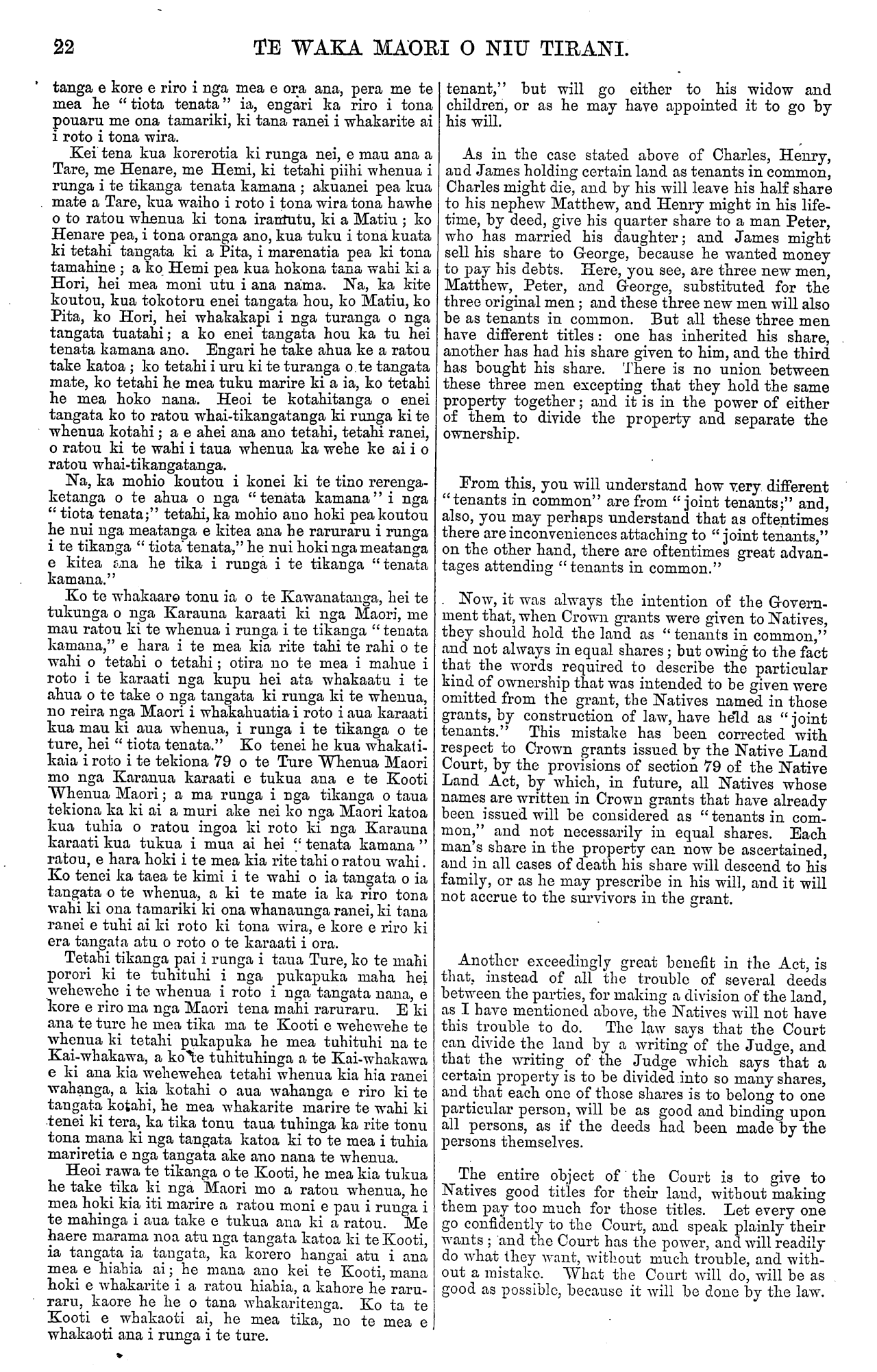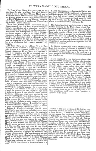 TE WAKA MAORI O NIU TIRANI. 17 ana ki a to Makarini mo tona tukunga ki a ratou i tetahi " Ture e riro ai o ratou whenua ki o ratou tamariki i muri i a ratou"—ara mo te tikanga kua waihotia nga tangata i roto i nga Karaati hei " tenata kamana," e hara i te " tiota tenata." Kua kore e taea e matou te tuhituhi i roto i tenei putanga o te Waka te roanga atu o te haerenga o to Minita mo to taha Maori ki nga kainga ki te taha ki te Rawhiti, engari mea ake whakaotia ai e matou taua korero. Ko Tamati Reina o Matatera, he kainga e tata ana ki Wha- nganui, e ki mai ana e kore e kaha nga Maori ki to whakahoki i te moana waipiro e taiawhio nei i a ratou; a e whakaritea ana e ia ki te matapuna wai-maori e heke tonu ana kaore o mutu. E ki aua mai, kaore e taea e nga Maori te whakapuni—engari ma te Pakeha, te tangata nana i whakatuwhera. Kua tae mai ki a matou etahi reta ua Te Rangi Huatau o Whanganui, me etahi atu tangata o etahi atu wahi, e korero ana ki te mate o etahi Maori no runga i to ratou kore e kaha ki to korero i o ratou take whenua i roto i te Kooti Whenua Maori ki nga tangata tahae, matau ki te korero. Heoi ta matou, ko te kupu kua kiia ano e matou i era rangi mo enei tu korero katoa, ara, he tikanga tena i tino whaia i roto i te Ture Whenua Maori hou nei, ko te tangata tika ki te whenua kia tika ano, ko te tangata he kia he ano, ara kia kore e puta ona tikanga. E mea ana matou kia ata korerotia e Rangi Huatau, me etahi atu, te Ture hou kua panuitia i roto i te Waka Maori, me nga whakaaturanga hoki mo taua Ture. Kua tukua mai e nga Maori o Whanganui tetahi reta roa he mea whakaatu mai i nga tangata Maori kua kohikohi moni hei hanga Rori i Hiruharama ka hanga atu ki Tongariro. E koa ana matou ki tenei. He tohu pai ia e mohiotia ai kua timata e ratou te kite i te tika o nga mahi ahu whenua. Ki te watea ka puta he kupu ma matou mo taua reta i tera Waka. Ko Wi Pohepohe o Whatawhata, Waikato, e ki mai ana no tetahi po ka Whakamaua e ia ona kau e rua ki te ioka ka tukuna kia haere ana, he mea hoki kei haereere ki tawhiti. Haere rawa atu ia i te ata e takoto ana ki te whenua kua mate. He kau tino pai aua kau. E ki mai ana;—" Katahi au ka noho ka tangi nui rawa, me te mea he hoa tangata e tangihia ana. He hoa ano, he matua aua kau ki a matou; ko raua hoi mahi i te whenua mo a matou kai." Tetahi kupu ana, e ki ana kua kite nga Maori o Waikato i te pai o te tikanga tuku i o ratou tamariki ki to kura. I tetahi hui i te 25 o Tihema kua mea ratou kia kohikohi moni oranga mo te Kura i Karakariki, Waipa, kia whakaturia he Whare Karakia hoki. Ko te utu mo te Waka Maori i te tau 10s., he mea utu ki mua. Ka tukuna atu i te meera ki te tangata e hiahia ana me ka tukua mai e ia aua moni ki te Kai Tuhi ki Po Neke nei. HE WHAKAMARAMATANGA I "TE TURE MAORI WHAI KARAATI, 1873." HE MEA TUHI NA TE ROIA. TE tikanga o te Ture Maori Whai Karaati, he mea mo nga Maori katoa kua whiwhi Karauna karaati mo a ratou whenua i tetahi ara ke atu i to te Kooti Whenua Maori, he mea kia ahei ai ratou te haere mai ki te Kai-whakawa o te Kooti Whenua Maori kia akona kia whakamaramatia ratou e ia mehemea ka raruraru ratou, ka pohehe ranei ki tetahi mea; na, ko tenei, e hara i te mea e waiho ana te Kai- whakawa o te Kooti hei kai-whakaako hei hoa mo nga Maori anake i whakawakia a ratou whenua i roto i tona Kooti, engari a mua ake nei hei kai-whakaako ia hei hoa mo nga Maori katoa atu e pai ana ki te haere mai ki a ia. Na, kia mohio ki aku kupu i tenei tuhinga, he kupu ia mo nga Maori katoa atu, e hara i te kupu mo te Kooti Whenua Maori anake. I taku whakamaramatanga i te Ture Whenua Maori, i tera rawa ano i te tekiona 79, i ki au hei taku whakamaramatanga i nga tikanga o te Ture Maori Whai Karaati hei reira hoki whakamaramatia ai e au te tikanga o enei kupu na, " tiota tenata " me " tenata kamana," me te rerenga-ketanga o tetahi i tetahi o aua kupu e rua ra. Tera ka mahara koutou i ki au he maha nga Karauna karaati i tukua, he mea ata tuhi ki roto nga ingoa o etahi tangata; otira e hara aua karaati i te mea ata whakaatu i te tikanga o te whai-taketanga ki te whenua o aua tangata i roto i a ratou ake ano, kua of the Natives to Mr. McLean for giving them an " Act which will enable their children to inherit their property,"—that is to say, making them " tenants in common," instead of "joint- tenants." We have not been able to continue, in this issue, our account of the visit of the Hon. the Native Minister to the East Coast districts, but we shall take an early opportunity of doing so. Tamati Reina of Matatera, near Whanganui, says the Maoris are unable to resist the ocean of spirituous liquors by which they are surrounded, and which he compares to an ever flowing, inexhaustible spring. The Maoris, he. says, have no means of shutting up the source—that is the duty of the Pakehas who set it flowing. We have received letters from Te Rangi Huatau of Whanga- nui, and various Natives of other places, complaining of the injustice suffered by many of the Native people from their inability to conduct their cases in the Native Land Court against the dishonest claims of shrewder men. We can only say, as we have said before, with respect to these complaints generally, that every precaution has been taken in the new Native Land Act to enable every man to obtain his rights, and to prevent dishonest claimants from establishing their claims. We advise Rangi Huatau and others to peruse the new Act carefully, as published in the Waka Maori, with the explana- tions thereof. The Natives of Whanganui have sent us a long letter, enclosing a list of subscribers towards the formation of a road from Hiruharama to Tongariro. We are glad to hear of this— it is a gratifying proof that they are beginning to appreciate the benefits of industrial pursuits. We shall endeavour to notice the letter in our next. Wi Pohepohe, of Whatawhata, Waikato, informs us that one night he yoked together two favourite bullocks; to prevent them from rambling. In the mornin