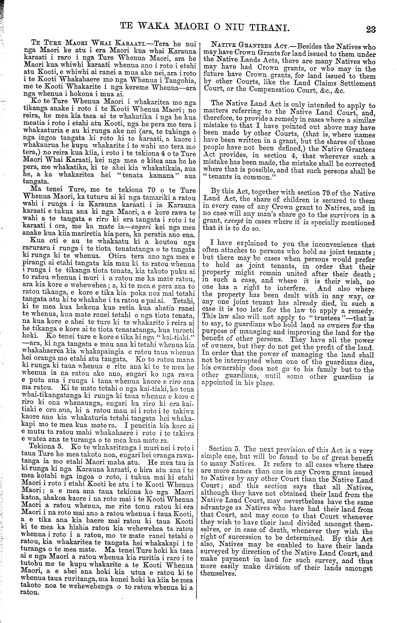 TE WAKA MAORI O NIU TIRANI. 23 TE TUBE MAORI WHAI KARAATI.—Tera he nui nga Maori ke atu i era Maori kua whai Karauna karaati i raro i nga Ture Whenua Maori, ara he Maori kua whiwhi karaati whenua ano i roto i etahi atu Kooti, e whiwhi ai ranei a mua ake nei, ara i roto i te Kooti Whakahaere mo nga Whenua i Tangohia, me te Kooti Whakarite i nga kereme Whenua—ara nga whenua i hokona i mua ai. Ko te Ture Whenua Maori i whakaritea mo nga tikanga anake i roto i te Kooti Whenua Maori; no reira, he mea kia taea ai te whakatika i nga he kua meatia i roto i etahi atu Kooti, nga he pera me tera i whakaaturia e au ki runga ake nei (ara, te tuhinga o nga ingoa tangata ki roto ki to karaati, a kaore i whakaurua he kupu whakarite i te wahi mo tera mo tera,) no reira kua kiia, i roto i te tekiona 4 o te Ture Maori Whai Karaati, kei nga mea e kitea ana he he pera, me whakatika, ki te ahei kia whakatikaia, aua he, a ka whakaritea hei "tenata kamana" aua tangata. Ma tenei Ture, me te tekiona 79 o te Ture Whenua Maori, ka tuturu ai ki nga tamariki a ratou wahi i runga i ia Karauna karaati i ia Karauna karaati e tukua ana ki nga Maori, a e kore rawa te wahi a te tangata e riro ki era tangata i roto i te karaati i ora, me ka mate ia—engari kei nga mea anake kua kiia mariretia kia pera, ka peratia ano ena. Kua oti e au te whakaatu ki a koutou nga raruraru i runga i te tiota tenatatanga o te tangata ki runga ki te whenua. Otira tera ano nga mea e pirangi ai etahi tangata kia mau ki to ratou whenua i runga i te tikanga tiota tenata, kia takoto puku ai to ratou whenua i muri i a ratou me ka mate ratou, ara kia kore e wehewehea; a, ki te mea e pera ana to ratou tikanga, e kore e tika kia poka noa mai tetahi tangata atu ki te whakahe i ta ratou e pai ai. Tetahi, ki te mea kua hokona kua retia kua ahatia ranei te whenua, kua mate ranei tetahi o nga tiota tenata, na kua kore e ahei te ture ki te whakarite i reira ai he tikanga e kore ai te tiota tenatatanga, kua tureeti hoki. Ko tenei ture e kore e tika ki nga " kai-tiaki." —ara, ki nga tangata e mau ana ki tetahi whenua kia whakahaerea kia whakapaingia e ratou taua whenua hei oranga mo etahi atu tangata. Ko to ratou mana ki runga ki taua whenua e rite aua ki to to mea ho whenua ia na ratou ake ano, engari ko nga rawa e puta ana i runga i taua whenua kaore o riro ana ma ratou. Ki te mate tetahi o nga kai-tiaki, ko tona whai-tikangatanga ki runga ki taua whenua o kore e riro ki ona whanaunga, engari ka riro ki era kai- tiaki e ora ana, ki a ratou mau ai i roto i te takiwa kaore ano kia whakaturia totahi tangata hei whaka- kapi mo te mea kua mate ra. I peneitia kia kore ai e mutu ta ratou mahi whakahaere i roto i to takiwa e watea ana te turanga o to mea kua mato ra. Tekiona 5. Ko te whakaritenga i muri nei i roto i taua Ture he mea takoto noa, engari hei oranga rawa- tanga ia mo etahi Maori maha atu. He mea tau ia ki runga ki nga Karauna karaati, e hira atu ana i to mea kotahi nga ingoa o roto, i tukua mai ki etahi Maori i roto i etahi Kooti ke atu i te Kooti Whenua Maori; a e mea ana taua tekiona ko nga Maori katoa, ahakoa kaore i ua roto mai i te Kooti Whenua Maori a ratou whenua, me rite tonu ratou ki era Maori i na roto mai ano a ratou whenua i taua Kooti, a e tika ana kia haere mai ratou ki taua Kooti ki te mea ka hiahia ratou kia wehewehea ta ratou whenua i roto i a ratou, mo te mate ranei tetahi o ratou, kia whakaritea te tangata hei whakakapi i te turanga o te mea mate. Ma tenei Ture hoki ka taea ai e nga Maori a ratou whenua kia ruritia i raro i te tutohu me te kupu whakarite a te Kooti Whenua Maori, a e ahei ana hoki kia utua e ratou ki te whenua taua ruritanga, ma konei hoki ka kiia he mea takoto noa te wehewehenga o to ratou whenua ki a ratou. NATIVE GRANTEES ACT.—Besides the Natives who may have Crown Grants for land issued to them under the Native Lands Acts, there are many Natives who may have had Crown grants, or who may in the future have Crown grants, for land issued to them by other Courts, like the Land Claims Settlement Court, or the Compensation Court, &c., &c. The Native Land Act is only intended to apply to matters referring to the Native Land Court, and, therefore, to provide a remedy in cases where a similar mistake to that I have pointed out above may have been made by other Courts, (that is, where names have been written in a grant, but the shares of those people have not been defined,) the Native Grantees Act provides, in section 4, that wherever such a mistake has been made, the mistake shall be corrected where that is possible, and that such persons shall be "tenants in common." By this Act, together with section 79 of the Native Land Act, the share of children is secured to them in every case of any Crown grant to Natives, and in no case will any man's share go to the survivors in a grant, except in cases where it is specially mentioned that it is to do so. I have explained to you the inconvenience that often attaches to persons who hold as joint tenants; but there may bo cases when persons would prefer to hold as joint tenants, in order that their property might remain united after their death; in such a case, and where it is their wish, no one has a right to interfere. And also where the property has been dealt with in any way, or any one joint tenant has already died, in such a case it is too late for the law to apply a remedy. This law also will not apply to "trustees"—that is to say, to guardians who hold land as owners for the purpose of managing and improving the land for the benefit of other persons. They have all the power of owners, but they do not get the profit of the land. In order that the power of managing the land shall not be interrupted when one of the guardians dies, his ownership does not go to his family but to the other guardians, until some other guardian is appointed in his place. Section 5. The next provision. of this Act is a very simple one, but will bo found to bo of great benefit to many Natives