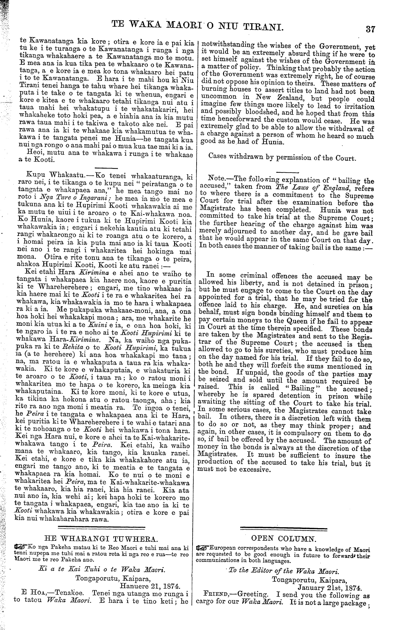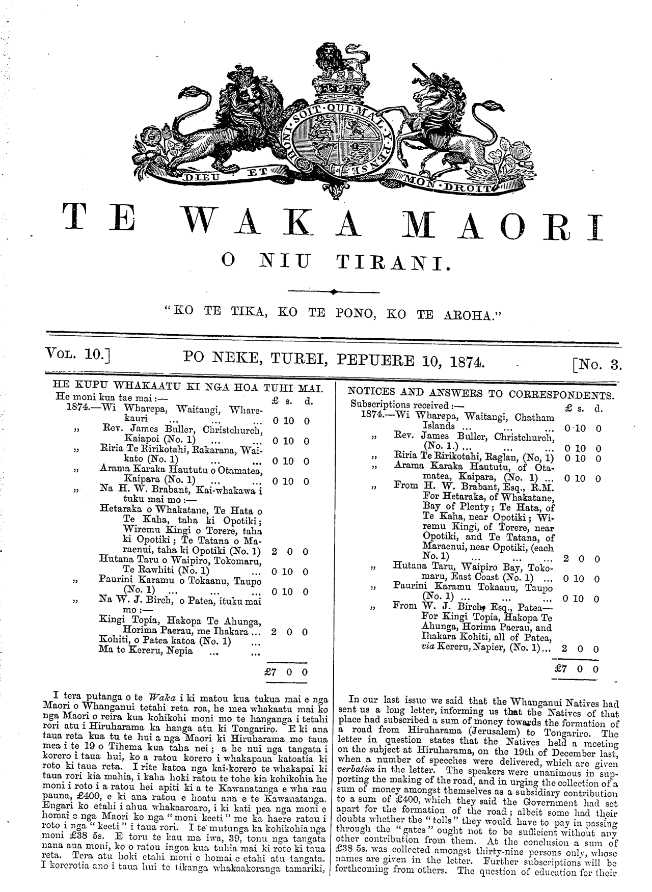 TE WAKA MAORI O NIU TIRANI . "KO TE TIKA, KO TE PONO, KO TE AROHA." VOL. 10.] PO NEKE, TUREI, PEPUERE 10, 1874. - [No. 3. HE KUPU WHAKAATU KI NGA HOA TUHI MAI. He moni kua tae mai:— £ s. d. 1874.—Wi Wharepa, Waitangi, Whare- kauri ... ... ... O 10 O Rev. James Buller, Christchurch, Kaiapoi (No. 1) ... ... O 10 O Riria Te Ririkotahi, Rakarana, Wai- kato (No. 1) ... ... O 10 O Arama Karaka Haututu o Otamatea, Kaipara (No. 1) ... ... O 10 O Na H. W. Brabant, Kai-whakawa i tuku mai mo:— Hetaraka o Whakatane, Te Hata o Te Kaha, taha ki Opotiki; Wiremu Kingi o Torere, taha ki Opotiki; Te Tatana o Ma- raenui, taha ki Opotiki (No. 1) 2 O O Hutana Taru o Waipiro, Tokomaru, Te Rawhiti (No. 1) ... O 10 O Paurini Karamu o Tokaanu, Taupo (No. 1) ... ... ... O 10 O Na W. J. Birch, o Patea, ituku mai mo:— Kingi Topia, Hakopa Te Ahunga, Horima Paerau, me Ihakara ... 2 O O Kohiti, o Patea katoa (No. 1) Ma te Kereru, Nepia £700 I tera putanga o te Waka i ki matou kua tukua mai e nga Maori o Whanganui tetahi reta roa, he mea whakaatu mai ko nga Maori o reira kua kohikohi moni mo te hanganga i tetahi rori atu i Hiruharama ka hanga atu ki Tongariro. E ki ana taua reta kua tu te hui a nga Maori ki Hiruharama mo taua mea i te 19 o Tihema kua taha nei; a he nui nga tangata i korero i taua hui, ko a ratou korero i whakapaua katoatia ki roto ki taua reta. I rite katoa nga kai-korero te whakapai ki taua rori kia mahia, i kaha hoki ratou te tohe kia kohikohia he moni i roto i a ratou hei apiti ki a te Kawanatanga e wha rau pauna, £400, e ki ana ratou e hoatu ana e te Kawanatanga. Engari ko etahi i ahua whakaaroaro, i ki kati pea nga moni e homai e nga Maori ko nga " moni keeti" me ka haere ratou i roto i nga " keeti" i taua rori. I te mutunga ka kohikohia nga moni £38 5s. E toru te kau ma iwa, 39, tonu nga tangata nana aua moni, ko o ratou ingoa kua tuhia mai ki roto ki taua reta. Tera atu hoki etahi moni e homai e etahi atu tangata. I korerotia ano i taua hui te tikanga whakaakoranga tamariki, NOTICES AND ANSWERS TO CORRESPONDENTS. Subscriptions received:— £ s. d. 1874.—Wi Wharepa, Waitangi, Chatham Islands ... ... ... O IO O Rev. James Buller, Christchurch, (No. 1.) ... ... ... O IO O Riria Te Ririkotahi, Raglan, (No, 1) O 10 O Arama Karaka Haututu, of Ota- matea, Kaipara, (No. 1) ... O 10 O From H. W. Brabant, Esq., R.M. For Hetaraka, of Whakatane, Bay of Plenty; Te Hata, of Te Kaha, near Opotiki; Wi- remu Kingi, of Torere, near Opotiki, and Te Tatana, of Maraenui, near Opotiki, (each No.1) ... ... ... 2 O O Hutana Taru, Waipiro Bay, Toko- maru, East Coast (No. 1) ... O 10 O Paurini Karamu Tokaanu, Taupo (No. 1) ... ... ... O 10 O From W. J. Birch, Esq., Patea— For Kingi Topia, Hakopa Te Ahunga, Horima Paerau, and Ihakara Kohiti, all of Patea, via Kereru, Napier, (No. 1)... 200 £700 In our last issue we said that the Whanganui Natives had sent us a long letter, informing us that the Natives of that place had subscribed a sum of money towards the formation of a road from Hiruharama (Jerusalem) to Tongariro. The letter in question states that the Natives held a meeting on the subject at Hiruharama, on the 19th of December last, when a number of speeches were delivered, which are given verbatim in the letter. The speakers were unanimous in sup- porting the making of the road, and in urging the collection of a sum of money amongst themselves as a subsidiary contribution to a sum of £400, which they said the Government had set apart for the formation of the road; albeit some had their doubts whether the " tolls " they would have to pay in passing through iho " gates " ought not to be sufficient without any other contribution from them. At the conclusion a sum of £38 5s. was collected amongst thirty-nine persons only, whose names are given in the letter. Further subscriptions will bo forthcoming from others. The question of education for their
