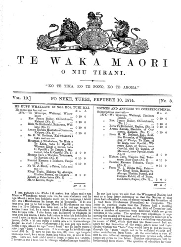 Te Waka Maori o Niu Tirani 1871-1877: Volume 10, Number 3. 19 February 1874 |