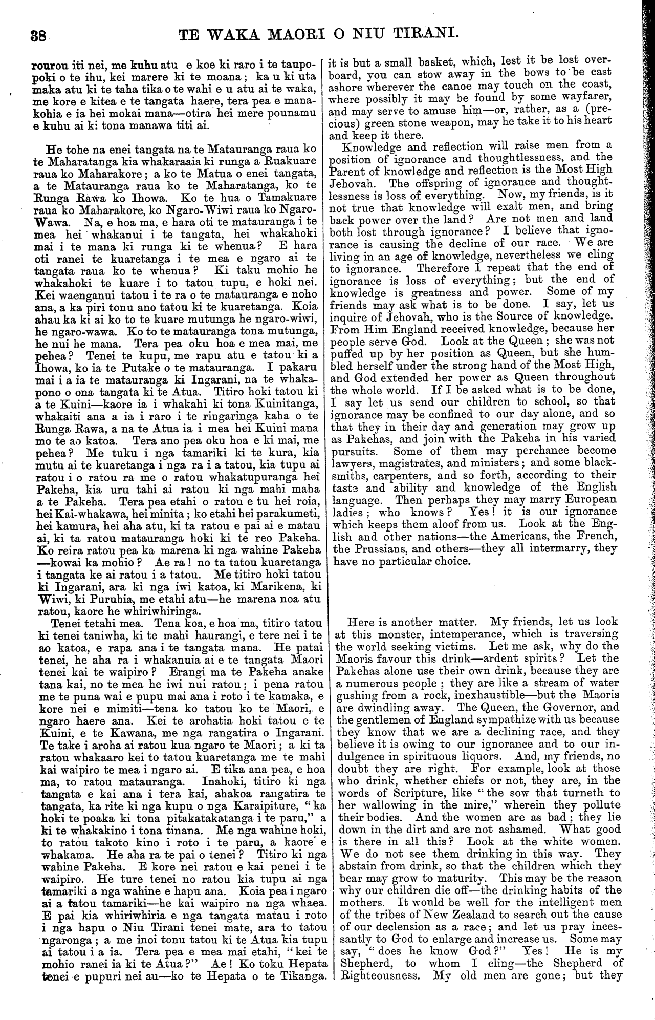 38 TE WAKA MAORI O NIU TIRANI. rourou iti nei, me kuhu atu e koe ki raro i te taupo- poki o te ihu, kei marere ki te moana; ka u ki uta maka atu ki te taha tika o te wahi e u atu ai te waka, me kore e kitea e te tangata haere, tera pea e mana- kohia e ia hei mokai mana—otira hei mere pounamu e kuhu ai ki tona manawa titi ai. He tohe na enei tangata na te Matauranga raua ko te Maharatanga kia whakaraaia ki runga a Ruakuare raua ko Maharakore; a ko te Matua o enei tangata, a te Matauranga raua ko te Maharatanga, ko te Runga Rawa ko Ihowa. Ko te hua o Tamakuare raua ko Maharakore, ko Ngaro-Wiwi raua ko Ngaro- Wawa. Na, e hoa ma, e hara oti te matauranga i te mea hei whakanui i te tangata, hei whakahoki mai i te mana ki runga ki te whenua? E hara oti ranei te kuaretanga i te mea e ngaro ai te tangata raua ko te whenua? Ki taku mohio he whakahoki te kuare i to tatou tupu, e hoki nei. Kei waenganui tatou i te ra o te matauranga e noho ana, a ka piri tonu ano tatou ki te kuaretanga. Koia ahau ka ki ai ko to te kuare mutunga he ngaro-wiwi, he ngaro-wawa. Ko to te matauranga tona mutunga, he nui he mana. Tera pea oku hoa e mea mai, me pehea? Tenei te kupu, me rapu atu e tatou ki a Ihowa, ko ia te Putake o te matauranga. I pakaru mai i a ia te matauranga ki Ingarani, na te whaka- pono o ona tangata ki te Atua. Titiro hoki tatou ki a te Kuini—kaore ia i whakahi ki tona Kuinitanga, whakaiti ana a ia i raro i te ringaringa kaha o te Runga Rawa, a na te Atua ia i mea hei Kuini mana mo te ao katoa. Tera ano pea oku hoa e ki mai, me pehea? Me tuku i nga tamariki ki te kura, kia mutu ai te kuaretanga i nga ra i a tatou, kia tupu ai ratou i o ratou ra me o ratou whakatupuranga hei Pakeha, kia uru tahi ai ratou ki nga mahi maha a te Pakeha. Tera pea etahi o ratou e tu hei roia, hei Kai-whakawa, hei minita; ko etahi hei parakumeti, hei kamura, hei aha atu, ki ta ratou e pai ai e matau ai, ki ta ratou matauranga hoki ki te reo Pakeha. Ko reira ratou pea ka marena ki nga wahine Pakeha —kowai ka mohio? Ae ra! no ta tatou kuaretanga i tangata ke ai ratou i a tatou. Me titiro hoki tatou ki Ingarani, ara ki nga iwi katoa, ki Marikena, ki Wiwi, ki Puruhia, me etahi atu—he marena noa atu ratou, kaore he whiriwhiringa. Tenei tetahi mea. Tena koa, e hoa ma, titiro tatou ki tenei taniwha, ki te mahi haurangi, e tere nei i te ao katoa, e rapa ana i te tangata mana. He patai tenei, he aha ra i whakanuia ai e te tangata Maori tenei kai te waipiro? Erangi ma te Pakeha anake tana kai, no te mea he iwi nui ratou; i pena ratou me te puna wai e pupu mai ana i roto i te kamaka, e kore nei e mimiti—tena ko tatou ko te Maori,. e ngaro haere ana. Kei te arohatia hoki tatou e te Kuini, e te Kawana, me nga rangatira o Ingarani. Te take i aroha ai ratou kua ngaro te Maori; a ki ta ratou whakaaro kei to tatou kuaretanga me te mahi kai waipiro te mea i ngaro ai. E tika ana pea, e hoa ma, to ratou matauranga. Inahoki, titiro ki nga tangata e kai ana i tera kai, ahakoa rangatira te tangata, ka rite ki nga kupu o nga Karaipiture, "ka hoki te poaka ki tona pitakatakatanga i te paru," a ki te whakakino i tona tinana. Me nga wahine hoki, to ratou takoto kino i roto i te paru, a kaore e whakama. He aha ra te pai o tenei? Titiro ki nga wahine Pakeha. E kore nei ratou e kai penei i te waipiro. He ture tenei no ratou kia tupu ai nga tamariki a nga wahine e hapu ana. Koia pea i ngaro ai a tatou tamariki—he kai waipiro na nga whaea. E pai kia whiriwhiria e nga tangata matau i roto i nga hapu o Niu Tirani tenei mate, ara to tatou ngaronga; a me inoi tonu tatou ki te Atua kia tupu ai tatou i a ia. Tera pea e mea mai etahi, " kei te mohio ranei ia ki te Atua?" Ae! Ko toku Hepata tenei e pupuri nei au—ko te Hepata o te Tikanga. it is but a small basket, which, lest it be lost over- board, you can stow away in the bows to "be cast ashore wherever the canoe may touch on the coast, where possibly it may be found by some wayfarer, and may serve to amuse him—or, rather, as a (pre- cious) green stone weapon, may he take it to his heart and keep it there. Knowledge and reflection will raise men from a position of ignorance and thoughtlessness, and the Parent of knowledge and reflection is the Most High Jehovah. The offspring of ignorance and thought- lessness is loss of everything. Now, my friends, is it not true that knowledge will exalt men, and bring back power over the land? Are not men and land both lost through ignorance? I believe that igno- rance is causing the decline of our race. We are living in an age of knowledge, nevertheless we cling to ignorance. Therefore 1 repeat that the end of ignorance is loss of everything; but the end of knowledge is greatness and powers . Some of my friends may ask what is to be done. I say, let us inquire of Jehovah, who is the Source of knowledge. From Him England received knowledge, because her people serve God. Look at the Queen; she was not puffed up by her position as Queen, but she hum- bled herself under the strong hand of the Most High, and God extended her power as Queen throughout the whole world. If I be asked what is to be done, I say let us send our children to school, so that ignorance may be confined to our day alone, and so that they in their day and generation may grow up as Pakehas, and join with the Pakeha in his varied pursuits. Some of them may perchance become lawyers, magistrates, and ministers; and some black- smiths, carpenters, and so forth, according to their taste and ability and knowledge of the English language. Then perhaps they may marry European ladies; who knows? Yes! it is our ignorance which keeps them aloof from us. Look at the Eng- lish and other nations—the Americans, the French, the Prussians, and others—they all intermarry, they have no particular choice. Here is another matter. My friends, let us look at this monster, intemperance, which is traversing the world seeking victims. Let me ask, why do the Maoris favour this drink—ardent spirits? Let the Pake