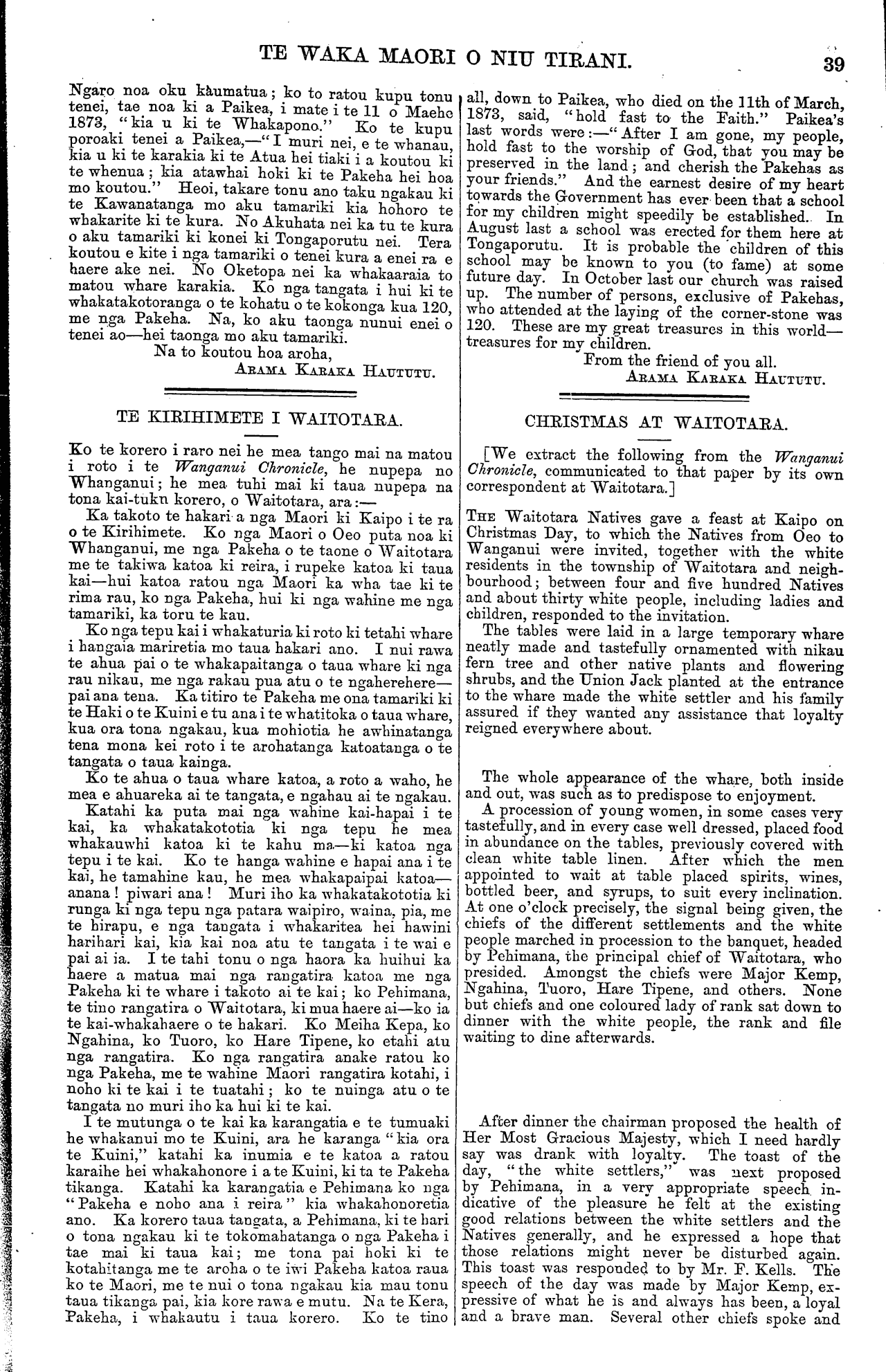 TE WAKA MAORI O NIU TIRANI. 39 Ngaro noa oku kaumatua; ko to ratou kupu tonu tenei, tae noa ki a Paikea, i mate i te 11 o Maehe 1873, "kia u ki te Whakapono." Ko te kupu poroaki tenei a Paikea,—" I muri nei, e te whanau, kia u ki te karakia ki te Atua hei tiaki i a koutou ki te whenua; kia atawhai hoki ki te Pakeha hei hoa mo koutou." Heoi, takare tonu ano taku ngakau ki te Kawanatanga mo aku tamariki kia hohoro te whakarite ki te kura. No Akuhata nei ka tu te kura o aku tamariki ki konei ki Tongaporutu nei. Tera koutou e kite i nga tamariki o tenei kura a enei ra e haere ake nei. No Oketopa nei ka whakaaraia to matou whare karakia. Ko nga tangata i hui ki te whakatakotoranga o te kohatu o te kokonga kua 120, me nga Pakeha. Na, ko aku taonga nunui enei o tenei ao—hei taonga mo aku tamariki. Na to koutou hoa aroha, ARAMA KARAKA HAUTUTU. TE KIRIHIMETE I WAITOTARA. Ko te korero i raro nei he mea tango mai na matou i roto i te Wanganui Chronicle, he nupepa no Whanganui; he mea tuhi mai ki taua nupepa na tona kai-tuku korero, o Waitotara, ara:— Ka takoto te hakari a nga Maori ki Kaipo i te ra o te Kirihimete. Ko nga Maori o Oeo puta noa ki Whanganui, me nga Pakeha o te taone o Waitotara me te takiwa katoa ki reira, i rupeke katoa ki taua kai—hui katoa ratou nga Maori ka wha tae ki te rima rau, ko nga Pakeha, hui ki nga wahine me nga tamariki, ka toru te kau. Ko nga tepu kai i whakaturia ki roto ki tetahi whare i hangaia mariretia mo taua hakari ano. I nui rawa te ahua pai o te whakapaitanga o taua whare ki nga rau nikau, me nga rakau pua atu o te ngaherehere— pai ana tena. Ka titiro te Pakeha me ona tamariki ki te Haki o te Kuini e tu ana i te whatitoka o taua whare, kua ora tona ngakau, kua mohiotia he awhinatanga tena mona kei roto i te arohatanga katoatanga o te tangata o taua kainga. Ko te ahua o taua whare katoa, a roto a waho, he mea e ahuareka ai te tangata, e ngahau ai te ngakau. Katahi ka puta mai nga wahine kai-hapai i te kai, ka whakatakotoria ki nga tepu he mea whakauwhi katoa ki te kahu ma,—ki katoa nga tepu i te kai. Ko te hanga wahine e hapai ana i te kai, he tamahine kau, he mea whakapaipai katoa— anana! piwari ana! Muri iho ka whakatakotoria ki runga ki nga tepu nga patara waipiro, waina, pia, me te hirapu, e nga tangata i whakaritea hei hawini harihari kai, kia kai noa atu te tangata i te wai e pai ai ia. I te tahi tonu o nga haora ka huihui ka haere a matua mai nga rangatira katoa me nga Pakeha ki te whare i takoto ai te kai; ko Pehimana, te tino rangatira o Waitotara, ki mua haere ai—ko ia te kai-whakahaere o te hakari. Ko Meiha Kepa, ko Ngahina, ko Tuoro, ko Hare Tipene, ko etahi atu nga rangatira. Ko nga rangatira anake ratou ko nga Pakeha, me te wahine Maori rangatira kotahi, i noho ki te kai i te tuatahi; ko te nuinga atu o te tangata no muri iho ka hui ki te kai. I te mutunga o te kai ka karangatia e te tumuaki he whakanui mo te Kuini, ara he karanga " kia ora te Kuini," katahi ka inumia e te katoa a ratou karaihe hei whakahonore i a te Kuini, ki ta te Pakeha tikanga. Katahi ka karangatia e Pehimana ko nga "Pakeha e noho ana i reira" kia whakahonoretia ano. Ka korero taua tangata, a Pehimana. ki te hari o tona ngakau ki te tokomahatanga o nga Pakeha i tae mai ki taua kai; me tona pai hoki ki te kotahitanga me te aroha o te iwi Pakeha katoa raua ko te Maori, me te nui o tona ngakau kia mau tonu taua tikanga pai, kia kore rawa e mutu. Na te Kera, Pakeha, i whakautu i taua korero. Ko te tino all, down to Paikea, who died on the 11th of March, 1873, said, "hold fast to the Faith." Paikea's last words were:—" After I am gone, my people, hold fast to the worship of God, that you may be preserved in the land; and cherish the Pakehas as your friends." And the earnest desire of my heart towards the Government has ever been that a school for my children might speedily be established. In August last a school was erected for them here at Tongaporutu. It is probable the children of this school may be known to you (to fame) at some future day. In October last our church was raised up. The number of persons, exclusive of Pakehas, who attended at the laying of the corner-stone was 120. These are my great treasures in this world— treasures for my children. From the friend of you all. ARAMA KARAKA HAUTUTU. CHRISTMAS AT WAITOTARA. [We extract the following from the Wanganui Chronicle, communicated to that paper by its own correspondent at Waitotara.] THE Waitotara Natives gave a feast at Kaipo on Christmas Day, to which the Natives from Oeo to Wanganui were invited, together with the white residents in the township of Waitotara and neigh- bourhood; between four and five hundred Natives and about thirty white people, including ladies and children, responded to the invitation. The tables were laid in a large temporary whare neatly made and tastefully ornamented with nikau fern tree and other native plants and flowering shrubs, and the Union Jack planted at the entrance to the whare made the white settler and his family assured if they wanted any assistance that loyalty reigned everywhere about. The whole appearance of the whare, both inside and out, was such as to predispose to enjoyment. A procession of young women, in some cases very tastefully, and in every case well dressed, placed food in abundance on the tables, previously covered with clean white table linen. After which the men appointed to wait at table placed spirits, wines, bottled beer, and syrups, to suit every inclination. At one o'clock precisely, the signal being given, the chiefs of the different settlements and the white people marched in procession to the banquet, headed by Pehimana, the principal chief of Waitotara, who presided. Amongst the chiefs were Major Kemp, Ngahina, Tuoro, Hare Tipene, and others. None but chiefs and one coloured lady of rank sat down to dinner with the white people, the rank and file waiting to dine afterwards. After dinner the chairman proposed the health of Her Most Graci