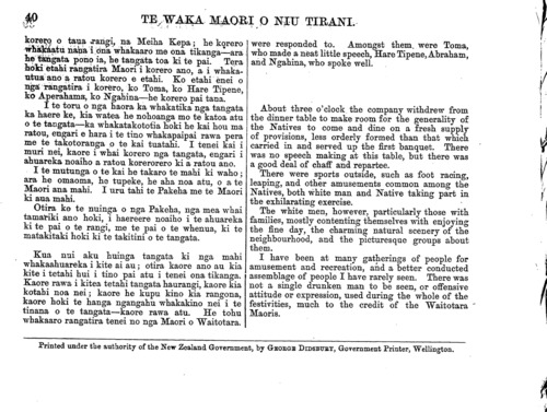 40 TE WAKA MAORI O NIU TIRANI. korero o taua rangi, na Meiha Kepa; he korero whakaatu nana i ona whakaaro me ona tikanga— ara he tangata pono ia, he tangata toa ki te pai. Tera hold etahi rangatira Maori i korero ano, a i whaka- utua ano a ratou korero e etahi. Ko etahi enei o nga rangatira i korero, ko Toma, ko Hare Tipene, ko Aperahama, ko Ngahina—he korero pai tana. I te toru o nga haora ka whakatika nga tangata ka haere ke, kia watea he nohoanga mo te katoa atu o te tangata—ka whakatakotoria hoki he kai hou ma ratou, engari e hara i te tino whakapaipai rawa pera me te takotoranga o te kai tuatahi. I tenei kai i muri nei, kaore i whai korero nga tangata, engari i ahuareka noaiho a ratou korerorero ki a ratou ano. I te mutunga o te kai he takaro te mahi ki waho; ara he omaoma, he tupeke, he aha noa atu, o a te Maori ana mahi. I uru tahi te Pakeha me te Maori ki aua mahi. Otira ko te nuinga o nga Pakeha, nga mea whai tamariki ano hoki, i haereere noaiho i te ahuareka ki te pai o te rangi, me te pai o te whenua, ki te matakitaki hoki ki te takitini o te tangata. Kua nui aku huinga tangata ki nga mahi whakaahuareka i kite ai au; otira kaore ano au kia kite i tetahi hui i tino pai atu i tenei ona tikanga. Kaore rawa i kitea tetahi tangata haurangi, kaore kia kotahi noa nei; kaore he kupu kino kia rangona, kaore hoki te hanga ngangahu whakakino nei i te tinana o te tangata—kaore rawa atu. He tohu whakaaro rangatira tenei no nga Maori o Waitotara. were responded to. Amongst them. were Toma, who made a neat little speech, Hare Tipene, Abraham, and Ngahina, who spoke well. About three o'clock the company withdrew from the dinner table to make room for the generality of the Natives to come and dine on a fresh supply of provisions, less orderly formed than that which carried in and served up the first banquet. There was no speech making at this table, but there was a good deal of chaff and repartee. There were sports outside, such as foot racing, leaping, and other amusements common among the Natives, both white man and Native taking part in the exhilarating exercise. The white men, however, particularly those with families, mostly contenting themselves with enjoying the fine day, the charming natural scenery of the neighbourhood, and the picturesque groups about them. I have been at many gatherings of people for amusement and recreation, and a better conducted assemblage of people I have rarely seen. There was not a single drunken man to be seen, or offensive attitude or expression, used during the whole of the festivities, much to the credit of the Waitotara Maoris. Printed under the authority of the New Zealand Government, by GEORGE DIDSBURY, Government Printer, Wellington.