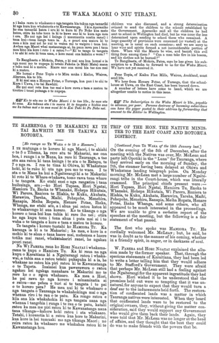 30 TE WAKA MAORI O NIU TIRANI. a i kaha rawa te whakaaro o nga tangata kia tukua nga tamariki] ki nga kura kua whakaturia e te Kawanatanga. I ki a Aperaniko ko ona tamariki katoa i uru ki te kura ki Po Neke kua mate katoa, otira ka tohe tonu ia ki te kawe ano ki te kura nga mea i ora. He nui nga kai i kainga (i maumautia noatia ranei) i taua hui—tona hanga tonu ia. A, e pouri ana matou ki te mea e kiia mai nei he nui te waina me te waipiro i taua hui. Awhea nga Maori whai matauranga ai, ka pana rawa pea i taua mea kino kia kore i roto i a ratou?—" Ki te tango te tangata i te ahi ki roto ki tona uma, e kore ranei ona kakahu e wera? " Te Rangihaeta o Mokoia, Patea, e ki mai ana kua homai e ia nga moni mo te nupepa ki tetahi Pakeha (a Maki Mata) mana e tuku mai ki a matou. Kaore ano aua moni kia tae noa mai ki a matou. Me homai e Pene Topia o te Mira muka i Kaihu, Wairoa, Akarana, kia te 10s. E ki mai ana a Henare Potae, o Turanga, kua pau i te ahi te Kura i Uawa, i te tai Rawhiti. He nui enei reta kua tae mai e kore rawa e taea e matou te tirotiro i tenei putanga 6 te nupepa. Ko te utu mo te Waka Maori i te tau 10s., he mea utu ki mua. Ka tukuna atu i te meera ki te tangata e hiahia ana me ka tukua mai e ia aua moni ki te Kai Tuhi ki Po Neke nei. TE HAERENGA O TE MAKARINI KI TE TAI RAWHITI ME TE TAKIWA KI ROTORUA. [ He roanga no TE WAKA o te 13 o Hanuere.] I TE mutunga o te korero ki nga Maori, i te ahiahi o te 5 o Tihema, ka rere atu te Makarini, me ona hoa, i runga i a te Runa, ka rere ki Tauranga, a tae atu ana ratou ki taua kainga i te ata o te Ratapu, te 7 o nga ra. I roa te tima ki Ohiwa, ki Whakatane hoki, ki te ruke ki uta nga pou mo te waea. I te ata o te Mane ka hui a Ngaiterangi ki a te Makarini ki roto ki te Whare-whakawa, tomo rawa taua whare i te tangata. Ko etahi enei o nga rangatira i taua huihuinga, ara;—ko Hori Tupaea, Hori Ngatai, Hamiora Tu, Enoka te Whanake, Hohepa Hikutaia, Wi Parera, Raniera te Hiahia, te Kuku, Akuhata, Harawira, Tareha, Maihi, Pohepohe, Menehira, Ranapia, Meiha Ropata, Henare Potae, Ihaka, Whanga, me etahi atu, a i ahua pai ratou katoa ki te whakarongo ki aua korero. Ko te tikanga o nga - korero o taua hui kua tuhia ki raro iho nei; otira ko nga kupu tonu i tona ahua i puta mai ai i te waha o te tangata e kore e taea e matou te korero. Te tangata i korero tuatahi ko HAMIORA. TU. Ka karanga ia ki a te Makarini; ka mea, e kore ia e mohio ki te ahua o tana haere mai, mehemea e haere totika mai ranei, whakatakariri ranei, he ngakau pouri ranei. Na WI PARERA raua ko HORI NGATAI i whakama- rama te kupu o Hamiora Tu. Ka ki raua na nga kupu o Karaitiana ki a Ngaiterangi ratou i whaka- wai, a tuhia ana e ratou tetahi pukapuka ki a ia, he whakaae no ratou kia piri ratou ki te Kawanatanga o te Tapeta. Inaianei kua pawerawera o ratou ngakau kei ngakau mauahara te Makarini mo te rere ke o o ratou whakaaro. Ka mea a Hori, he pai rawa no nga korero i minaminatia ai e ratou me pehea e turi ai te tangata i te pai o te korero pera? He mea nui ki te whakaaro o nga tangata o Tauranga te whakahokinga mai o nga whenua riro i te rau o te patu. Ka rongo ratou e kiia ana kia whakahokia ki nga tangata nana nga whenua i tangohia i runga i te rau o te patu, katahi ratou ka mea me piri ratou ki te Kawanatanga nana taua tikanga—kahore hoki ratou i ata whakaaro. Tetahi, i korerotia ki a ratou kua kore te Makarini, kua kore ia hei tumuaki mo nga tikanga Maori ; no reira ratou ka whakaaro me whakahoa ratou ki te Kawanatanga hou. children vvas also discussed, and a strong determination evinced to send the children to the schools established by the Government Aperaniko said all the children he had sent to school in Wellington had died, but he was none the less determined upon sending to school those who remained. A Iarge quantity of provisions were consumed (or wasted) at the meeting, as is usual on such occasions; and we are sorry to hear wine and spirits formed a not inconsiderable portion of them. When will the Maoris be wise, and banish this evil thing from among them? " Can a man take fire in his bosom, and his clothes not be burned?" Te Rangihaeta, of- Mokoia, Patea, says he has given his sub- scription to -a Pakeha to forward to us for the Waka Maori. We have not yet received it. Pene Topia, of Kaihu Flax Mills, Wairoa, Auckland, must send 10s. We hear from Henare Potae, of Turauga, that the school- house at Uawa, on the East Coast, has been burned down. A number of letters have come to hand, which we are altogether unable to notice in this issue. The Subscription to the Waka Maori is 10s., payable in advance, per year. Persons desirous of becoming subscribers can have the paper posted to their address by forwarding that amount to the Editor in Wellington. TRIP OF THE HON. THE NATIVE MINIS- TER TO THE EAST COAST AND ROTORUA DISTRICT. [Continued from TE WAKA of the 13th January last.] ON the evening of the 5th of December, after the meeting with the Natives was over, Mr. McLean and party left Opotiki in the " Luna" for Tauranga, where they arrived early on the morning of Sunday, the 7th, the steamer having been delayed at Ohiwa and Whakatane landing telegraph poles. On Monday morning Mr. McLean met a Iarge number of Ngaite- rangi tribe in the Court-house, which was literally crammed. The principal chiefs present were:— Hori Tupaea, Hori Ngatai, Hamiora Tu, Enoka te Whanake, Hohepa Hikutaia, Wi Parera, Raniera te Hiahia, te Kuku, Akuhata, Harawira, Tareha, Maihi, Pohepohe, Menehira, Ranapia, Meiha Ropata, Henare Potae, Ihaka Whanga, and some others, who all appeared to be much interested in the proceedings. We are unable to give a verbatim report of the speeches at the meeting, but the following is a fair statement of what passed. The first who spoke was HAMIORA. TV. He cordially welcomed Mr. MCLEAN; but, he said, he was in doubt as to the manner of his coming, whether in a friendly spirit, in anger, or in darkness of soul. W. PARERA and HORI NGATAI explained the allu-