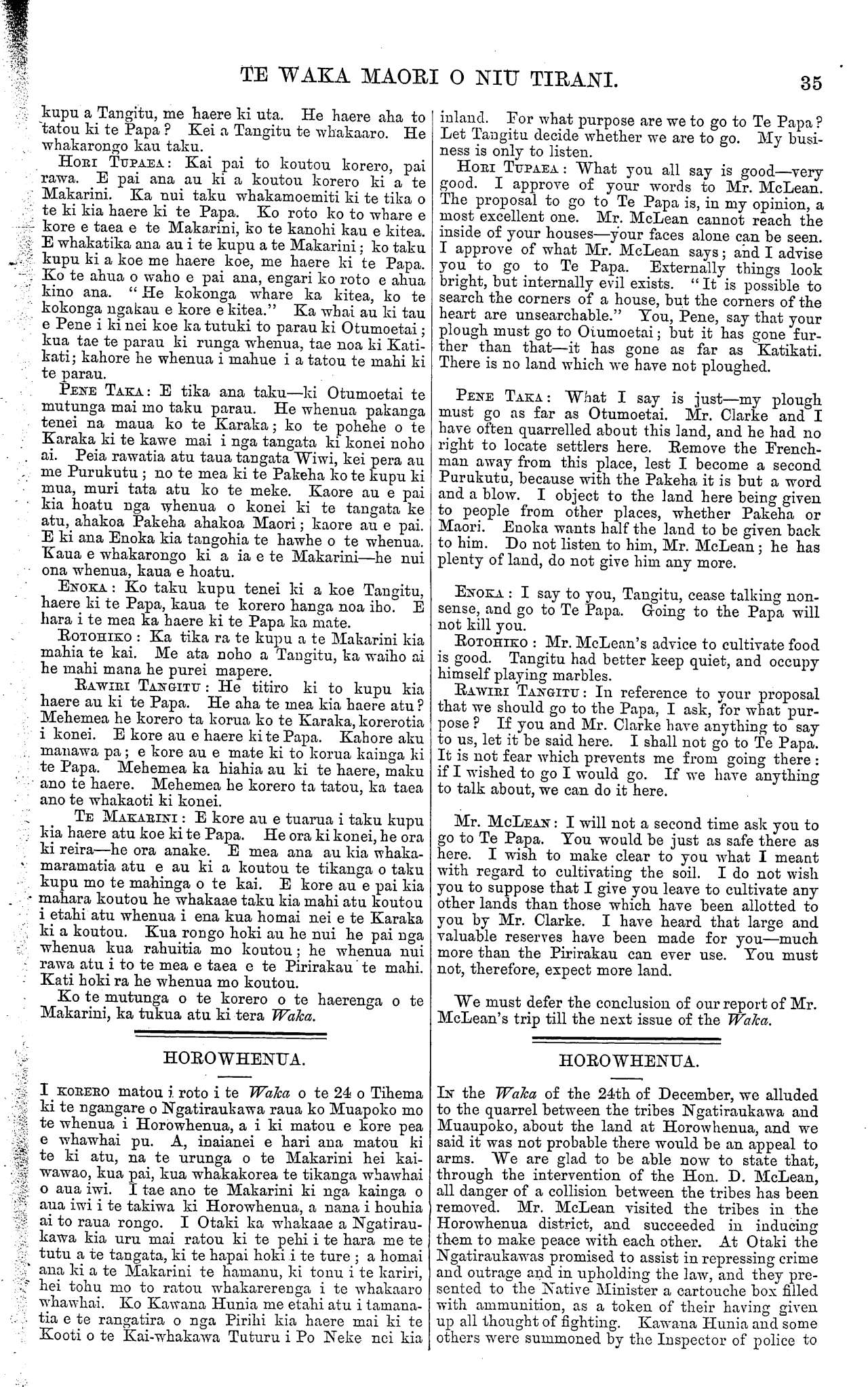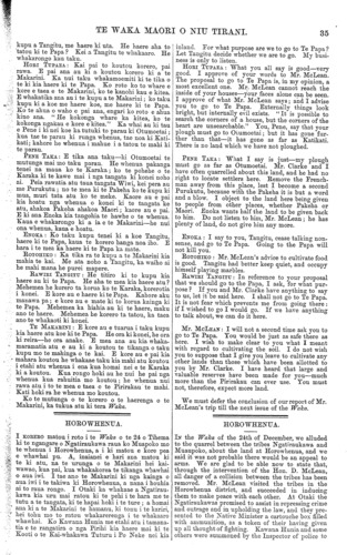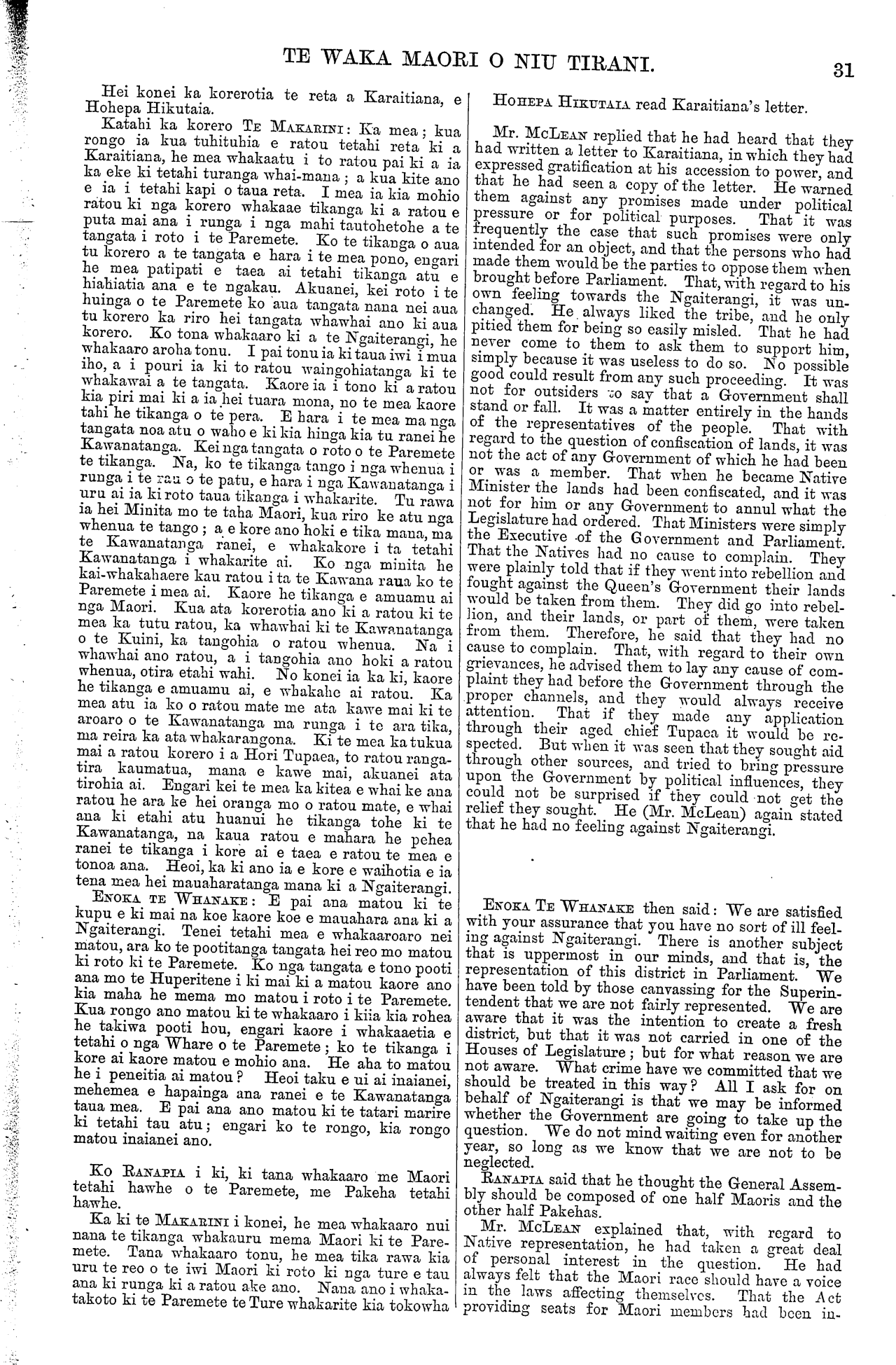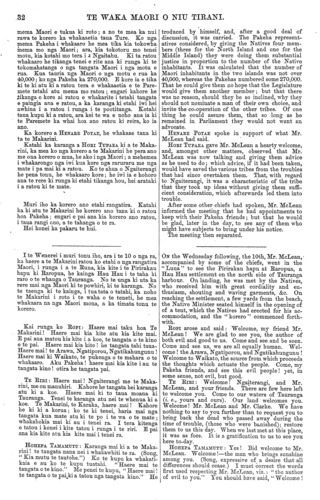 TE WAKA MAORI O NIU TIRANI. 31 Hei konei ka korerotia te reta a Karaitiana, e Hohepa Hikutaia. Katahi ka korero TE MAKARINI: Ka mea; kua rongo ia kua tuhituhia e ratou tetahi reta ki a Karaitiana, he mea whakaatu i to ratou pai ki a ia ka eke ki tetahi turanga whai-mana; a kua kite ano e ia i tetahi kapi o taua reta. I mea ia kia mohio ratou ki nga korero whakaae tikanga ki a ratou e puta mai ana i runga i nga mahi tautohetohe a te tangata i roto i te Paremete. Ko te tikanga o aua tu korero a te tangata e hara i te mea pono, engari he mea patipati e taea ai tetahi tikanga atu e hiahiatia ana e te ngakau. Akuanei, kei roto i te huinga o te Paremete ko aua tangata nana nei aua tu korero ka riro hei tangata whawhai ano ki aua korero. Ko tona whakaaro ki a te Ngaiterangi, he whakaaro aroha tonu. I pai tonu ia ki taua iwi i mua iho, a i pouri ia ki to ratou waingohiatanga ki te whakawai a te tangata. Kaore ia i tono ki a ratou kia piri mai ki a ia hei tuara mona, no te mea kaore tahi he tikanga o te pera. E hara i te mea ma nga tangata noa atu o waho e ki kia hinga kia tu ranei he Kawanatanga. Kei nga tangata o roto o te Paremete te tikanga. Na, ko te tikanga tango i nga whenua i runga i te rau o te patu, e hara i nga Kawanatanga i uru ai ia ki roto taua tikanga i whakarite. Tu rawa ia hei Minita mo te taha Maori, kua riro ke atu nga whenua te tango; a e kore ano hoki e tika mana, ma te Kawanatanga ranei, e whakakore i ta tetahi Kawanatanga i whakarite ai. Ko nga minita he kai-whakahaere kau rato u i ta te Kawana raua ko te Paremete i mea ai. Kaore ho tikanga e amuamu ai nga Maori. Kua ata korerotia ano ki a ratou ki te mea ka tutu ratou, ka whawhai ki te Kawanatanga o te Kuini, ka tangohia o ratou whenua. Na i whawhai ano ratou, a i tangohia ano hoki a ratou whenua, otira etahi wahi. No konei ia ka ki, kaore he tikanga e amuamu ai, e whakahe ai ratou. Ka mea atu ia ko o ratou mate me ata kawe mai ki te aroaro o te Kawanatanga ma runga i te ara tika, ma reira ka ata whakarangona. Ki te mea ka tukua mai a ratou korero i a Hori Tupaea, to ratou ranga- tira kaumatua, mana e kawe mai, akuanei ata tirohia ai. Engari kei te mea ka kitea e whai ke aua ratou he ara ke hei oranga mo o ratou mate, e whai ana ki etahi atu huanui he tikanga tohe ki te Kawanatanga, na kaua ratou e mahara he pehea ranei te tikanga i kore ai e taea e ratou te mea e tonoa ana. Heoi, ka ki ano ia e kore e waihotia e ia tena mea hei mauaharatanga mana ki a Ngaiterangi. ENOKA TE WHANAKE: E pai ana matou ki te kupu e ki mai na koe kaore koe e mauahara ana ki a Ngaiterangi. Tenei tetahi mea e whakaaroaro nei matou, ara ko te pootitanga tangata hei reo mo matou ki roto ki te Paremete. Ko nga tangata e tono pooti ana mo te Huperitene i ki mai ki a matou kaore ano kia maha he mema mo matou i roto i te Paremete. Kua rongo ano matou ki te whakaaro i kiia kia rohea he takiwa pooti hou, engari kaore i whakaaetia e tetahi o nga Whare o te Paremete; ko te tikanga i kore ai kaore matou e mohio ana. He aha to matou he i peneitia ai matou? Heoi taku e ui ai inaianei, mehemea e hapainga ana ranei e te Kawanatanga taua mea. E pai ana ano matou ki te tatari marire ki tetahi tau atu; engari ko te rongo, kia rongo matou inaianei ano. Ko RANAPIA. i ki, ki tana whakaaro me Maori tetahi hawhe o te Paremete, me Pakeha tetahi hawhe. Ka ki te MAKARINI i konei, he mea whakaaro nui nana te tikanga whakauru mema Maori ki te Pare- mete. Tana whakaaro tonu, he mea tika rawa kia uru te reo o te iwi Maori ki roto ki nga ture e tau ana ki runga ki a ratou ake ano. Nana ano i whaka- takoto ki te Paremete te Ture whakarite kia tokowha HOHEPA HIKUTAIA. read Karaitiana's letter. Mr. McLEAN replied that he had heard that they had written a letter to Karaitiana, in which they had expressed gratification at his accession to power, and that he had seen a copy of the letter. He warned them against any promises made under political pressure or for political purposes. That it was frequently the case that such promises were only intended for an object, and that the persons who had made them would be the parties to oppose them when brought before Parliament. That, with regard to his own feeling towards the Ngaiterangi, it was un- changed. He always liked the tribe, and he only pitied them for being so easily misled. That he had never come to them to ask them to support him, simply because it was useless to do so. No possible good could result from any such proceeding. It was not for outsiders to say that a Government shall stand or fall. It was a matter entirely in the hands of the representatives of the people. That with regard to the question of confiscation of lands, it was not the act of any Government of which he had been or was a member. That when he became Native Minister the lands had been confiscated, and it was not for him or any Government to annul what the Legislature had ordered. That Ministers were simply the Executive of the Government and Parliament. That the Natives had no cause to complain. They were plainly told that if they went into rebellion and fought against the Queen's Government their lands would be taken from them. They did go into rebel- lion, and their lands, or part of them, were taken from. them. Therefore, he said that they had no cause to complain. That, with regard to their own grievances, he advised them to lay any cause of com- plaint they had before the Government through the proper channels, and they would always receive attention. That if they made any application through their aged chief Tupaea it would be re- spected. But when it was seen that they sought aid through other sources, and tried to bring pressure upon the Government by political influences, they could not be surprised if they could not get the relief they sought. He (Mr. McLean) again stated that he had no feeling against Ngaiterangi. ENOKA TE WHANAKE then said: We are satisfied with your assurance that you have no sort of ill feel- ing against Ngaiterangi. There is ano