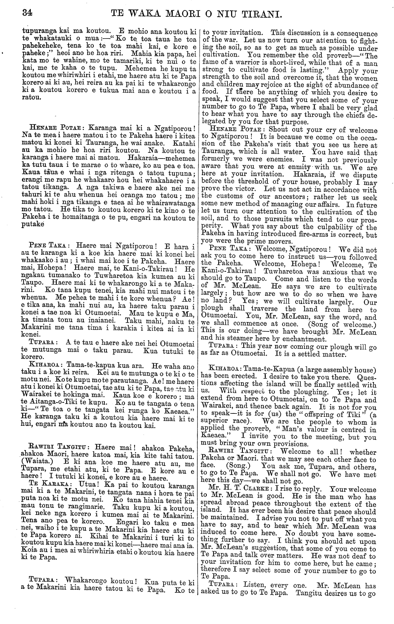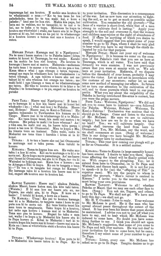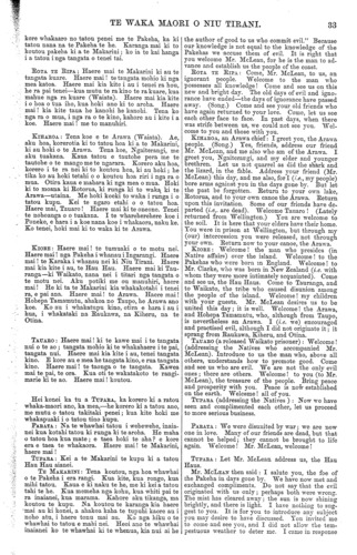 TE WAKA MAORI O NIU TIRANI. 33 kore whakaaro no tatou penei me te Pakeha, ka ki tatou nana na te Pakeha te he. Karanga mai ki to koutou pakeha ki a te Makarini; ko ia te kai hanga i a tatou i nga tangata o tenei tai. ROTA TE RIPA.; Haere mai te Makarini ki au te tangata kuare. Haere mai! te tangata mohio ki nga mea katoa. Haere mai kia kite i au i tenei ra hou, he ra pai tenei—kua mutu te ra kin o te ra kuare, kua mahue nga ra kuare (Waiata). Haere mai kia kite i o hoa o tua iho, kua hoki ano ki to aroha. Haere mai! kia kite taua he kanohi he kanohi. Tena ko nga ra o mua, i nga ra o te kino, kahore au i kite i a koe. Haere mai! me to manuhiri. KIHAROA: Tena koe e te Arawa (Waiata). Ae, aku hoa, korerotia ki to tatou hoa ki a te Makarini, ki au hoki o te Arawa. Tena koe, Ngaiterangi, me aku tuakana. Kaua tatou e tautohe pera me te tautohe o te mango me te ngarara. Korero aku hoa, korero i te ra nei ki to koutou hoa, ki au hoki; he tika ko au hoki tetahi o o koutou hoa riri i nga ra o mua. O tira kaua e mahara ki nga mea o mua. Hoki ki to moana ki Rotorua, ki runga ki to waka ki te Arawa—utaina. Me hoki koe ki to waka i runga i o tatou kupu. Kei te ngaro etahi o o tatou hoa. Haere mai, Tauaro! Haere mai ki te oneone. Tenei te nohoanga o o tuakana. I te whareherehere koe i Poneke, e hara i a koe nana koe i whakaora, naku ke. Ko tenei, hoki mai ki to waka ki te Arawa. KIORE: Haere mai! te tumuaki o te motu nei. Haere mai! nga Pakeha i whanau i Ingarangi. Haere mai! te Karaka i whanau nei ki Niu Tirani. Haere mai kia kite i au, te Hau Hau. Haere mai ki Tau- ranga—ki Waikato, nana nei i titari nga tangata o te motu nei. Aku potiki me ou manuhiri, haere mai! He ki ta te Makarini kia whakakotahi i tenei ra, e pai ana. Haere mai! te Arawa. Haere mai! Hohepa Tamamutu, ahakoa no Taupo, he Arawa ano koe. Ko au i whakatupu kino, otira e hara i au i hua, i whakataki na Raukawa, na Kiheru, na te Otina. TAUARO: Haere mai! ki te kawe mai i te tangata nui o te ao; tangata mohio ki te whakahaere i te pai, tangata nui. Haere mai kia kite i au, tenei tangata kino. E kore au e mea he tangata kino, e rua tangata kino. Haere mai! te taonga o te tangata. Kawea mai te pai, te ora. Kua oti te wakatakoto te rangi- marie ki te ao. Haere mai! koutou. Hei konei ka tu a TUPARA., ka korero ki a ratou whaka-maori ano, ka mea,—he korero ki a tatou ano, me mutu o tatou takitaki penei; kua kite hoki me whakapuaki i o tatou tino kupu. PARATA.: Na te whawhai tatou i wehewehe, inaia- nei kua kotahi tatou ki runga ki te aroha. He maha o tatou hoa kua mate; e taea hoki te aha? e kore era e taea te whakaora. Haere mai! te Makarini, haere mai! TUPARA.: Kei a te Makarini te kupu ki a tatou Hau Hau aianei. TE MAKARINI: Tena koutou, nga hoa whawhai o te Pakeha i era rangi. Kua kite, kua rongo, kua mihi tatou. Kaua e ki naku te he, me ki kei a tatou tahi te he. Kua memeha nga kohu, kua whiti pai te ra inaianei, kua marama. Kahore aku tikanga, ma koutou te kupu. Na koutou te karanga kia haere •mai au ki konei, a ahakoa kaha te tupuhi kaore au i noho atu, i haere tonu mai au. Ko nga hiku o te whawhai to tatou e mahi nei. Heoi ano te whawhai inaianei ko te whawhai ki te whenua, kia nui ai he the author of good to us who commit evil." Because our knowledge is not equal to the knowledge of the Pakehas we accuse them of evil. It is right that you welcome Mr. McLean, for he is the man to ad- vance and establish us the people of the coast. ROTA. TE RIPA: Come, Mr. McLean, to us, an ignorant people. Welcome to the man who possesses all knowledge! Come and see us on this new and bright day. The old days of evil and igno- rance have ended—the days of ignorance have passed away. (Song.) Come and see your old friends who have again returned to your love. Come, let us see each other face to face. In past days, when there was strife between us, we could not see you. Wel- come to you and those with you. KIHAROA, an Arawa chief: I greet you, the Arawa people. (Song.) Yes, friends, address our friend Mr. McLean, and me also who am of the Arawa. I greet you, Ngaiterargi, and my elder and younger brethren. Let us not quarrel as did the shark and the lizard, in the fable. Address your friend (Mr. McLean) this day, and me also, for I (i.e., my people) bore arms against you in the days gone by. But let the past be forgotten. Return to your own lake, Rotorua, and to your own canoe the Arawa. Return upon this invitation. Some of our friends have de- parted (i.e,. are dead). Welcome Tauaro! (Lately returned from Wellington.) You are welcome to the soil. It is here that your elders have their home. You were in prison at Wellington, but through my (our) intercession you were released, not through your own. Return now to your canoe, the Arawa. KIORE: Welcome! the man who presides (in Native affairs) over the island. Welcome! to the Pakehas who were born in England. Welcome! to Mr. Clarke, who was born in New Zealand (i.e. with whom they were more intimately acquainted). Come and see us, the Hau Haus. Come to Tauranga, and to Waikato, the tribe who caused disunion among the people of the island. Welcome! my children with your guests. Mr. McLean desires us to be united this day; it is swell. Welcome! the Arawa, and Hohepa Tamamutu, who, although from Taupo, is nevertheless an Arawa. I (i.e. we) enconraged and practised evil, although I did not originate it; it sprang from Raukawa, Kiheru, and Otina. TAUARO (a released Waikato prisoner); Welcome! (addressing the Natives who accompanied Mr. McLean). Introduce to us the man who, above all others, understands how to promote good. Come and see us who are evil. We are not the only evil ones; there are others. Welcome! to you (to Mr. McLean), the treasure of the people. Bring peace and prosperity with you. Peace is now established on the earth. Welcome! all of you. TUPARA. (addressing the Natives): Now we have seen and complimented each other, let us proceed to more serious business. PARATA.: We were disunited