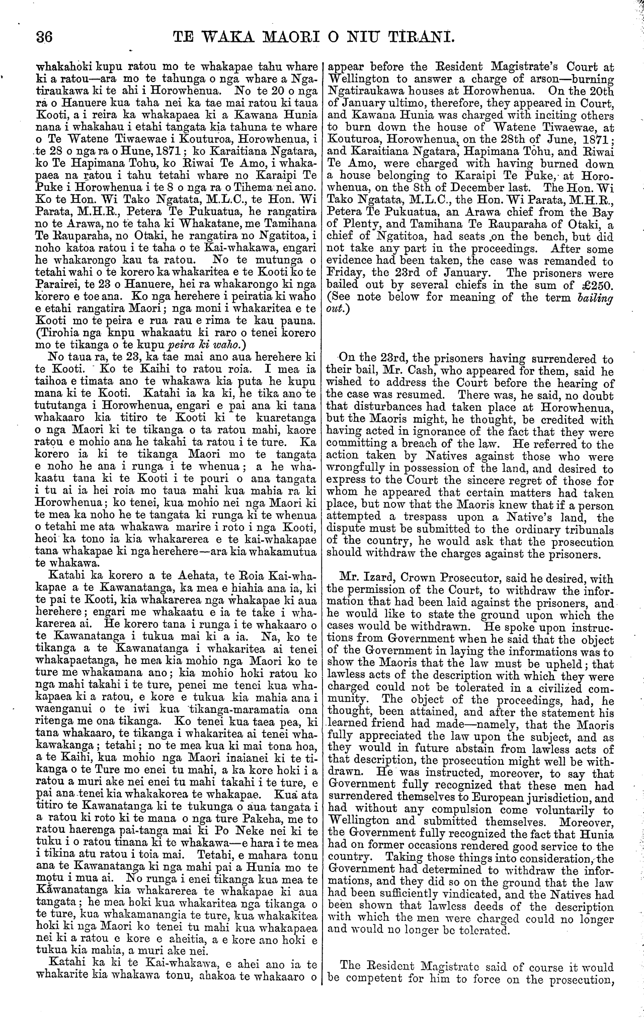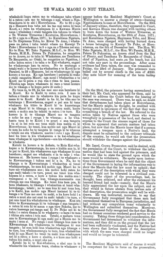 36 TE WAKA MAORI O NIU TIRANI. whakahoki kupu ratou mo te whakapae tahu whare ki a ratou—ara mo te tahunga o nga whare a Nga- tiraukawa ki te ahi i Horowhenua. No te 20 o nga ra o Hanuere kua taha nei ka tae mai ratou ki taua Kooti, a i reira ka whakapaea ki a Kawana Hunia nana i whakahau i etahi tangata kia tahuna te whare o Te Watene Tiwaewae i Kouturoa, Horowhenua, i te 28 o nga ra o Hune, 1871; ko Karaitiana Ngatara, ko Te Hapimana Tohu, ko Riwai Te Amo, i whaka- paea na rato u i tahu tetahi whare no Karaipi Te Puke i Horowhenua i te 8 o nga ra o Tihema nei ano. Ko te Hon. Wi Tako Ngatata, M.L.C., te Hon. Wi Parata, M.H.R., Petera Te Pukuatua, he rangatira no te Arawa, no te taha ki Whakatane, me Tamihana Te Rauparaha, no Otaki, he rangatira no Ngatitoa, i noho katoa ratou i te taha o te Kai-whakawa, engari he whakarongo kau ta ratou. No te mutunga o tetahi wahi o te korero ka whakaritea e te Kooti ko te Parairei, te 23 o Hanuere, hei ra whakarongo ki nga korero e toe ana. Ko nga herehere i peiratia ki waho e etahi rangatira Maori; nga moni i whakaritea e te Kooti mo te peira e rua rau e rima te kau pauna. (Tirohia nga kupu whakaatu ki raro o tenei korero mo te tikanga o te kupu peira ki waho.) No taua ra, te 23, ka tae mai ano aua herehere ki te Kooti. Ko te Kaihi to ratou roia. I mea ia taihoa e timata ano te whakawa kia puta he kupu mana ki te Kooti. Katahi ia ka ki, he tika ano te tututanga i Horowhenua, engari e pai ana ki tana whakaaro kia titiro te Kooti ki te kuaretanga o nga Maori ki te tikanga o ta ratou mahi, kaore ratou e mohio ana he takahi ta ratou i te ture. Ka korero ia ki te tikanga Maori mo te tangata e noho he ana i runga i te whenua; a he wha- kaatu tana ki te Kooti i te pouri o ana tangata i tu ai ia hei roia mo taua mahi kua mahia ra ki Horowhenua; ko tenei, kua mohio nei nga Maori ki te mea ka noho he te tangata ki runga ki te whenua o tetahi me ata whakawa marire i roto i nga Kooti, heoi ka tono ia kia whakarerea e te kai-whakapae tana whakapae ki ngaherehere—ara kia whakamutua te whakawa. Katahi ka korero a te Aehata, te Roia Kai-wha- kapae a te Kawanatanga, ka mea e hiahia ana ia, ki te pai te Kooti, kia whakarerea nga whakapae ki aua herehere; engari me whakaatu e ia te take i wha- karerea ai. He korero tana i runga i te whakaaro o te Kawanatanga i tukua mai ki a ia. Na, ko te tikanga a te Kawanatanga i whakaritea ai tenei whakapaetanga, he mea kia mohio nga Maori ko te ture me whakamana ano; kia mohio hoki ratou ko nga mahi takahi i te ture, penei me tenei kua wha- kapaea ki a ratou, e kore e tukua kia mahia ana i waenganui o te iwi kua tikanga-maramatia ona ritenga me ona tikanga. Ko tenei kua taea pea, ki tana whakaaro, te tikanga i whakaritea ai tenei wha- kawakanga; tetahi; no te mea kua ki mai tona hoa, a te Kaihi, kua mohio nga Maori inaianei ki te ti- kanga o te Ture mo enei tu mahi, a ka kore hoki i a ratou a muri ake nei enei tu mahi takahi i te ture, e pai ana -tenei kia whakakorea te whakapae. Kua ata titiro te Kawanatanga ki te tukunga o aua tangata i a ratou ki roto ki te mana o nga ture Pakeha, me to ratou haerenga pai-tanga mai ki Po Neke nei ki te tuku i o ratou tinana ki to whakawa—e hara i te mea i tikina atu ratou i toia mai. Tetahi, e mahara tonu ana te Kawanatanga ki nga mahi pai a Hunia mo te motu i mua ai. No runga i enei tikanga kua mea te Kawanatanga kia whakarerea te whakapae ki aua tangata; he mea hoki kua whakaritea nga tikanga o te ture, kua whakamanangia te ture, kua whakakitea hoki ki nga Maori ko tenei tu mahi kua whakapaea nei ki a ratou e kore o aheitia, a e kore ano hoki e tukua kia mahia, a muri ake nei. Katahi ka ki te Kai-whakawa, e ahei ano ia te whakarite kia whakawa tonu, ahakoa te whakaaro o appear before the Resident Magistrate's Court at Wellington to answer a charge of arson—burning Ngatiraukawa houses at Horowhenua. On the 20th of January ultimo, therefore, they appeared in Court, and Kawana Hunia was charged with inciting others to burn down the house of Watene Tiwaewae, at Kouturoa, Horowhenua, on the 28th of June, 1871; and Karaitiana Ngatara, Hapimana Tohu, and Riwai Te Amo, were charged with having burned down a house belonging to Karaipi Te Puke,- at Horo- whenua, on the 8th of December last. The Hon. Wi Tako Ngatata, M.L.C., the Hon. Wi Parata, M.H.R., Petera Te Pukuatua, an Arawa chief from the Bay of Plenty, and Tamihana Te Rauparaha of Otaki, a chief of Ngatitoa, had seats on the bench, but did not take any part in the proceedings. After some evidence had been taken, the case was remanded to Friday, the 23rd of January. The prisoners were bailed out by several chiefs in the sum of £250. (See note below for meaning of the term bailing out.) On the 23rd, the prisoners having surrendered to their bail, Mr. Cash, who appeared for them, said he wished to address the Court before the hearing of the case was resumed. There was, he said, no doubt that disturbances had taken place at Horowhenua, but the Maoris might, he thought, be credited with having acted in ignorance of the fact that they were committing a breach of the law. He referred to the action taken by Natives against those who were wrongfully in possession of the land, and desired to express to the Court the sincere regret of those for whom he appeared that certain matters had taken place, but now that the Maoris knew that if a person attempted a trespass upon a Native's land, the dispute must be submitted to the ordinary tribunals of the country, he would ask that the prosecution should withdraw the charges against the prisoners. Mr. Izard, Crown Prosecutor, said he desired, with the permission of the Court, to withdraw the infor- mation that had been laid against the prisoners, and he would like to state the ground upon which the cases would be withdrawn. He spoke upon instruc- tions from Government when he said that the object of the Government in laying the informations was to show the Maoris that the law must be upheld; that lawless a