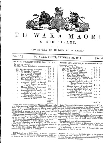 Te Waka Maori o Niu Tirani 1871-1877: Volume 10, Number 4. 24 February 1874 |