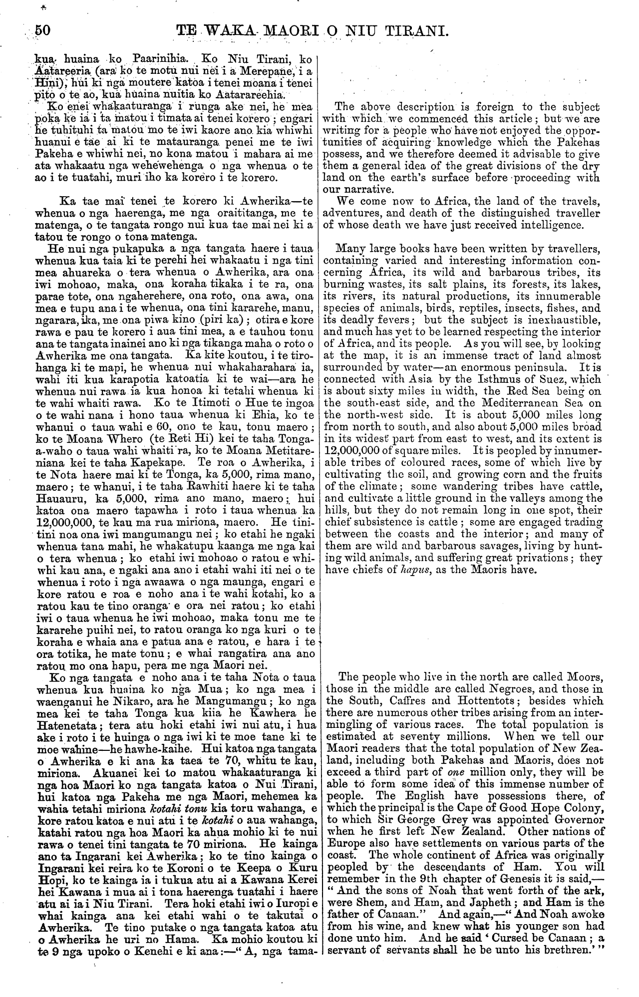 60 TE WAKA MAORI O NIU TIRANI. kua huaina ko Paarinihia. . Ko Niu Tirani, ko Aatareeria (ara ko te motu nui nei i a Merepane, i a Hini); hui ki nga moutere katoa i tenei moana i tenei pito o te ao, kua huaina nuitia ko Aatarareehia. Ko enei whakaaturanga i runga ake nei, he mea poka ke ia i ta matou i timata ai tenei korero; engari he tuhituhi ta matou mo te iwi kaore ano. kia whiwhi huanui e tae ai ki te matauranga penei me te iwi Pakeha e whiwhi nei, no kona matou i mahara ai me ata whakaatu nga wehewehenga o nga whenua o te ao i te tuatahi, muri iho ka korero i te korero. Ka tae mai tenei te korero ki Awherika—te whenua o nga haerenga, me nga oraititanga, me te matenga, o te tangata rongo nui kua tae mai nei ki a tatou te rongo o tona matenga. He nui nga pukapuka a nga tangata haere i taua whenua kua taia ki te perehi hei whakaatu i nga tini mea ahuareka o tera whenua o Awherika, ara ona iwi mohoao, maka, ona koraha tikaka i te ra, ona parae tote, ona ngaherehere, ona roto, ona awa, ona mea e tupu ana i te whenua, ona tini kararehe, manu, ngarara, i ka, me ona piwa kino (piri ka); otira e kore rawa e pau te korero i aua tini mea, a e tauhou tonu ana te tangata inainei ano ki nga tikanga maha o roto o Awherika me ona tangata. Ka kite koutou, i te tiro- hanga ki te mapi, he whenua nui whakaharahara ia, wahi iti kua karapotia katoatia ki te wai—ara he whenua nui rawa ia kua honoa ki tetahi whenua ki te wahi whaiti rawa. Ko te I timoti o Hue te ingoa o te wahi nana i hono taua whenua ki Ehia, ko te whanui o taua wahi e 60, ono te kau, tonu maero; ko te Moana Whero (te Reti Hi) kei te taha Tonga- a-waho o taua wahi whaiti ra, ko te Moana Metitare- mana kei te taha Kapekape. Te roa o Awherika, i te Nota haere mai ki te Tonga, ka 5, 000, rima mano, maero; te whanui, i te taha Rawhiti haere ki te taha Hauauru, ka 5, 000, rima ano mano, maero;. hui katoa ona maero tapawha i roto i taua whenua ka 12, 000, 000, te kau ma rua miriona, maero. He tini- tini noa ona iwi mangumangu nei; ko etahi he ngaki whenua tana mahi, he whakatupu kaanga me nga kai o tera whenua; ko etahi iwi mohoao o ratou e whi- whi kau ana, e ngaki ana ano i etahi wahi iti nei o te whenua i roto i nga awaawa o nga maunga, engari e kore ratou e roa e noho ana i te wahi kotahi, ko a ratou kau te tino oranga e ora nei ratou; ko etahi iwi o taua whenua he iwi mohoao, maka tonu me te kararehe puihi nei, to ratou oranga ko nga kuri o te koraha e whaia ana e patua ana e ratou, e hara i te ora totika, he mate tonu; e whai rangatira ana ano ratou mo ona hapu, pera me nga Maori nei. Ko nga tangata e noho ana i te taha Nota o taua whenua kua huaina ko nga Mua; ko nga mea i waenganui he Nikaro, ara he Mangumangu; ko nga mea kei te taha Tonga kua kiia he Kawhera he Hatenetata; tera atu hoki etahi iwi nui atu, i hua ake i roto i te huinga o nga iwi ki te moe tane ki te moe wahine—he hawhe-kaihe. Hui katoa nga tangata o Awherika e ki ana ka taea te 70, whitu te kau, miriona. Akuanei kei to matou whakaaturanga ki nga hoa Maori ko nga tangata katoa o Nui Tirani, hui katoa nga Pakeha me nga Maori, mehemea ka wahia tetahi miriona kotahi tonu kia toru wahanga, e kore ratou katoa e nui atu i te kotahi o aua wahanga, katahi ratou nga hoa Maori ka ahua mohio ki te nui rawa o tenei tini tangata te 70 miriona. He kainga ano ta Ingarani kei Awherika; ko te tino kainga o Ingarani kei reira ko te Koroni o te Keepa o Kuru Hopi, ko te kainga ia i tukua atu ai a Kawana Kerei hei Kawana i mua ai i tona haerenga tuatahi i haere atu ai ia i Niu Tirani. Tera hoki etahi iwi o luropi e whai kainga ana kei etahi wahi o te takutai o Awherika. Te tino putake o nga tangata katoa atu o Awherika he uri no Hama. Ka mohio koutou ki te 9 nga upoko o Kenehi e ki ana:—" A, nga tama- The above description is foreign to the subject with which we commenced this article; but we are writing for a people who have not enjoyed the oppor- tunities of acquiring knowledge which the Pakehas possess, and we therefore deemed it advisable to give them a general idea of the great divisions of the dry land on the earth's surface before proceeding with our narrative. We come now to Africa, the land of the travels , adventures, and death of the distinguished traveller of whose death we have just received intelligence. Many large books have been written by travellers, containing varied and interesting information con- cerning Africa, its wild and barbarous tribes, its burning wastes, its salt plains, its forests, its lakes, its rivers, its natural productions, its innumerable species of animals, birds, reptiles, insects, fishes, and its deadly fevers; but the subject is inexhaustible, and much has yet to be learned respecting the interior of Africa, and its people. As you will see, by looking at the map, it is an immense tract of land almost surrounded by water—an enormous peninsula. It is connected with Asia by the Isthmus of Suez, which is about sixty miles in width, the Red Sea being on the south-cast side, and the Mediterranean Sea on the north-west side. It is about 5, 000 miles long from north to south, and also about 5, 000 miles broad in its widest part from east to west, and its extent is 12, 000, 000 of square miles. It is peopled by innumer- able tribes of coloured races, some of which live by cultivating the soil, and growing corn and the fruits of the climate; some wandering tribes have cattle, and cultivate a little ground in the valleys among the hills, but they do not remain long in one spot, their chief subsistence is cattle; some are engaged trading between the coasts and the interior; and many of them are wild and barbarous savages, living by hunt- ing wild animals, and suffering great privations; they have chiefs of hapus, as the Maoris have. The people who live in the north are called Moors, those in the middle are called Negroes, and those in the South, Caffres and Hottentots; besides which there are numerous other tribes arising from an inter- mingling of vario