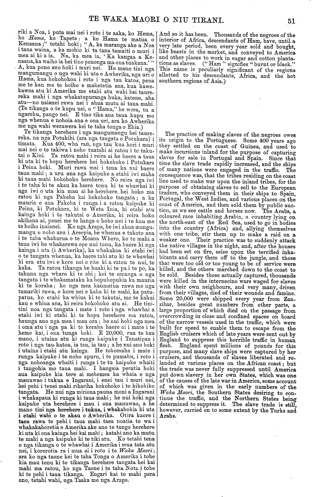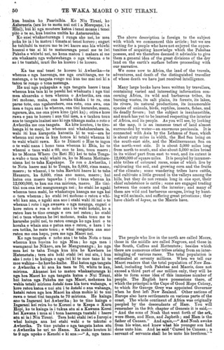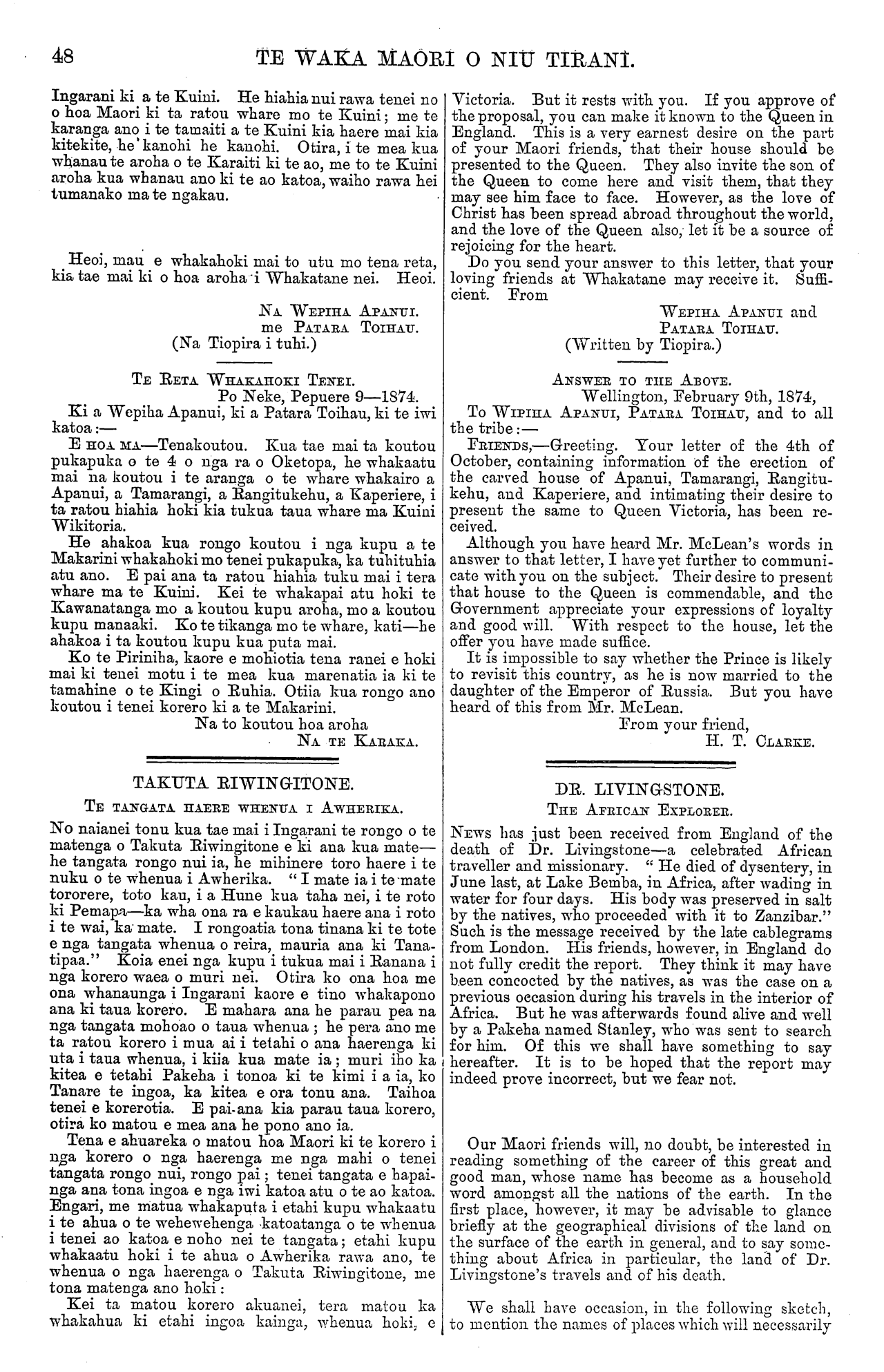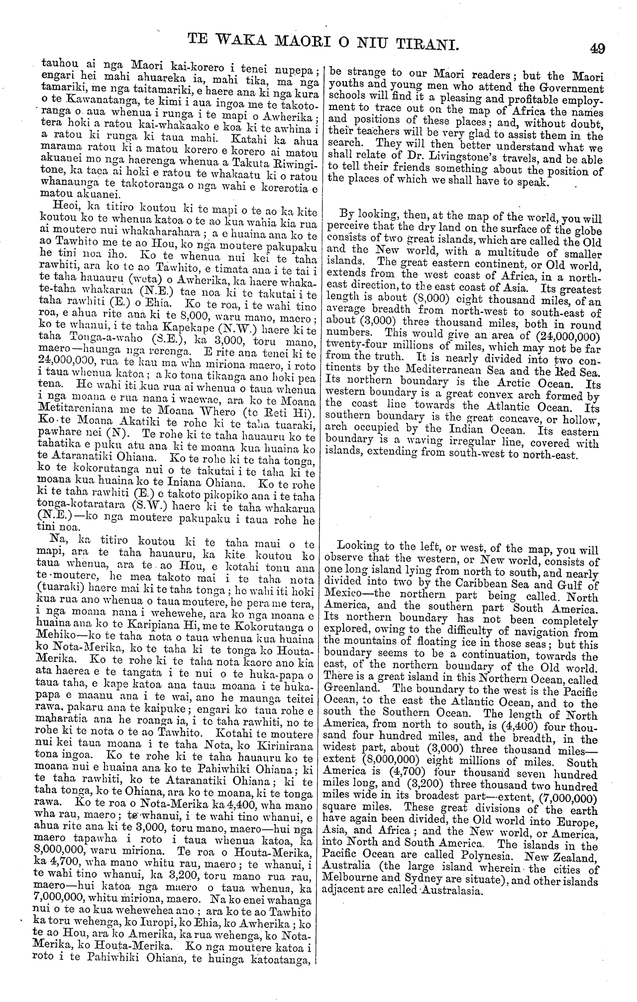 TE WAKA MAORI O NIU TIRANI. Ingarani ki a te Kuini. He hiahia nui rawa tenei no o hoa Maori ki ta ratou whare mo te Kuini; me te karanga ano i te tamaiti a te Kuini kia haere mai kia kitekite, he kanohi he kanohi. Otira, i te mea kua whanau te aroha o te Karaiti ki te ao, me to te Kuini aroha kua whanau ano ki te ao katoa, waiho rawa hei tumanako ma te ngakau. Heoi, mau e whakahoki mai to utu mo tena reta, kia, tae mai ki o hoa aroha i Whakatane nei. Heoi. NA WEPIHA. APANUI. me PATARA TOIHAU. (Na Tiopira i tuhi.) TE RETA. WHAKAHOKI TENEI. Po Neke, Pepuere 9—1874. Ki a Wepiha Apanui, ki a Patara Toihau, ki te iwi katoa:— E HOA MA—Tenakoutou. Kua tae mai ta koutou pukapuka o te 4 o nga ra o Oketopa, he whakaatu mai na koutou i te aranga o te whare whakairo a Apanui, a Tamarangi, a Rangitukehu, a Kaperiere, i ta ratou hiahia hoki kia tukua taua whare ma Kuini Wikitoria. He ahakoa kua rongo koutou i nga kupu a te Makarini whakahoki mo tenei pukapuka, ka tuhituhia atu ano. E pai ana ta ratou hiahia tuku mai i tera whare ma te Kuini. Kei te whakapai atu hoki te Kawanatanga mo a koutou kupu aroha, mo a koutou kupu manaaki. Ko te tikanga mo te whare, kati—he ahakoa i ta koutou kupu kua puta mai. Ko te Piriniha, kaore e mohiotia tena ranei e hoki mai ki tenei motu i te mea kua marenatia ia ki te tamahine o te Kingi o Ruhia. Otiia kua rongo ano koutou i tenei korero ki a te Makarini. Na to koutou hoa aroha NA TE KARAKA. TAKUTA RIWINGITONE. TE TANGATA HAERE WHENUA I AWHERIKA. No naianei tonu kua tae mai i Ingarani te rongo o te matenga o Takuta Riwingitone e ki ana kua mate— he tangata rongo nui ia, he mihinere toro haere i te nuku o te whenua i Awherika. " I mate ia i te mate tororere, toto kau, i a Hune kua taha nei, i te roto ki Pemapa —ka wha ona ra e kaukau haere ana i roto i te wai, ka" mate. I rongoatia tona tinana ki te tote e nga tangata whenua o reira, mauria ana ki Tana- tipaa." Koia enei nga kupu i tukua mai i Ranana i nga korero waea o muri nei. Otira ko ona hoa me ona whanaunga i Ingarani kaore e tino whakapono ana ki taua korero. E mahara ana he parau pea na nga tangata mohoao o taua whenua; he pera ano me ta ratou korero i mua ai i tetahi o ana haerenga ki uta i taua whenua, i kiia kua mate ia; muri iho ka kitea e tetahi Pakeha i tonoa ki te kimi i a ia, ko Tanare te ingoa, ka kitea e ora tonu ana. Taihoa tenei e korerotia. E pai ana kia parau taua korero, otira ko matou e mea ana he pono ano ia. Tena e ahuareka o matou hoa Maori ki te korero i nga korero o nga haerenga me nga mahi o tenei tangata rongo nui, rongo pai; tenei tangata e hapai- nga ana tona ingoa e nga iwi katoa atu o te ao katoa. Engari, me matua whakaputa i etahi kupu whakaatu i te ahua o te wehewehenga katoatanga o te whenua i tenei ao katoa e noho nei te tangata; etahi kupu whakaatu hoki i te ahua o Awherika rawa ano, te whenua o nga haerenga o Takuta Riwingitone, me tona matenga ano hoki: Kei ta matou korero akuanei, tera matou ka whakahua ki etahi ingoa kainga, whenua hoki, e Victoria. But it rests with you. If you approve of the proposal, you can make it known to the Queen in England. This is a very earnest desire on the part of your Maori friends, that their house should be presented to the Queen. They also invite the son of the Queen to come here and visit them, that they may see him face to face. However, as the love of Christ has been spread abroad throughout the world, and the love of the Queen also, let it be a source of rejoicing for the heart. Do you send your answer to this letter, that your loving friends at Whakatane may receive it. Suffi- cient. From WEPIHA. APANUI and PATARA TOIHAU. (Written by Tiopira.) ANSWER TO THE ABOVE. Wellington, February 9th, 1874, To WIPIHA APANUI, PATARA. TOIHAU, and to all the tribe:— FRIENDS,—Greeting. Your letter of the 4th of October, containing information of the erection of the carved house of Apanui, Tamarangi, Rangitu- kehu, and Kaperiere, and intimating their desire to present the same to Queen Victoria, has been re- ceived. Although you have heard Mr. McLean's words in answer to that letter, I have yet further to communi- cate with you on the subject. Their desire to present that house to the Queen is commendable, and the Government appreciate your expressions of loyalty and good will. With respect to the house, let the offer you have made suffice. It is impossible to say whether the Prince is likely to revisit this country, as he is now married to the daughter of the Emperor of Russia. But you have heard of this from Mr. McLean. From your friend, H. T. CLARKE. DR. LIVINGSTONE. THE AFRICAN EXPLORER. NEWS has just been received from England of the death of Dr. Livingstone—a celebrated African traveller and missionary. " He died of dysentery, in June last, at Lake Bemba, in Africa, after wading in water for four days. His body was preserved in salt by the natives, who proceeded with it to Zanzibar." Such is the message received by the late cablegrams from London. His friends, however, in England do not fully credit the report. They think it may have been concocted by the natives, as was the case on a previous occasion during his travels in the interior of Africa. But he was afterwards found alive and well by a Pakeha named Stanley, who was sent to search for him. Of this we shall have something to say hereafter. It is to be hoped that the report may indeed prove incorrect, but we fear not. Our Maori friends will, no doubt, be interested in reading something of the career of this great and good man, whose name has become as a household word amongst all the nations of the earth. In the first place, however, it may be advisable to glance briefly at the geographical divisions of the land on the surface of the earth in general, and to say some- thing about Africa in particular, the land of Dr. Livingstone's travels and of his death. We shall have occasion, in the following sketch, to mention the names of places which will neccssarily
