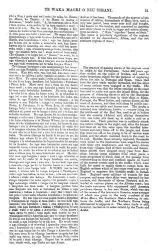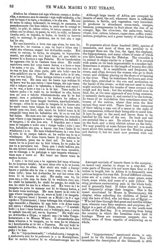 52 TE WAKA MAORI O NIU TIRANI. Ahakoa he whenua nui nga whenua onepu o Awhe- rika, e momona ana te oneone i nga wahi makuku, a he nui te tupu o te taru, o te rakau, o te aha atu. He nui ki reira te rakau kokonaiti, te orangi, te panaana, te pamekaranete (he hua rakau ia, pera me te orangi te rahi), te piki, te rakau oriwa, te rakau paama (me te nikau nei te ahua), te parei, te witi, te raihi, te katene (muka nei), te tupeka, te huka, te kawhi (e inumia nei), te merengi, te paukena, me te tini atu o nga kai ke atu. Ko ona kararehe, e toru rau nga ahua, he mea ke, he mea ke; he ruarua o aua tu kuri e kitea ana i etahi atu whenua, engari kei Awherika anake. Kei reira te raiona; te taika, te erepata, te hipopotee- maehi, me etahi atu tini kuri kua oti pea etahi te korero ki a koutou e nga Pakeha. Ko te karakotaira he ngarara rite ki te tuatara tona ahua. He unahi matotoru rawa kei tona tuara katoa, a e kore e taea i te mata o te pu. He mea ano ka tae tona roa ki te rua te kau ma rima putu, rahi atu hoki—ara ka wha pakihiwi me te hawhe. He mea noho ia ki uta, ki ro te wai hoki. Tona kainga tuturu e noho ai kei nga awa wai. He mea ano ka haere nga wahine ki te kawe wai ka pau ratou i taua hanga, me nga tama- riki e takaro ana i te tahataha, e kaukau ana ranei i ro te wai, e kore e toe i a ia te kai. Tana mahi, he takoto puku i te wahi ra, te korikori te aha, haora noa po noa e takoto whakamomoka ana ki te kai mana; tera e pohehetia e te tauhou he rakau e takoto ana me tona tangai taratara, mawhakiwhaki, ki runga; otira ki te pohe te tangata ki te haere atu he mate tonu tana hanga ka tata atu ki tena taha tetahi mea ora, kuri, aha ranei, ka kokiri tonu ia ki runga ki taua mea ka kahakina atu ki ro te wai hei kai mana. He mea ano kei nga waipuke ka tomokia nga whare o nga tangata e taua ngarara, ka kahaki i te tangata, i te aha noa atu. I hopukia ano e taua mea te tangata e noho ana i runga waka i roto i ona hoa, kahakina atu ana, a kaore ona hoa i kaha ki te whakaora i a ia. He mea whakawhanau ia i ona hua ki roto ki te onepu takoto ai, ka waiho ma te ra e whakapao. Ko tona tuara haere ki tona whiore he mea taratara, pena me te kani nei. Te kara o te tuara he tu a pouri me te kiri totara, ko te puku he ma tu a paruparu nei. Tena pea i etahi takiwa atu ka ata korero matou i etahi korero mo taua nanakia, me te tikanga o te patunga a nga tangata whenua i taua mea e mate ai. Ko tenei me haere tonu ta matou korero. I roto -i te tini noa o te ngarara kei taua whenua ko te kopiona tetahi; he mea ahua rite ia ki te koura wai nei ano te ahua. Kei etahi atu wahi o luropi kaore e pahika ake te roa o taua mea i te wha i te rima inihi; tena kei Awherika he nui kei reira rite tonu ki te koura te rahi. He maha ona tu, he mea ano, e rite ana te kara ki te waikura rino nei, to etahi he kakariki, ko etahi he pango, ko etahi he ma, ko etahi he ma tu a whero nei. Ka wero ia i te tangata ka puta te mamae nui ki te tinana katoa, a he mate tona mutunga. He mea haere ia ki roto ki nga whare tangata noho ai, wero ai hoki i te tangata. Ko te ngarara tenei i korero ra a Mohi i te 8 o nga upoko o Tiuteronomi, i tona tohenga kia whakarongo nga tamariki o Iharaira ki nga ture o te Atua nana nei ratou i whakaputa mai i Ihipa, ara;—" I arataki hoki i a koe i tena koraha nui e wehingia ana, i reira te nakahi tua-ahi nei, me te kopiona." He wahi ano no Awherika a Ihipa; e takoto ana i te taha Tonga- kotaratara o te Moana Whero. E ahuarekatia ana taua whenua e te tangata, no te mea ko te whenua ia i hereheretia ai te iwi o Iharaira. He nui hoki te nakahi kei Awherika; ko etahi e kaha ana ki te horo puku i te kau. Ko te " hipopoteemaehi," i whakahuatia i runga ra, e maharatia ana ko te pehemoto ia o te Karaipiture. Kai te mohio koutou ki te whakaaturanga mo te Although large tracts of Africa are occupied by deserts of sand, the soil, wherever there is sufficient moisture, is fertile, and vegetation very luxuriant. It produces in abundance cocoa-trees, oranges, bananas, pomegrauates (a fruit about the size of an orange), figs, the olive-tree, the palm-tree, barley, wheat, rice, cotton, tobacco, sugar-cane, coffee, water- melons, pumpkins, and a great variety of other fruits. It possesses about three hundred (300), species of mammalia, and most of them are peculiar to it. Amongst them are the lion, the tiger, the elephant, the hippopotamus, and many others of some of which you have heard from the Pakehas. The crocodile is an animal in shape similar to a lizard. It is covered with scales on its back impenetrable to a musket ball. Sometimes it attains to the length of twenty-five (25) feet or more. It is amphibious and frequents the rivers, and often devours the women who go to fetch water, and children playing on the shore or swimming in the river. They lie sometimes for hours, and even whole days, stretched in the sun and motionless on the banks of the rivers; so that one not used to them might mistake them for trunks of trees covered with rough and dry bark; but the mistake would soon be fatal, for, at the near approach of any living creature, it instantly darts upon it, and carries it to the bottom. In times of an inundation they sometimes enter the houses of the natives, where they seize the first animal they meet with. There have been instances of their taking a man out of a canoe in the sight of his companions, without their being able to assist him. It lays its eggs in the sand, and leaves them to be hatched by the heat of the sun. Its back and tail are serrated like a saw. Ita colour is a dark brown on the back, and a dirty whitish colour on the belly. We may possibly at some future time tell you much more about this animal, and how the Natives attack and destroy it, but we must now proceed with our history. Amongst myriads of insects there is the scorpion; an insect very similar in shape to a cray-fish. In some parts of Europe it is not more than four or five inches in length, but in Africa it is frequently seen quite a