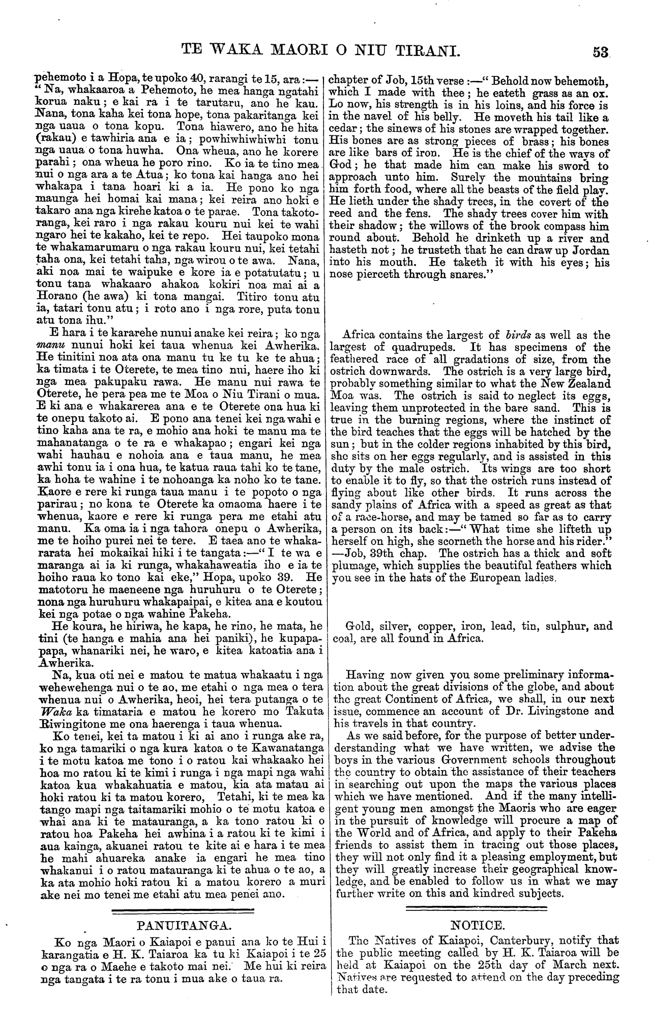 TE WAKA MAORI O NIU TIRANI. 53 pehemoto i a Hopa, te upoko 40, rarangi te 15, ara:— " Na, whakaaroa a Pehemoto, he mea hanga ngatahi korua naku; e kai ra i te tarutaru, ano he kau. Nana, tona kaha kei tona hope, tona pakaritanga kei nga uaua o tona kopu. Tona hiawero, ano he hita (rakau) e tawhiria ana e ia; powhiwhiwhiwhi tonu nga uaua o tona huwha. Ona wheua, ano he korero parahi; ona wheua he poro rino. Ko ia te tino mea nui o nga ara a te Atua; ko tona kai hanga ano hei whakapa i tana hoari ki a ia. He pono ko nga maunga hei homai kai mana; kei reira ano hoki e takaro ana nga kirehe katoa o te parae. Tona takoto- ranga, kei raro i nga rakau kouru nui kei te wahi ngaro hei te kakaho, kei te repo. Hei taupoko mona te whakamarumaru o nga rakau kouru nui, kei tetahi taha ona, kei tetahi taha, nga wirou o te awa. Nana, aki noa mai te waipuke e kore ia e potatutatu; u tonu tana whakaaro ahakoa kokiri noa mai ai a Horano (he awa) ki tona mangai. Titiro tonu atu ia, tatari tonu atu; i roto ano i nga rore, puta tonu atu tona ihu." E hara i te kararehe nunui anake kei reira; ko nga manu nunui hoki kei taua whenua kei Awherika. He tinitini noa ata ona manu tu ke tu ke te ahua; ka timata i te Oterete, te mea tino nui, haere iho ki nga mea pakupaku rawa. He manu nui rawa te Oterete, he pera pea me te Moa o Niu Tirani o mua. E ki ana e whakarerea ana e te Oterete ona hua ki te onepu takoto ai. E pono ana tenei kei nga wahi e tino kaha ana te ra, e mohio ana hoki te manu ma te mahanatanga o te ra e whakapao; engari kei nga wahi hauhau e nohoia ana e taua manu, he mea awhi tonu ia i ona hua, te katua raua tahi ko te tane, ka hoha te wahine i te nohoanga ka noho ko te tane. Kaore e rere ki runga taua manu i te popoto o nga parirau; no kona te Oterete ka omaoma haere i te whenua, kaore e rere ki runga pera me etahi atu manu. Ka oma ia i nga tahora onepu o Awherika, me te hoiho purei nei te tere. E taea ano te whaka- rarata hei mokaikai hiki i te tangata:—" I te wa e maranga ai ia ki runga, whakahaweatia iho e ia te hoiho raua ko tono kai eke," Hopa, upoko 39. He matotoru he maeneene nga huruhuru o te Oterete; nona nga huruhuru whakapaipai, e kitea ana e koutou kei nga potae o nga wahine Pakeha. He koura, he hiriwa, he kapa, he rino, he mata, he tini (te hanga e mahia ana hei paniki), he kupapa- papa, whanariki nei, he waro, e kitea katoatia ana i Awherika. Na, kua oti nei e matou te matua whakaatu i nga wehewehenga nui o te ao, me etahi o nga mea o tera whenua nui o Awherika, heoi, hei tera putanga o te Waka ka timataria e matou he korero mo Takuta Riwingitone me ona haerenga i taua whenua. Ko tenei, kei ta matou i ki ai ano i runga ake ra, ko nga tamariki o nga kura katoa o te Kawanatanga i te motu katoa me tono i o ratou kai whakaako hei hoa mo ratou ki te kimi i runga i nga mapi nga wahi katoa kua whakahuatia e matou, kia ata matau ai hoki ratou ki ta matou korero, Tetahi, ki te mea ka tango mapi nga taitamariki mohio o te motu katoa e whai ana ki te matauranga, a ka tono ratou ki o ratou hoa Pakeha hei awhina i a ratou ki te kimi i aua kainga, akuanei ratou te kite ai e hara i te mea he mahi ahuareka anake ia engari he mea tino whakanui i o ratou matauranga ki te ahua o te ao, a ka ata mohio hoki ra tou ki a matou korero a muri ake nei mo tenei me etahi atu mea penei ano. PANUITANGA. Ko nga Maori o Kaiapoi e panui ana ko te Hui i karangatia e H. K. Taiaroa ka tu ki Kaiapoi i te 25 o nga ra o Maehe e takoto mai nei. Me hui ki reira nga tangata i te ra tonu i mua ake o taua ra. chapter of Job, 15th verse:—" Behold now behemoth, which I made with thee; he eateth grass as an ox. Lo now, his strength is in his loins, and his force is in the navel of his belly. He moveth, his tail like a cedar; the sinews of his stones are wrapped together. His bones are as strong pieces of brass; his bones are like bars of iron. He is the chief of the ways of God; he that made him can make his sword to approach unto him. Surely the mountains bring him forth food, where all the beasts of the field play. He lieth under the shady trees, in the covert of the reed and the fens. The shady trees cover him with their shadow; the willows of the brook compass him round about. Behold he drinketh up a river and hasteth not; he trusteth that he can draw up Jordan into his mouth. He taketh it with his eyes; his nose pierceth through snares." Africa contains the largest of birds as well as the largest of quadrupeds. It has specimens of the feathered race of all gradations of size, from the ostrich downwards. The ostrich is a very large bird, probably something similar to what the New Zealand Moa was. The ostrich is said to neglect its eggs, leaving them unprotected in the bare sand. This is true in the burning regions, where the instinct of the bird teaches that the eggs will be hatched by the sun; but in the colder regions inhabited by this bird, she sits on her eggs regularly, and is assisted in this duty by the male ostrich. Its wings are too short to enable it to fly, so that the ostrich runs instead of flying about like other birds. It runs across the sandy plains of Africa with a speed as great as that of a race-horse, and may be tamed so far as to carry a person on its back:—" What time she lifteth up herself on high, she scorneth the horse and his rider." —Job, 39th chap. The ostrich has a thick and soft plumage, which supplies the beautiful feathers which you see in the hats of the European ladies Gold, silver, copper, iron, lead, tin, sulphur, and coal, are all found in Africa. Having now given you some preliminary informa- tion about the great divisions of the globe, and about the great Continent of Africa, we shall, in our next issue, commence an account of Dr. Livingstone and his travels in that country. As we said before, for the purpose of better under- derstanding what we have written, we advise the boys in the various Government schools throughout the country to obtain the assistance of their teachers in se