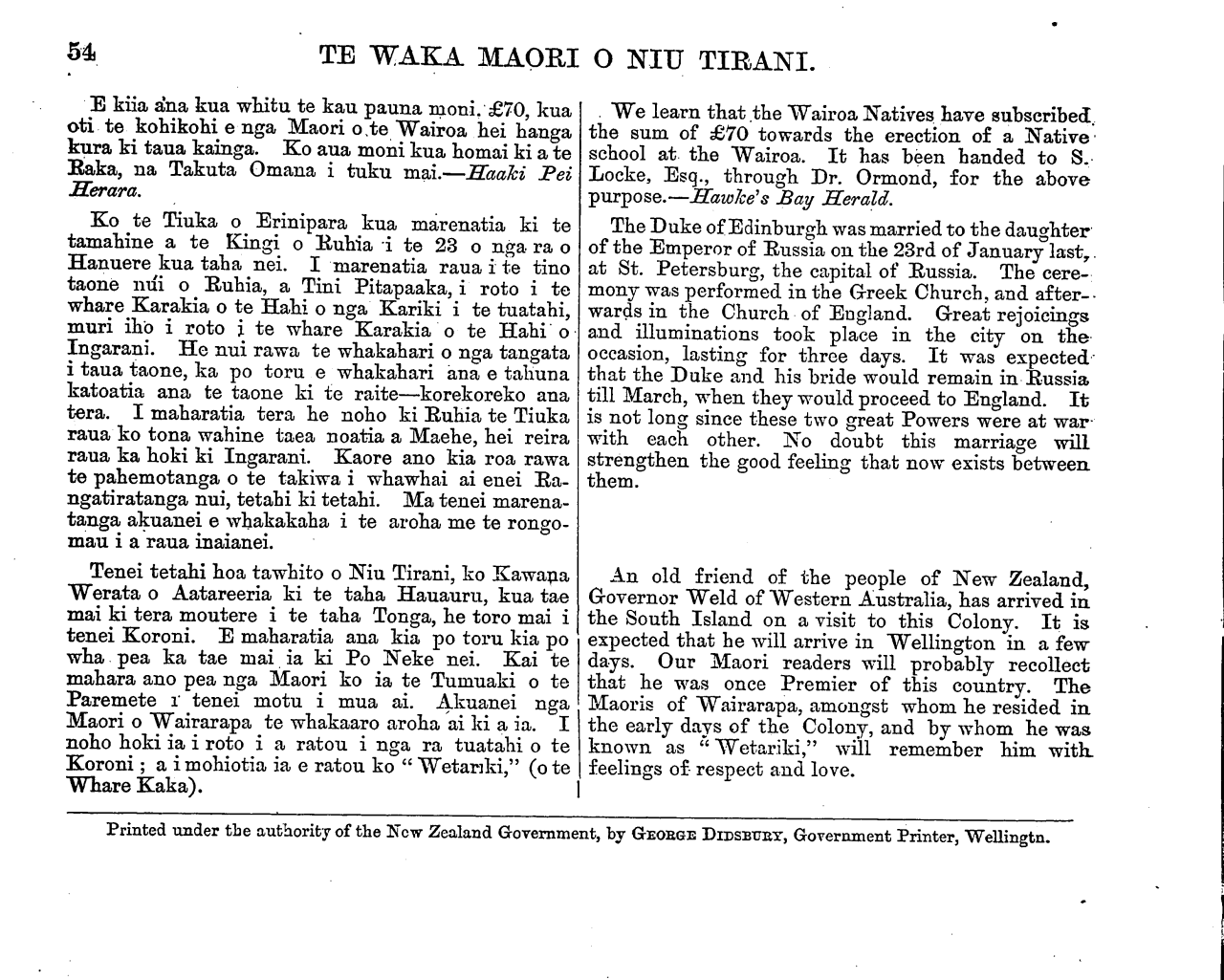 TE WAKA MAORI O NIU TIRANI. E kiia ana kua whitu te kau pauna moni. £70, kua oti te kohikohi e nga Maori o, te Wairoa hei hanga i kura ki taua kainga. Ko aua moni kua homai ki a te Raka, na Takuta Omana i tuku mai.—Haaki Pei Herara. Ko te Tiuka o Erinipara kua marenatia ki te tamahine a te Kingi o Ruhia i te 23 o nga. ra o Hanuere kua taha nei. I marenatia raua i te tino taone nui o Ruhia, a Tini Pitapaaka, i roto i te whare Karakia o te Hahi o nga Kariki i te tuatahi, muri iho i roto i te whare Karakia o te Hahi o Ingarani. He nui rawa te whakahari o nga tangata i taua taone, ka po toru e whakahari ana e tahuna katoatia ana te taone ki te raite—korekoreko ana tera. I maharatia tera he noho ki Ruhia te Tiuka raua ko tona wahine taea noatia a Maehe, hei reira raua ka hoki ki Ingarani. Kaore ano kia roa rawa te pahemotanga o te takiwa i whawhai ai enei Ra- ngatiratanga nui, tetahi ki tetahi. Ma tenei marena- tanga akuanei e whakakaha i te aroha me te rongo- mau i a raua inaianei. Tenei tetahi hoa tawhito o Niu Tirani, ko Kawana Werata o Aatareeria ki te taha Hauauru, kua tae mai ki tera moutere i te taha Tonga, he toro mai i tenei Koroni. E maharatia ana kia po toru kia po wha pea ka tae mai ia ki Po Neke nei. Kai te mahara ano pea nga Maori ko ia te Tumuaki o te Paremete i tenei motu i mua ai. Akuanei nga Maori o Wairarapa te whakaaro aroha ai ki a ia. I noho hoki ia i roto i a ratou i nga ra tuatahi o te Koroni; a i mohiotia ia e ratou ko " Wetariki," (o te Whare Kaka). We learn that the Wairoa Natives have subscribed the sum of £70 to wards the erection of a Native school at the Wairoa. It has been handed to S. Locke, Esq., through Dr. Ormond, for the above purpose.—Hawke's Bay Herald. The Duke of Edinburgh was married to the daughter of the Emperor of Russia on the 23rd of January lasty. at St. Petersburg, the capital of Russia. The cere- mony was performed in the Greek Church, and after-- wards in the Church of England. Great rejoicings, and illuminations took place in the city on the occasion, lasting for three days. It was expected that the Duke and his bride would remain in Russia till March, when they would proceed to England. It is not long since these two great Powers were at war with each other. No doubt this marriage will strengthen the good feeling that now exists between. them. An old friend of the people of New Zealand, Governor Weld of Western Australia, has arrived in the South Island on a visit to this Colony. It is expected that he will arrive in Wellington in a few days. Our Maori readers will probably recollect that he was once Premier of this country. The Maoris of Wairarapa, amongst whom he resided in the early days of the Colony, and by whom he was known as " Wetariki," will remember him with feelings of- respect and love. Printed under the authority of the New Zealand Government, by GEORGE DlDSBURY, Government Printer, Wellington.