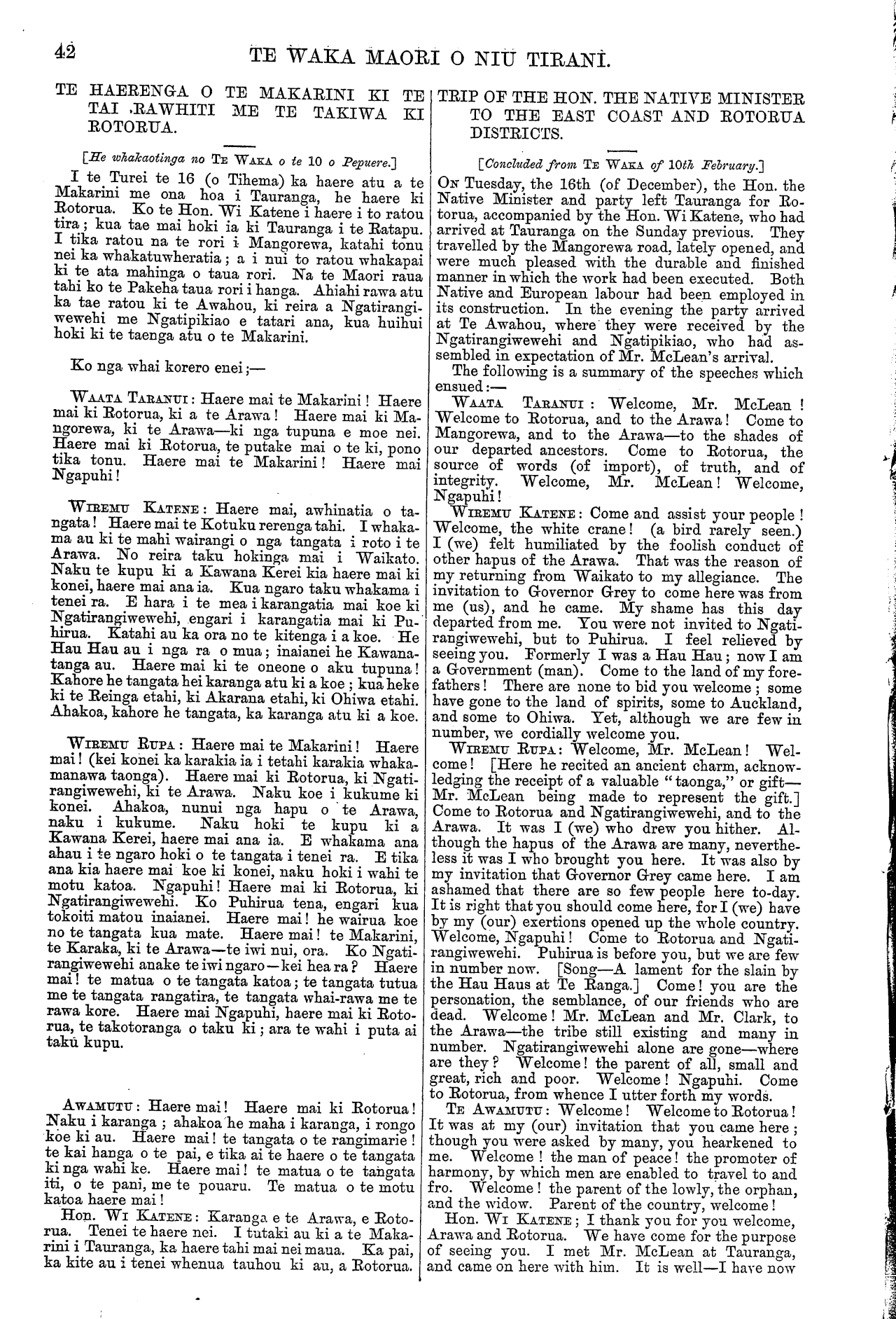 TE WAKA MAORI O NIU TIRANI Kapua, ki te mahinga o enei iwi. Haere mai ki Rotorua, ko te taiepa tenei o nga iwi—ko to taiepa. Haere mai ki te whakawatea i te kino. TE AMOHAU: Haere mai, te Minita o te Kawana- tanga! Haere mai, kia kite koe i te whenua. Haere mai, whakaotia to pai, te kino. Homai te aroha. Oku whanaunga, oku hoa korero, haere mai. Haere mai te maru o te Kuini i whakapuakina nei ki Kohi- marama. Haere mai! te hoa o nga tangata kua mate. Nau te ki kia kotahi tatou i raro i te ture kotahi. • TE WARU: Haere mai, te Makarini! E pai ana au ki te tangi, ki te mihi, atu ki a koe. Nau nei au i whakaora. Kahore he korero; he pai kau, he kite kau, kahore he huanga korero. He tiaki tonu taku i nga mea e ora ai te tangata. TE WAI ATUA.: Haere mai! ki to whakatuturu i te rangimarietanga. Na to putanga mai ki konei i mahea atu ai nga kapua, a e whiti nei ano te ra inaianei. ROPATA KOROKAI: Haere mai! oku hoa Pakeha o era rangi! Haere mai ki Rotorua, te puna o te ki o te Arawa, o te korero. Kua tomo koe ki nga whare o tena tangata o tena tangata, kua kite koe i te pito o te korero o tena tangata; ahakoa ki te ho au, ko koe e tika. Haeremai! tepuna o nga ki o to tangata nui, te tangata iti, te pouaru, me te rawakore. TE MAKARINI: Ka pai to karanga mai, e te Arawa. I haere mai au i runga i to hiahia -nui kia kite au i to waka. I piri pono koutou ki te Kawana tuatahi, te tuarua, te tuatoru, me te tuawha, atu tonu koutou ki te pai. Kai te mahara tonu au ki nga kupu pai i Kohimarama a o koutou rangatira, a te Amohau me Pekamu. I whakaotia i reira te kawenata a te Ka- wanatanga raua ko te Arawa, a kaore ano hoki kia wahia i muri nei. Te tikanga o taku haere mai inaianei he whakahou naku i nga kupu i hoatu ki o koutou kaumatua kua mate atu; tetahi, kia titiro au ki te waka o te Arawa, kia hangaia tonutia kia ora tonu. Kaore pea koutou e ata mohio ana ki te tikanga i roa ai au ki Tauranga; engari maku ano e whakamarama. Tena tetahi tautohetohe tawhito na Ngatiraukawa raua ko Muaupoko mo to take ki tetahi kainga, ko Horowhenua to ingoa. Ko taua raruraru kua whakahoutia i naianei i runga i to mahi pohehe a Kawana Hunia. Nana i whakahau ki a Muaupoko kia tahuna nga whare o Ngatiraukawa, a tahuna ana, hutia aua hoki e ratou etahi o nga kai a Ngatiraukawa. Ka utua ano hoki e Ngatiraukawa taua mahi ki te kino ano. I noho atu au ki Tauranga kia tata au ki te waea, kia tae atu he korero maku ki nga rangatira o aua iwi e rua ra, kia kore ai te kino. Ko te korero kua tae mai ki au i muri nei e mea ana kaore he tuaratanga mo taua whanoke, a Kawana Hunia. He hui tenei hei mihi hei tangi mo tatou ki a tatou, hei tiki hoki i nga whakaaro o mua. Mehe- mea he tikanga ta koutou hei tirohanga maku; e pai ana, maku e hurihuri. KOROKAI: Haere mai e koro ma! Haere mai ki Rotorua, te whenua o Ngatiwhakaue, moana kau. Kua riro nga tangata o mua. Kahore o matou kupu, heoi ta matou he mihi kau. Ko o hoa o era rangi kua mate, ko koe to ratou wairua. Hon. WI KATENE: Karanga e te Arawa. Tenei te haere nei. I tutuki noa ki to koutou matua ki a te Makarini i Tauranga, a i riro mai au i a ia kia kite au i a koutou, He mea tika ano hoki kia haere au kia kite i nga tangata o te takiwa i pootitia ai au; a no to mea hoki kua uru au ki te Minitatanga ka tino tika kia haere au kia kite i aku hoa Maori. Ka nui taku hari me te koanga o taku ngakau i taku hopu- kanga e te Makarini ki Tauranga, kawea mai ana e ia kia kite i a koutou. to Tama-te-Kapua, the house built by these tribes. Come to Rotorua, the protecting fence of the tribes —your fence. Welcome hither, to dispel evil. TE AMOHAU: Welcome, the Minister of the Go- vernment! Come and see the land. Come, estab- lish good and abolish evil. Bring your love to us. Welcome! my relatives and friends. Come! the personification of the Queen's power and protection, as declared at Kohimarama. Welcome! the friend of our departed ones! You have desired us to be united under one law. TE WARU: Welcome, Mr. McLean; I have pleasure in expressing my friendship and love towards you, who spared my life. I have nothing to say—nothing beyond expressing the gratification I feel at seeing you. I am holding fast to such things as are for the good of man. TE WAI ATUA: Welcome! to establish peace. Your coming here has cleared away the dark clouds, and the sun shines once again. ROPATA KOROKAI: Welcome! my Pakeha friends of other days! Come to Rotorua, the source and fountainhead of the words of the Arawa. You have entered the house of this and that man, and have heard everything they have to say, and although I may be wrong, you will be right. Welcome! the spring (puna), to which are addressed the petitions of the great, the small, the widow, and the destitute. Mr. MCLEAN: I thank you, the Arawa, for your welcome. I have come here to see your canoe (people) in answer to your earnest wish. You gave good allegiance to the first, second, third, and fourth Governor, and you have remained firm. I well remember the assurances which were given at Kohi- marama by your chiefs the Amohau and Pekamu. The Government and the Arawa then made a com- pact, which has never been broken. My object in coming now is to renew the assurances given to your old chief's who are now no more, and to see that the Arawa canoe is kept in good repair. You may not quite understand the reason of my long delay in coming from Tauranga, but which I will now explain. There is an old dispute respecting the ownership of a place called Horowhenua, between Ngatiraukawa and Muaupoko; and which has lately been revived through, the foolish doings of Kawana Hunia. Muaupoko, at his instigation, burned down some houses belonging to Ngatiraukawa and destroyed some of their cultivations, and the Ngatiraukawa retaliated. I remained at Tauranga so as to be near the Telegraph Office, to communicate with the chiefs of both parties, and to prevent the spread of the quarrel. The news I last had was that both parties were better disposed, and that that 