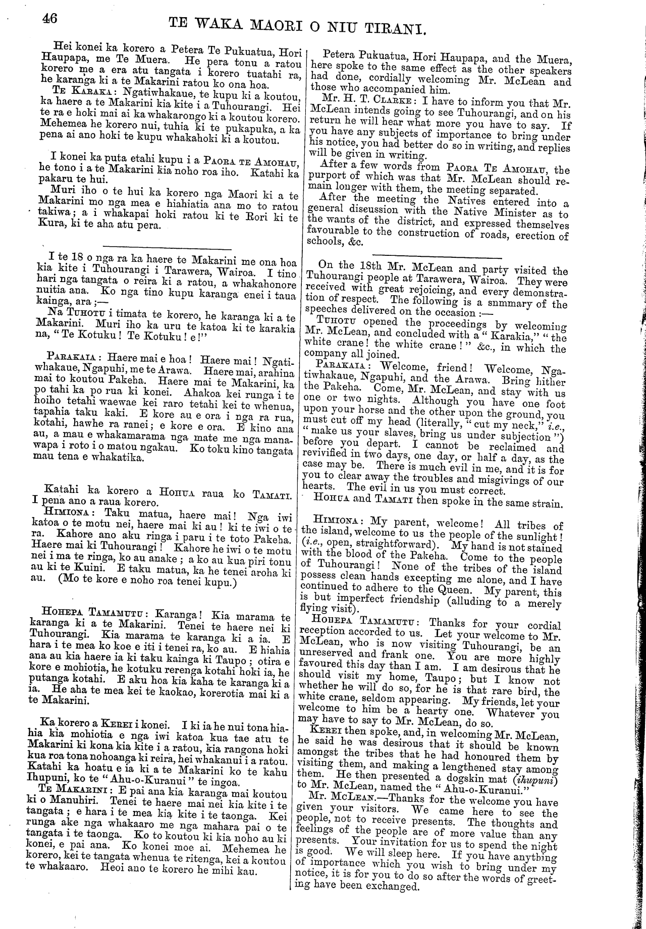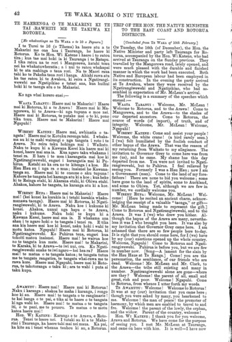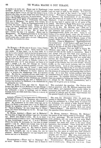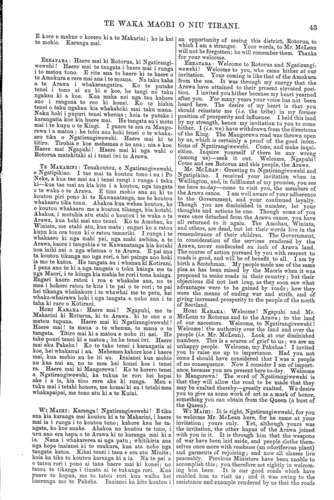 TE WAK: A MAORI O NIU TIRANI. 43 E kore e mahue o korero ki a te Makarini; ko ia kei te mohio. Karanga mai. EREATARA: Haere mai ki Rotorua, ki Ngatirangi- wewehi! Haere mai te tangata i haere mai i runga i to matou tono. E rite ana to haere ki te haere o te Amokura e rere mai ana i te moana. Na taku kaha a te Arawa i whakarangatira. Ko te putake tenei i tono ai au ki a koe, he tangi no taku ngakau ki a koe. Kua maha nei nga tau kahore ano i rangona to reo ki konei. Ko te hiahia tenei o taku ngakau kia whakahoki mai taku mana. Naku hoki i pupuri tenei whenua; koia te putake i karangatia koe kia haere mai. He tangata au i motu mai i te kupu o te Kingi. I puare te ara ra Mango- rewa i a matou; he tohu ano hoki tenei o te whaka- aro tika o Ngatirangiwewehi. Haere mai ki te titiro. Tirohia e koe mehemea e he ana; uia e koe. Haere mai Ngapuhi! Haere mai ki nga wahi o Rotorua matakitaki ai i tenei iwi te Arawa. TE MAKARINI: Tenakoutou, e Ngatirangiwewehi, e Ngatipikiao. I tae mai ta koutou tono i au i Po Neke, a kua tae mai au i tenei rangi i runga i taku ki—kua tae mai au kia kite i a koutou, nga tangata o te waka o te Arawa. E tino mohio ana au ki to koutou piri pono ki te Kawanatanga, me to koutou whakaaro tika tonu. Ahakoa kua wehea koutou, ko o koutou whakaaro me a koutou tikanga, kia kotahi. Ahakoa, i motuhia atu etahi o koutou i te waka o te Arawa, kua hoki mai ano tenei. Ko te Amohau, ko Winiata, me etahi atu, kua mate; engari ko a ratou kupu kia ora tonu ki o ratou tamariki. I runga i te whakaaro ki nga mahi pai, nga mahi awhina, a te Arawa, kaore i tangohia e te Kawanatanga kia kotahi noa inihi nei o nga whenua o te Arawa. E pai ana ta koutou tikanga mo nga rori, a hei painga ano hoki ia mo te katoa. He tangata au i whanau ki Kotirani. I pena ano te ki a nga tangata o toku kainga me ta nga Maori, i te kiinga kia mahia he rori i tona kainga. Engari kaore ratou i roa e whakahe ana, no te mea i hohoro ratou te kite i te pai o te rori; te pai hei tikanga whakakore i te whawhai me te patu, hei whaka-whairawa hoki i nga tangata e. noho ana i te taha ki raro o Kotirani. HORI KARAKA: Haere mai! Ngapuhi, me te Makarini ki Rotorua, ki te Arawa. ki te one o o matou tupuna. Haere mai ki Ngatirangiwewehi! Haere mai! te mana o te whenua, te mana o te tangata. Titiro mai ki a matou e noho iti nei. He take pouri tenei ki a matou; ka he tenei iwi. Haere mai aku Pakeha! Ko te take tenei i karangatia ai koe, hei whakanui i au. Mehemea kahore koe i haere mai, kua mohio au he iti au. Inaianei kua mohio au kua nui au, no te mea kei konei koe i tenei ra. Haere mai ki Mangorewa! Ko te korero tenei a Ngatirangiwewehi, ka tukua te rori hei hapai ake i a ia, kia tino rere ake ki runga. Mau e tuku mai i tetahi honore, me homai ki au i tetahi mea whakapaipai, me tono atu ki a te Kuini. WI MAIHI: Karanga! Ngatirangiwewehi! E tika ana kia karanga mai koutou ki a te Makarini, i haere mai ia i runga i to koutou tono; kahore kau he ta- ngata, ko koe anake. Ahakoa no koutou te tono, i uru ano era hapu o te Arawa ki te karanga mai ki a ia. Nana i whakarerea ai nga patu; whitikiria ana nga hope inaianei ki te raukura, kua ata noho nga tangata katoa. Kihai tenei i taea e era atu Minita; koia ka tika to koutou karanga ki a ia. Na te pai o o tatou rori i pono ai tana haere mai ki konei; no tatou te tikanga i timata ai te tukunga rori. Kua puare te kapua, me to tatou rori kua waiho hei haerenga mo te Pakeha. Inaianei ka kite koutou i an opportunity of seeing this district, Rotorua, to which I am a stranger. Your words, to Mr. McLean will not be forgotten; he will remember them. Thanks for your welcome. EREATARA.: Welcome to Rotorua and Ngatirangi- wewehi! Welcome to you, who came hither at our invitation. Your coming is like that of the Amokura from the sea. It was through my energy that the Arawa have attained to their present elevated posi- tion. I invited you hither because my heart yearned after you. For many years your voice has not been heard here. The desire of my heart is that you should reinstate me (i.e. the tribe) in my former position of prosperity and influence. I held this laud by my strength, hence my invitation to you to come hither. I (i.e. we) have withdrawn from the directions of the King. The Mangorewa road was thrown open by us, which is certainly a proof of the good inten- tions of Ngatirangiwewehi. Come, and make inqui- sition. Inquire yourself if there be any wrong (among us)—seek it out. Welcome, Ngapuhi! Come and see Rotorua and this people, the Arawa. Mr. MCLEAN: Greeting to Ngatirangiwewehi and Ngatipikiao. I received your invitation when in Wellington, and, in fulfilment of my promise, you see me here to-day—come to visit you, the members of the Arawa canoe. I am well aware of your adherence to the Government, and your continued loyalty. Though you are diminished in number, let your thoughts and actions be one. Though some of you were once detached from the Arawa canoe, you have all returned to it again. The Amohau, Winiata, and others, are dead, but let their words live in the remembrance of their children. The Government, in consideration of the services rendered by the Arawa, never confiscated an inch of Arawa land. The course of action pursued by you with respect to roads is good, and will be of benefit to all. I am by birth a Scotchman. My people made use of the same plea as has been raised by the Maoris when it was proposed to make roads in their country; but their objections did not last long, as they soon saw what advantages were to be gained by roads; how they were the means of ending war and strife, and of giving increased prosperity to the people of the north of Scotland. HORI KARAKA.: Welcome! Ngapuhi and Mr. McLean to Rotorua and to the Arawa; to the land of our ancestors. Welcome, to Ngatirangiwewehi! Welcome! the authority over the land and over the people (i.e. Mr. McLean). Look at our diminished numbers. This is a source of grief to us; we are an unhappy people. Welcome, my