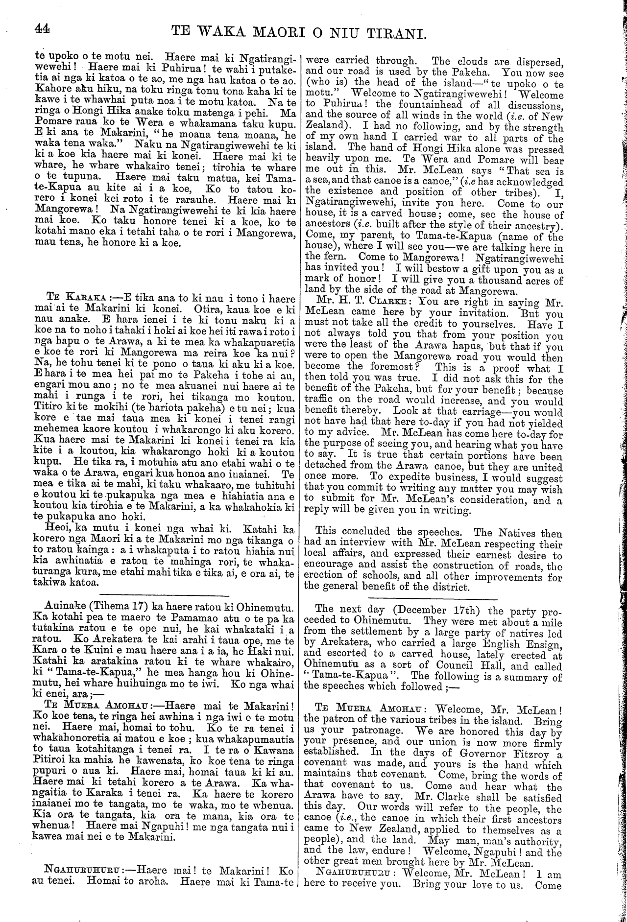 TE WAKA MAORI O NIU TIRANI. te upoko o te motu nei. Haere mai ki Ngatirangi- wewehi! Haere mai ki Puhirua! te wahi i putake- tia ai nga ka katoa o te ao, me nga hau katoa o te ao. Kahore aku hiku, na toku ringa tonu tona kaha ki te kawe i te whawhai puta noa i te motu katoa. Na te ringa o Hongi Hika anake toku matenga i pehi. Ma Pomare raua ko te Wera e whakamana taku kupu. E ki ana te Makarini, " he moana tena moana, he waka tena waka." Naku na Ngatirangiwewehi te ki ki a koe kia haere mai ki konei. Haere mai ki te whare, he whare whakairo tenei; tirohia te whare o te tupuna. Haere mai taku matua, kei Tama- te-Kapua au kite ai i a koe, Ko to tatou ko- rero i konei kei roto i te rarauhe. Haere mai ki Mangorewa! Na Ngatirangiwewehi te ki kia haere mai koe. Ko taku honore tenei ki a koe, ko te kotahi mano eka i tetahi taha o te rori i Mangorewa, mau tena, he honore ki a koe. TE KAEAEA:—E tika ana to ki nau i tono i haere mai ai te Makarini ki konei. Otira, kaua koe e ki nau anake. E hara tenei i te ki tonu naku ki a koe na to noho i tahaki i hoki ai koe hei iti rawa i roto i nga hapu o te Arawa, a ki te mea ka whakapuaretia e koe te rori ki Mangorewa ma reira koe ka nui? Na, he tohu tenei ki te pono o taua ki aku ki a koe. E hara i te mea hei pai mo te Pakeha i tohe ai an, engari mou ano; no te mea akuanei nui haere ai te mahi i runga i te rori, hei tikanga mo koutou. Titiro ki te mokihi (te hariota pakeha) e tu nei; kua kore e tae mai taua mea ki konei i tenei rangi mehemea kaore koutou i whakarongo ki aku korero. Kua haere mai te Makarini ki konei i tenei ra kia kite i a koutou, kia whakarongo hoki ki a koutou kupu. He tika ra, i motuhia atu ano etahi wahi o te waka o te Arawa, engari kua honoa ano inaianei. Te mea e tika ai te mahi, ki taku whakaaro, me tuhituhi e koutou ki te pukapuka nga mea e hiahiatia ana e koutou kia tirohia e te Makarini, a ka whakahokia ki te pukapuka ano hoki. Heoi, ka mutu i konei nga whai ki. Katahi ka korero nga Maori ki a te Makarini mo nga tikanga o to ratou kainga: a i whakaputa i to ratou hiahia nui kia awhinatia e ratou. te mahinga rori, te whaka- turanga kura, me etahi mahi tika e tika ai, e ora ai, te takiwa katoa. Auinake (Tihema 17) ka haere ratou ki Ohinemutu. Ka kotahi pea te maero te Pamamao atu o te pa ka tutakina ratou e te ope nui, he kai whakataki i a ratou. Ko Arekatera te kai arahi i taua ope, me te Kara o te Kuini e mau haere ana i a ia, he Haki nui. Katahi ka aratakina ratou ki te whare whakairo, ki " Tama-te-Kapua," he mea hanga hou ki Ohine- mutu, hei whare huihuinga mo te iwi. Ko nga whai ki enei, ara;— TE MUERA. AMOHAU:—Haere mai te Makarini! Ko koe tena, te ringa hei awhina i nga iwi o te motu nei. Haere mai, homai to tohu. Ko te ra tenei i whakahonoretia ai matou e koe; kua whakapumautia to taua kotahitanga i tenei ra. I te ra o Kawana Pitiroi ka mahia he kawenata, ko koe tena te ringa pupuri o aua ki. Haere mai, homai taua ki ki au. Haere mai ki tetahi korero a te Arawa. Ka wha- ngaitia te Karaka i tenei ra. Ka haere te korero inaianei mo te tangata, mo te waka, mo te whenua. Kia ora te tangata, kia ora te mana, kia ora te whenua! Haere mai Ngapuhi! me nga tangata nui i kawea mai nei e te Makarini. NGAHURUHURU:—Haere mai! te Makarini! Ko au tenei. Homai to aroha. Haere mai ki Tama-te were carried through. The clouds are dispersed, and our road is used by the Pakeha. You now see (who is) the head of the island—" te upoko o te motu." Welcome to Ngatirangiwewehi! Welcome to Puhirua! the fountainhead of all discussions, and the source of all winds in the world (i.e. of New Zealand). I had no following, and by the strength of my own hand I carried war to all parts of the island. The hand of Hongi Hika alone was pressed heavily upon me. Te Wera and Pomare will bear me out in this. Mr. McLean says "That sea is a sea, and that canoe is a canoe," (i.e has acknowledged the existence and position of other tribes). I, Ngatirangiwewehi, invite you here. Come to our house, it is a carved house; come, see the house of ancestors (i.e. built after the style of their ancestry). Come, my parent, to Tama-te-Kapua (name of the house), where I will see you—we are talking here in the fern. Come to Mangorewa! Ngatirangiwewehi has invited you! I will bestow a gift upon you as a mark of honor! I will give you a thousand acres of land by the side of the road at Mangorewa. Mr. H. T. CLARKE: You are right in saying Mr. McLean came here by your invitation. But you must not take all the credit to yourselves. Have I not always told you that from your position you were the least of the Arawa hapus, but that if you were to open the Mangorewa road you would then become the foremost? This is a proof what I then told you was true. I did not ask this for the benefit of the Pakeha, but for your benefit; because traffic on the road would increase, and you would benefit thereby. Look at that carriage—you would not have had that here to-day if you had not yielded to my advice. Mr. McLean has come here to-day for the purpose of seeing you, and hearing what you have to say. It is true that certain portions have been detached from the Arawa canoe, but they are united once more. To expedite business, I would suggest that you commit to writing any matter you may wish to submit for Mr. McLean's consideration, and a reply will be given you in writing. This concluded the speeches. The Natives then had an interview with Mr. McLean respecting their local affairs, and expressed their earnest desire to encourage and assist the construction of roads, the erection of schools, and all other improvements for the general benefit of the district. The next day (December l7th) the party pro- ceeded to Ohinemutu. They were met about a mile from the settlement by a large party of natives led by Arekatera, who carried a large English Ensign, and escorted to a carved house, lately erected at Ohinemutu as a sort of Council Hall, and called " Tama-te-Kapua". The following is a summary 