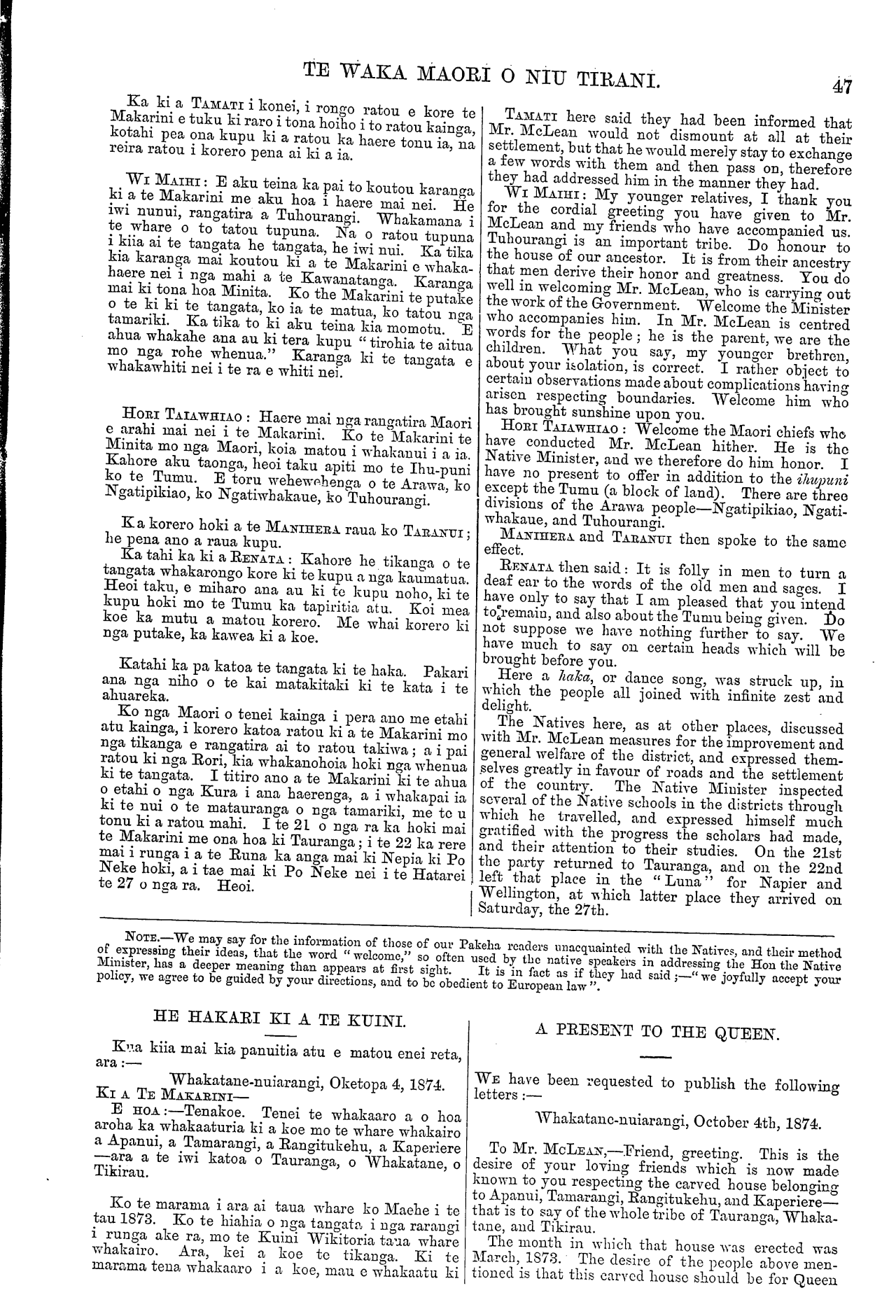 TE WAKA MAORI O NIU TIRANI. 47 Ka ki a TAMATI i konei, i rongo ratou e kore te Makarini e tuku ki raro i tona hoiho i to ratou kainga, kotahi pea ona kupu ki a ratou ka haere tonu ia, na reira ratou i korero pena ai ki a ia. WI MAIHI: E aku teina ka pai to koutou karanga ki a te Makarini me aku hoa i haere mai nei. He iwi nunui, rangatira a Tuhourangi. Whakamana i te whare o to tatou tupuna. Na o rato u tupuna i kiia ai te tangata he tangata, he iwi nui. Ka tika kia karanga mai koutou ki a te Makarini e whaka- haere nei i nga mahi a te Kawanatanga. Karanga mai ki tona hoa Minita. Ko the Makarini te putake o te ki ki te tangata, ko ia te matua, ko tatou nga tamariki. Ka tika to ki aku teina kia momotu. E ahua whakahe ana au ki tera kupu " tirohia te aitua mo nga rohe whenua." Karanga ki te tangata e whakawhiti nei i te ra e whiti nei. HORI TAIAWHIAO: Haere mai nga rangatira Maori e arahi mai nei i te Makarini. Ko te Makarini te Minita mo nga Maori, koia matou i whakanui i a ia. Kahore aku taonga, heoi taku apiti mo te Ihu-puni ko te Tumu. E toru wehewehenga o te Arawa, ko Ngatipikiao, ko Ngatiwhakaue, ko Tuhourangi. Ka korero hoki a te MANIHERA, raua ko TARANUI; he pena ano a raua kupu. Ka tahi ka ki a RENATA: Kahore he tikanga o te tangata whakarongo kore ki te kupu a nga kaumatua. Heoi taku, e miharo ana au ki te kupu noho, ki te kupu hoki mo te Tumu ka tapiritia atu. Koi mea koe ka mutu a matou korero. Me whai korero ki nga putake, ka kawea ki a koe. Katahi ka pa katoa te tangata ki te haka. Pakari ana nga niho o te kai matakitaki ki te kata i te ahuareka. Ko nga Maori o tenei kainga i pera ano me etahi atu kainga, i korero katoa ratou ki a te Makarini mo nga tikanga e rangatira ai to ratou takiwa; a i pai ratou ki nga Rori, kia whakanohoia hoki nga whenua ki te tangata. I titiro ano a te Makarini ki te ahua o etahi o nga Kura i ana haerenga., a i whakapai ia ki te nui o te matauranga o nga tamariki, me to u tonu ki a ratou mahi. I te 21 o nga ra ka hoki mai te Makarini me ona hoa ki Tauranga; i te 22 ka rere mai i runga i a te Runa ka anga mai ki Nepia ki Po Neke hoki, a i tae mai ki Po Neke nei i te Hatarei te 27 o nga ra. Heoi. HE HAKARI KI A TE KUINI. Kua kiia mai kia panuitia atu e matou enei reta, ara:— Whakatane-nuiarangi, Oketopa 4, 1874. KI A TE MAKARINI— E HOA:—Tenakoe. Tenei te whakaaro a o hoa aroha ka whakaaturia ki a koe mo te whare whakairo a Apanui, a Tamarangi, a Rangitukehu, a Kaperiere —ara a te iwi katoa o Tauranga, o Whakatane, o Tikirau. Ko te marama i ara ai taua whare ko Maehe i te tau 1873. Ko te hiahia o nga tangata i nga rarangi i runga ake ra, mo te Kuini Wikitoria taua whare whakairo. Ara, kei a koe to tikanga. Ki te marama tena whakaaro i a koe, mau e whakaatu ki NOTE.—We may say for the information of those of our Pakeha readers unacquainted with the Natives, and their method of expressing their ideas, that the word " welcome," so often used by the native speakers in addressing the Hon the Native Minister, has a deeper meaning than appears at first sight. It is in fact as if they had said;—" we joyfully accept your policypolicy, we agree to be guided by your directions, and to be obedient to European law ". TAMATI here said they had been informed that Mr. McLean would not dismount at all at their settlement, but that he would merely stay to exchange a few words with them and then pass on, therefore they had addressed him in the manner they had. WI MAIHI: My younger relatives, I thank you for the cordial greeting you have given to Mr. McLean and my friends who have accompanied us. Tuhourangi is an important tribe. Do honour to the house of our ancestor. It is from their ancestry that men derive their honor and greatness. You do well in welcoming Mr. McLean, who is carrying out the work of the Government. Welcome the Minister who accompanies him. In Mr. McLean is centred words for the people; he is the parent, we are the children. What you say, my younger brethren, about your isolation, is correct. I rather object to certain observations made about complications having arisen respecting boundaries. Welcome him who has brought sunshine upon you. HORI TAIAWHIAO: Welcome the Maori chiefs who have conducted Mr. McLean hither. He is the Native Minister, and we therefore do him honor. I have no present to offer in addition to the ihupuni except the Tumu (a block of land). There are three divisions of the Arawa people—Ngatipikiao, Ngati- whakaue, and Tuhourangi. MANIHERA. and TARANUI then spoke to the same effect. RENATA then said: It is folly in men to turn a deaf ear to the words of the old men and sages. I have only to say that I am pleased that you intend to remain, and also about the Tumu being given. Do not suppose we have nothing further to say. We have much to say on certain heads which will be brought before you. Here a haka, or dance song, was struck up, in which the people all joined with infinite zest and delight. The Natives here, as at other places, discussed with Mr. McLean measures for the improvement and general welfare of the district, and expressed them- selves greatly in favour of roads and the settlement of the country. The Native Minister inspected several of the Native schools in the districts through which he travelled, and expressed himself much gratified with the progress the scholars had made, and their attention to their studies. On the 21st the party returned to Tauranga, and on the 22nd left that place in the "Luna" for Napier and Wellington, at which latter place they arrived on Saturday, the 27th. A PRESENT TO THE QUEEN. WE have been requested to publish the following letters:— Whakatane-nuiarangi, October 4th, 1874. To Mr. MCLEAN,—Friend, greeting. This is the desire of your loving friends which is now made. known to you respecting the carved house belonging to Apanui, Tamarangi, Rangitukehu, and Kaperiere— that is to say of the whole tribe of Tauranga, Whaka- tane, and Tikirau. The month in which that house was