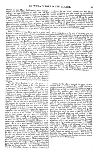 TE WAKA MAORI O NIU TIRANI. 49 tauhou ai nga Maori kai-korero i tenei nupepa; engari hei mahi ahuareka ia, mahi tika, ma nga tamariki, me nga taitamariki, e haere ana ki nga kura o te Kawanatanga, te kimi i aua ingoa me te takoto- ranga o aua whenua i runga i te mapi o Awherika; tera hoki a ratou kai-whakaako e koa ki te awhina i a ratou ki runga ki taua mahi. Katahi ka ahua marama ratou ki a matou korero e korero ai matou akuanei mo nga haerenga whenua a Takuta Riwingi- tone, ka taea ai hoki e rato u te whakaatu ki o ratou whanaunga te takotoranga o nga wahi e korerotia e matou akuanei. Heoi, ka titiro koutou ki te mapi o te ao ka kite koutou ko te whenua katoa o te ao kua wahia kia rua ai moutere nui whakaharahara; a e huaina ana ko te ao Tawhito me te ao Hou, ko nga moutere pakupaku he tini noa iho. Ko te whenua nui kei te taha rawhiti, ara ko te ao Tawhito, e timata ana i te tai i te taha hauauru (weta) o Awherika, ka haere whaka- te-taha whakarua (N.E.) tae noa ki te takutai i te taha rawhiti (E.) o Ehia. Ko te roa, i te wahi tino roa, e ahua rite ana ki te 8, 000, waru mano, maero; ko te whanui, i te taha Kapekape (N.W.) haere ki te taha Tonga-a-waho (S.E.), ka 3, 000, toru mano, maero—haunga nga rerenga. E rite ana tenei ki te 24, 000, 000, rua te kau ma wha miriona maero, i roto i taua whenua katoa; a ko tona tikanga ano hoki pea tena. Ho wahi iti kua rua ai whenua o taua whenua i nga moana e rua nana i waewae, ara ko te Moana Metitareniana me to Moana Whero (to Reti Hi). Ko te Moana Akatiki te rohe ki te taha tuaraki, pawhare nei (N). Te rohe ki te taha hauauru ko te tahatika e puku atu ana ki te moana kua huaina ko te Ataranatiki Ohiana. Ko te rohe ki te taha tonga, ko te kokorutanga nui o te takutai i to taha ki te moana kua huaina ko te Iniana Ohiana. Ko te rohe ki te taha rawhiti (E.) e takoto pikopiko ana i te taha tonga-kotaratara (S.W.) haere Id te taha whakama (N.E.)—ko nga moutere pakupaku i taua rohe he tini noa. Na, ka titiro koutou ki te taha maui o ie mapi, ara te taha hauauru, ka kite koutou ke taua whenua, ara te ao Hou, e kotahi tonu ana te •moutere, he mea takoto mai i to taha nota (tuaraki) haere mai ki te taha tonga; ho wahi iti hoki kua rua ano whenua o taua moutere, he pera me tera, i nga moana nana i wehewehe, ara ko nga moana e huaina ana ko te Karipiana Hi, me te Kokorutanga o Mehiko—ko te taha nota o taua whenua kua huaina ko Nota-Merika, ko te taha ki te tonga ko Houta- Merika. Ko te rohe ki te taha nota kaore ano kia ata haerea e te tangata i te nui o te huka-papa o taua taha, e kope katoa ana taua moana i te huka- papa e maanu ana i te wai, ano he maunga teitei rawa, pakaru ana te kaipuke; engari ko taua rohe e maharatia ana he roanga ia, i te taha rawhiti, no te rohe ki te nota o te ao Tawhito. Kotahi te moutere nui kei taua moana i te taha Nota, ko Kirinirana tona ingoa. Ko te rohe ki te taha hauauru ko te moana nui e huaina ana ko te Pahiwhiki Ohiana; ki te taha rawhiti, ko te Ataranatiki Ohiana; ki te taha tonga, ko te Ohiana, ara ko te moana, ki te tonga rawa. Ko te roa o Nota-Merika ka 4, 400, wha mano wha rau, maero; te whanui, i te wahi tino whanui, e ahua rite ana ki te 3, 000, toru mano, maero—hui nga maero tapawha i roto i taua whenua katoa, ka 8, 000, 000, waru miriona. Te roa o Houta-Merika, ka 4, 700, wha mano whitu rau, maero; te whanui, i te wahi tino whanui, ka 3, 200, toru mano rua rau, maero—hui katoa nga maero o taua whenua, ka 7, 000, 000, whitu miriona, maero. Na ko enei wahanga nui o te ao kua wehewehea ano; ara ko te ao Tawhito ka toru wehenga, ko luropi, ko Ehia, ko Awherika; ko te ao Hou, ara ko Amerika, ka rua wehenga, ko Nota- Merika, ko Houta-Merika. Ko nga moutere katoa i roto i te Pahiwhiki Ohiana, te huinga katoatanga, be strange to our Maori readers; but the Maori youths and young men who attend the Government schools will find it a pleasing and profitable employ- ment to trace out on the map of Africa the names and positions of these places; and, without doubt, their teachers will be very glad to assist them in the search. They will then better understand what we shall relate of Dr. Livingstone's travels, and be able to tell their friends something about the position of the places of which we shall have to speak. By looking, then, at the map of the world, you will perceive that the dry land on the surface of the globe consists of two great islands, which are called the Old and the New world, with a multitude of smaller islands. The great eastern continent or Old world, extends from the west coast of Africa, in a north- east direction, to the east coast of Asia. Its greatest length is about (8, 000) eight thousand miles, of an average breadth from north-west to south-east of about (3, 000) three thousand miles, both in round numbers. This would give an area of (24, 000, 000) twenty-four millions of miles, which may not be far from the truth. It is nearly divided into two con- tinents by the Mediterranean Sea and the Red Sea. Its northern boundary is the Arctic Ocean. Its western boundary is a great convex arch formed by the coast line towards the Atlantic Ocean. Its southern boundary is the great concave, or hollow, arch occupied by the Indian Ocean. Its eastern boundary is a waving irregular line, covered with islands, extending from south-west to north-east. Looking to the left, or west, of the map, you will observe that the western, or New world, consists of one long island lying from north to south, and nearly divided into two by the Caribbean Sea and Gulf of Mexico—the northern part being called. North America, and the southern part South America. Its northern boundary has not been completely explored, owing to the difficulty of navigation from the mountains of floating ice in those seas; but this boundary seems to be a continuation, towards the cast, of the northern boundary of the Old world. There is a great island in this Northern Ocean, called Greenland. The boundary to the west is the Pacific Oc