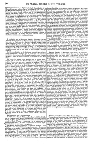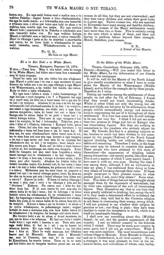78 TE WAKA MAORI O NIU TIRANI. katoa atu. Ko nga mahi katoa enei e mahia, ana e te wahine Pakeha; engari kaore e tino whakataimaha- tia ana he mahi mana; a e tokomaha ana ona tamariki e whanau ana, e ahua pai tonu ana hoki te ahua o te wahine taea noatia nga tau maha. Ko nga wahine Maori hoki i marenatia ki te Pakeha e tokomaha ana ona tamariki kaha, ora. Ko nga wahine kainga Maori, e takitahi ana, e takirua ana, o ratou tamariki. Heoi te tikanga i pera ai ko te atawhai e atawhaitia. nei ratou, ko te kore hoki e whakamahia ki nga mahi taimaha, uaua. Whakahonoretia a koutou wahine. NA G. D., He hoa no nga Maori. Ki a te Kai Tuhi o te Waka Maori. Timaru, Katapere, Pepuere 13, 1874. E HOA.—Tena koe. Mau e uta tenei reta ki runga ki te Waka Maori, hei titiro ma o taua hoa e manaaki ana ki taua nupepa. Tenei he mea pai kia ata titiro kia ata whakaaro nga Maori e noho ana i te rua o nga moutere ki enei korero ka tuhia nei e au mo nga ritenga a nga Maori o te Waipounamu, a ka waiho hei tauira mo rato u. Koia te take o taku whakaatu. Ko nga mea i kitea e ahau i toku haereerenga ki nga kainga o enei tangata, i te 7 o Pepuere me nga ra o muri mai, ka kite au e kore taua iwi e pa atu ki te kai i te waipiro. Ahakoa ki te rau o te iwi ko nga taitamariki hei whakaahuareka ki te kai i te waipiro, me etahi o nga kaumatua, me etahi ano o nga kau- matua rangatira; taka ki tenei iwi nei e hara i te hanga ake to ratou kaha ki te pehi i taua kai i o ratou kainga katoa. Tera ano ia nga tangata e kai ana i te waipiro, ki hai i tokomaha. Tokorua pea o aku i kite ai i Otakou, tokorua i Kaiapoi hoki, pena ano. Otira, hei aha koa ena tangata torutoru i te tokomaha o taua iwi kua kore e pa ki taua kai. E hoa ma, he mea whakamiharo rawa tenei mea ki au, no te mea kua nui noa atu nga korero a nga tangata o te rua o nga motu nei kua taia ki te nupepa hei whakakore mo te kai i te waipiro; heoi, kaore ano kia mana aua kupu. Koia nei te take o enei korero i tuhia ai, hei meatanga ma etahi atu tangata. Koia hoki he tangata nei aho enei kua hopukia e ratou tenei taonga nui te whakarere i te kai waipiro. E hara i te mea, e hoa ma, i rongo a korero ahau, i kite tonu ano oku kanohi. Ahakoa he hiahia toku ki tetahi karaihe maku kia kotahi nei, ki hai rawa i taea e au i te nui o toku whakama, ka pokanoa hoki i roto i a ratou. Mehemea pea ka mau tonu te pupuru a tenei iwi nei i ta ratou ritenga penei, heoi, ka mea au he aha ra te mea pai atu i tenei ritenga kua kitea nei e ratou? Kaore ra hoki. E hara ta ratou tikanga i te mea i ahu mai i roto i te tikanga e kiia nei he " titotara." Kahore. Na ratou ano i kite he kai kino taua kai. E ki ana ratou he nui noa atu to ratou kaha ki te kai i mua; hei te kitenga i te kino katahi ratou ka whakauaua ki te whakarere i taua kai; ka hapainga e ratou ko te Whakapono hei whaka- kaha kia puta ai to ratou kaha ki to ratou hoa riri, ki te waipiro. E kore e taea e au te korero i te ahua o to ratou whakapono, te peheatanga ranei; engari kotahi te mea e marama ana, ara kua kaha ratou ki te whakarere i te waipiro, he taonga nui rawa tenei. Me korero hoki e au te ahua o tenei moutere, te pai me te kino o te whenua. Ki hai au i kite i tetahi wahi kino i nga wahi i haerea e au. Tera atu pea nga wahi kino, ki hai ia i oti i au te haere te whenua katoa. Ko nga wahi i kitea e au, hei aha koa i kiia ai. Heoi te wahi maunga kei Otakou haere mai ki Moeraki. Haere mai i Moeraki tae mai ki Oamaru, tae mai ki te taone nui ki, Karaitiana, he mania katoa. Tena ra ia te mea pai hei titiro ma te tangata tauhou penei me au nei, women do all this, but they are not overworked; and they bear many children and retain their good looks to a great age, Native women too, who are married to Europeans have many strong and healthy children, whilst the women of the Maori settlements rarely have more than two or three. This is entirely owing to the care which is taken of them, and their not having to perform labour beyond their strength. Honor, therefore, your women. From G. D., A friend of the Maoris. To the Editor of the. Waka Maori. Timaru, Canterbury, February 13th, 1874. FRIEND—Greeting,—Will you insert this letter in the Waka Maori, for the information of our friends who read the newspaper. It will be well for the Maoris of the North Island to give careful consideration to what I have to write about the Maoris of the Waipounamu (Middle Island), and to follow the example set by these people. Therefore do I write. During my rambles among the settlements of these people, on and after the 7th of February, I found that they would not touch intoxicating drinks. Whilst in other tribes not only the young, but old men and chiefs, are led away by its allurements, these people exhibit extraordinary energy and determin- ation in suppressing the use of it throughout all their settlements. It is true that some few do still indulge in its use, but very few. I think I did not see more than two persons at Otago and two at Kaiapoi who use intoxicating liquors. But they are nothing in comparison to the numbers who entirely abjure its use. My friends, this fact is a pleasing surprise to me, because so much has been written in the news- paper by the people (Natives) of the North Island against drinking habits, yet without effect—those habits still remaining. Therefore I write, in the hope that some may be induced to consider this matter. These people who have attained to this state of blessedness—the suppression of drinking habits among themselves—are merely mortal, like other men. This is not a matter of which I have merely heard; I have seen it with my own eyes. During the time I was among them, although I felt an inclination to take my glass, I was restrained from doing so from very shame of breaking through their rules. If these people persevere in their present course, to what greater good, I ask, could they attain? None what- ever. This state of things has not been brought about amongst them by the exponents of teetotalism, 