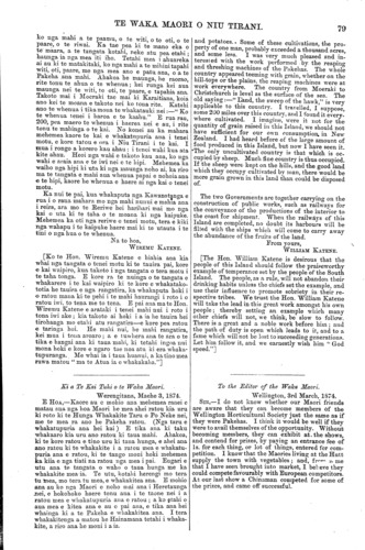 TE WAKA MAORI O NIU TIRANI. 79 ko nga mahi a te paamu, o te witi, o te oti, o te paare, o te riwai. Ka tae pea ki te mano eka o te maara, a te tangata kotahi, neke atu pea etahi; haunga ia nga, mea iti iho. Tetahi mea i ahuareka ai au ki te matakitaki, ko nga mahi a te mihini tapahi witi, oti, paare, me nga mea ano e patu ana, o a te Pakeha ana mahi. Ahakoa he maunga, he raorao, rite tonu te ahua o te whenua; kei runga kei aua maunga nei te witi, to oti, te paare, e tapahia ana. Takoto mai i Moeraki tae mai ki Karaitiana, koia ano kei te moana e takoto nei ko tona rite. Katahi ano te whenua i tika mona te whakatauki nei:—" Ko te whenua tenei i harm e te kaahu." E rua rau, 200, pea maero te whenua i haerea nei e au, i rite tonu te mahinga o te kai. No konei au ka mahara mehemea kaore te kai e whakatupuria ana i tenei motu, e kore tatou e ora i Niu Tirani i te kai. I mua i rongo a korero kau ahau: i tenei wahi kua ata kite ahau. Heoi nga wahi e takoto kau ana, ko nga wahi e araia ana enei e te iwi nei e te hipi. Mehemea ka waiho nga. hipi ki uta ki nga maunga noho ai, ka riro ma te tangata e mahi aua whenua papai e nohoia ana e te hipi, kaore he whenua e haere ai nga kai o tenei motu. Ka nui te pai, kua whakaputa nga Kawanatanga e rua i o raua mahara mo nga mahi nunui e mahia ana i reira, ara mo te Reriwe hei harihari mai mo nga kai o uta ki te taha o te moana ki nga kaipuke. Mehemea ka oti nga reriwe o tenei motu, tera e kiki nga wahapu i te kaipuke haere mai ki te utauta i te tini o nga hua o te whenua. Na to hoa, WIREMU KATENE. [Ko te Hon. Wiremu Katene e hiahia ana kia whai nga tangata o tenei motu ki te tauira pai, kore e kai waipiro, kua takoto i nga tangata o tera motu i te taha tonga. E kore ra te nuinga o te tangata e whakarere i te kai waipiro ki te kore e whakatako- toria he tauira e nga rangatira, ka whakaputa hoki i o ratou maua ki te pehi i te mahi haurangi i roto i o ratou iwi, to tena me to tena. E pai ana mate Hon. Wiremu Katene e arataki i tenei mahi nui i roto i tona iwi ake; kia takoto ai hoki i a ia he tauira hei tirohanga mo etahi atu rangatira —e kore pea ratou e taringa hoi. He mahi nui, he mahi rangatira, kei mua i tona aroaro; a e tuwhera ana te ara o te tika e hangai ana ki taua mahi, ki tetahi ingoa nui mona hoki e kore e ngaro tae noa atu ki era whaka- tupuranga. Me whai ia i taua huanui, a ka tino mea rawa matou " ma te Atua ia e whakakaha."] Ki a Te Kai Tuhi o te Waka Maori. Werengitana, Maehe 3, 1874. E HOA,—Kaore au e mohio ana mehemea ranei e matau ana nga hoa Maori he. mea ahei ratou kia uru ki roto ki te Hunga Whakakite Taru o Po Neke nei, me te mea ra ano he Pakeha ratou. (Nga taru e whakatupuria ana hei kai) E tika ana ki taku whakaaro kia uru ano ratou ki taua mahi. Ahakoa, ki te kore ratou e tino uru ki taua hunga, e ahei aua ano ratou ki te whakakite i a rat ou mea e whakatu- puria ana e ratou, ki te tango moni hoki mehemea ka kiia e nga tiati na ratou nga mea i pai. Engari e utu ana te tangata o waho o taua hunga me ka whakakite mea ia. Te utu, kotahi herengi mo tera tu mea, mo tera tu mea, e whakakitea ana. E momo ana au ko nga Maori e noho mai ana i Heretaunga nei, e hokohoko haere tonu ana i te taone nei i a ratou mea e whakatupuria ana e ratou; a ko etahi o aua mea e kitea ana e au e pai aua, e tika ana hei whainga ki a te Pakeha e whakakitea ana. I tera whakakitenga a matou he Hainamana tetahi i whaka- kite, a riro ana he moni i a ia. and potatoes. Some of these cultivations, the pro- perty of one man, probably exceeded a thousand acres, and some less. I was very much pleased and in- terested with the work performed by the reaping and threshing machines of the Pakehas. The whole country appeared teeming with grain, whether on the hill-tops or the plains, the reaping machines were at work everywhere. The country from Moeraki to Christchurch is level as the surface of the sea. The old saying:—" Land, the sweep of the hawk," is very applicable to this country. I travelled, I suppose, some 200 miles over this country, and I found it every- where cultivated. I imagine, were it not for the quantity of grain raised in this Island, we should not have sufficient for our own consumption, in New Zealand. I had heard before of the large amount of food produced in this Island, but now I have seen it. The only uncultivated country is that which is oc- cupied by sheep. Much fine country is thus occupied. If the sheep were kept on the hills, and the good land which they occupy cultivated by man, there would be more grain grown in this land than could be disposed of. The two Governments are together carrying on the construction of public works, such as railways for the conveyance of the productions of the interior to the coast for shipment. When the railways of this Island are completed, no doubt its harbours will be filled with the ships which will come to carry away the abundance of the fruits of the land. From yours, WILLIAM KATENE. [The Hon. William Katene is desirous that the people of this Island should follow the praiseworthy example of temperance set by the people of the South Island. The people, as a rule, will not abandon their drinking habits unless the chiefs set the example, and use their influence to promote sobriety in their re- spective tribes. We trust the Hon. William Katene will take the lead in this great work amongst his own people; thereby setting an example which many other chiefs will not, we think, be slow to follow. There is a great and a noble work before him; and the path of duty is open which leads to it, and to a fame which will not be lost to succeeding generations. Let him follow it. and we earnestly wish him " God speed."] To the Editor of the Waka Maori. Wellington, 3rd March, 1874. SIR,—I do not know whether our Maori friends are aware that they can become members of the Wellington Horticultural Society just the same as if they were Pakehas. I think it would be well if they were to avail themselves of the opportunit