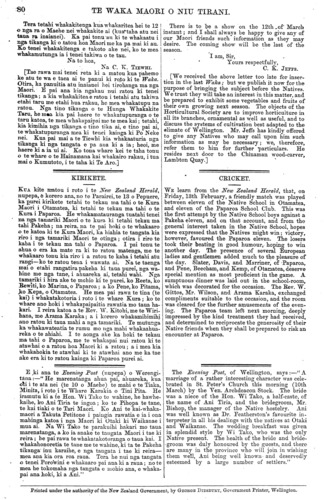 80 TE WAKA MAORI O NIU TIRANI. Tera tetahi whakakitenga kua whakaritea hei te 12 o nga ra o Maehe nei whakakite ai (kua taha atu nei taua ra inaianei). Ka pai tonu •an ki te whakaatu i nga tikanga ki o tatou hoa Maori me ka pa mai ki au. Ko tenei whakakitenga e takoto ake nei, ko te mea whakamutunga ia i tenei takiwa o te tau. Na to hoa, Na C. K. TIEWHI. [Tae rawa mai tenei reta ki a matou kua pahemo ke atu te wa e taea ai te panui ki roto ki te Waka. Otira, ka panuitia atu inaianei hei tirohanga ma nga Maori. E pai ana Ina ngakau nui ratou ki tenei tikanga; a kia whakakitea e ratou i tetahi atu takiwa etahi taru me etahi hua rakau he mea whakatupu na ratou. Nga tino tikanga o te Hunga Whakakite Taru, he mea kia pai haere te whakatupuranga o te taru katoa, te mea whakapaipai mo te mea kai; tetahi, kia kimihia nga tikanga e tino tika ai, e tino pai ai, te whakatupuranga mea ki tenei kainga ki Po Neke nei. Kua pai mai a te Tiewhi kia whakaaturia nga tikanga ki nga tangata e pa aua ki a ia; heoi, me haere ki a ia ui ai. Ko toua whare kei te taha tonu o te whare o te Hainamana kai whakairo rakau, i tua mai o Kumutoto, i te taha ki Te Aro.] KIRIKETE. KUA kite matou i roto i te New Zealand Herald, nupepa, e korero ana, no te Parairei, te 13 o Pepuere, ka purei kirikete tetahi te tekau ma tahi o te Kura Maori i Otamatea, ki tetahi te tekau ma tahi o te Kura i Paparoa. He whakamatauranga tuatahi tenei ua nga tamariki Maori o te kura ki tetahi tekau ma tahi Pakeha; na reira, na te pai hoki o te whakaaro o te katoa ki te Kura Maori, ka hiahia te tangata kia riro i nga tamariki Maori te otinga; otira i riro te kaha i te tekau ma tahi o Paparoa. I pai tonu te ahua o era ka mate ra ki to ratou matenga, me te whakaaro tonu kia riro i a ratou te kaha i tetahi atu rangi—ko te ratou tena i wawata ai. Na te taenga mai o etahi rangatira pakeha ki taua purei, nga wa- hine me nga tane, i ahuareka ai, tetahi wahi. Nga tamariki i hira ake te mohio ki te purei. ko Reeta, ko Reweti, ko Marina, o Paparoa; a ko Pene, ko Pitama, ko Kepa, o Otamatea. He mea pai rawa te tina (te kai) i whakatakotoria i roto i te whare Kura; ko te whare ano hoki i whakapaipaitia rawatia mo taua ha- kari. I reira katoa a te Rev. W. Kitohi, me te Wiri- hana, me Arama Karaka; a i korero whakamihimihi ano ratou ki taua mahi a nga tamariki. Te mutunga ka whakawateatia te rumu mo nga mahi whakaahua- reka o te ahiahi. I te aonga ake ka hoki te tekau ma tahi o Paparoa, me te whakapai nui ratou ki te atawhai o a ratou, hoa Maori ki a ratou; a i mea kia whakahokia te atawhai ki te atawhai ano me ka tae ake era ki to ratou kainga ki Paparoa purei ai. E ki ana te Evening Post (nupepa) o Werengi- tana:—" He marenatanga ahua pai, ahuareka, kua oti i te ata nei (te 10 o Maehe) te mahi e te Tiaka, Minita, i roto i te Whare Karakia o Tini Pita. He iramutu ki a te Hon. Wi Tako te wahine, he hawhe- kaihe, ko Ani Tiria te ingoa; ko te Pihopa te tane, te kai tiaki o te Tari Maori. Ko Ani te kai-whaka- maori a Takuta Petitone i paingia rawatia e ia i ona mahinga katoa i nga Maori ki Otaki ki Waikanae i mua ai. Na Wi Tako te parakuihi hakari mo taua marenatanga, a ko ia anake te tangata Maori i tae ki reira; he pai rawa te whakatakotoranga o taua kai. I whakahonoretia te tane me te wahine, ki ta te Pakeha tikanga inu karaihe, e nga tangata i tae ki reira— mea ana kia ora roa raua. Tera he nui nga tangata o tenei Porowini e whakaaro pai ana ki a raua; no te mea he tokomaha nga tangata e mohio ana, e whaka- pai ana hoki, ki a Ani." There is to be a show on the 12th of March instant; and I shall always be happy to give any of our Maori friends such information as they may desire. The coming show will be the last of the season. I am, Sir, Yours respectfully, 0. K. JEFFS. [We received the above letter too late for inser- tion in the last Waka; but we publish it now for the purpose of bringing the subject before the Natives. We trust they will take an interest in this matter, and be prepared to exhibit some vegetables and fruits of their own growing next season. The objects of the Horticultural Society are to improve horticulture in all its branches, ornamental as well as useful, and to discuss the systems of cultivation best adapted to the climate of Wellington. Mr. Jens has kindly offered to give any Natives who may call upon him such information as may be necessary; we, therefore, refer them to him for further particulars. He resides next door to the Chinaman wood-carver» Lambton Quay.] CRICKET. WE learn from the New Zealand Herald, that, on Friday, 13th February, a friendly match was played between eleven of the Native School in Otamatea, and eleven of the Paparoa School Club. This was the first attempt by the Native School boys against a Pakeha eleven, and on that account, and from the general interest taken in the Native School, hopes were expressed that the Natives might win; victory, however, favoured the Paparoa eleven. The losers took their beating in good humour, hoping to win another day. The presence of several European ladies and gentlemen added much to the pleasure of the day. Slater, Davis, and Marriner, of Paparoa, and Pene, Beecham, and Kemp, of Otamatea, deserve special mention as most proficient in the game. A sumptuous dinner was laid out in the school-room, which was decorated for the occasion. The Rev. W. Gittos, Mr. Wilson, and Arama Karaka, exchanged compliments suitable to the occasion, and the room was cleared for the further amusements of the even- ing. The Paparoa team left next morning, deeply impressed by the kind treatment they had received, and determined to reciprocate the generosity of their Native friends when they shall be prepared to risk an encounter at Paparoa. The Evening Post, of Wellington, says:—" A marriage of a rather interesting character was cele- brated in St. Peter's Church this morning (10th March) by the Yen. Archdeacon Stock. The bride was a niece of the Hon. Wi Tako, a half-caste, of the name of Ani
