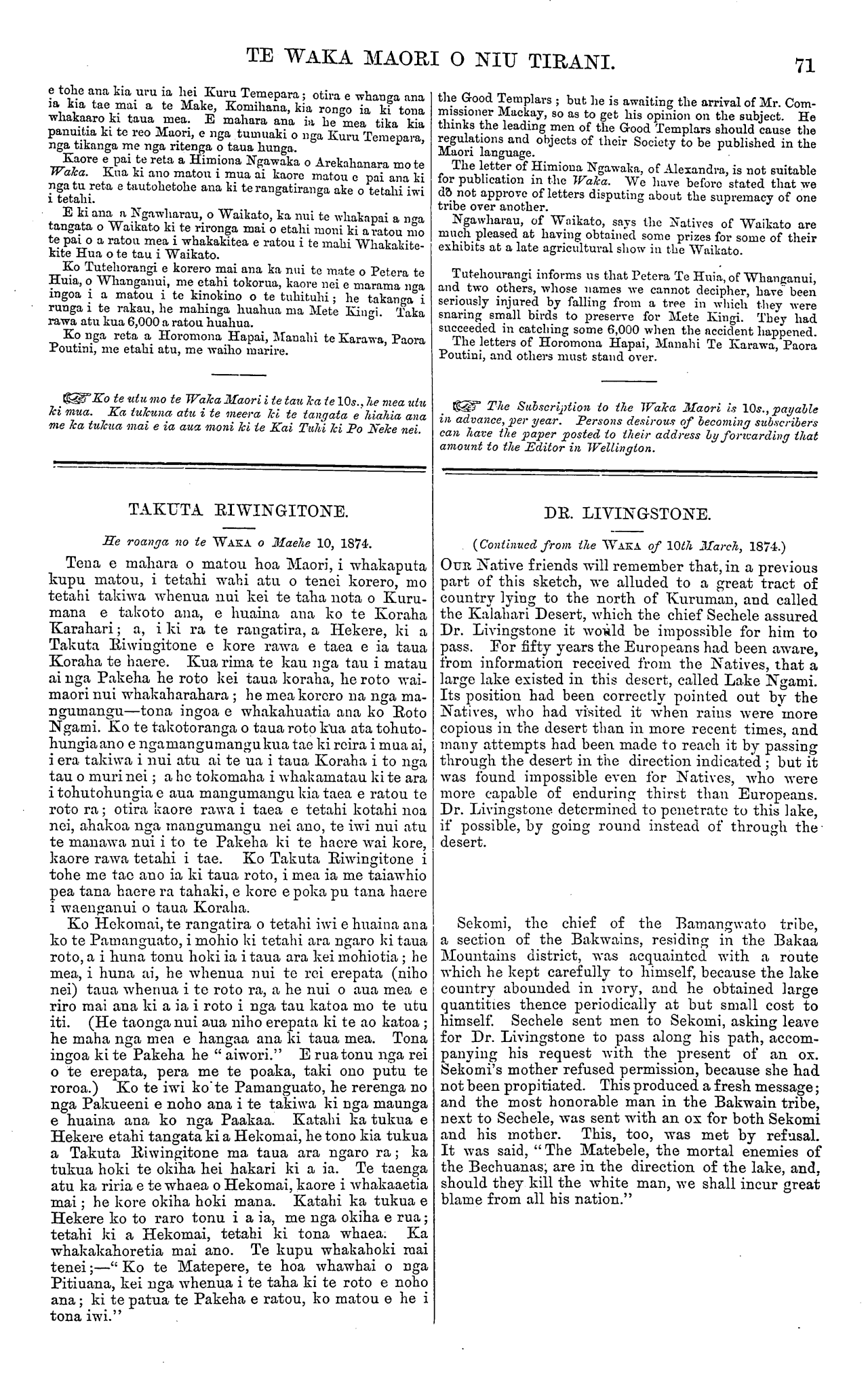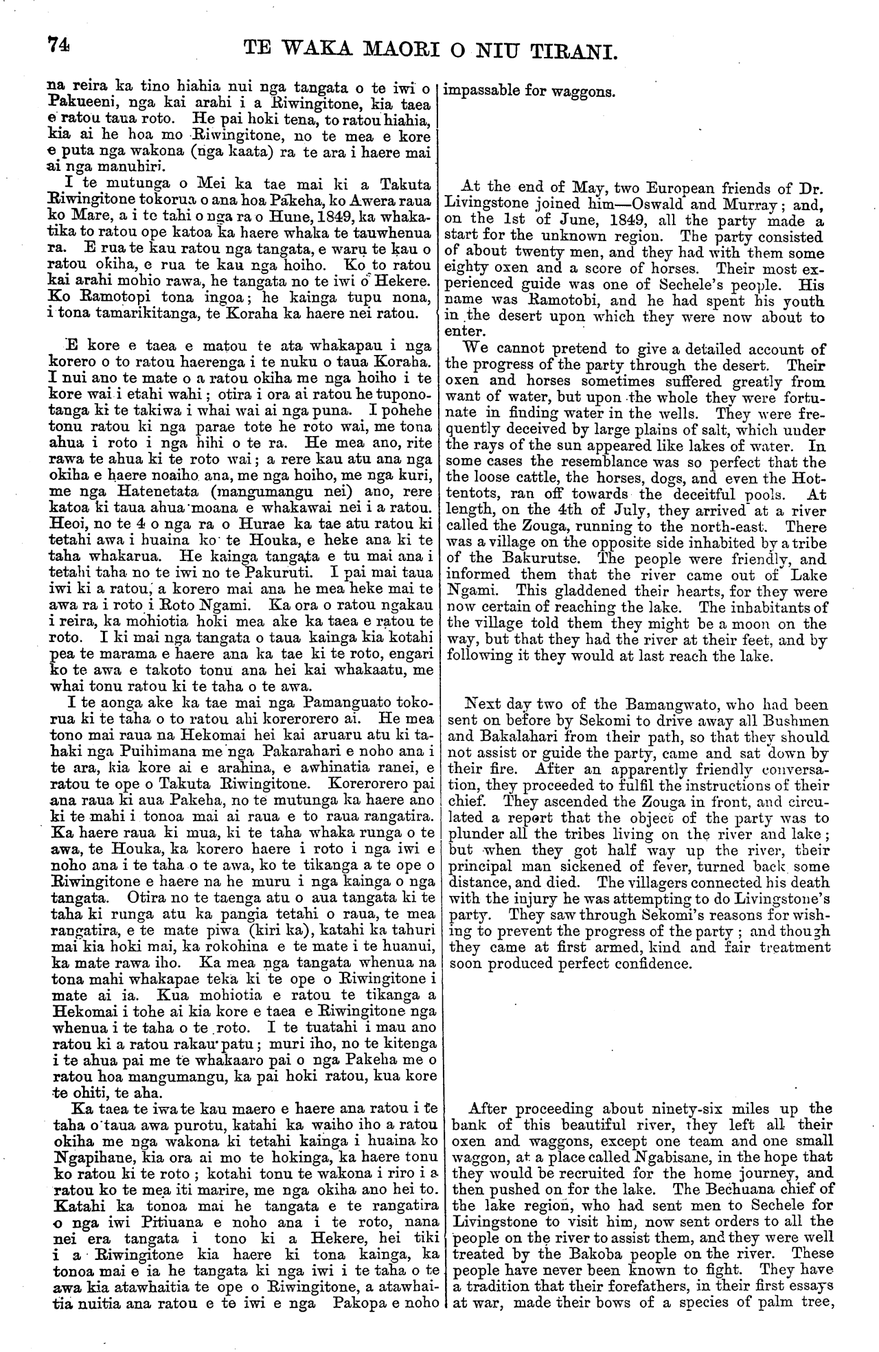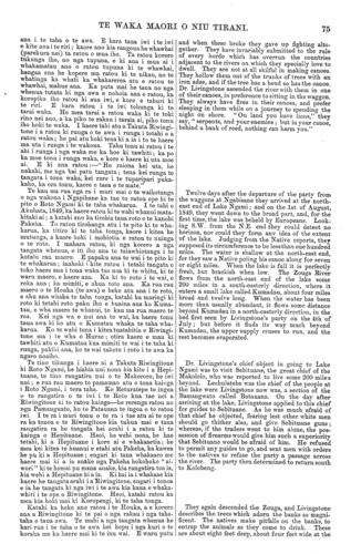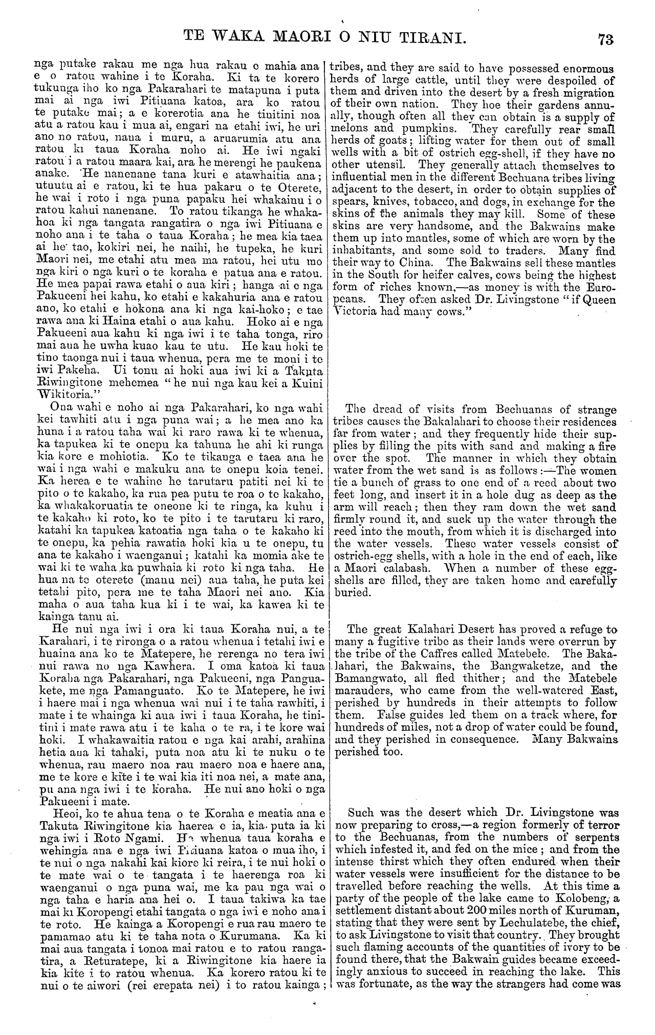 TE WAKA MAORI O NIU TIRANI. 71 e tohe ana kia uru ia hei Kuru Temepara; otira e whanga ana ia kia tae mai a te Make, Komihana, kia rongo ia ki tona whakaaro ki taua mea. E mahara ana ia he mea tika kia panuitia ki te reo Maori, e nga tumuaki o nga Kuru Temepara, nga tikanga me nga ritenga o taua hunga. Kaore e pai te reta a Himiona Ngawaka o Arekahanara mo te Waka. Kua ki ano matou i mua ai kaore matou e pai ana ki nga tu reta e tautohetohe aua ki te rangatiranga ake o tetahi iwi i tetahi. E ki ana a Ngawharau , o Waikato, ka nui te whakapai a nga tangata o Waikato ki te rironga mai o etahi moni ki a ratou mo te pai o a ratou mea i whakakitea e ratou i te mahi Whakakite- kite Hua o te tau i Waikato. Ko Tutehorangi e korero mai ana ka nui te mate o Petera te Huia, o Whanganui, me etahi tokorua, kaore nei e marama nga ingoa i a matou i te kinokino o te tuhituhi; he takanga i runga i te rakau, he mahinga huahua ma Mete Kingi. Taka rawa atu kua 6, 000 a ratou huahua. Ko nga reta a Horomona Hapai, Manahi te Karawa, Paora Poutini, me etahi atu, me waiho marire. Ko te utu mo te Waka Maori i te tau ka te 10s., he e mea utu ki mua. Ka tukuna atu i te meera ki te tangata e hiahia ana me ka tukua mai e ia aua moni ki te Kai Tuhi ki Po Neke nei. TAKUTA RIWINGITONE. He roanga no te WAKA o Maehe 10, 1874. Tena e mahara o matou hoa Maori, i whakaputa kupu matou, i tetahi wahi atu o tenei korero, mo tetahi takiwa whenua nui kei te taha nota o Kuru- mana e takoto ana, e huaina ana ko te Koraha Karahari; a, i ki ra te rangatira, a Hekere, ki a Takuta Riwingitone e kore rawa e taea e ia taua Koraha te haere. Kua rima te kau nga tau i matau ai nga Pakeha he roto kei taua koraha, he roto wai- maori nui whakaharahara; he mea korero na nga ma- ngumangu—tona ingoa e whakahuatia ana ko Roto Ngami. Ko te takotoranga o taua roto kua ata tohuto- hungia ano e nga mangumangu kua tao ki reira i mua ai, i era takiwa i nui atu ai te ua i taua Koraha i to nga tau o muri nei; a he tokomaha i whakamatau ki te ara i tohutohungia e aua mangumangu kia taea e ratou te roto ra; otira kaore rawa i taea e tetahi kotahi noa nei, ahakoa nga mangumangu nei ano, te iwi nui atu te manawa nui i to te Pakeha ki te haere wai kore, kaore rawa tetahi i tae. Ko Takuta Riwingitone i tohe me tao ano ia ki taua roto, i mea ia me taiawhio pea tana haere ra tahaki, e kore e poka pu tana haere i waenganui taua Koraha. Ko Hekomai, te rangatira o tetahi iwi e huaina ana ko te Pamanguato, i mohio ki tetahi ara ngaro Id taua roto, a i huna tonu hoki ia i taua ara kei mohiotia; he mea, i huna ai, he whenua nui to rei erepata (niho nei) taua whenua i to roto ra, a he nui o aua mea e riro mai ana ki a ia i roto i nga tau katoa mo te utu iti. (He taonga nui aua niho erepata ki te ao katoa; he maha nga mea e hangaa ana ki taua mea. Tona ingoa ki te Pakeha he " aiwori." E rua tonu nga rei o te erepata, pera me te poaka, taki ono putu te roroa.) Ko te iwi ko te Pamanguato, he rerenga no nga Pakueeni e noho ana i te takiwa ki nga maunga e huaina ana ko nga Paakaa. Katahi ka tukua e Hekere etahi tangata ki a Hekomai, he tono kia tukua a Takuta Riwingitone ma taua ara ngaro ra; ka tukua hoki te okiha hei hakari ki a ia. Te taenga atu ka riria e te whaea o Hekomai, kaore i whakaaetia mai; he kore okiha hoki mana. Katahi ka tukua e Hekere ko to raro tonu i a ia, me nga okiha e rua; tetahi ki a Hekomai, tetahi ki tona whaea. Ka whakakahoretia mai ano. Te kupu whakahoki mai tenei;—"Ko te Matepere, te hoa whawhai o nga Pitiuana, kei nga whenua i te taha ki te roto e noho ana; ki te patua te Pakeha e ratou, ko matou e he i tona iwi." the Good Templars; but he is awaiting the arrival of Mr. Com- missioner Mackay, so as to get his opinion on the subject. He thinks the leading men of the Good Templars should cause the regulations and objects of their Society to be published in the Maori language. The letter of Himiona Ngawaka, of Alexandra, is not suitable for publication in the Waka. We have before stated that we do not approve of letters disputing about the supremacy of one tribe over another. Ngawharau, of Waikato, says the Natives of Waikato are much pleased at having obtained some prizes for some of their exhibits at a late agricultural show in the Waikato. Tutehourangi informs us that Petera Te Huia, of Whanganui, and two others, whose names we cannot decipher, have been seriously injured by falling from a tree in which they were snaring small birds to preserve for Mete Kingi. They had succeeded in catching some 6, 000 when the accident happened. The letters of Horomona Hapai, Manahi Te Karawa, Paora Poutini, and others must stand over. The Subscription to the Waka Maori is 10s., payable in advance, per year. Persons desirous of becoming subscribers can have the paper posted to their address by forwarding that amount to the Editor in Wellington. DR. LIVINGSTONE. (Continued from ihe WAKA of 10th March, 1874.) OUR Native friends will remember that, in a previous part of this sketch, we alluded to a great tract of country lying to the north of Kuruman, and called the Kalahari Desert, which the chief Sechele assured Dr. Livingstone it would be impossible for him to pass. For fifty years the Europeans had been aware, from information received from the Natives, that a large lake existed in this desert, called Lake Ngami. Its position had been correctly pointed out by the Natives, who had visited it when rains were more copious in the desert than in more recent times, and many attempts had been made to reach it by passing through the desert in the direction indicated; but it was found impossible even for Natives, who were more capable of enduring thirst than Europeans. Dr. Livingstone determined to penetrate to this lake, if possible, by going round instead of through the desert. Sekomi, the chief of the Bamangwato tribe, a section of the Bakwains, residing in the Bakaa Mountains district, was acquainted with a route which he kept carefully to himself, because the l