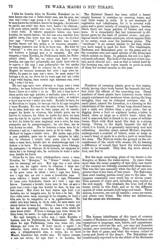72 TE WAKA MAORI O NIU TIRANI. I kiia he koraha kino te Koraha Karahari no te mea kaore ona wai e heke haere ana, ara he awa, me ona wai i roto i nga puna e iti rawa ano. E hara i te mea kaore he tarutaru, kaore he tangata; he nui ano te patiti, me etahi atu taru toro haere i te whenua; a he puia rakau rarahi ano ona, he tino rakau tetahi i etahi wahi. E takoto papatahi katoa ana taua koraha, he mania katoa; ho nui ona awa tawhito kua pakihi rawa, kua kore noa atu ona wai; he tinitini noa nga "atcropi" e haere a kahui ana i taua koraha kaore nei kia pehia e te waewae tangata; he hanga manawa nui ia ki te kore wai. He kuri te "ateropi" e rite ana te ahua ki te tia, kua rongo nei koutou e kainga ana e te tangata. Ko ona tangata, o taua Koraha, he Puihimana etahi, he Paka- rahari etahi. He kai na ratou nga kuri o taua koraha, me nga tini pohawaiki, me etahi kuri rite ki te ngeru, e kai ana i aua pohawaiki—he kai anake na aua tangata. Ko te oneone he tu a onepu nei. Engari he oneone momona kei roto i nga awa ta- whito, he para no nga wai o mua; he mea maro i te kainga a te ra, na reira ka tu tonu nga wai ua i roto i nga wahi hapua, taea noatia nga marama rua, toru atu, i roto i te tau. He nui nga taru toro whenua e tupu ana i taua koraha; he mea hohonu ki te whenua ona putake, no kona i kore ai e rakia i te ra. He nui o aua taru e ahua puku ana nga putake, e makuku ana a roto; a e kainga ana e te tangata i te takiwa raki; te takiwa e kore aua te wai i etahi atu wahi. Kotahi te taru, ko te Reroihua to ingoa, he taonga nui ia ki nga tangata- o taua Koraha. Ko ona rau he mea roroa, iti marire; ko te tata, kati ano me te tata paipa nei te rarahi, engari ka keria te whenua, kia kotahi putu me te hawhe te hohonu, ka kitea te puku kei raro, he mea ano ka rite ki te upoko tamariki te rahi; ka tihorea te kiri, ka kitea he mea angiangi noa a roto, he mea putaputa me te pungorungoru; he wai kau, me te wai korau te reka. Na te hohonu o taua mea ki te whenua i pai ai, i mataotao rawa ai ki te waha. He Mokuri te ingoa o tetahi taru. He maha nga puku o ona pakiaka, pera me te upoko tangata te rahi, kei te whenua i tetahi taha puta noa ki tetahi taha o taua taru, kotahi iari te mataratanga mai i te kakau o te taru. To te mangumangu tona tikanga, he patupatu i te whenua ki te kohatu, ka rangona te ahua ke o te tatangi ake, ka mohiotia te wahi e noho ana, katahi ka keria. Otira ko te tino taru whakamiharo rawa o taua Koraha, he " Kengue," he "Keme" tetahi ingoa, ara he merengi nei ano. Kei nga tau e nui rawa ana te ua, ka ngaro rawa te whenua i taua me- rengi i etahi wahi nui o taua Koraha. I mua ai he pera tonu te" ahua i roto i nga tau katoa, ara i nga tau ua nui o mua e korerotia ana. I taua takiwa i haere tonu etahi o nga Pakueeni ki taua roto hokohoko haere ai i roto i nga tau katoa. Inaianei e kotahi tonu ana te tau ua nui e puta ana i roto i nga tau kotahi te kau, te kau ma tahi ranei. Hei reira ka hari katoa nga kuri o te koraha, me te tangata ano, ki te hua o te kai. He tino reka rawa taua merengi ki te erepata, te kuri e kiia ana ko te rangatira ia o te ngaherehere. Me etahi atu kuri katoa, te iti te rahi, he mea mate nui ratou katoa ki taua kai. Otira, e hara i te mea pai hei kai aua merengi katoa; he mea reka etahi, he mea kaua etahi. E kore e kainga nga mea kaua, he kino tona, he mate; ko nga mea reka e pai ana. Ko nga tangata e noho ana i taua Koraha e huaina ana he Puihimana, he Pakarahari. Ho mea ahua ke nga Puihimana, tona reo, tona iwi, ona tikanga, me tona tu. E kore ratou e ngaki i te whenua, kore rawa; kaore he kuri e whangaitia ana, e whakatupuria ana, e ratou, ko te kuri Maori, kinokino nei, anake ano. To ratou oranga, e ora nei ratou, ko nga kuri o te koraha, me The Kalahari Desert has been called a desert simply because it contains no running water, and very little water in wells. It is not destitute of vegetation and inhabitants, for it is covered with grass and a great variety of creeping plants; besides which there are large patches of bushes and even trees. It is remarkably flat, but intersected in dif- ferent parts by the beds of ancient rivers; and pro- digious herds of certain antelopes, which require little or no water, roam over the trackless plains. The "antelope" is. an animal similar to the deer, which you have heard is used for food. The inhabitants, Bushmen and Bakalahari, prey on the game and on the countless rats and small species of the feline race which subsist on these. In general, the soil is a light- coloured soft sand. The beds of the ancient rivers con- tain much alluvial soil; and as that is baked hard by the burning sun, rain water stands in pools in some of them for several months in the year. Numbers of creeping plants grow in this region, which, having their roots buried far beneath the soil, feel little the effects of the scorching sun. Great numbers of these plants have tuberous roots, which supply nutriment and moisture when, during the long droughts, they can be obtained nowhere else. A small plant, named the Leroshua, is a blessing to the inhabitants of the desert. It has long slender leaves, and a stalk not thicker than a pipe stem; but on digging down a foot or eighteen inches, a tuber is found, often as large as a child's head; when the rind is removed, this is found to be a mass of cellular tissue, filled with fluid much like that in a young turnip. Owing to the depth beneath the soil at which it is found, it is generally deliciously cool and refreshing. Another plant, named Mokuri, deposits underground a number of tubers, some as large as a man's head, at spots in a circle a yard or more from the stem. The Natives strike the ground on the cir- cumference of the circle with stones, till, by hearing a difference of sound, they know the water-bearing tuber to be beneath. They then dig down about a foot, and find it. But the most surprising plant of the desert is the Kengwe, or Keme, the water-melon. In years when more than the usual quantity of rai