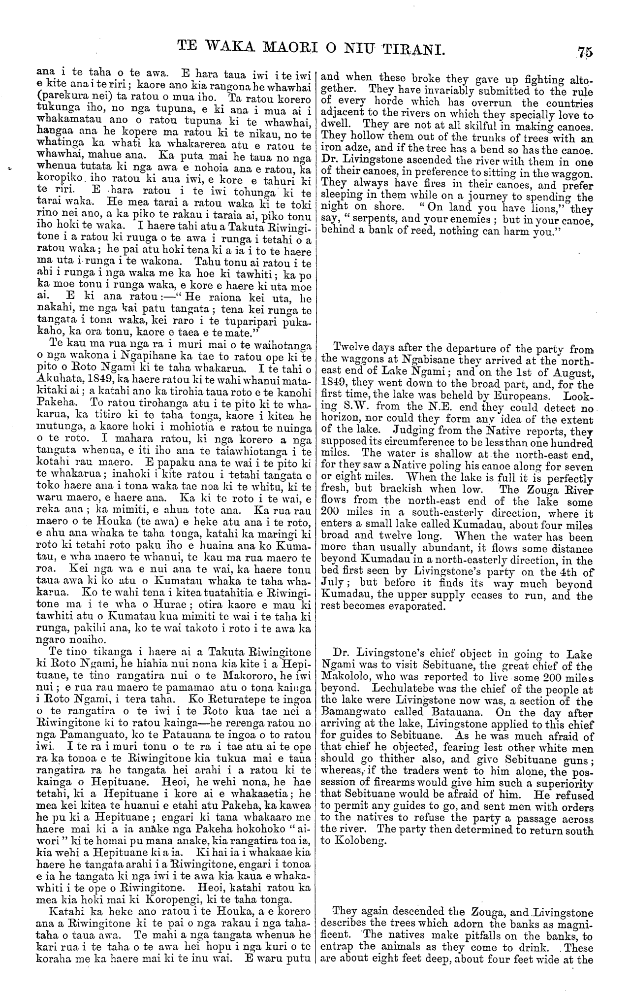 TE WAKA MAORI O NIU TIRANI. na reira ka tino hiahia nui nga tangata o te iwi o Pakueeni, nga kai arahi i a Riwingitone, kia taea e rato u taua roto. He pai hoki tena, to ratou hiahia, kia ai he hoa mo Riwingitone, no te mea e kore e puta nga wakona (nga kaata) ra te ara i haere mai ai nga manuhiri. I te mutunga o Mei ka tae mai ki a Takuta Riwingitone tokorua o ana hoa Pakeha, ko Awera raua ko Mare, a i te tahi o nga ra o Hune, 1849, ka whaka- tika to ratou ope katoa ka haere whaka te tauwhenua ra. E rua te kau ratou nga tangata, e waru te kau o ratou okiha, e rua te kau nga hoiho. Ko to ratou kai arahi mohio rawa, he tangata no te iwi o Hekere. Ko Ramotopi tona ingoa; he kainga tupu nona, i tona tamarikitanga, te Koraha ka haere nei rato u. E kore e taea e matou te ata whakapau i nga korero o to ratou haerenga i te nuku o taua Koraha. I nui ano te mate o a ratou okiha me nga hoiho i te kore wai i etahi wahi; otira i ora ai ratou he tupono- tanga ki te takiwa i whai wai ai nga puna. I pohehe tonu ratou ki nga parae tote he roto wai, me tona ahua i roto i nga hihi o te ra. He mea ano, rite rawa te ahua ki te roto wai; a rere kau atu ana nga okiha e haere noaiho ana, me nga hoiho, me nga kuri, me nga Hatenetata (mangumangu nei) ano, rere katoa ki taua ahua moana e whakawai nei i a ratou. Heoi, no te 4 o nga ra o Hurae ka tae atu rato u ki tetahi awa i huaina ko te Houka, e heke ana ki te taha whakama. He kainga tangata e tu mai ana i tetahi taha. no te iwi no te Pakuruti. I pai mai taua iwi ki a ratou, a korero mai ana he mea heke mai te awa ra i roto i Roto Ngami. Ka ora o ratou ngakau i reira, ka mohiotia hoki mea ake ka taea e ratou te roto. I ki mai nga tangata o taua kainga kia kotahi pea te marama e haere ana ka tae ki te roto, engari ko te awa e takoto tonu ana hei kai whakaatu, me whai tonu ratou ki te taha o te awa. I te aonga ake ka tae mai nga Pamanguato toko- rua ki te taha o to ratou ahi korerorero ai. He mea tono mai raua na Hekomai hei kai aruaru atu ki ta- haki nga Puihimana me nga Pakarahari e noho ana i te ara, Ida kore ai e arahina, e awhinatia ranei, e ratou te ope o Takuta Riwingitone. Korerorero pai ana raua ki aua Pakeha, no te mutunga ka haere ano ki te mahi i tonoa mai ai raua e to raua rangatira. Ka haere raua ki mua, ki te taha whaka runga o te awa, te Houka, ka korero haere i roto i nga iwi e noho ana i te taha o te awa, ko te tikanga a te ope o Riwingitone e haere na he muru i nga kainga o nga tangata. Otira no te taenga atu o aua tangata ki te taha ki runga atu ka pangia tetahi o raua, te mea rangatira, e te mate piwa (kiri ka), katahi ka tahuri mai kia hoki mai, ka rokohina e te mate i te huanui, ka mate rawa iho. Ka mea nga tangata whenua na tona mahi whakapae teka ki te ope o Riwingitone i mate ai ia. Kua mohiotia e ratou te tikanga a Hekomai i tohe ai kia kore e taea e Riwingitone nga whenua i te taha o te roto I te tuatahi i mau ano ratou ki a ratou rakau patu; muri iho, no te kitenga i te ahua pai me te whakaaro pai o nga Pakeha me o ratou hoa mangumangu, ka pai hoki ratou, kua kore te ohiti, te aha. Ka taea te iwa te kau maero e haere ana ratou i te taha o taua awa purotu, katahi ka waiho iho a ratou okiha me nga wakona ki tetahi kainga i huaina ko Ngapihane, kia ora ai mo te hokinga, ka haere tonu ko ratou ki te roto; kotahi tonu te wakona i riro i a ratou ko te mea iti marire, me nga okiha ano hei to. Katahi ka tonoa mai he tangata e te rangatira o nga iwi Pitiuana e noho ana i te roto, nana nei era tangata i tono ki a Hekere, hei tiki i a Riwingitone kia haere ki tona kainga, ka tonoa mai e ia he tangata ki nga iwi i te taha o te awa kia atawhaitia te ope o Riwingitone, a atawhai- tia nuitia ana rato u e te iwi e nga Pakopa e noho impassable for waggons. At the end of May, two European friends of Dr. Livingstone joined him—Oswald and Murray; and, on the 1st of June, 1849, all the party made a start for the unknown region. The party consisted of about twenty men, and they had with them some eighty oxen and a score of horses. Their most ex- perienced guide was one of Sechele's people. His name was Ramotobi, and he had spent his youth in the desert upon which they were now about to enter. We cannot pretend to give a detailed account of the progress of the party through the desert. Their oxen and horses sometimes suffered greatly from. want of water, but upon the whole they were fortu- nate in finding water in the wells. They were fre- quently deceived by large plains of salt, which under the rays of the sun appeared like lakes of water. In some cases the resemblance was so perfect that the the loose cattle, the horses, dogs, and even the Hot- tentots, ran off towards the deceitful pools. At length, on the 4th of July, they arrived at a river called the Zouga, running to the north-east. There was a village on the opposite side inhabited by a tribe of the Bakurutse. The people were friendly, and informed them that the river came out of" Lake Ngami. This gladdened their hearts, for they were now certain of reaching the lake. The inhabitants of the village told them they might be a moon on the way, but that they had the river at their feet, and by following it they would at last reach the lake. Next day two of the Bamangwato, who had been sent on before by Sekomi to drive away all Bushmen and Bakalahari from their path, so that they should not assist or guide the party, came and sat down by their fire. After an apparently friendly conversa- tion, they proceeded to fulfil the instructions of their chief. They ascended the Zouga in front, and circu- lated a report that the object of the party was to plunder all the tribes living on the river and lake; but when they got half way up the river, their principal man sickened of fever, turned back some distance, and died. The villagers connected his death with the injury he was attempting to do Livingstone's party. They saw through Sekomi's reasons for wish- ing to prevent the progress of the party; and though th