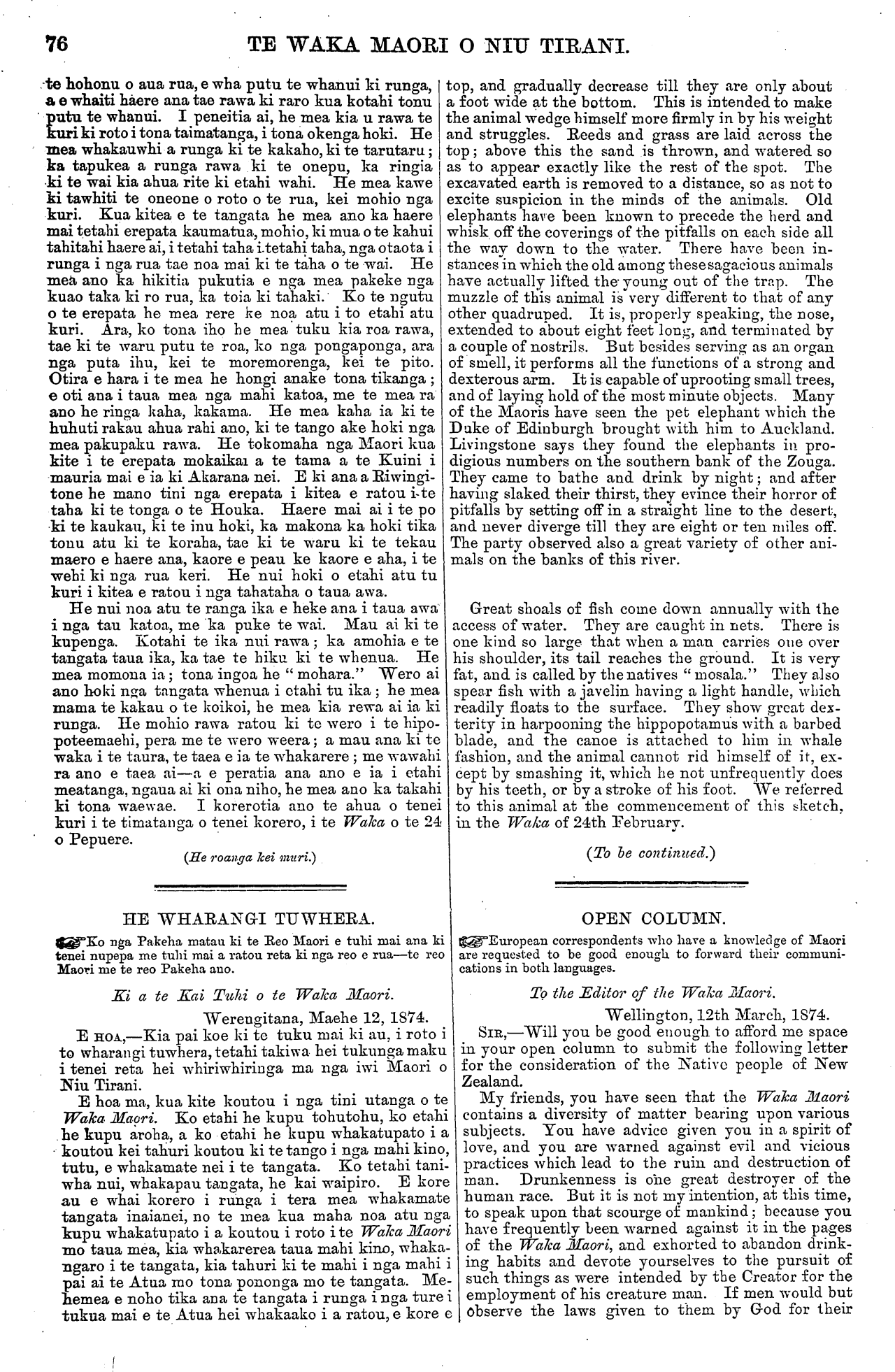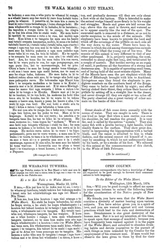 76 TE WAKA MAORI O NIU TIRANI. te hohonu o aua rua, e wha putu te whanui ki runga, a e whaiti haere ana tae rawa ki raro kua kotahi tonu putu te whanui. I peneitia ai, he mea kia u rawa te kuri ki roto i tona taimatanga, i tona ekenga hoki. He mea whakauwhi a runga ki te kakaho, ki te tarutaru; ka tapukea a runga rawa ki te onepu, ka ringia ki te wai kia ahua rite ki etahi wahi. He mea kawe ki tawhiti te oneone o roto o te rua, kei mohio nga kuri. Kua kitea e te tangata he mea ano ka haere mai tetahi erepata kaumatua, mohio, ki mua o te kahui tahitahi haere ai, i tetahi taha i tetahi taha, nga otaota i runga i nga rua tae noa mai ki te taha o te wai. He mea ano ka hikitia pukutia e nga mea pakeke nga kuao taka ki ro rua, ka toia ki tahaki. Ko te ngutu o te erepata he mea rere ke noa atu i to etahi atu kuri. Ara, ko tona iho he mea tuku kia roa rawa, tae ki te waru putu te roa, ko nga pongaponga, ara nga puta ihu, kei te moremorenga, kei te pito. Otira e hara i te mea he hongi anake tona tikanga; e oti ana i taua mea nga mahi katoa, me te mea ra ano he ringa kaha, kakama. He mea kaha ia ki te huhuti rakau ahua rahi ano, ki te tango ake hoki nga mea pakupaku rawa. He tokomaha nga Maori kua kite i te erepata mokaikai a te tama a te Kuini i mauria mai e ia ki Akarana nei. E ki ana a Riwingi- tone he mano tini nga erepata i kitea e ratou i te taha ki te tonga o te Houka. Haere mai ai i te po ki te kaukau, ki te inu hoki, ka makona ka hoki tika tonu atu ki te koraha, tae ki te waru ki te tekau maero e haere ana, kaore e peau ke kaore e aha, i te wehi ki nga rua keri. He nui hoki o etahi atu tu kuri i kitea e ratou i nga tahataha o taua awa. He nui noa atu te ranga ika e heke ana i taua awa i nga tau katoa, me ka puke te wai. Mau ai ki te kupenga. Kotahi te ika nui rawa; ka amohia e te tangata taua ika, ka tae te hiku ki te whenua. He mea momona ia; tona ingoa he " mohara." Wero ai ano hoki nga tangata whenua i etahi tu ika; he mea mama te kakau o te koikoi, he mea kia rewa ai ia ki runga. He mohio rawa ratou ki te wero i te hipo- poteemaehi, pera me te wero weera; a mau ana ki te waka i te taura, te taea e ia te whakarere; me wawahi ra ano e taea ai—a e peratia ana ano e ia i etahi meatanga, ngaua ai ki ona niho, he mea ano ka takahi ki tona waewae. I korerotia ano te ahua o tenei kuri i te timatanga o tenei korero, i te Waka o te 24 o Pepuere. (He roanga kei muri.) HE WHARANGI TUWHERA. Ko nga Pakeha matau ki te Reo Maori e tuhi mai ana ki tenei nupepa me tuhi mai a ratou reta ki nga reo e rua—te reo Maori me te reo Pakeha ano. Ki a te Eai Tuhi o te Waka Maori. Werengitana, Maehe 12, 1874. E HOA,—Kia pai koe ki te tuku mai ki au, i roto i to wharangi tuwhera, tetahi takiwa hei tukunga maku i tenei reta hei whiriwhiringa ma nga iwi Maori o Niu Tirani. E hoa ma, kua kite koutou i nga tini utanga o te Waka Maori. Ko etahi he kupu tohutohu, ko etahi he kupu aroha, a ko etahi he kupu whakatupato i a koutou kei tahuri koutou ki te tango i nga mahi kino, tutu, e whakamate nei i te tangata. Ko tetahi tani- wha nui, whakapau tangata, he kai waipiro. E kore au e whai korero i runga i tera mea whakamate tangata inaianei, no te mea kua maha noa atu nga kupu whakatupato i a koutou i roto i te Waka Maori mo taua mea, kia whakarerea taua mahi kino, whaka- ngaro i te tangata, kia tahuri ki te mahi i nga mahi i pai ai te Atua mo tona pononga mo te tangata. Me- hemea e noho tika ana te tangata i runga i nga ture i tukua mai e te Atua hei whakaako i a ratou, e kore e top, and gradually decrease till they are only about a foot wide at the bottom. This is intended to make the animal wedge himself more firmly in by his weight and struggles. Reeds and grass are laid across the top; above this the sand is thrown, and watered so as to appear exactly like the rest of the spot. The excavated earth is removed to a distance, so as not to excite suspicion in the minds of the animals. Old elephants have been known to precede the herd and whisk off the coverings of the pitfalls on each side all the way down to the water. There have been in- stances in which the old among these sagacious animals have actually lifted the young out of the trap. The muzzle of this animal is very different to that of any other quadruped. It is, properly speaking, the nose, extended to about eight feet long, and terminated by a couple of nostrils. But besides serving as an organ of smell, it performs all the functions of a strong and dexterous arm. It is capable of uprooting small trees, and of laying hold of the most minute objects. Many of the Maoris have seen the pet elephant which the Duke of Edinburgh brought with him to Auckland. Livingstone says they found the elephants in pro- digious numbers on the southern bank of the Zouga. They came to bathe and drink by night; and after having slaked their thirst, they evince their horror of pitfalls by setting off in a straight line to the desert, and never diverge till they are eight or ten miles off. The party observed also a great variety of other ani- mals on the banks of this river. Great shoals of fish come down annually with the access of water. They are caught in nets. There is one kind so large that when a man carries one over his shoulder, its tail reaches the ground. It is very fat, and is called by the natives " mosala." They also spear fish with a javelin having a light handle, which readily floats to the surface. They show great de- terity in harpooning the hippopotamus with a barbed blade, and the canoe is attached to him in whale fashion, and the animal cannot rid himself of it, ex- cept by smashing it, which he not unfrequently does by his teeth, or by a stroke of his foot. We referred to this animal at the commencement of this sketch, in the Waka of 24th February. (To be continued.) OPEN COLUMN. European correspondents who have a knowledge of Maori are requested to be good enough to for ward their communi- cations in both languages. To the Ed if or of the Waka Maori. Wellingto