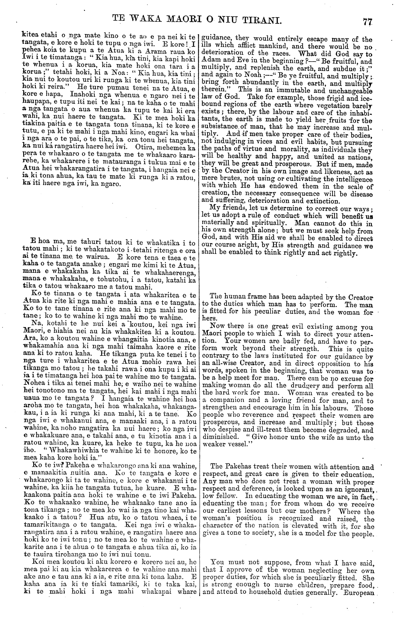 TE WAKA MAORI O NIU TIRANI. 77 kitea etahi o nga mate kino o te ao e pa nei ki te tangata, e kore e hoki te tupu o nga iwi. E kore! I pehea koia te kupu a te Atua ki a Arama raua ko Iwi i te timatanga: " Kia hua, kia tini, kia kapi hoki •te whenua i a korua, kia mate hoki ona tara i a korua;" tetahi hoki, ki a Noa: " Kia hua, kia tini; kia nui to koutou uri ki runga ki te whenua, kia tini hoki ki reira." He ture pumau tenei na te Atua, e kore e hapa, Inahoki nga whenua e ngaro nei i te haupapa, e tupu iti nei te kai; na te kaha o te mahi a nga tangata o aua whenua ka tupu te kai ki era wahi, ka nui haere te tangata. Ki te mea hoki ka tiakina paitia e te tangata tona tinana, ki te kore e tutu, e pa ki te mahi i nga mahi kino, engari ka whai i nga ara o te pai, o te tika, ka ora tonu hei tangata, ka nui ka rangatira haere hei iwi. Otira, mehemea ka pera te whakaaro o te tangata me te whakaaro kara- rehe, ka whakarere i te matauranga i tukua mai e te Atua hei whakarangatira i te tangata, i hangaia nei e ia ki tona ahua, ka tau te mate ki runga ki a ratou, ka iti haere nga iwi, ka ngaro. E hoa ma, me tahuri tatou ki te whakatika i to tatou mahi; ki te whakatakoto i tetahi ritenga e ora ai te tinana me. te wairua. E kore tena e taea e te kaha o te tangata anake; engari me kimi ki te Atua, mana e whakakaha ka tika ai te whakahaerenga, mana e whakakaha, e tohutohu, i a tatou, katahi ka tika o tatou whakaaro me a tatou mahi. Ko te tinana o te tangata i ata whakakitea o te Atua kia rite ki nga mahi e mahia ana e to tangata. Ko to te tane tinana e rite ana ki nga mahi mo te tane; ko to to wahine ki nga mahi mo te wahine. Na, kotahi te he nui kei a koutou, kei nga iwi Maori, e hiahia nei au kia whakakitea ki a koutou. Ara, ko a koutou wahine e whangaitia kinotia ana, e whakamahia ana ki nga mahi taimaha kaore e rite ana ki to ratou kaha. He tikanga puta ke tenei i to nga ture i whakaritea e te Atua mohio rawa hei tikanga mo tatou; he takahi rawa i ona kupu i ki ai ia i te timatanga hei hoa pai te wahine mo te tangata. Nohea i tika ai tenei mahi he, e waiho nei te wahine hei tonotono ma te tangata, hei kai mahi i nga mahi uaua mo Ie tangata? I hangaia te wahine hei hoa aroha mo te tangata, hei hoa whakakaha, whakanga- kau, i a ia ki runga ki ana mahi, ki a te tane. Ko nga iwi e whakanui ana, e manaaki ana, i a ratou wahine, ka noho rangatira ka nui haere; ko nga iwi e whakakuare ana, e takahi ana, e tu kinotia ana i a ratou wahine, ka kuare, ka heke te tupu, ka he noa iho. '' Whakawhiwhia te wahine ki te honore, ko te mea kaha kore hoki ia." Ko te iwi Pakeha e whakarongo; ana ki ana wahine, e manaakitia nuitia ana. Ko te tangata e kore e whakarongo ki ta te wahine, e kore e whakanui i te wahine, ka kiia he tangata tutua, he kuare. E wha- kaakona paitia ana hoki te wahine e te iwi Pakeha. Ko te whakaako wahine, he whakaako tane ano ia tona tikanga; no te mea ko wai ia nga tino kai wha- kaako i a tatou? Hua atu, ko o tatou whaea, ite tamarikitanga o to tangata. Kei nga iwi e whaka- rangatira ana i a ratou wahine, e rangatira haere ana hoki ko te iwi tonu; no te mea ko te wahine e wha- karite ana i te ahua o te tangata e ahua tika ai, ko ia te tauira tirohanga mo te iwi nui tonu. Koi mea koutou ki aku korero e korero nei au, he mea pai ki au kia whakarerea e te wahine ana mahi ake ano e tau ana ki a ia, e rite ana ki tona kaha. E kaha ana ia ki te tiaki tamariki, ki te taka kai, ki te mahi hoki i nga mahi whakapai whare guidance, they would entirely escape many of the ills which afflict mankind, and there would be no deterioration of the races. What did God say to Adam and Eve in the beginning?—" Be fruitful, and multiply, and replenish the earth, and subdue it;" and again to Noah; " Be ye fruitful, and multiply; bring forth abundantly in the earth, and multiply therein." This is an immutable and unchangeable law of God. Take for example, those frigid and ice- bound regions of the earth where vegetation barely exists; there, by the labour and care of the inhabi- tants, the earth is made to yield her fruits for the subsistance. of man, that he may increase and mul- tiply. And if men take proper care of their bodies, not indulging in vices and evil habits, but pursuing the paths of virtue and morality, as individuals they will be healthy and happy, and united as nations, they will be great and prosperous. But if men, made by the Creator in bis own image and likeness, act as mere brutes, not using or cultivating the intelligence with which He has endowed them in the scale of creation, the necessary consequence will be disease and suffering, deterioration and extinction. My friends, let us determine to correct our ways; let us adopt a rule of conduct which will benefit us materially and spiritually. Man cannot do this in his own strength alone; but we must seek help from God, and with His aid we shall be enabled to direct our course aright, by His strength and guidance we shall be enabled to think rightly and act rightly. The human frame has been adapted by the Creator to the duties which man has to perform. The man is fitted for his peculiar duties, and the woman for hers. Now there is one great evil existing among you Maori people to which I wish to direct your atten- tion. Your women are badly fed, and have to per- form work beyond their strength. This is quite contrary to the laws instituted for our guidance by an all-wise Creator, and in direct opposition to his words, spoken in the beginning, that woman was to be a help meet for man. There can be no excuse for making woman do all the drudgery and perform all the hard work for man. Woman was created to be a companion and a loving friend for man, and to strengthen and encourage him in his labours. Those people who reverence and respect their women are prosperous, and increase and multiply; but those who despise and ill-treat them become degraded, and diminished. " Give honor unto the wife as unto the weaker vessel." The Pakehas treat their women wi