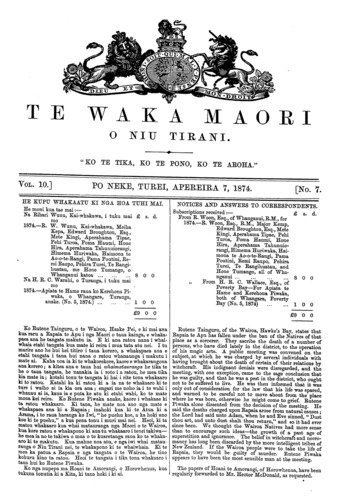 Te Waka Maori o Niu Tirani 1871-1877: Volume 10, Number 7. 07 April 1874 |