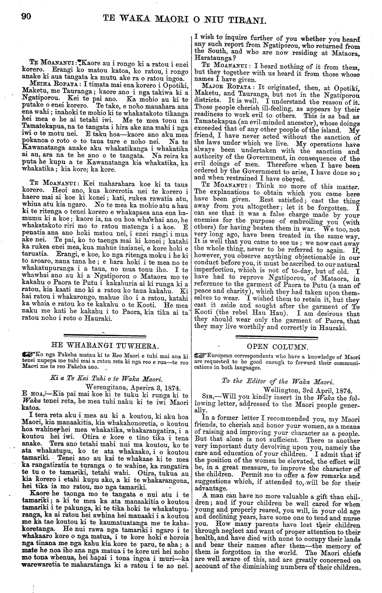 90 TE WAKA MAORI O NIU TIRANI TE MOANANUI: Kaore au i rongo ki a rato u i enei korero. Erangi ko matou katoa, ko ratou, i rongo anake ki aua tangata ka mutu ake ra o ratou ingoa. MEIHA. ROPATA: I timata mai ena korero i O potiki, Maketu, me Tauranga; kaore ano i nga takiwa ki a Ngtiporou. Kei te pai ano. Ka mohio au ki te putake o enei korero. Te take, e noho mauahara ana ena wahi; inahoki te mohio ki te whakatakoto tikanga hei mea e he ai tetahi iwi. Me te mea tonu na Tamatekapua, na te tangata i hira ake ana mahi i nga iwi o te motu nei. E taku hoa—kaore ano aku mea pokanoa o roto o to taua ture e noho nei. Na te Kawanatanga anake aku whakatikanga i whakatika ai au, ara na te he ano o te tangata. Na reira ka puta he kupu a te Kawanatanga kia whakatika, ka whakatika; kia kore; ka kore. TE MOANANUI: Kei maharahara koe ki ta taua korero. Heoi ano, kua korerotia nei te korero i haere mai ai koe ki konei; kati, rukea rawatia atu, whiua atu kia ngaro. No te mea ka mohio atu a hau ki te ritenga o tenei korero e whakapaea ana ena ha- mumu ki a koe; kaore ia, na ou hoa whawhai ano, he whakatakoto riri mo to ratou matenga i a koe. E penatia ana ano hoki matou nei, i enei rangi i mua ake nei. Te pai, ko to taenga mai ki konei; katahi ka rukea enei mea, kua mahue inaianei, e kore hoki e taruatia. Erangi, e koe, ko nga ritenga moku i he ki to aroaro, nana tana he; e hara hoki i te mea no te whakatupuranga i a taua, no mua tonu iho. I te whawhai ano au ki a Ngatiporou o Mataora mo te kakahu o Paora te Putu i kakahuria ai ki runga ki a ratou, kia kaati ano ki a ratou ko taua kakahu. Ki hai ratou i whakarongo, mahue iho i a ratou, katahi ka whaia e ratou ko te kakahu o te Kooti. He. mea naku me kati he kakahu i to Paora, kia tika ai ta ratou noho i roto o Hauraki. HE WHARANGI TUWHERA. Ko nga Pakeha matau ki te Reo Maori e tuhi mai ana ki tenei nupepa me tuhi mai a ratou reta ki nga reo e rua—te reo Maori me te reo Pakeha ano. Ki a Te Kai Tuhi o te Waka Maori. Werengitana, Aperira 3, 1874. E HOA., —Kia pai mai koe ki te tuku ki runga ki te Waka tenei reta, he mea tuhi naku ki te iwi Maori katoa. I tera reta aku i mea au ki a koutou, ki aku hoa Maori, kia manaakitia, kia whakahonoretia, o koutou hoa wahine hei mea whakatika, whakarangatira, i a koutou hei iwi. Otira e kore e tino tika i tena anake. Tera ano tetahi mahi nui ma koutou, ko te ata whakatupu, ko te ata whakaako, i o koutou tamariki. Tenei ano au kai te whakaae ki te mea ka rangatiratia te turanga o te wahine, ka rangatira te tu o te tamariki, tetahi wahi. O tira, tukua au kia korero i etahi kupu ako, a ki te whakarangona, hei tika ia mo ratou, mo nga tamariki. Kaore he taonga mo te tangata e nui atu i te tamariki; a ki te mea ka ata manaakitia o koutou tamariki i te pakunga, ki te tika hoki te whakatupu- ranga, ka ai ratou hei awhina hei manaaki i a koutou me ka tae koutou ki te kaumatuatanga me te kaha- koretanga. He nui rawa nga tamariki i ngaro i te whakaaro kore o nga matua, i te kore hoki e horoia nga tinana me nga kahu kia kore te paru, te aha; a mate he noa iho ana nga matua i te kore uri hei noho mo tona whenua, hei hapai i tona ingoa i muri—ka warewaretia te maharatanga ki a ratou i te ao nei. I wish to inquire further of you whether you heard any such report from Ngatiporou, who returned from the South, and who are now residing at Mataora, Harataunga? TE MOANANUI: I heard nothing of it from them, but they together with us heard it from those whose names I have given. MAJOR ROPATA: It originated, then, at O potiki, Maketu, and Tauranga, but not in the Ngatiporou. districts. It is well. I understand the reason of it. Those people cherish ill-feeling, as appears by their readiness to work evil to others. This is as bad as Tamatekapua (an evil-minded ancestor), whose doings exceeded that of any other people of the island. My friend, I have never acted without the sanction of the laws under which we live. My operations have always been undertaken with the sanction and authority of the Government, in consequence of the evil doings of men. Therefore when I have been ordered by the Government to arise, I have done so; and when restrained I have obeyed. TE MOANANUI: Think no more of this matter. The explanations to obtain which you came here have been given. Rest satisfied; cast the thing; away from you altogether; let it be forgotten. I can see that it was a false charge made by your enemies for the purpose of embroiling you (with others) for having beaten them in war. We too, not very long ago, have been treated in the same way. It is well that you came to see us; we now cast away the whole thing, never to be referred to again. If, however, you observe anything objectionable in our conduct before you, it must be ascribed to our natural imperfection, which is not of to-day, but of old. I have had to reprove Ngatiporou, of Mataora, in reference to the garment of Paora te Putu (a man of peace and charity), which they had taken upon them- selves to wear. I wished them to retain it, but they cast it aside and sought after the garment of Te Kooti (the rebel Hau Hau). I am desirous that they should wear only the garment of Paora, that they may live worthily and correctly in Hauraki. OPEN COLUMN. European correspondents who have a knowledge of Maori are requested to be good enough to forward their communi- cations in both languages. To the Editor of the Waka Maori. Wellington, 3rd April, 1874. SIR,—Will you kindly insert in the Waka the fol- lowing letter, addressed to the Maori people gener- ally. In a former letter I recommended you, my Maori friends, to cherish and honor your women, as a means of raising and improving your character as a people. But that alone is not sufficient. There is another very important duty devolving upon you, namely the care and education of your children. I admit that if the position of the women be elevated, the effect will be, in a great measure, to improve the character of the children. Permit me to offe